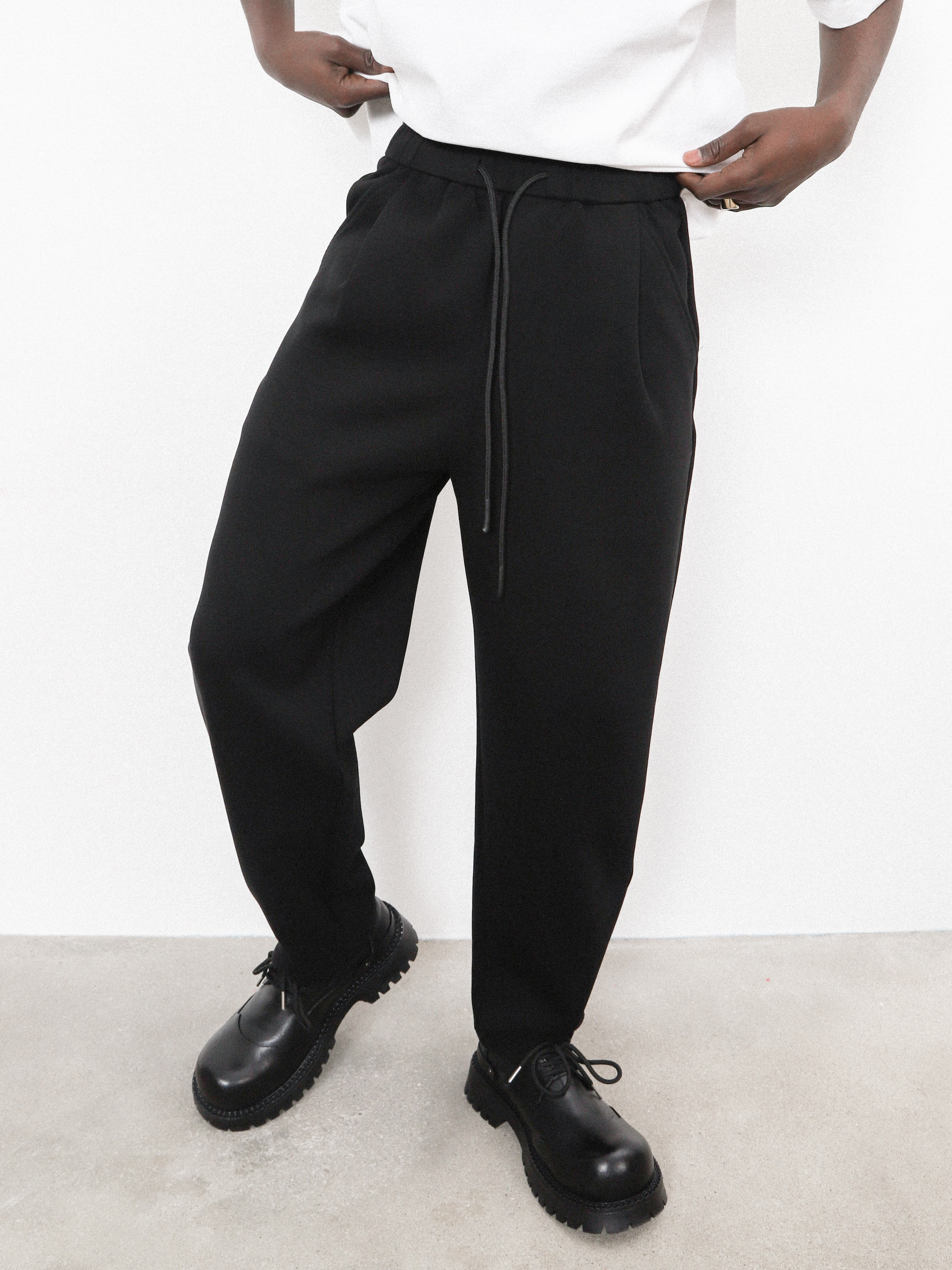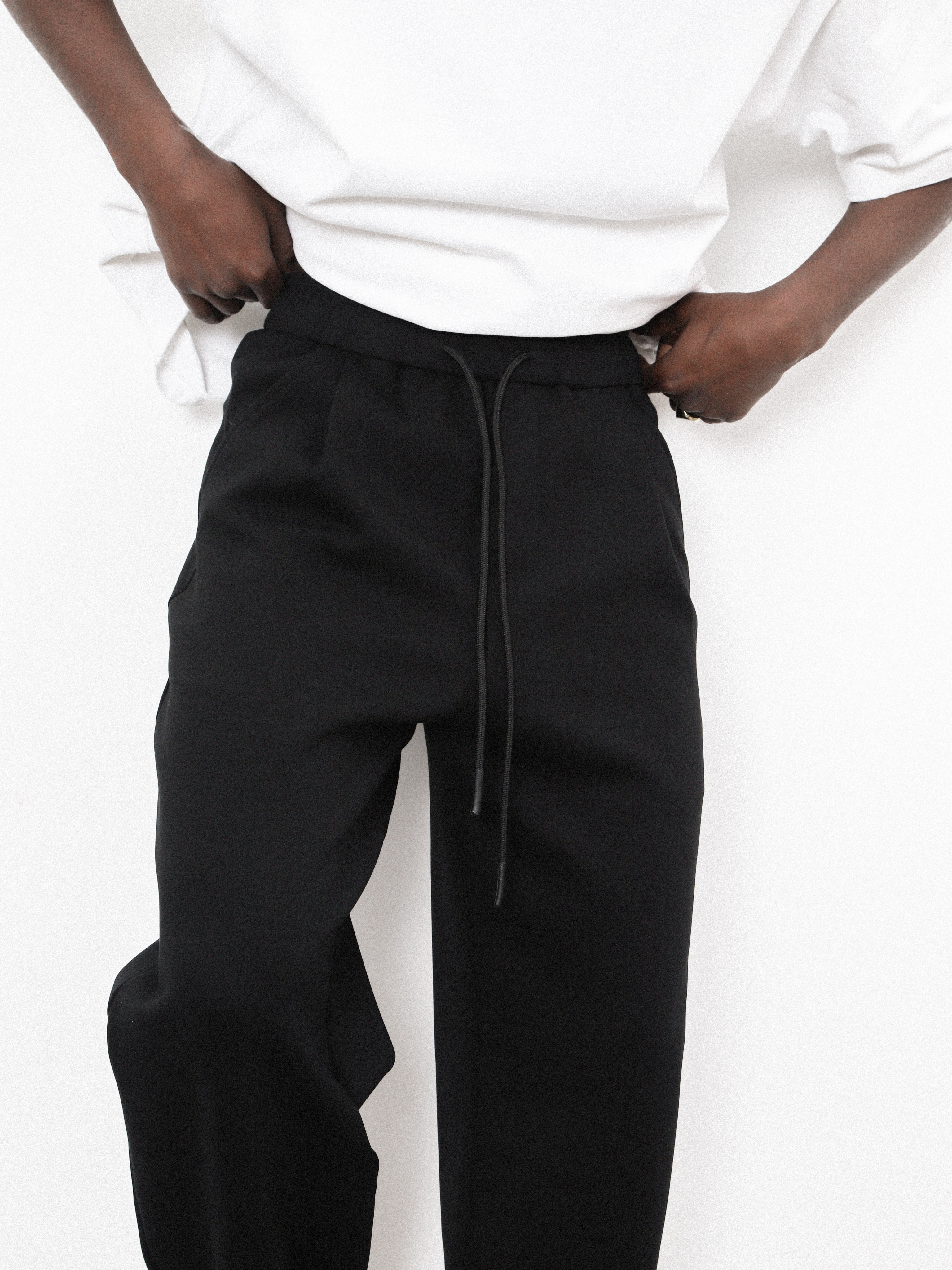 Широкие черные брюки со шнурком на поясе. Свободная модель для создания стильных образов на каждый день.