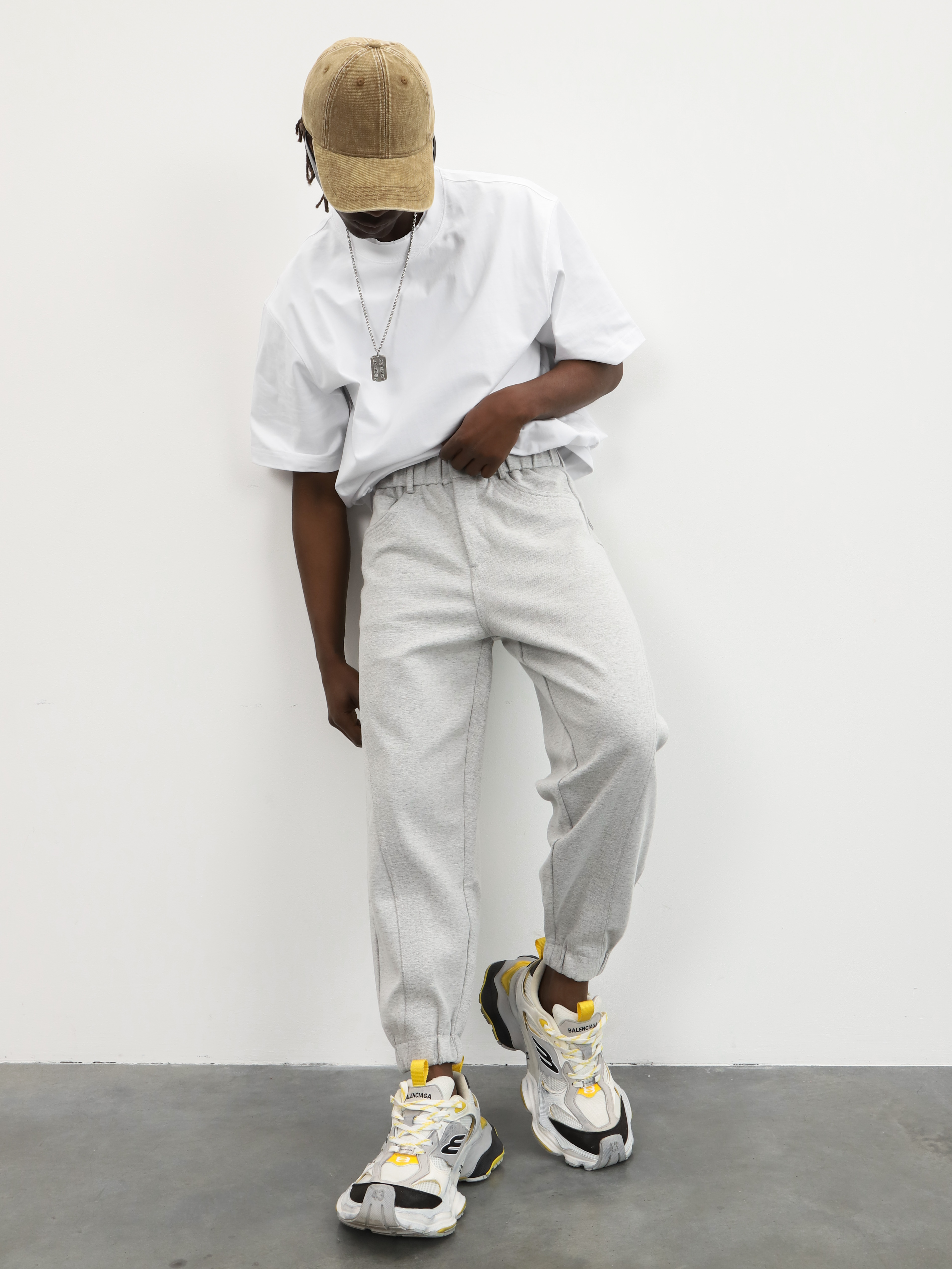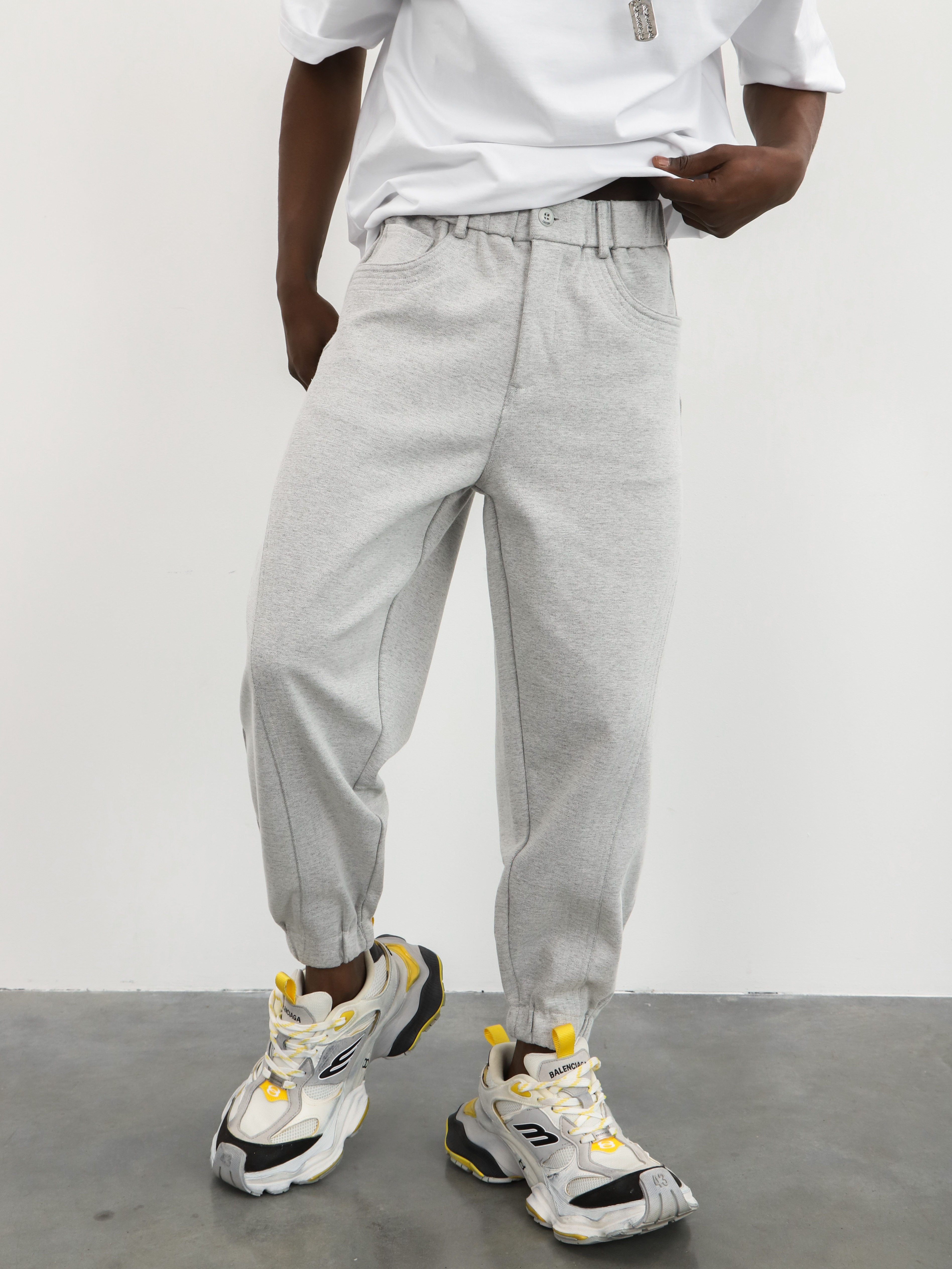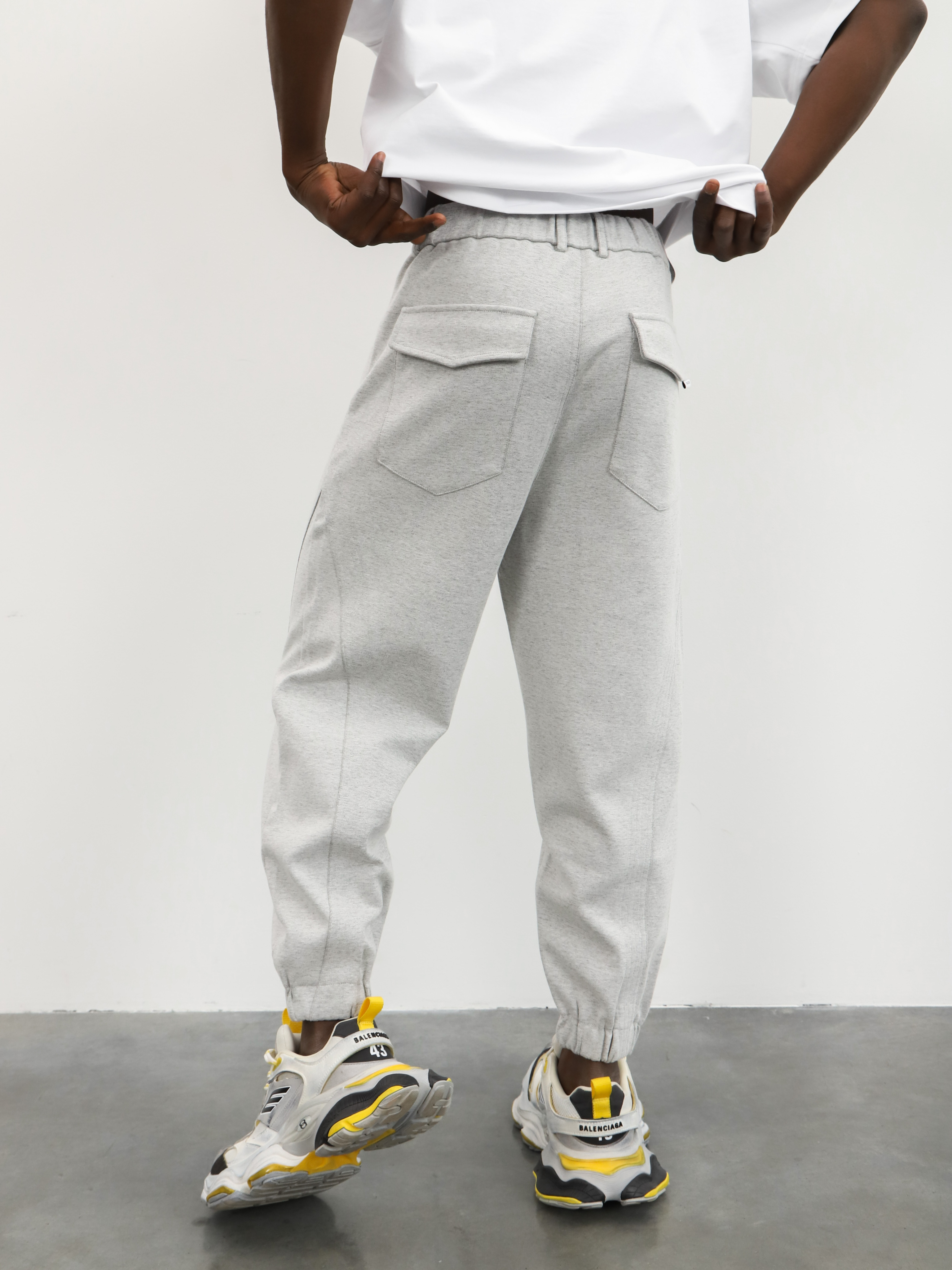 Серые джоггеры с поясом на резинке и манжетами. Современная модель для образов в стиле кэжуал спорт.