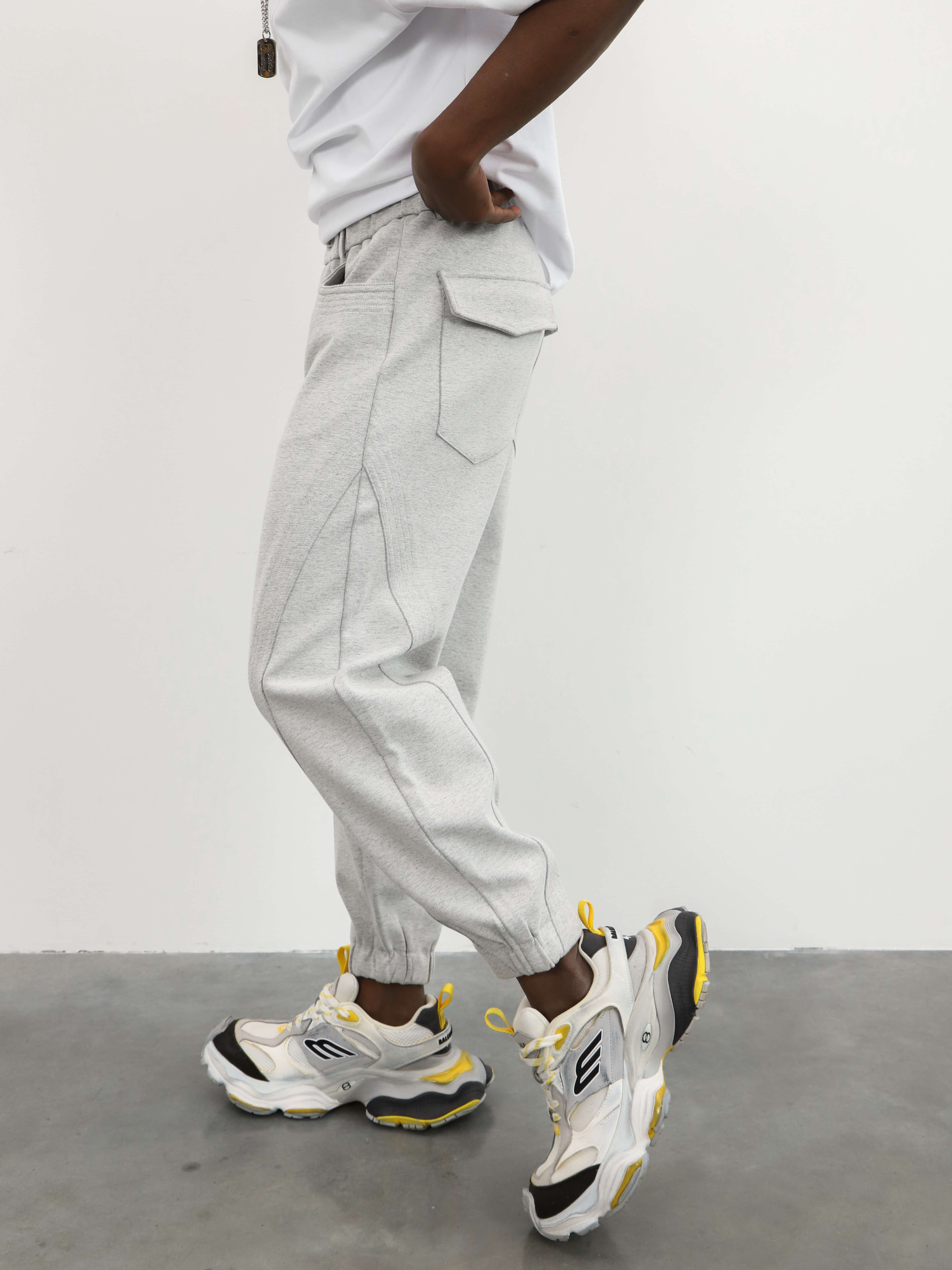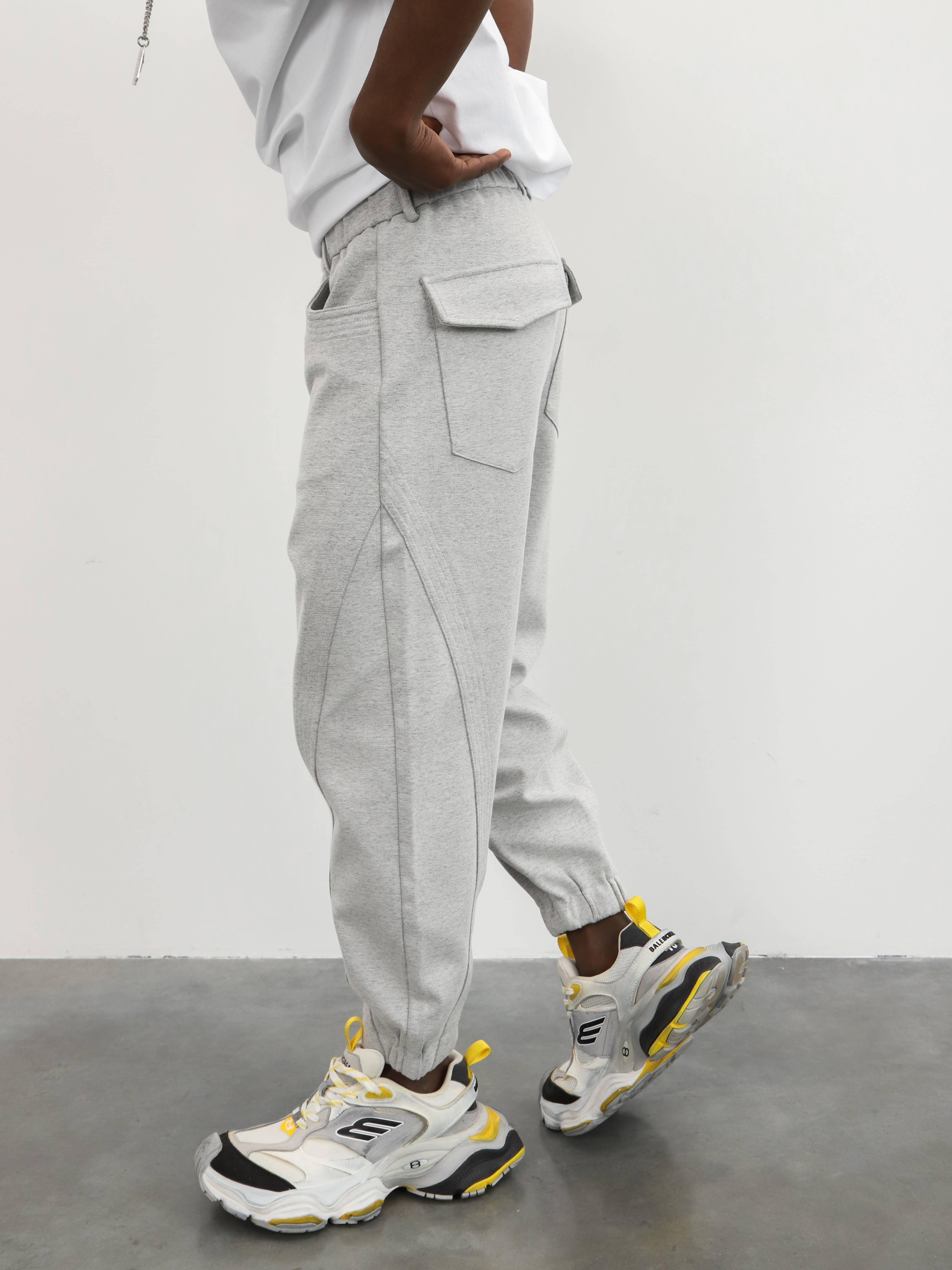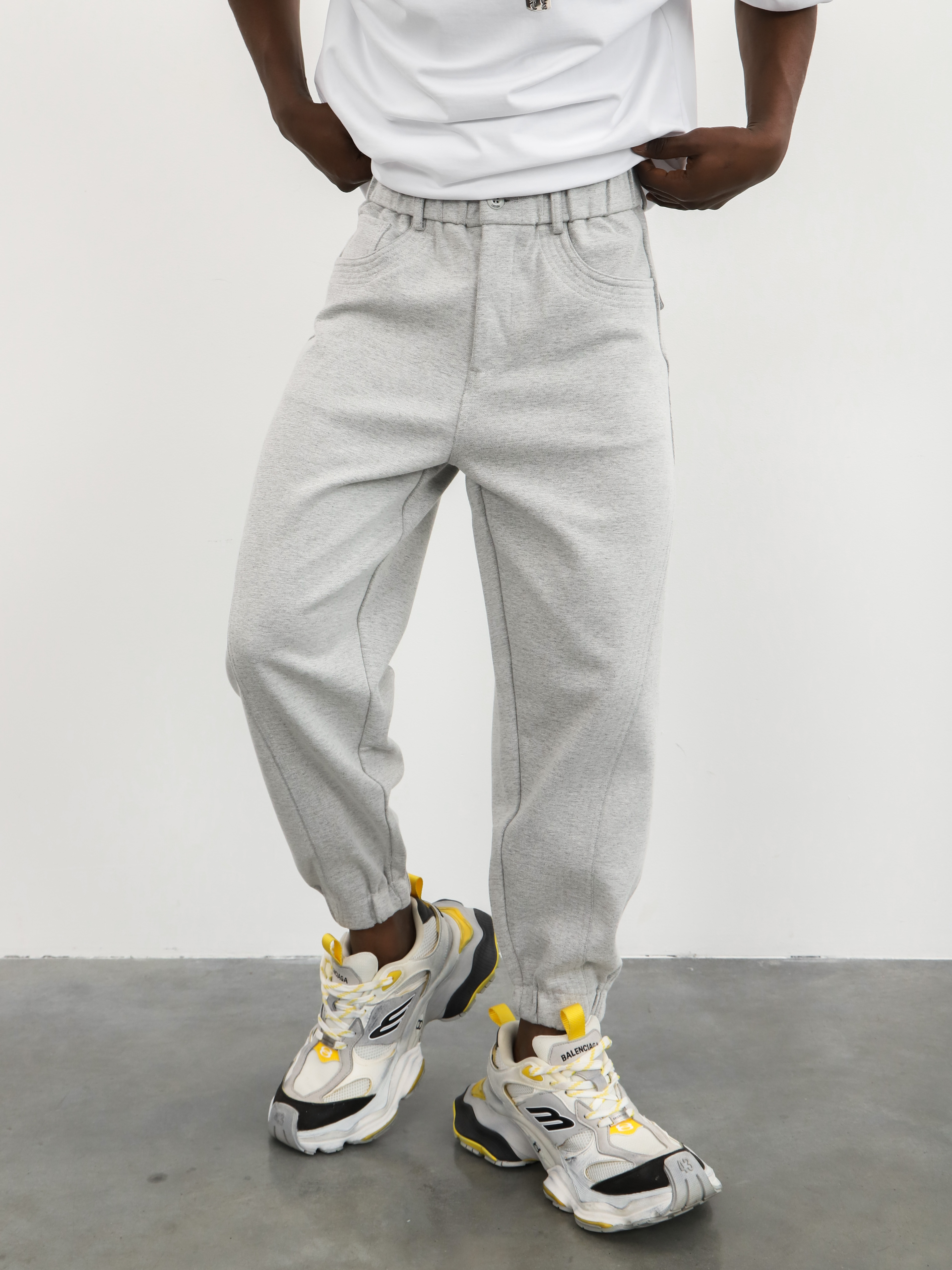 Серые джоггеры с поясом на резинке и манжетами. Современная модель для образов в стиле кэжуал спорт.