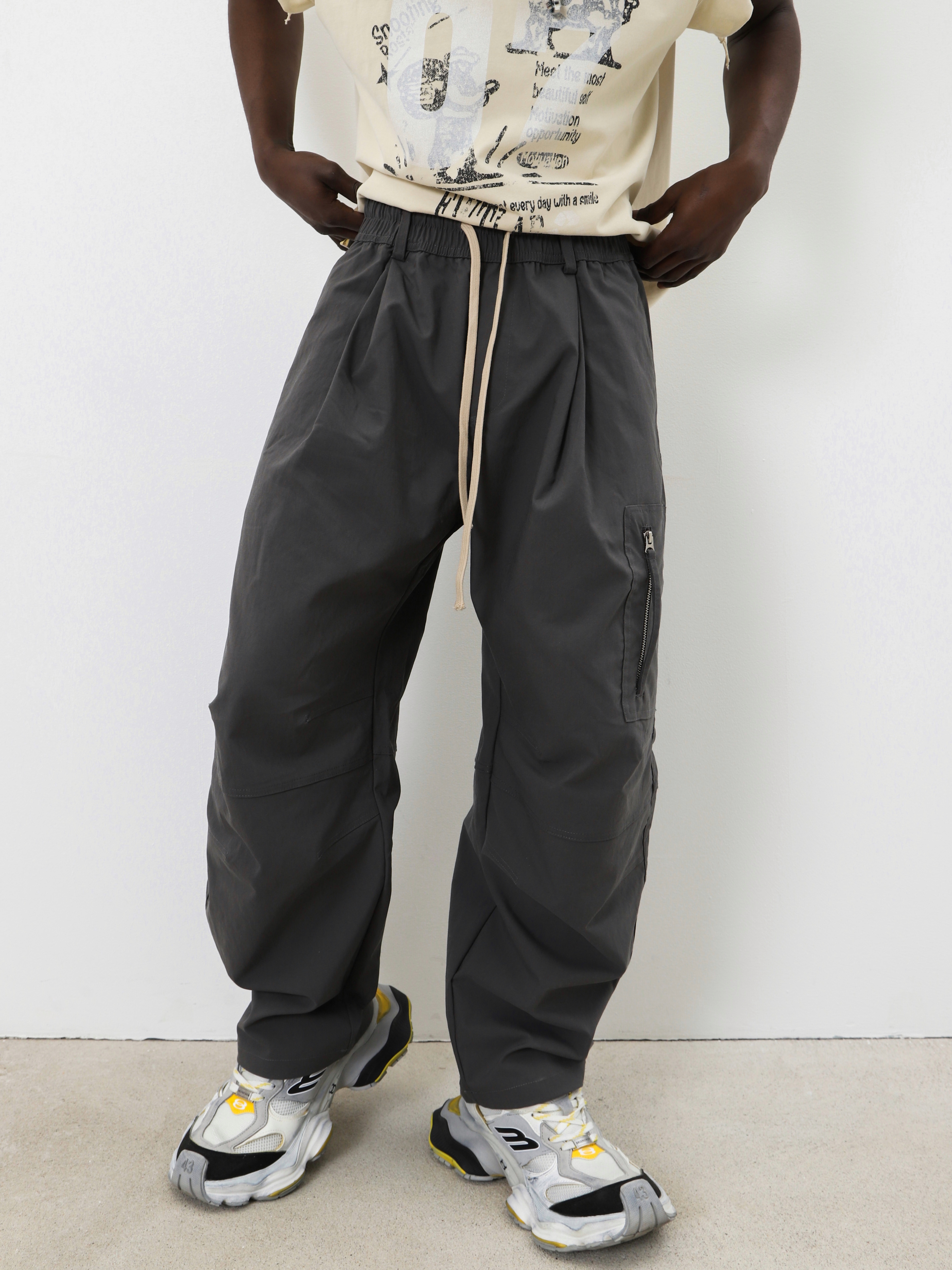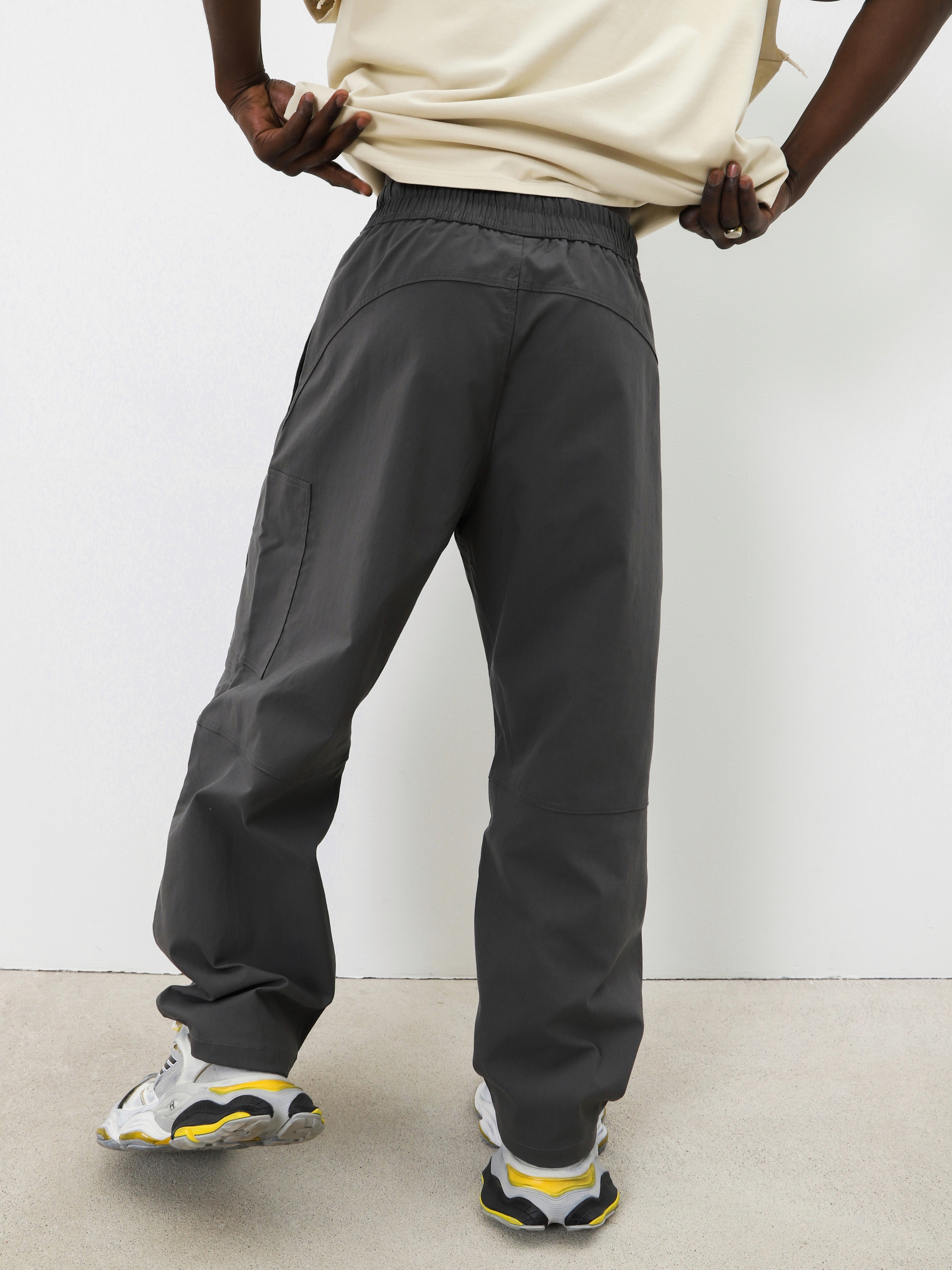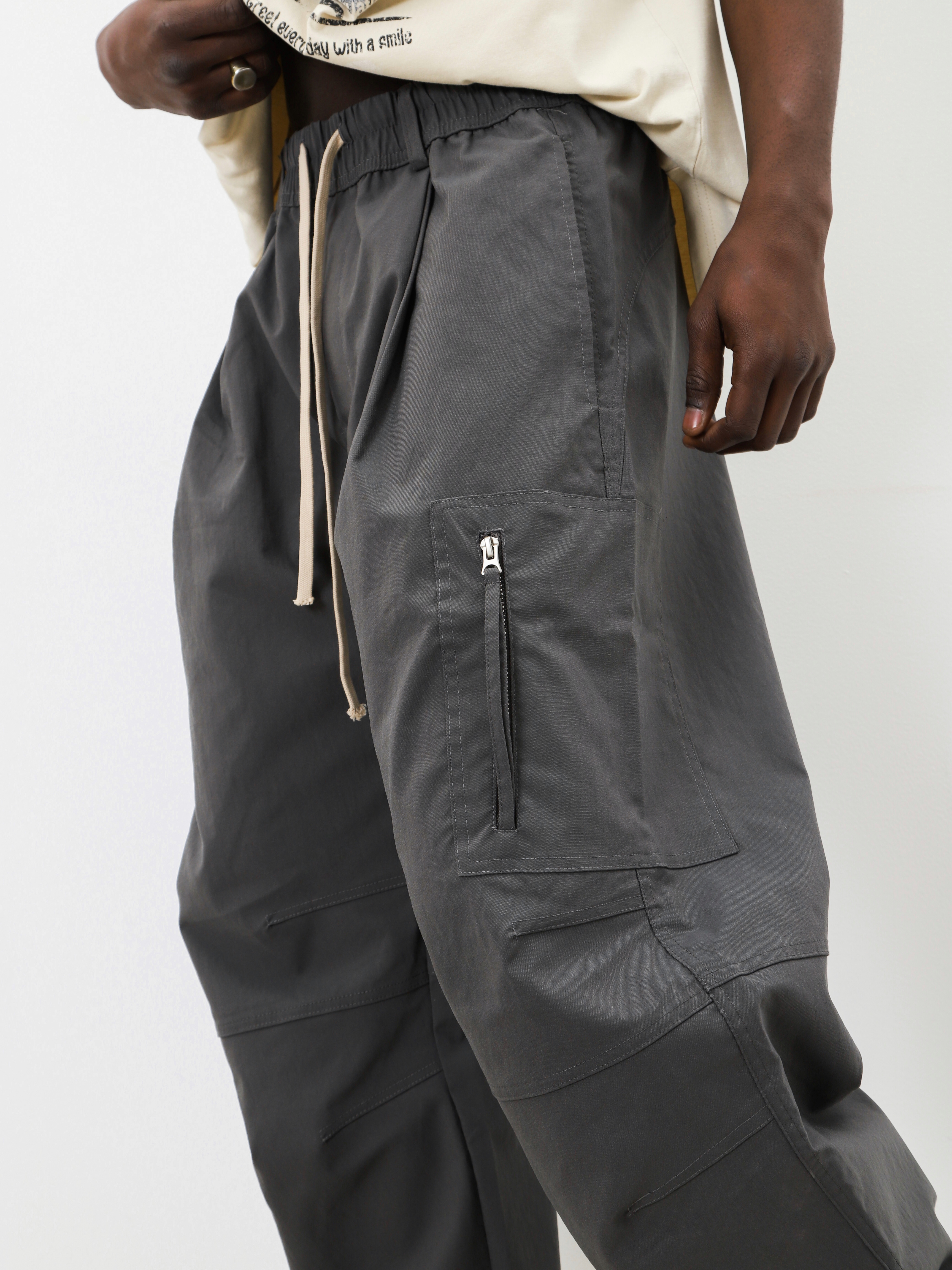Серые брюки с поясом на резинке и контрастным шнурком. Комфортная модель для образов в стиле кэжуал спорт.