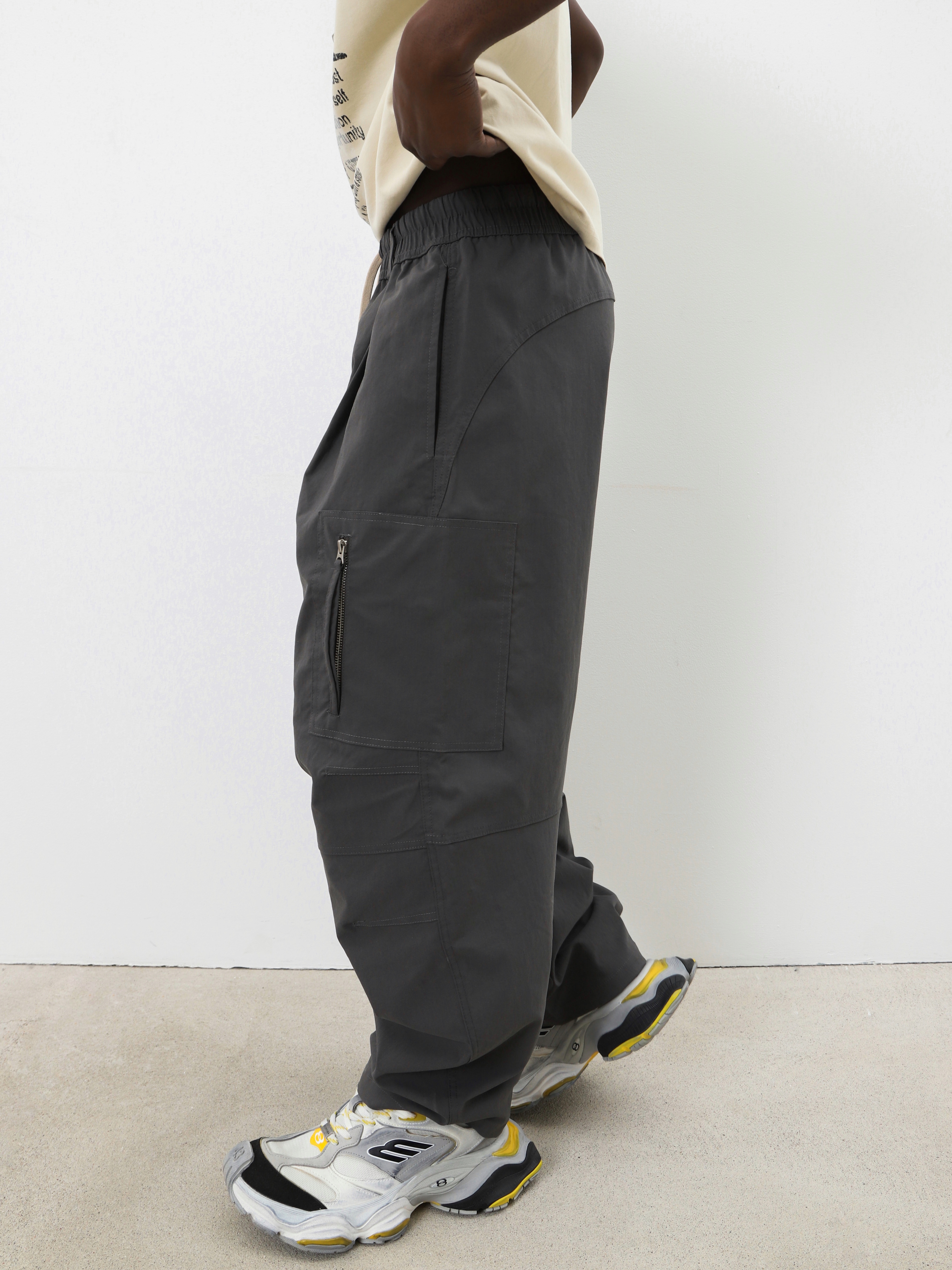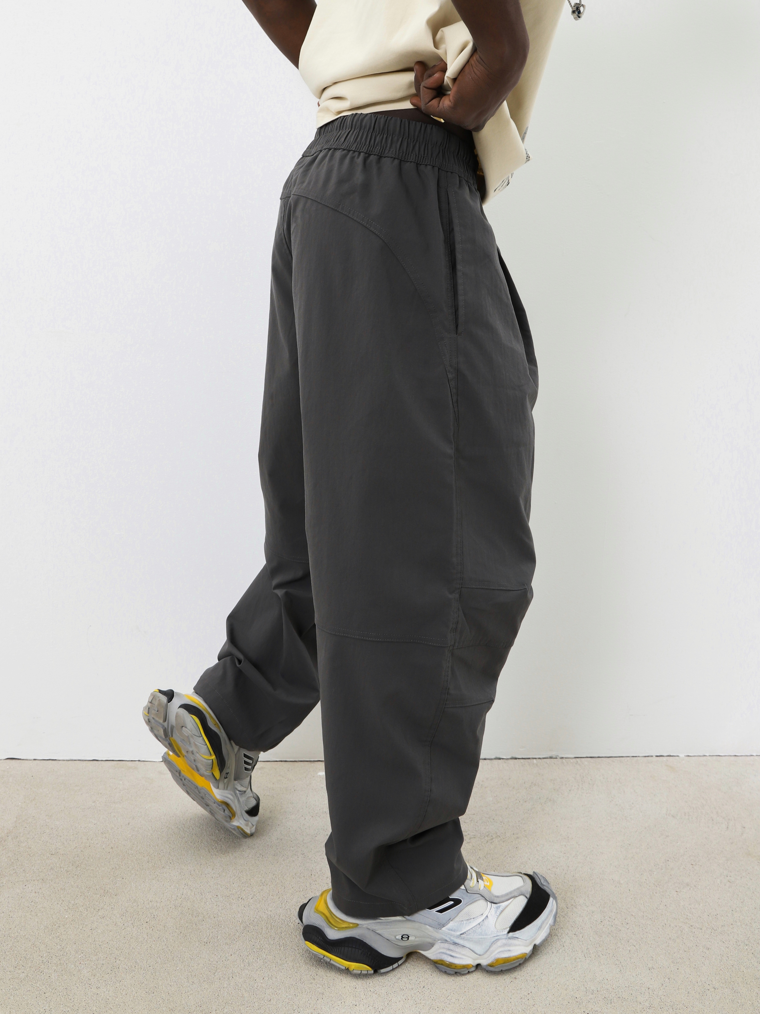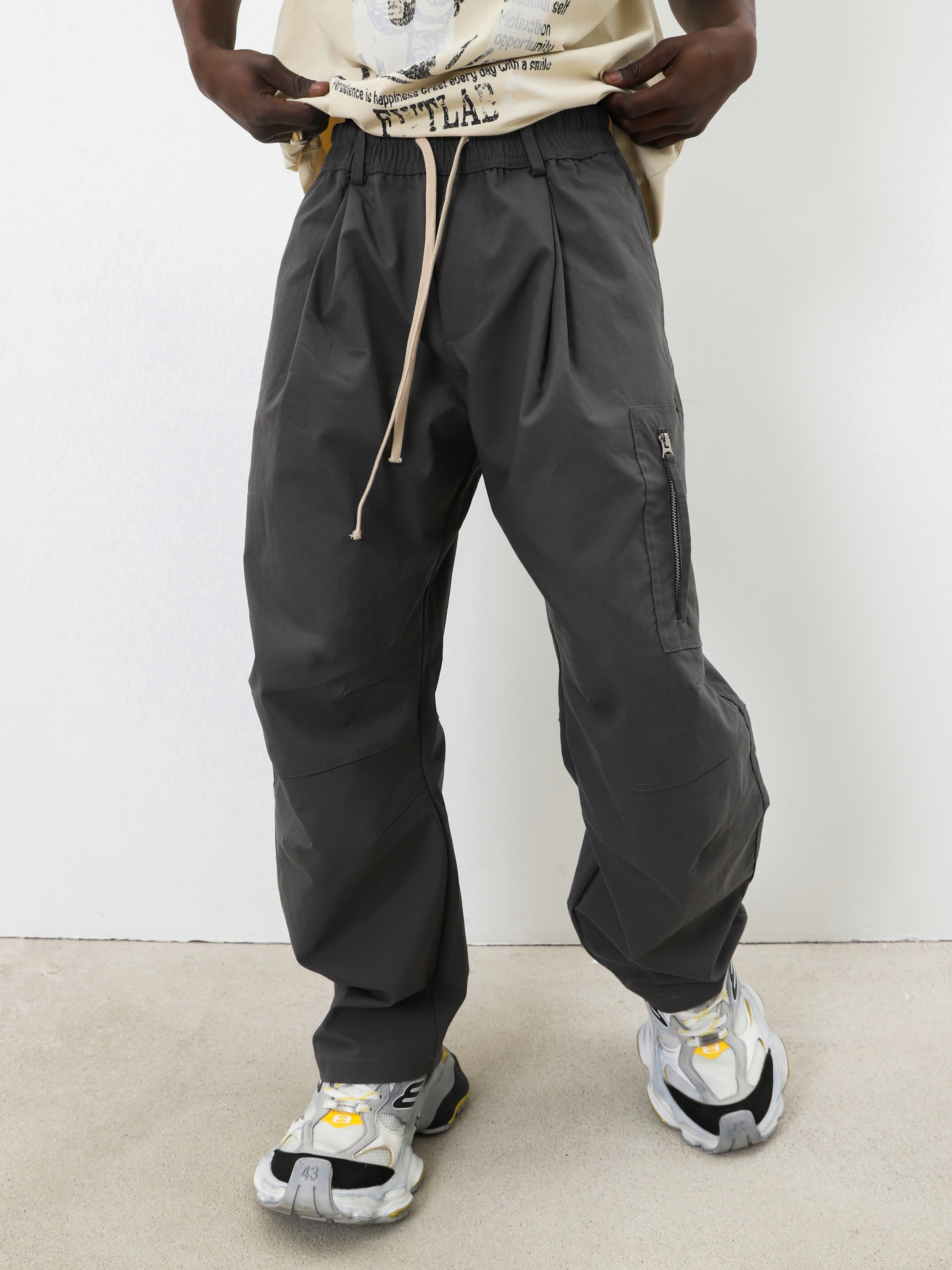Серые брюки с поясом на резинке и контрастным шнурком. Комфортная модель для образов в стиле кэжуал спорт.