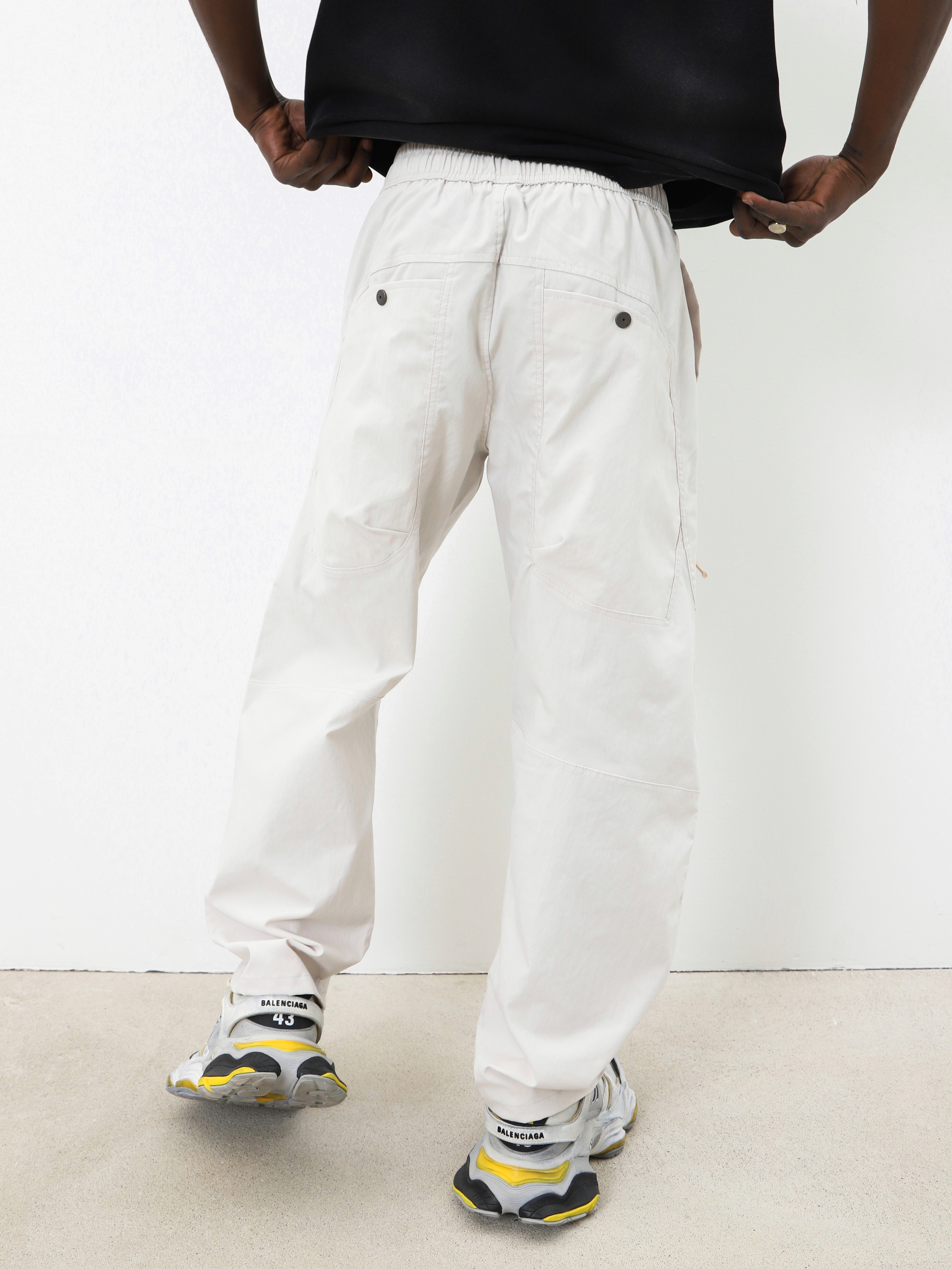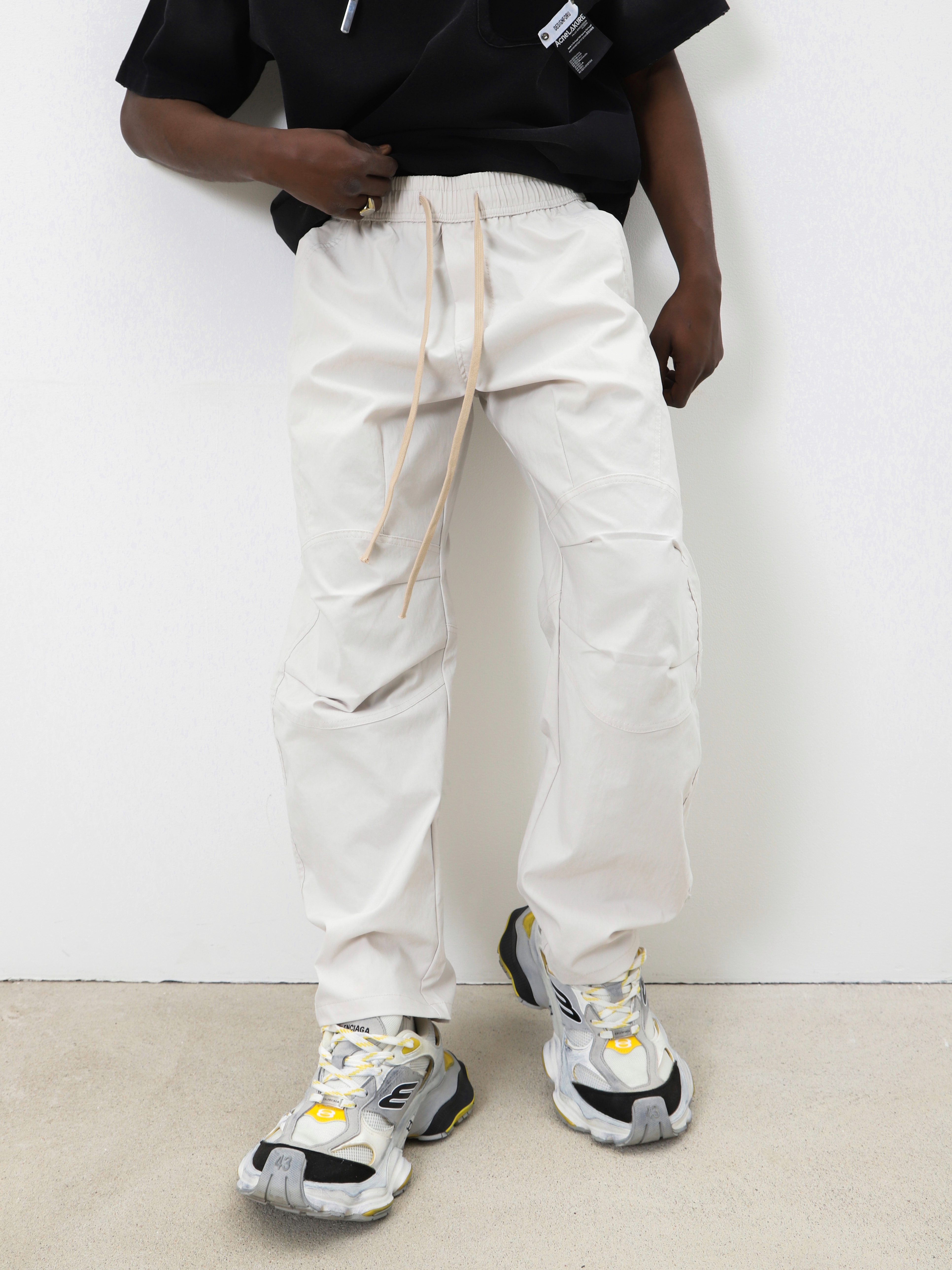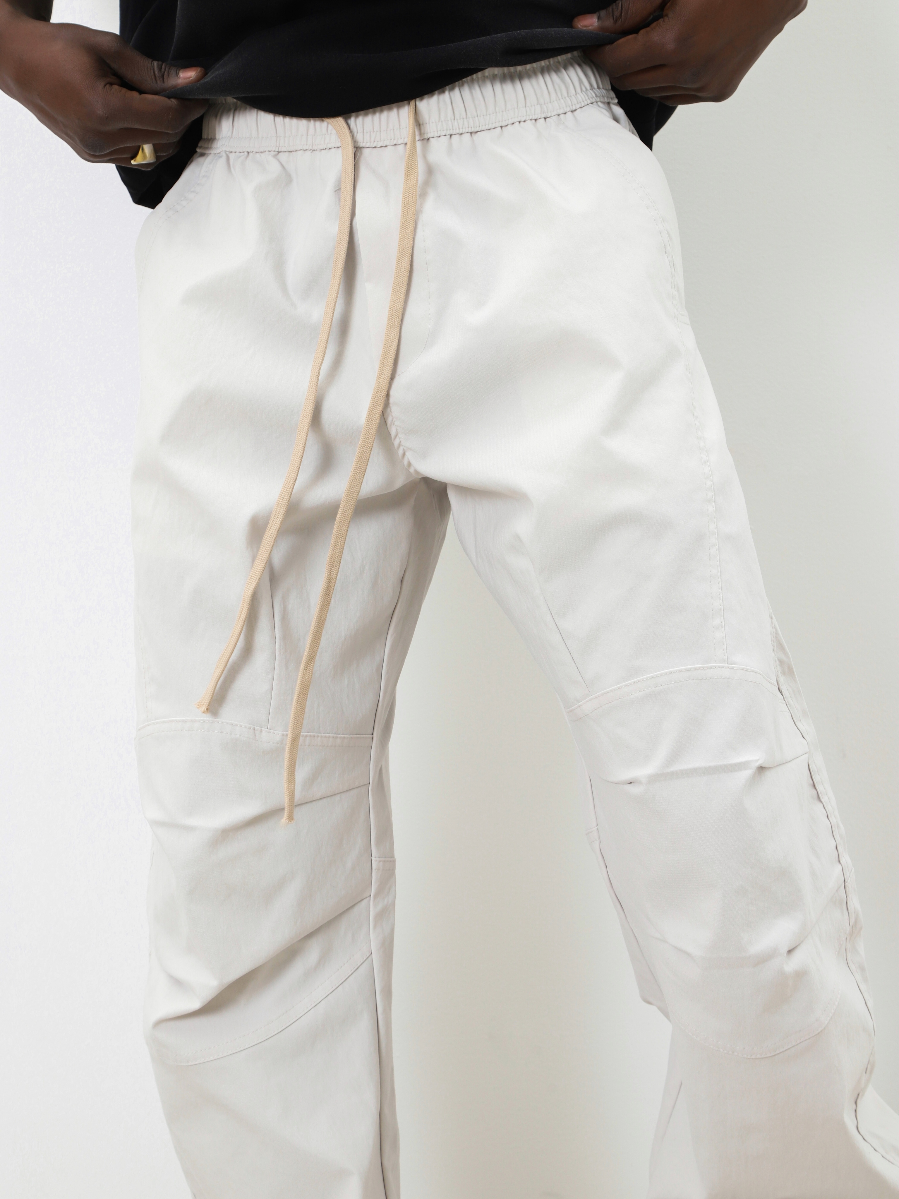 Бежевые брюки с поясом на резинке и контрастным шнурком. Комфортная модель для образов в стиле кэжуал спорт.