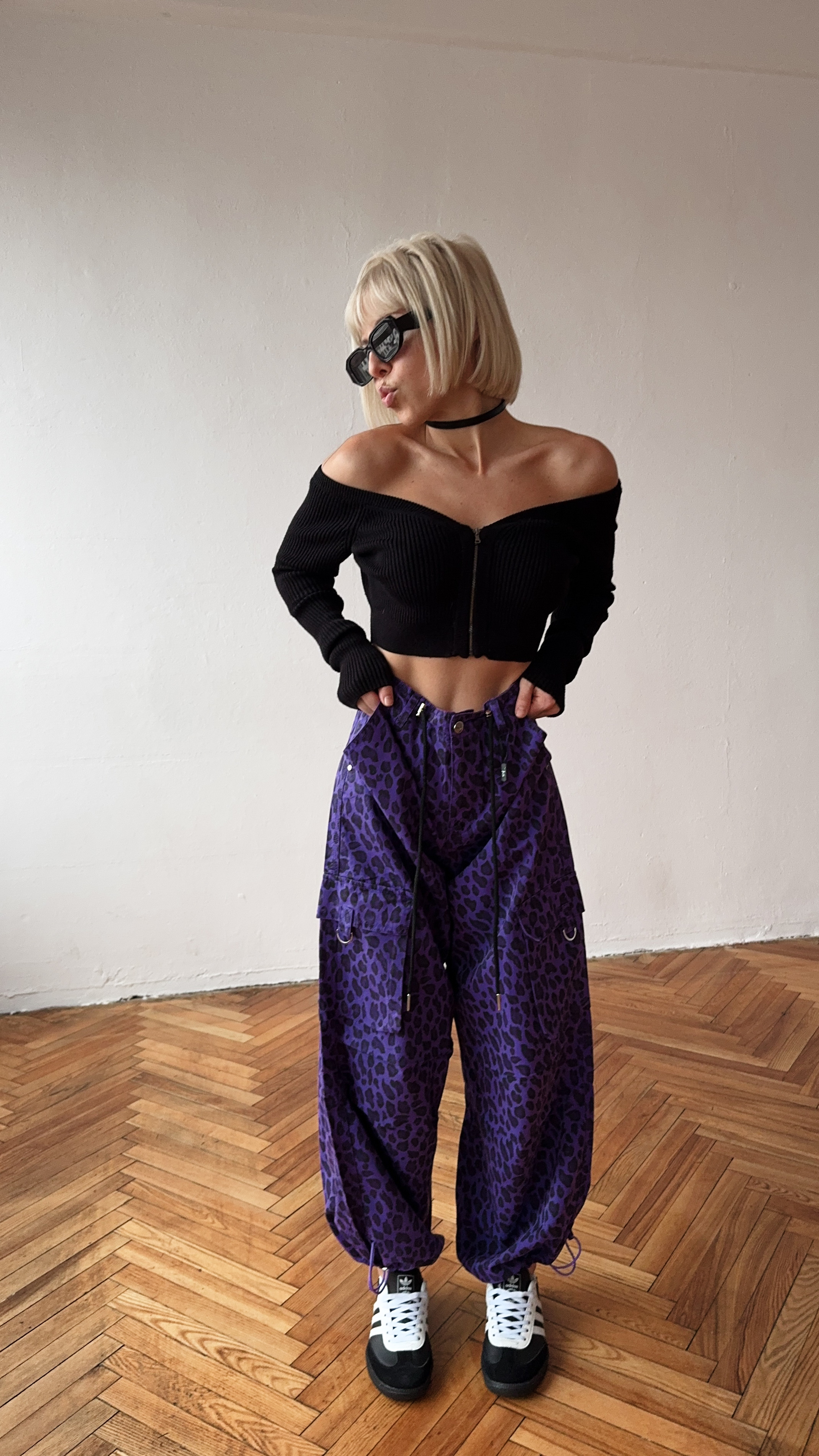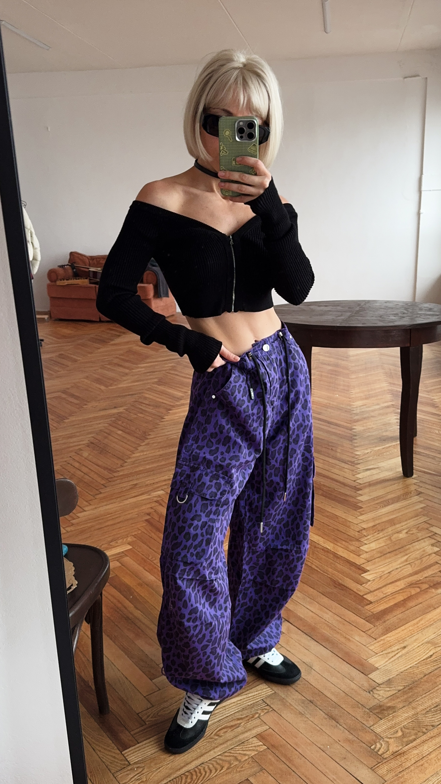 Фиолетовые брюки карго с леопардовым принтом. Яркая модель для создания стильных городских образов.