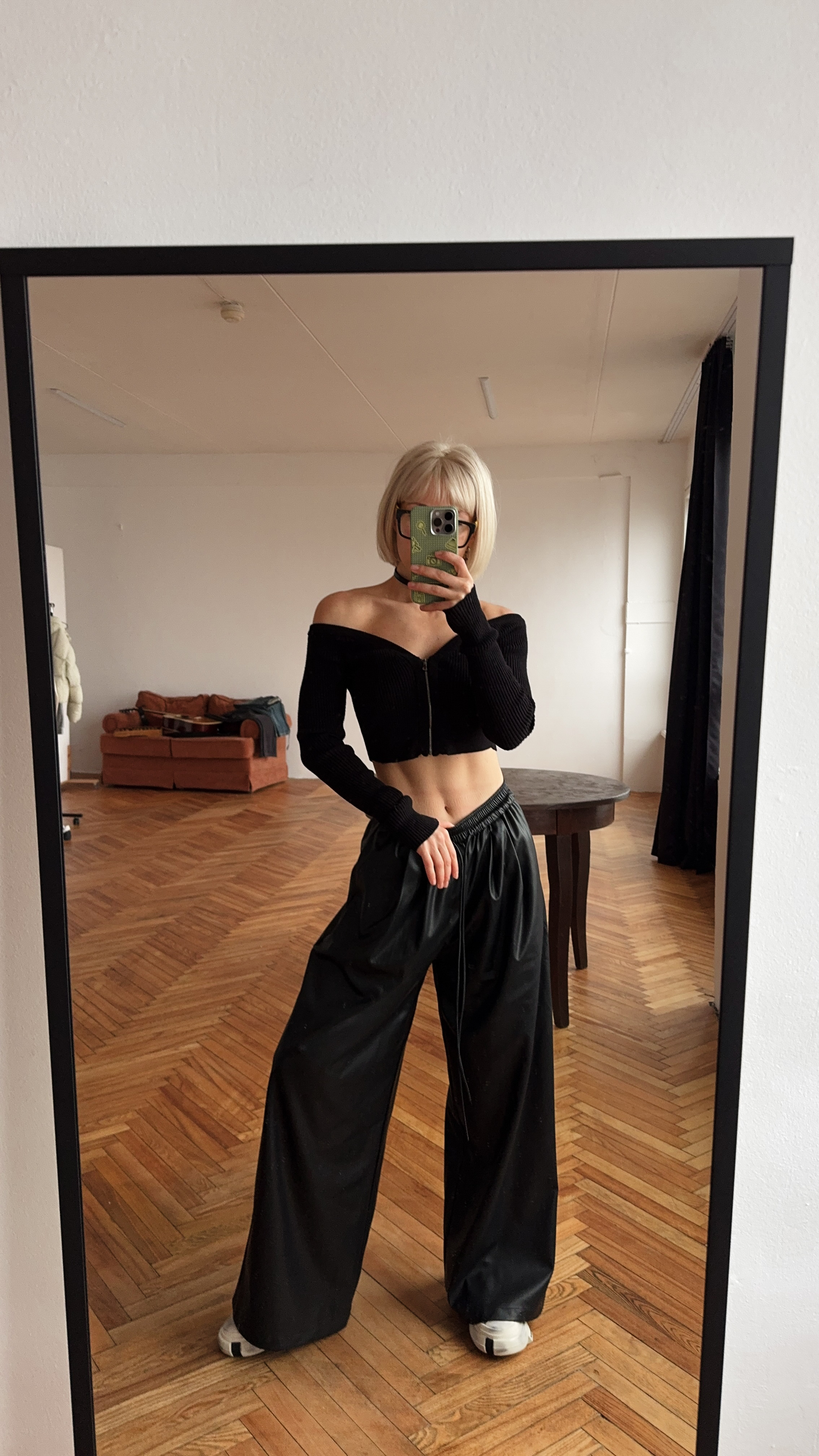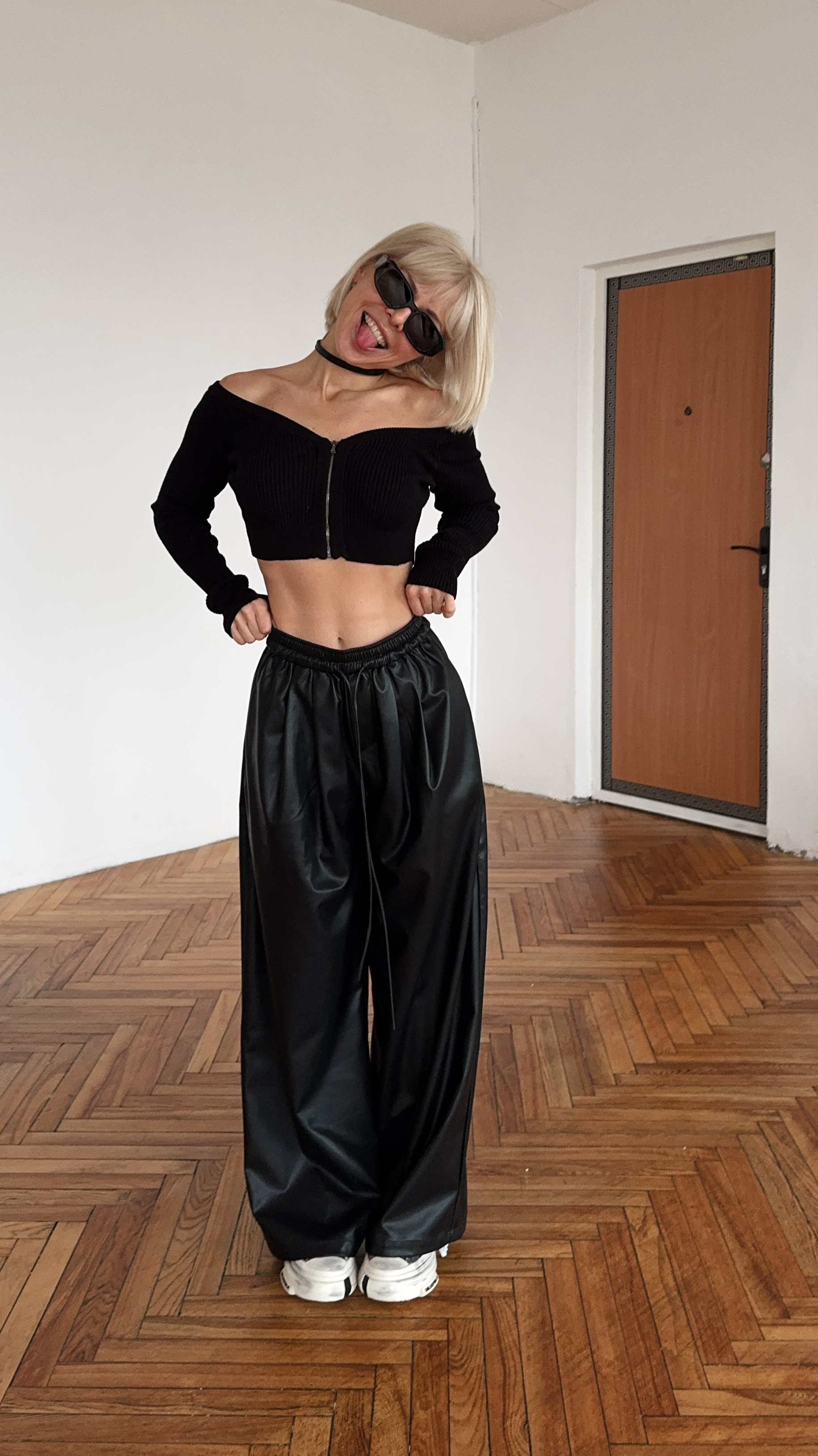 Широкие женские брюки из экокожи черного цвета. Свободная модель с поясом на резинке для стильных повседневных образов.