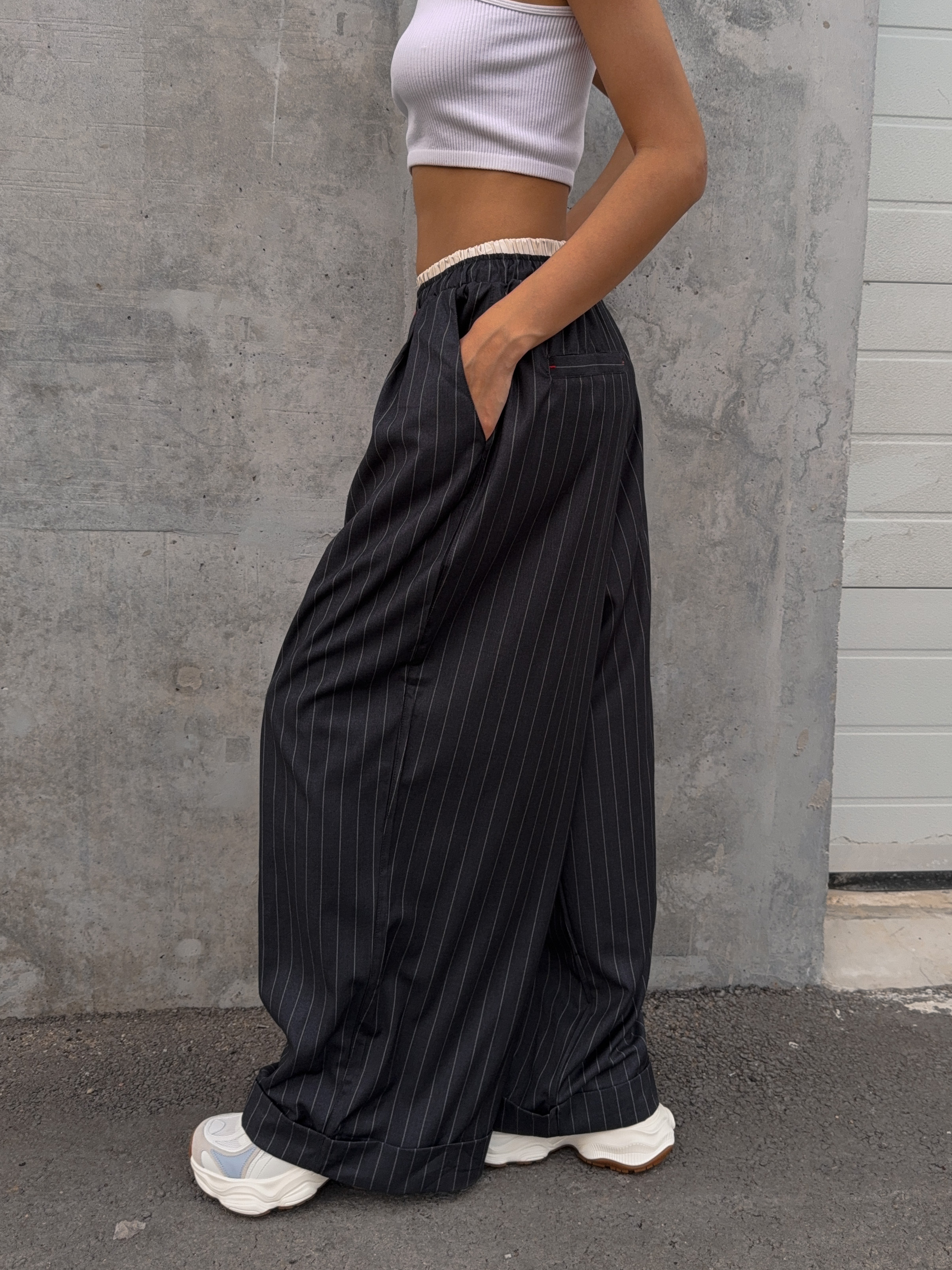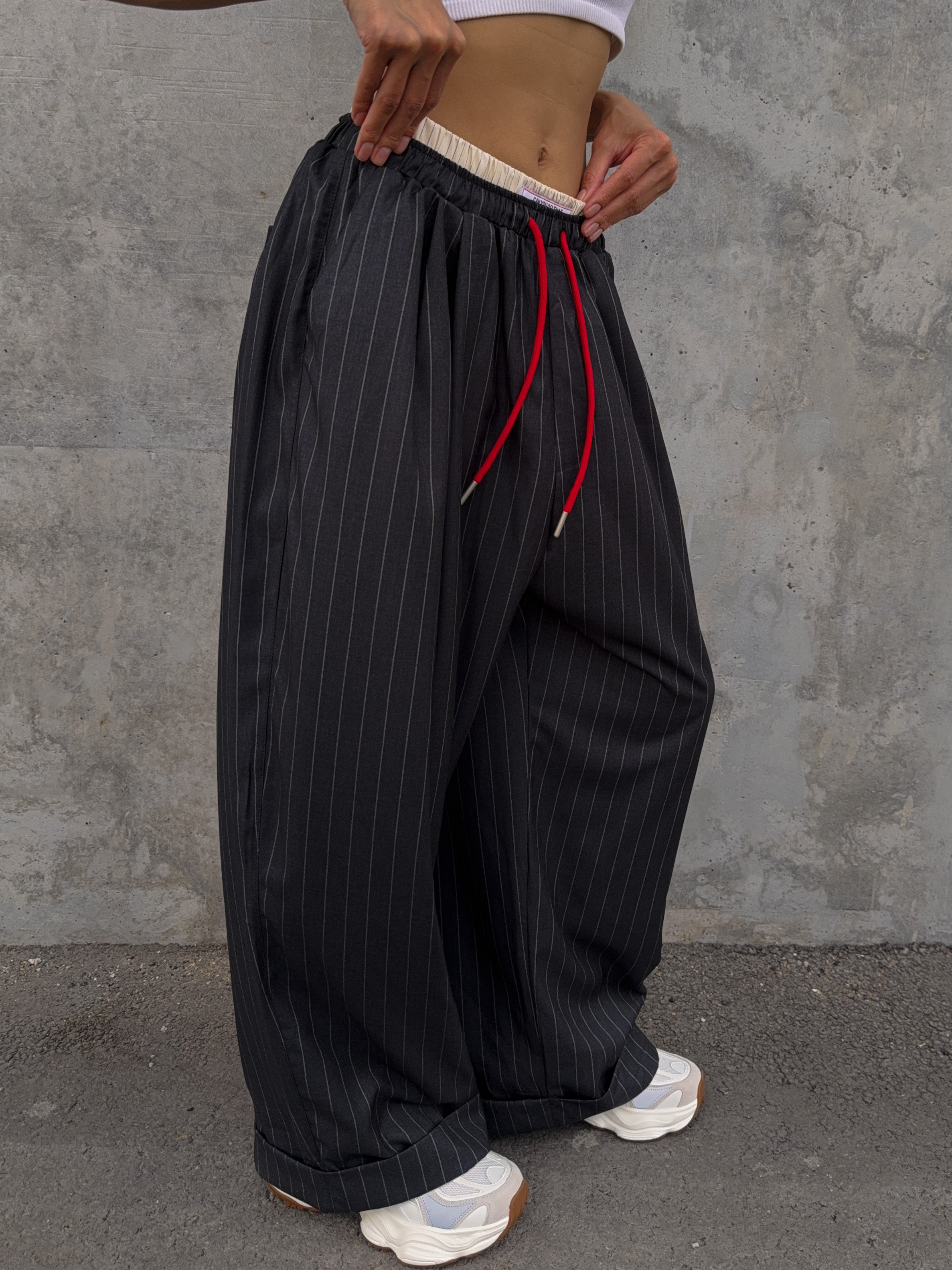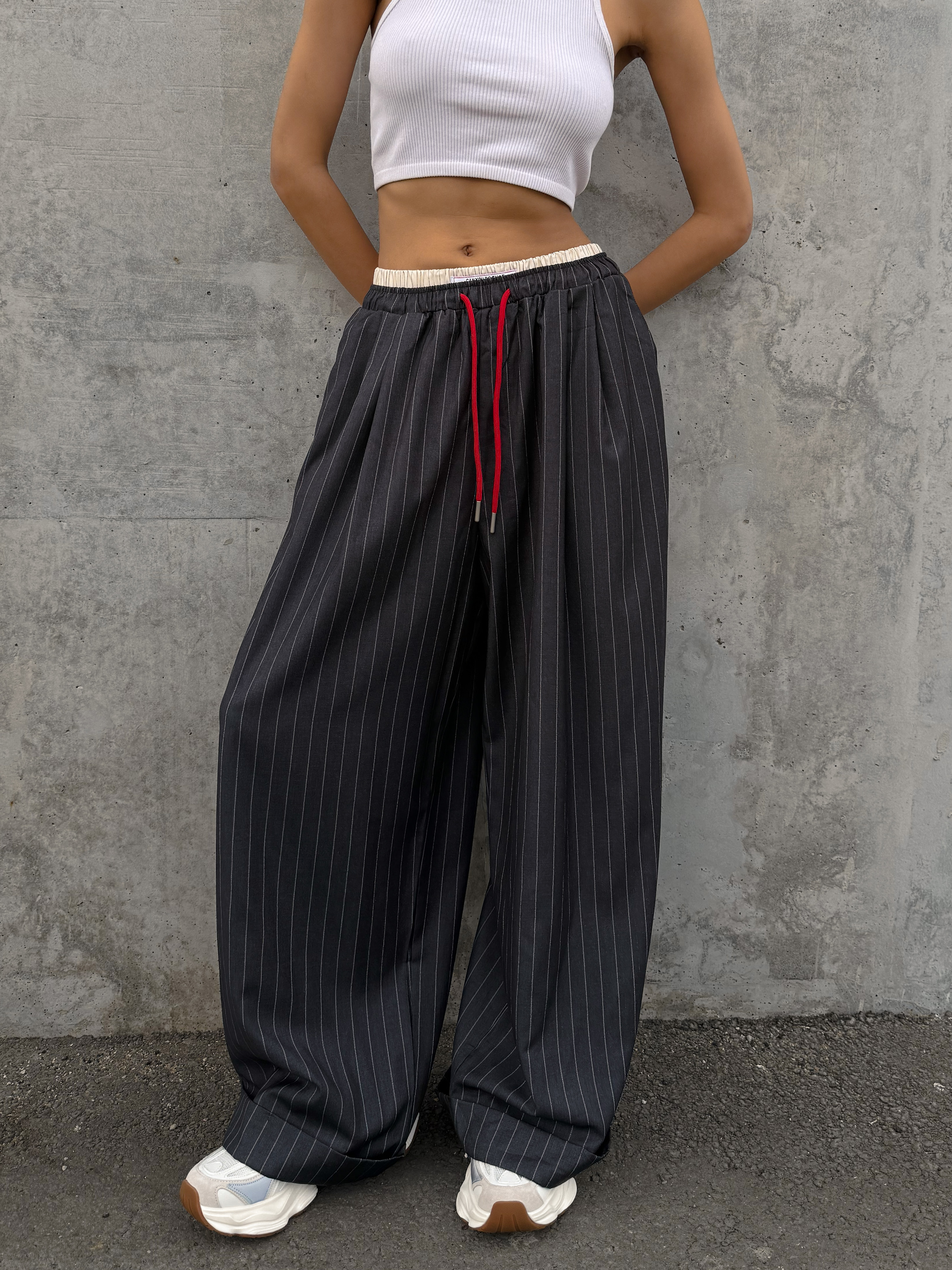 Стильные широкие брюки в полоску с поясом на резинке и шнурком. Классическая модель брюк с современными элементами.