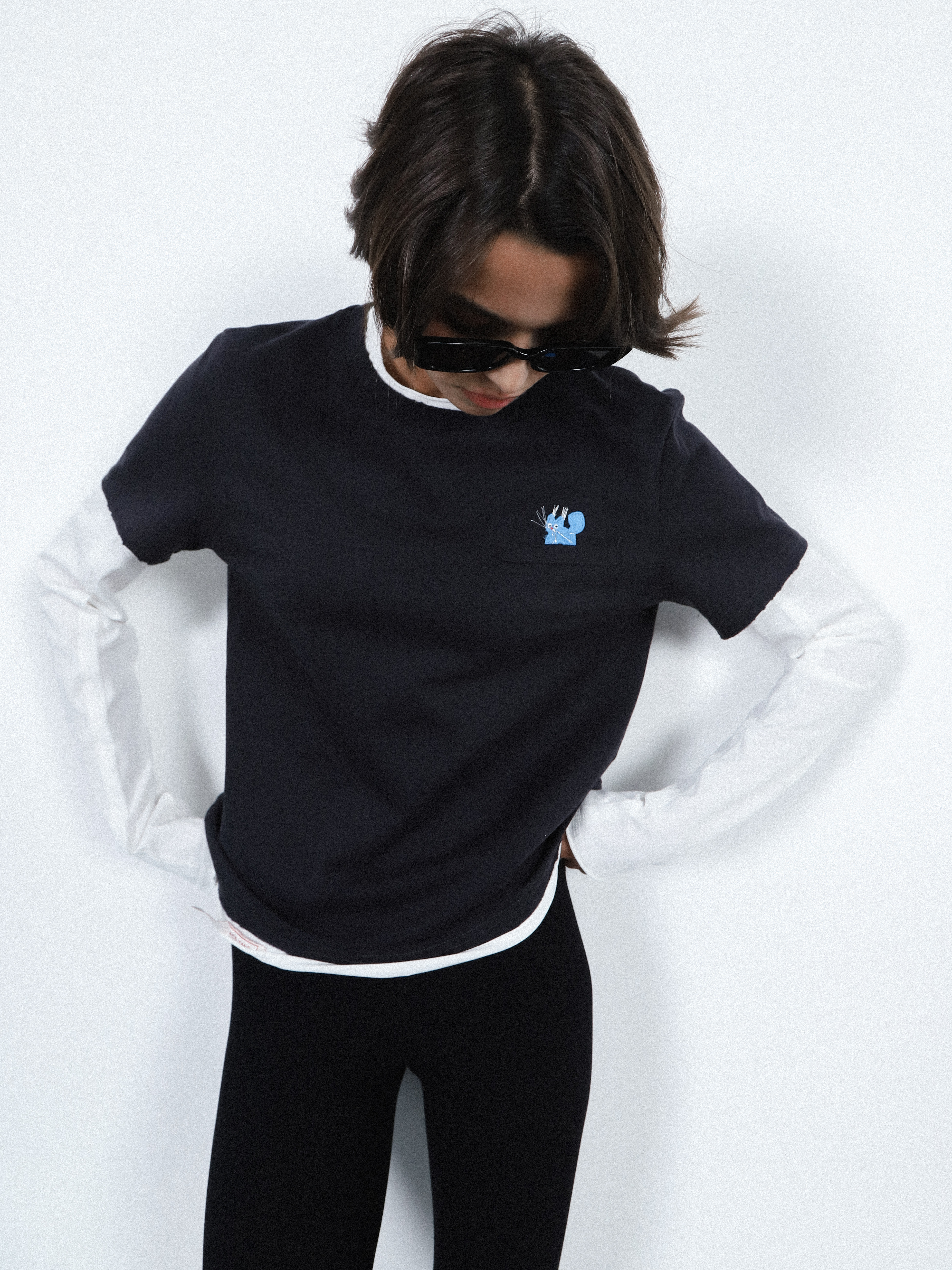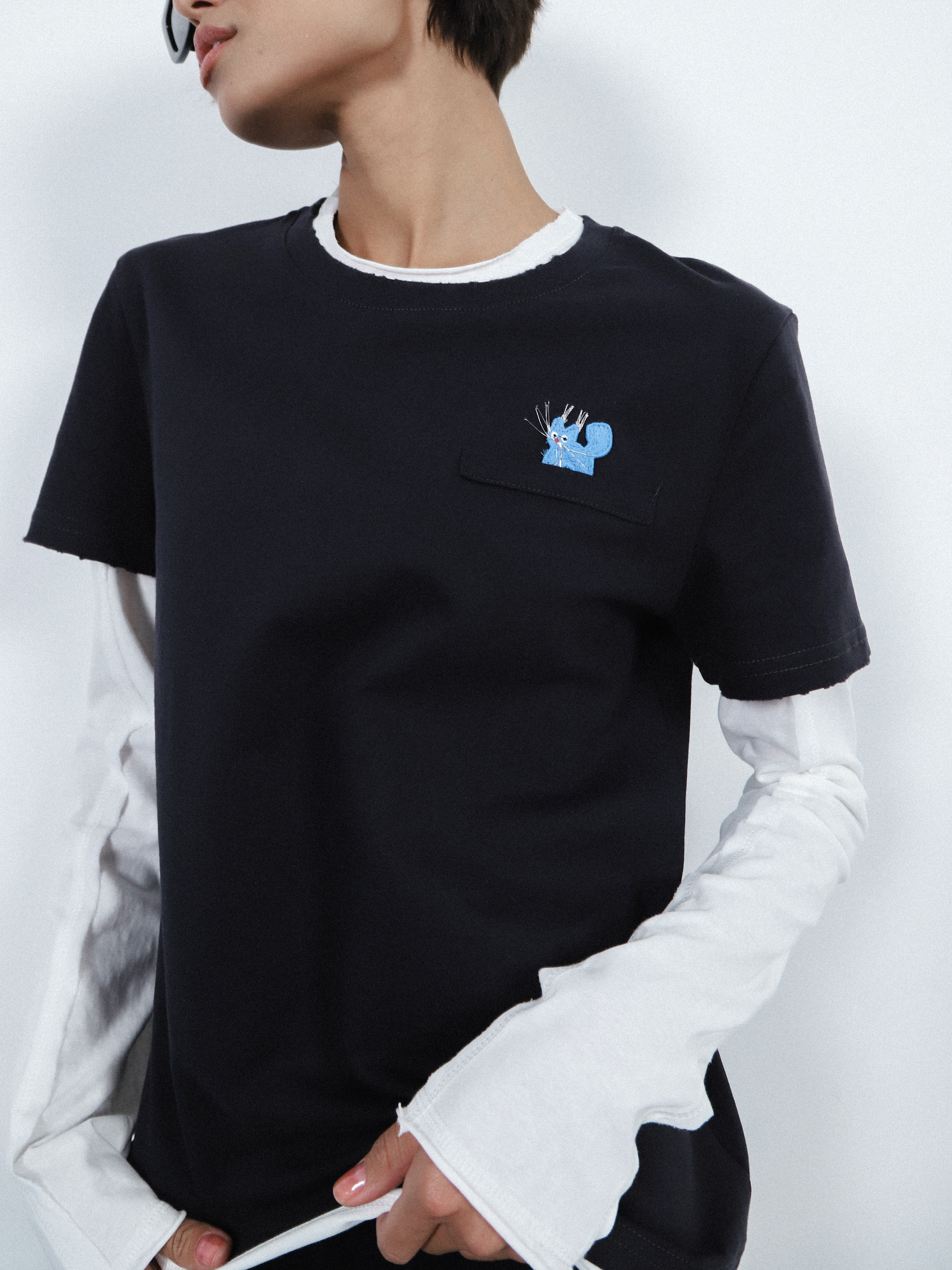 Черно-белый лонгслив с имитацией футболки. Контрастный рукав, эффект потертого края и небольшая яркая нашивка сделают ваш образ интересным и стильным.