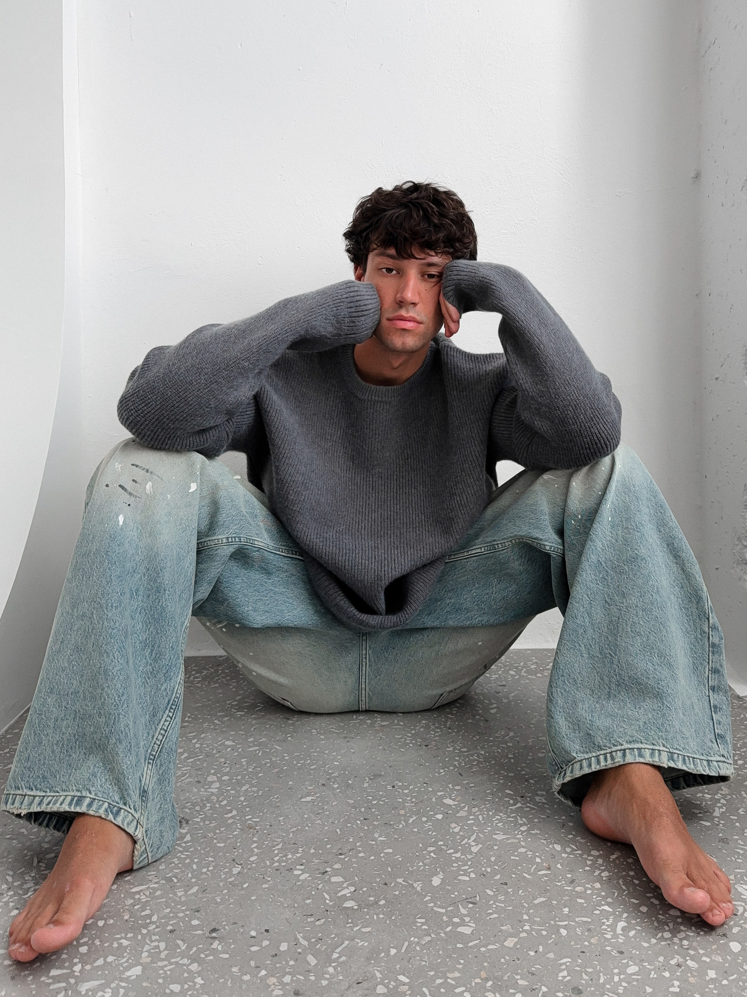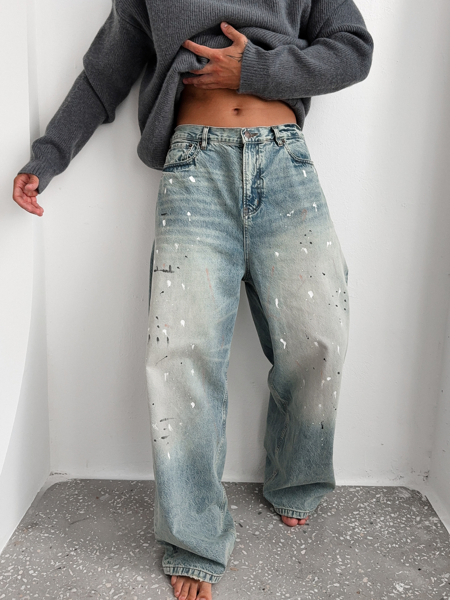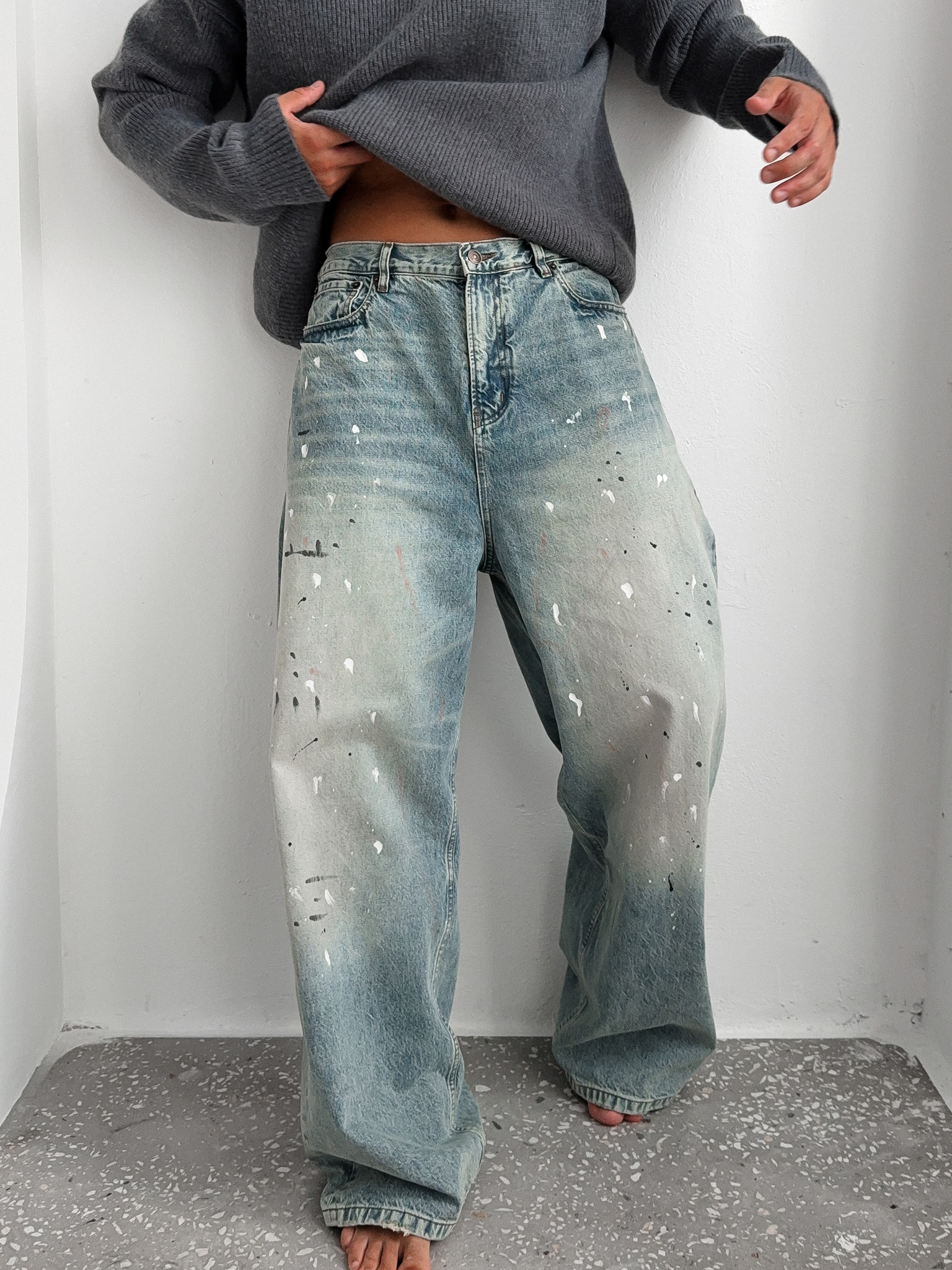 Мужские широкие джинсы трубы голубого цвета. Джинсы "выпачканы" краской и исписаны мелом. Плотный стопроцентный хлопок. Джинсы с пятнами краски и эффектом потертости.