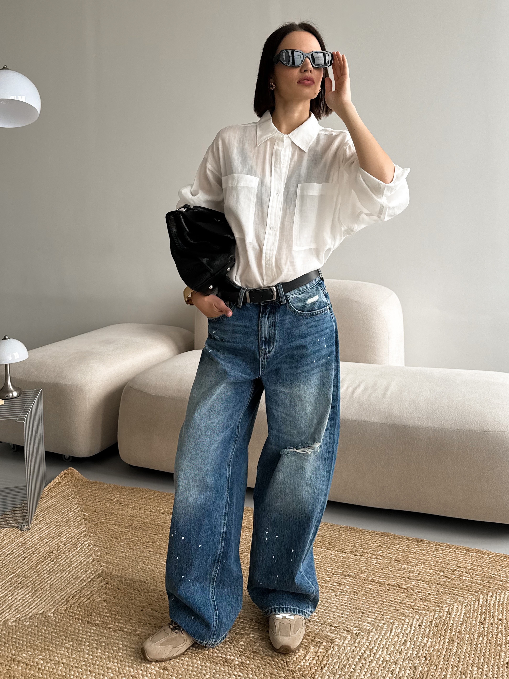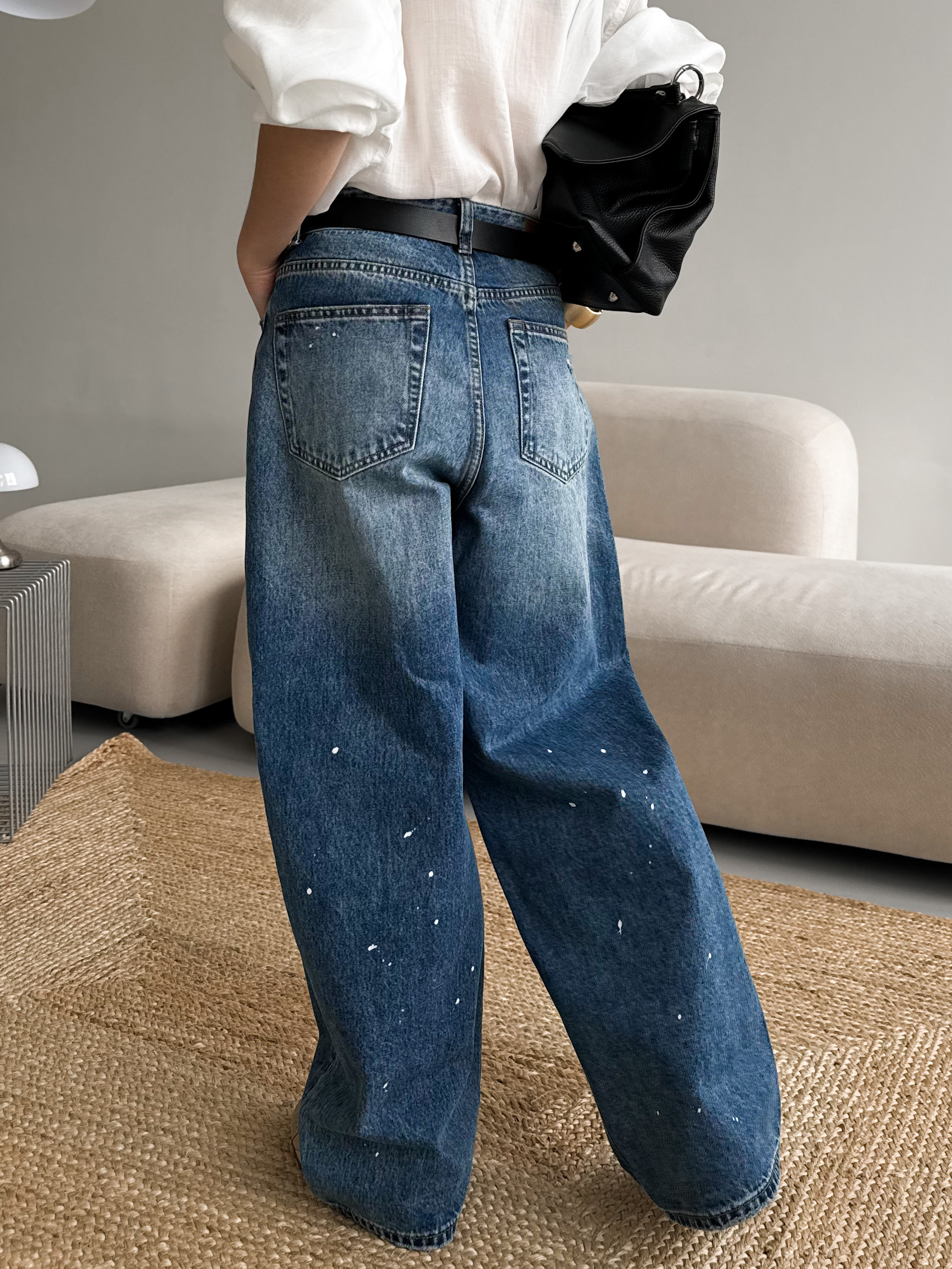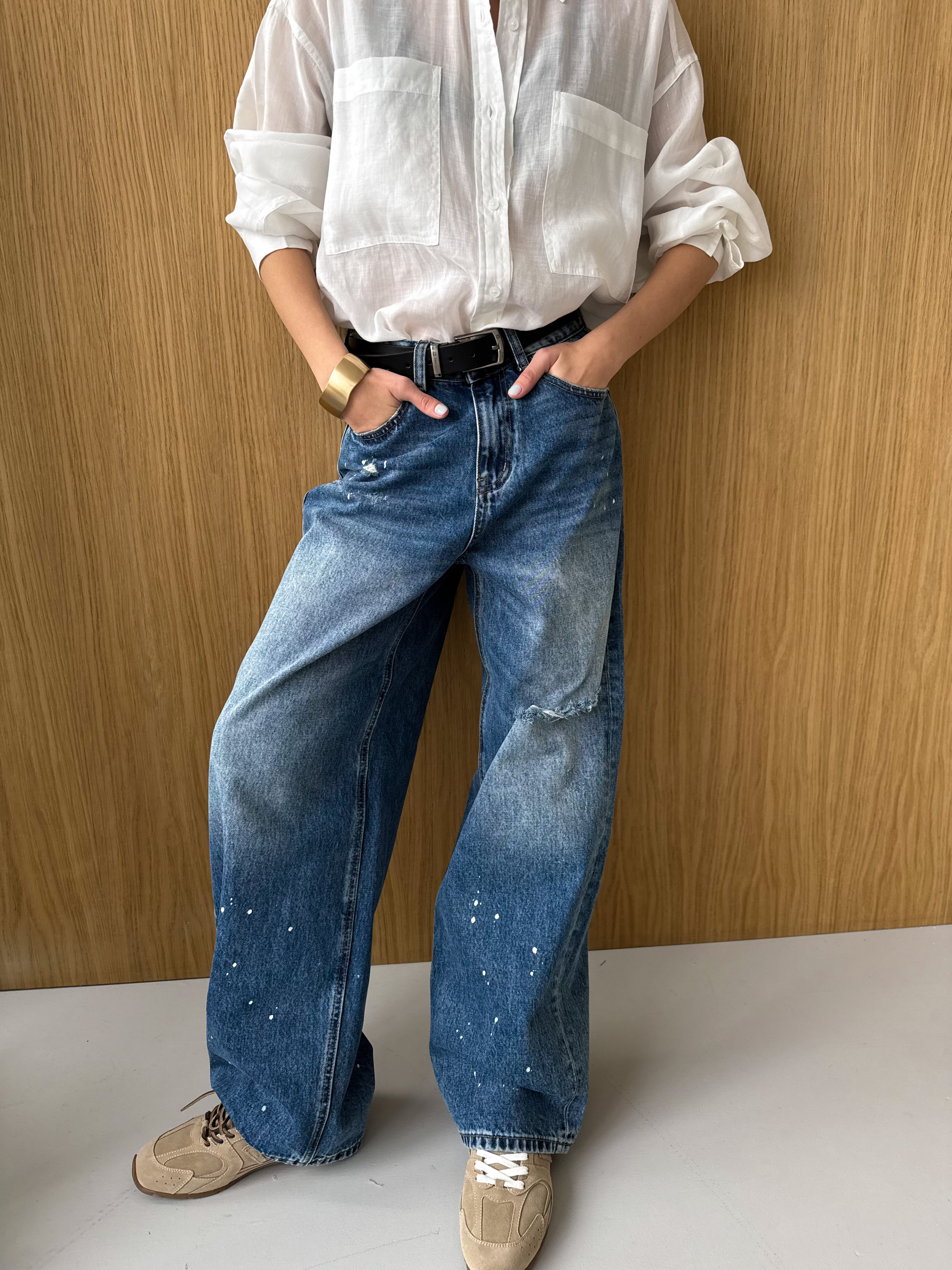 Широкие рваные джинсы с имитацией брызг краски для создания стильных городских образов.