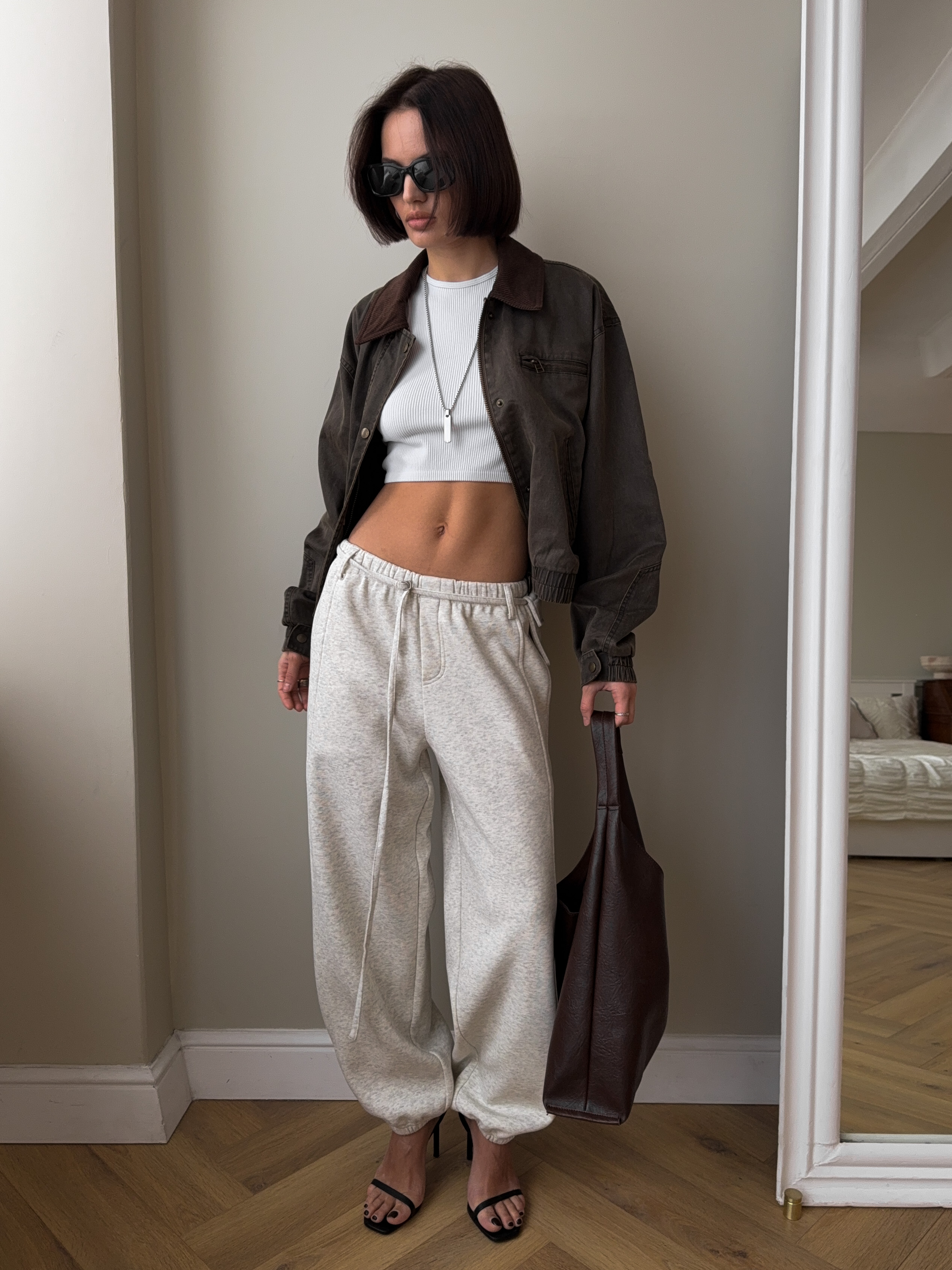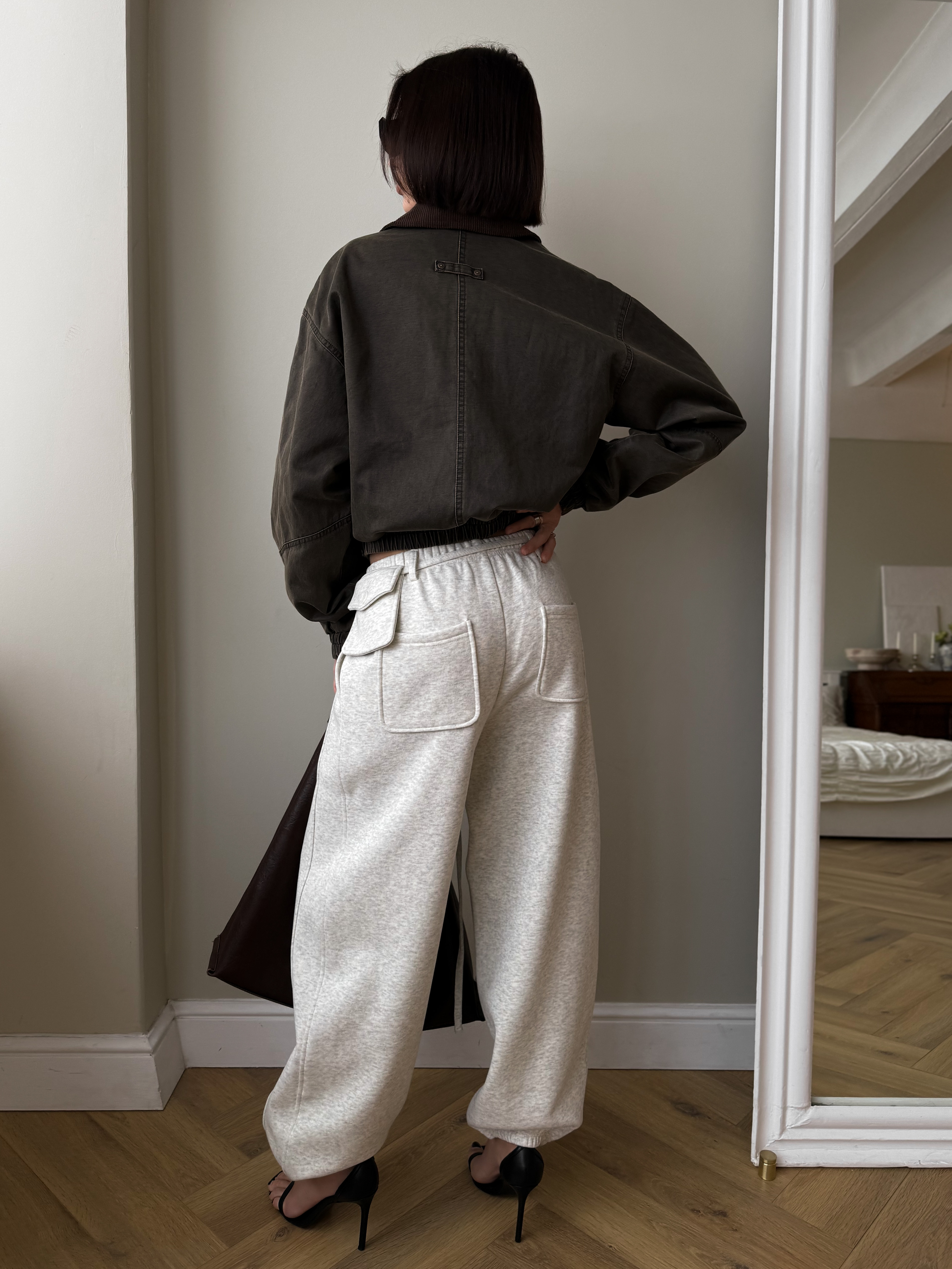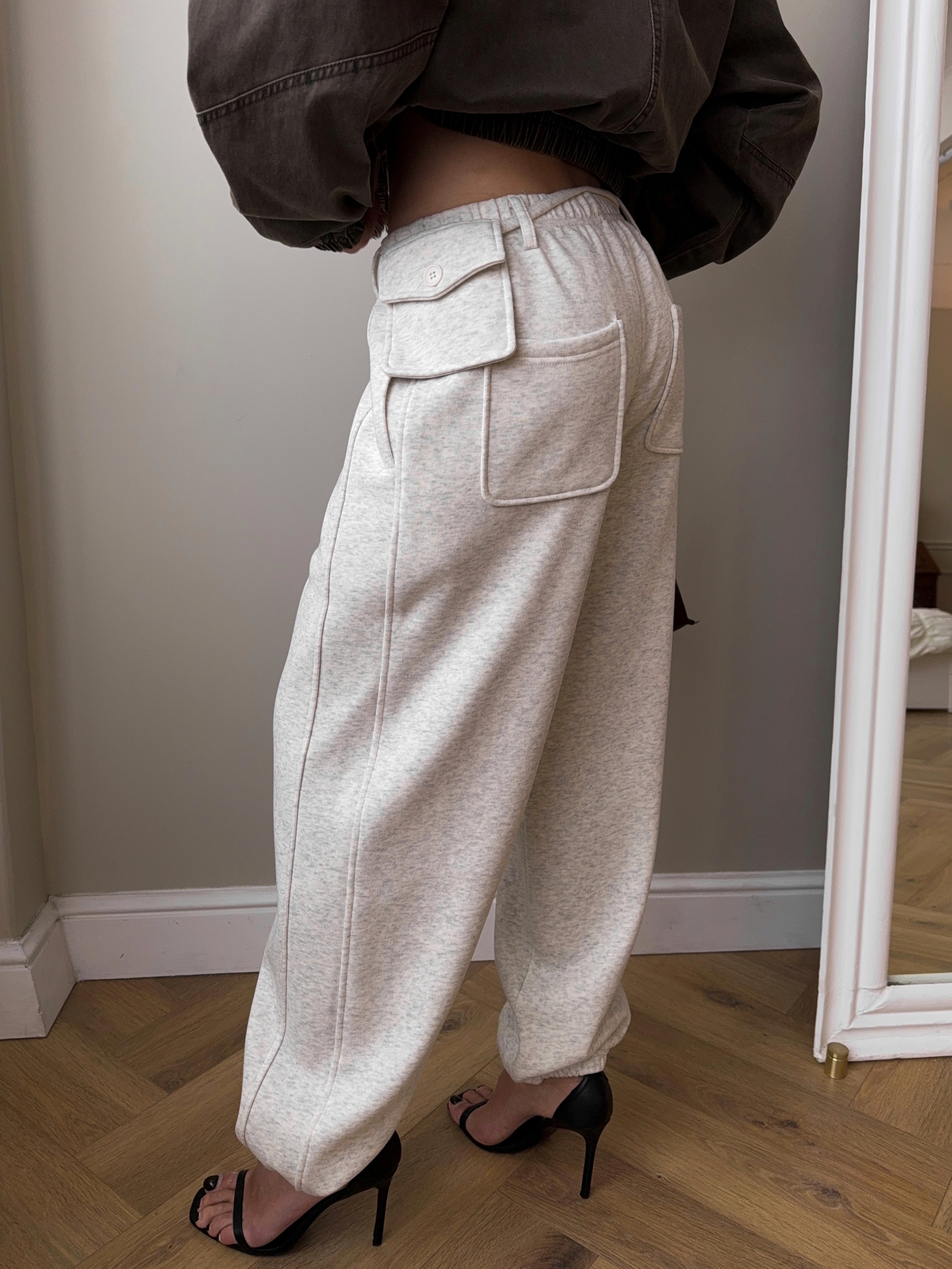 Серые спортивные брюки со съемным декоративным карманом для небанальных образов в стиле спорт-кэжуал.
