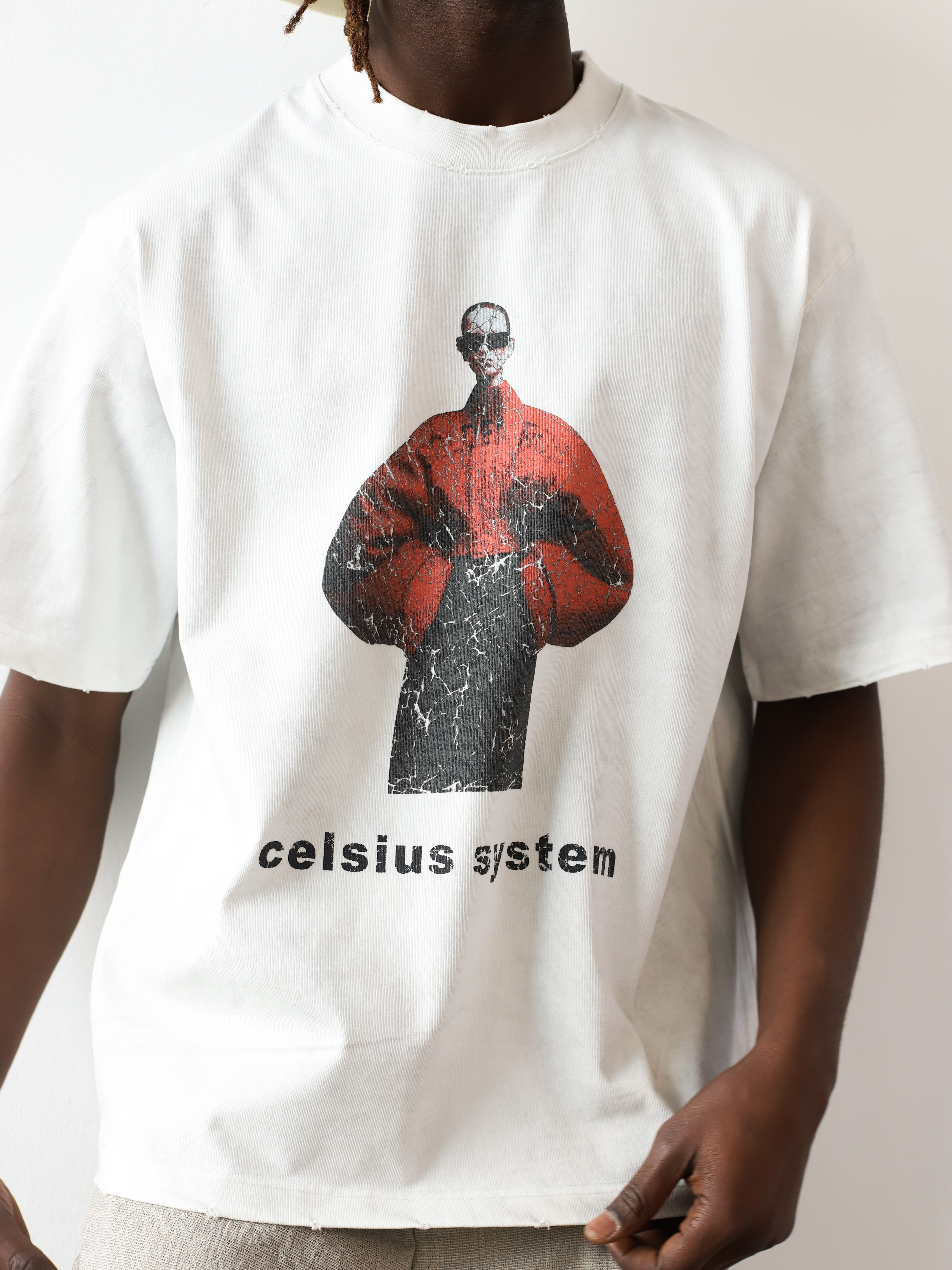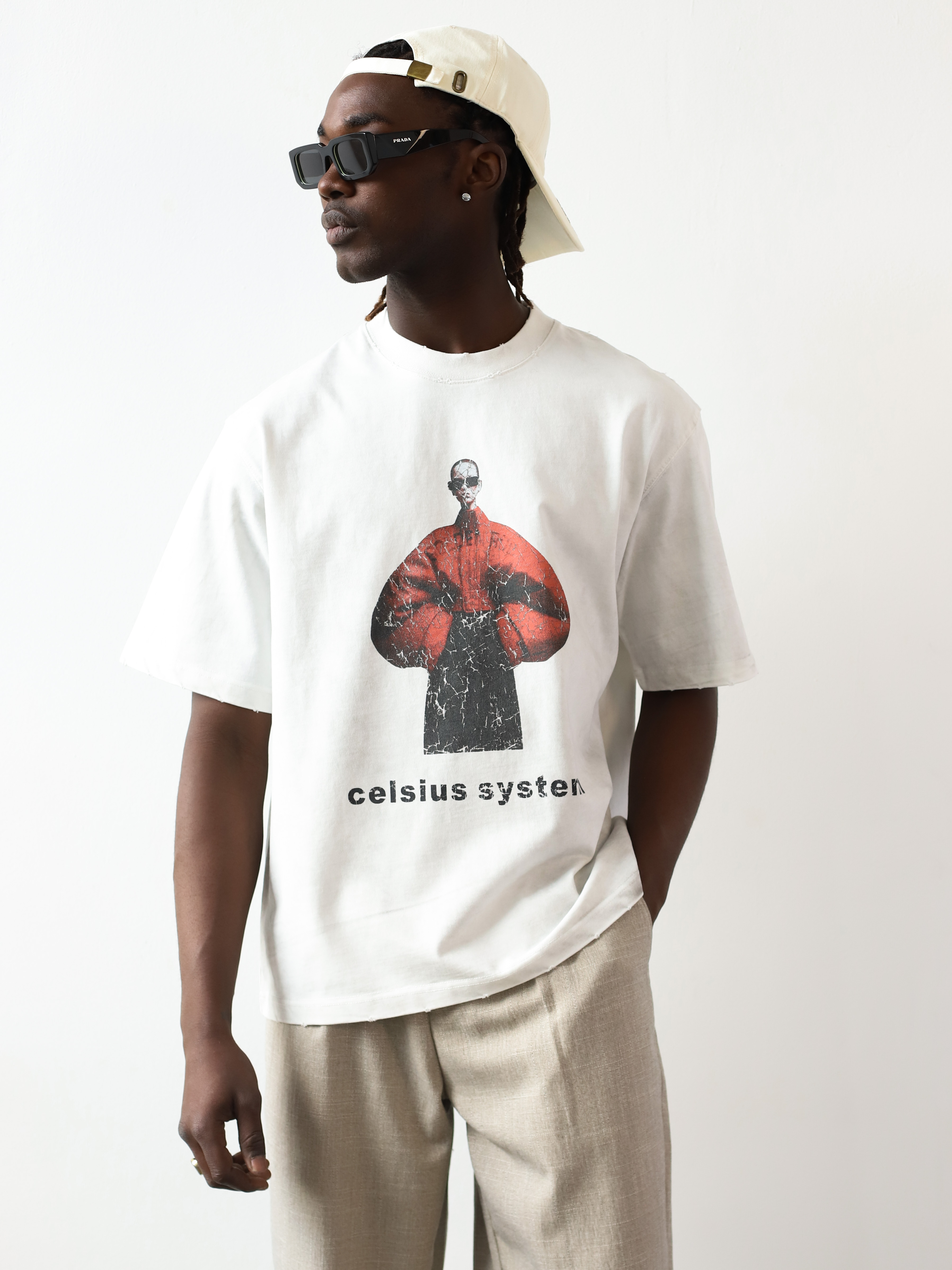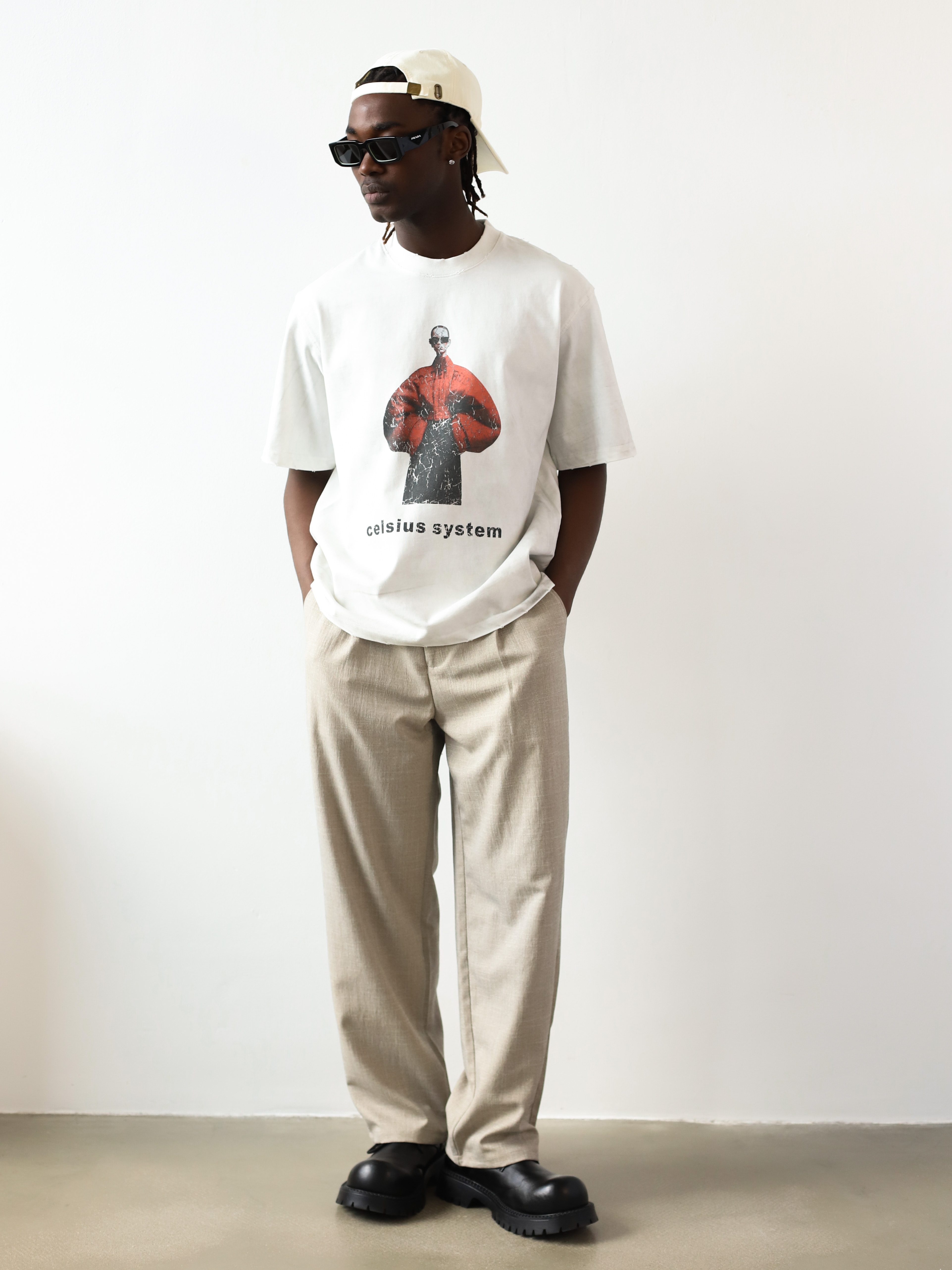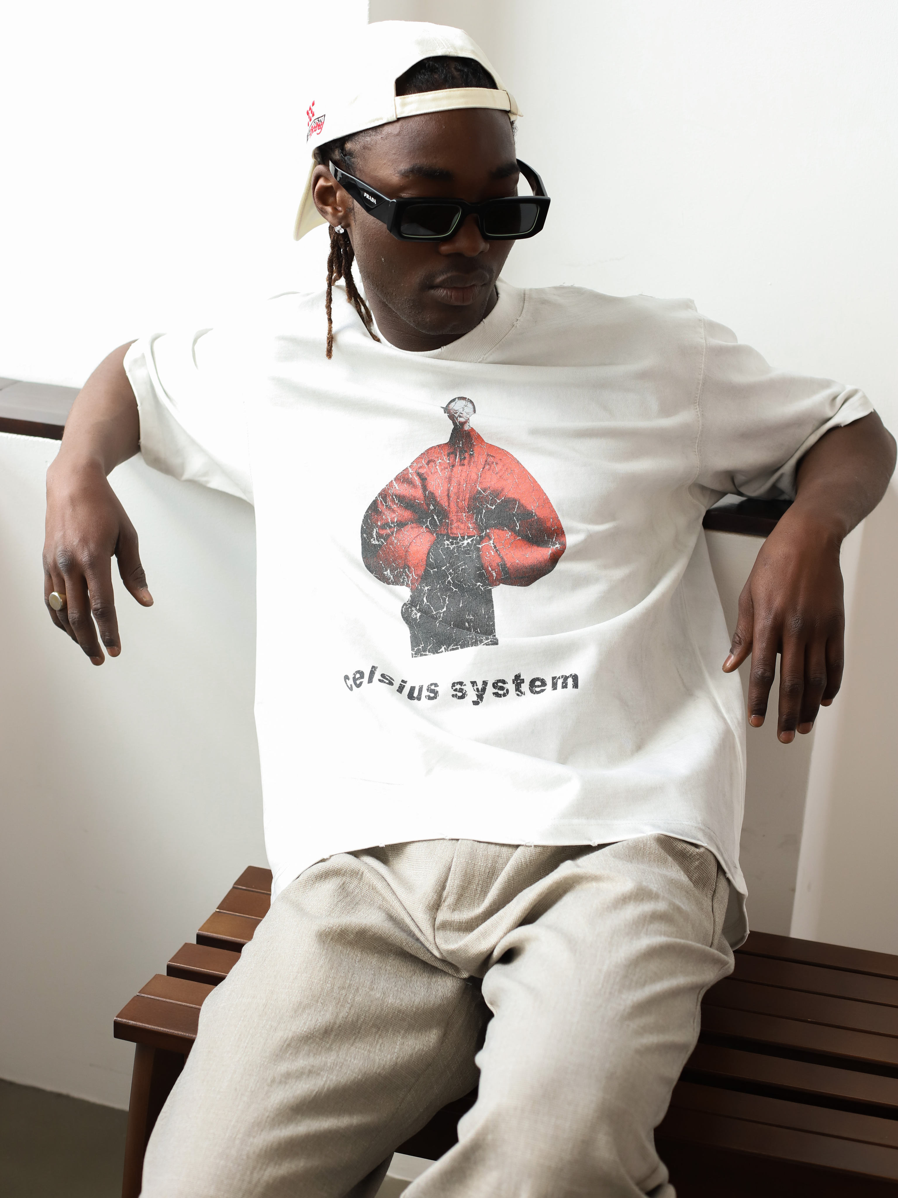 Белая мужская футболка с эффектом потертого края. Модель с принтом для создания стильных образов.