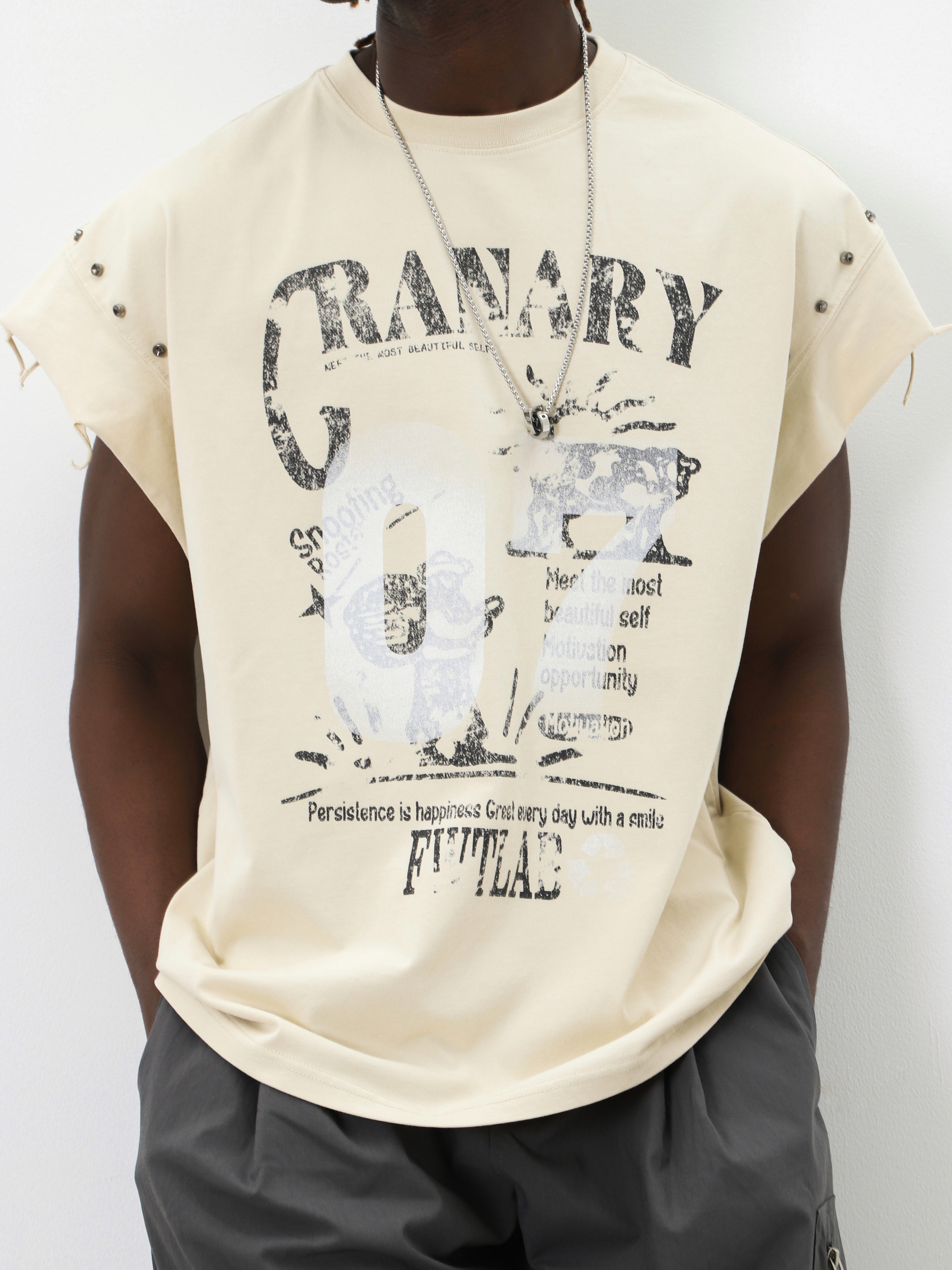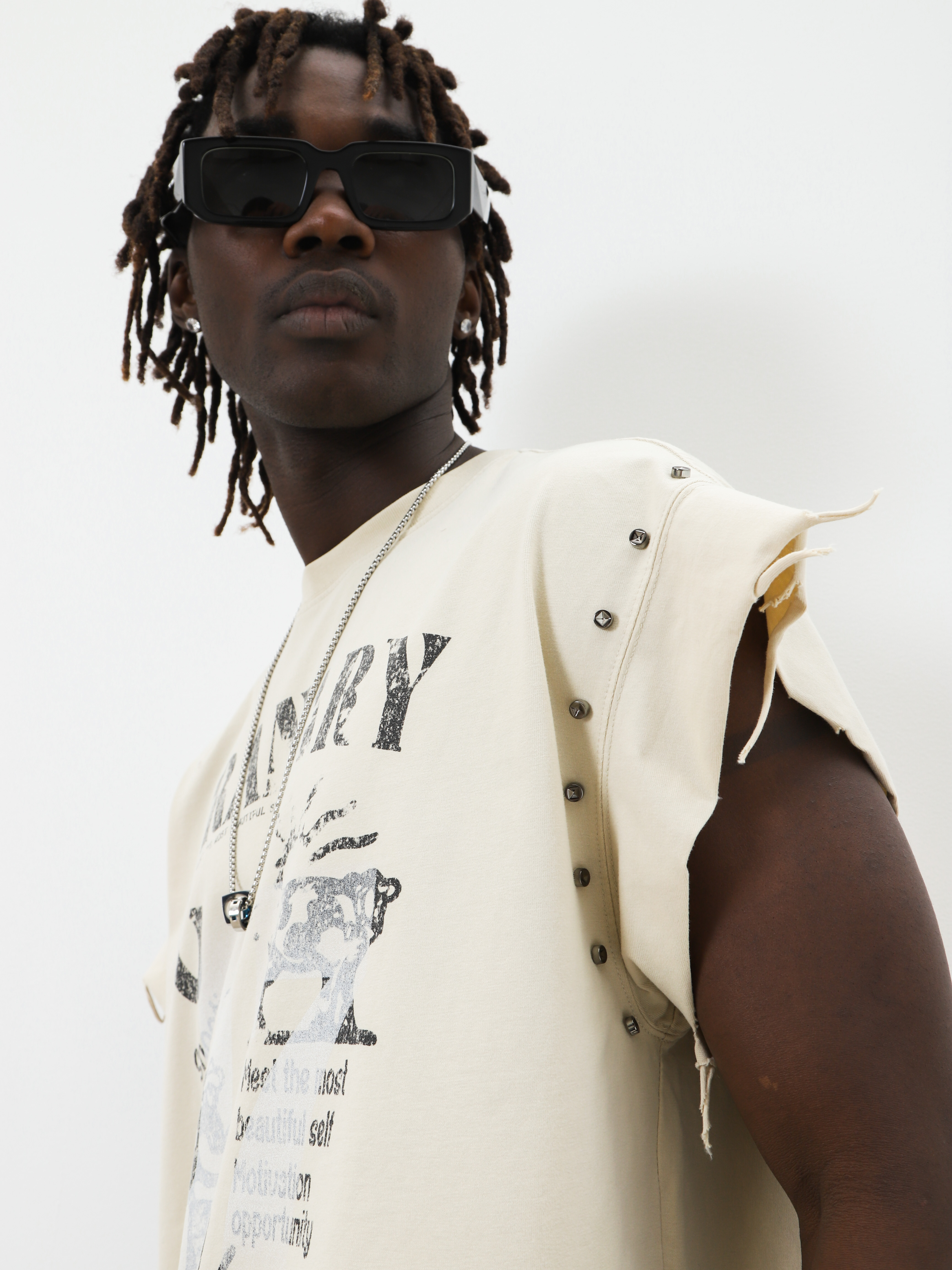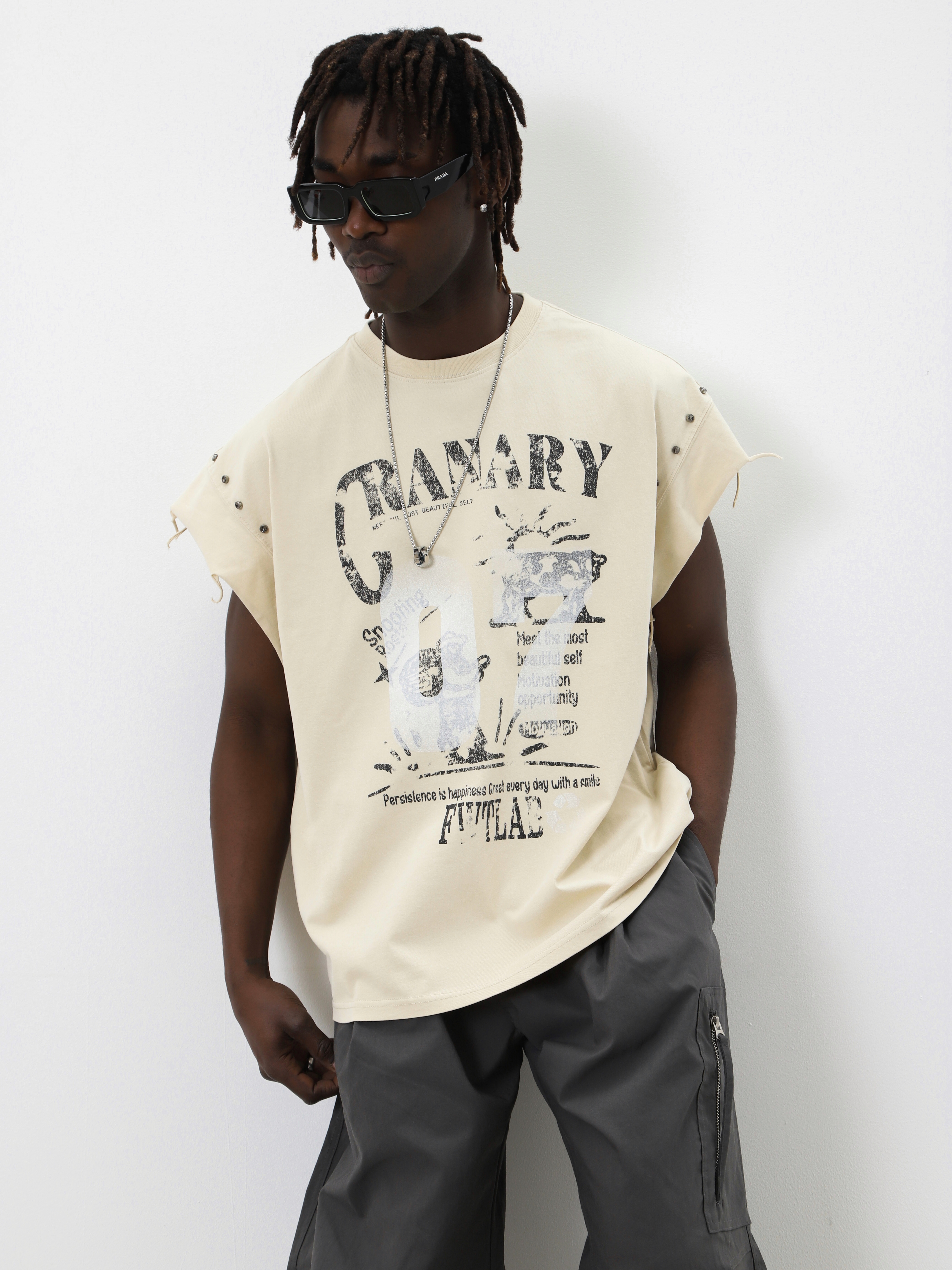 Бежевая мужская футболка без рукавов. Свободная модель с принтом, заклепками и эффектом необработанного края для создания стильного городского образа.