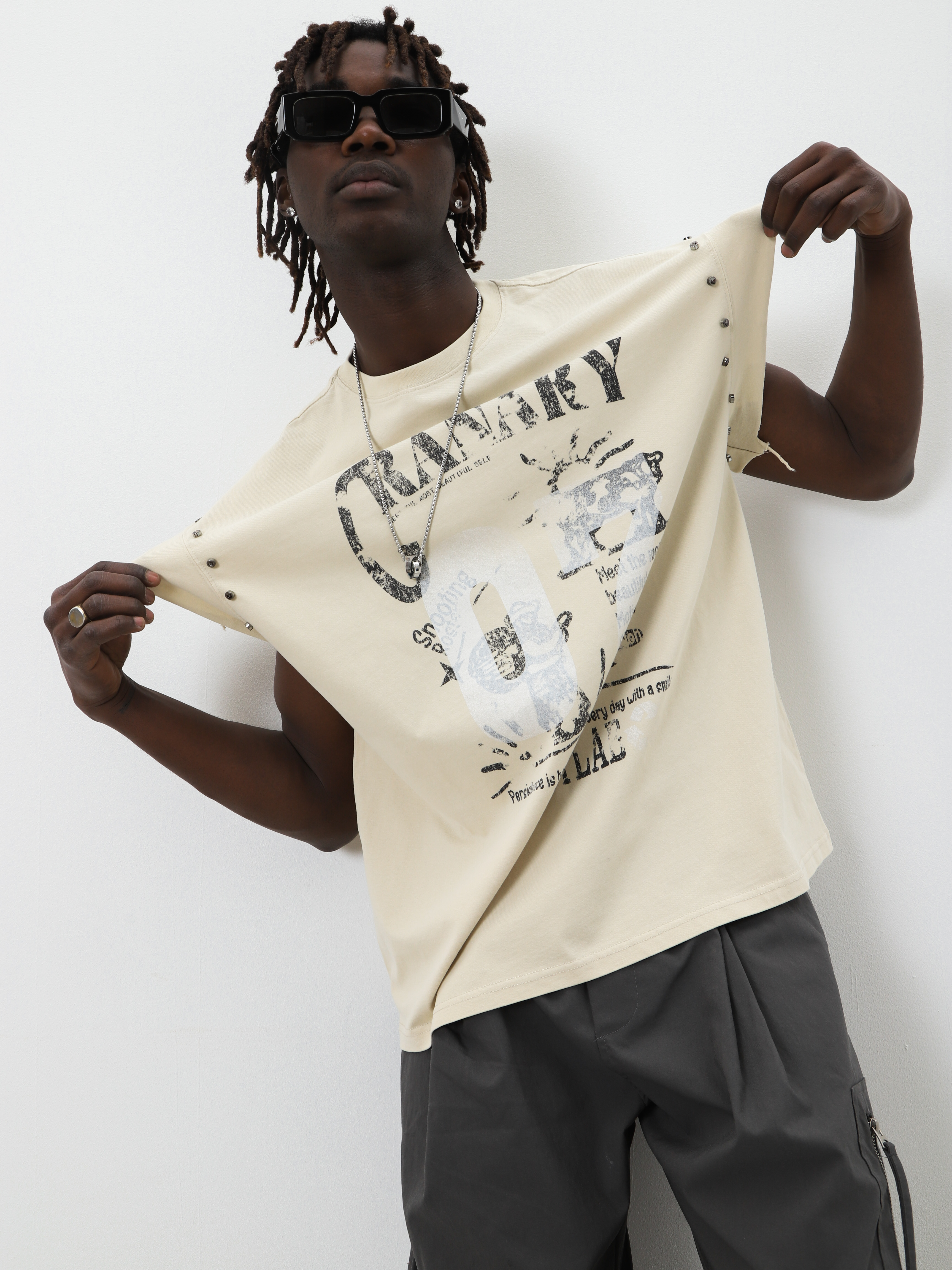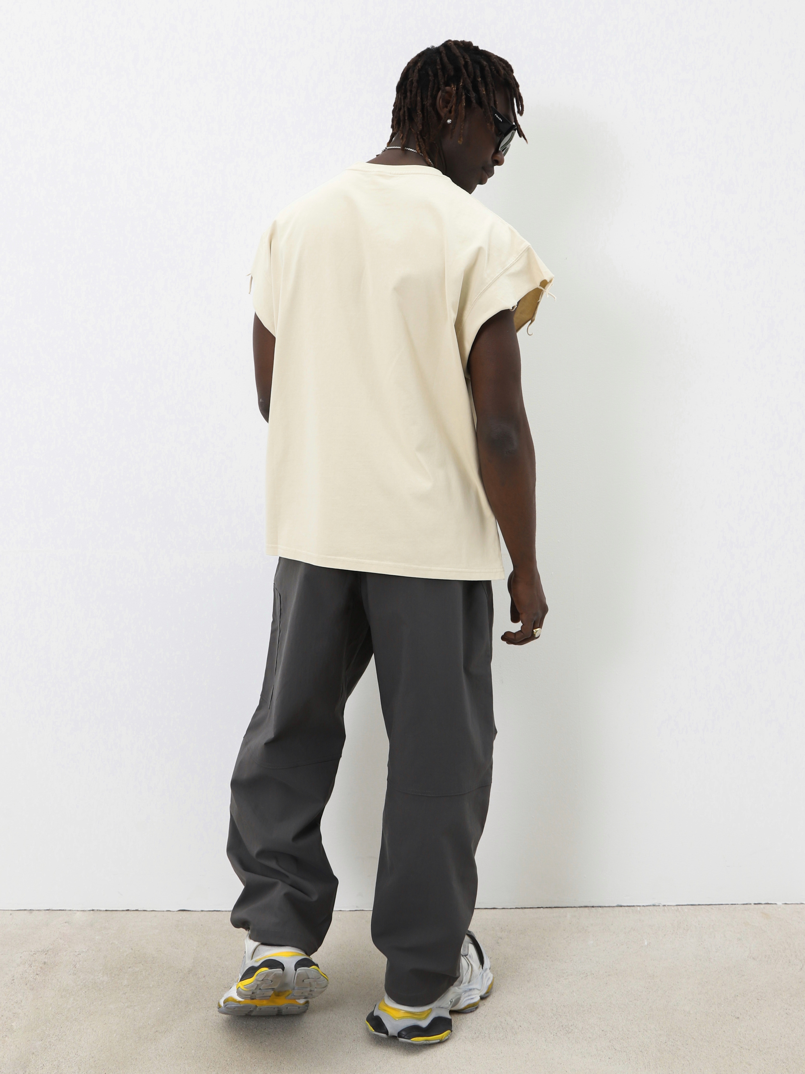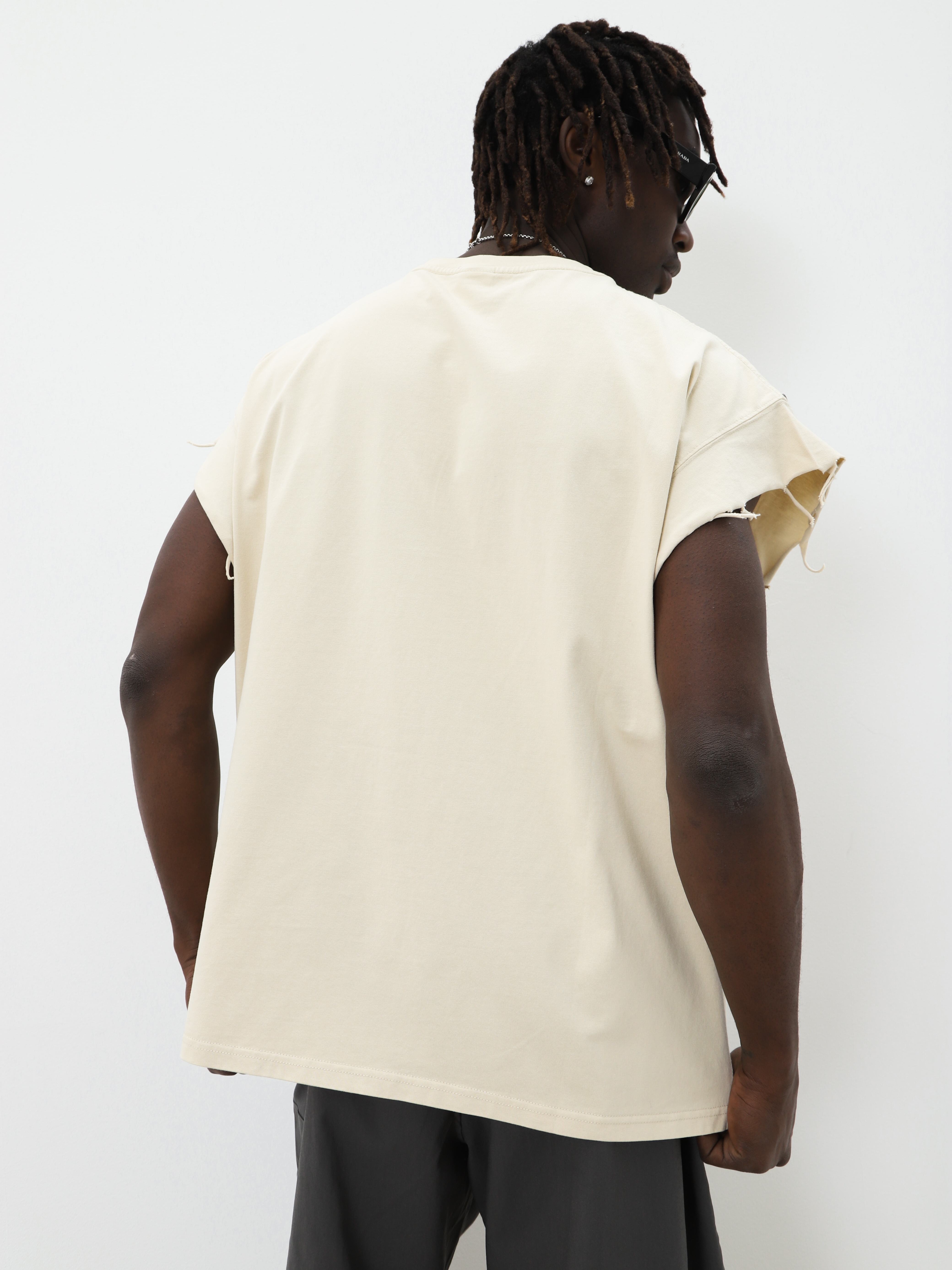 Бежевая мужская футболка без рукавов. Свободная модель с принтом, заклепками и эффектом необработанного края для создания стильного городского образа.