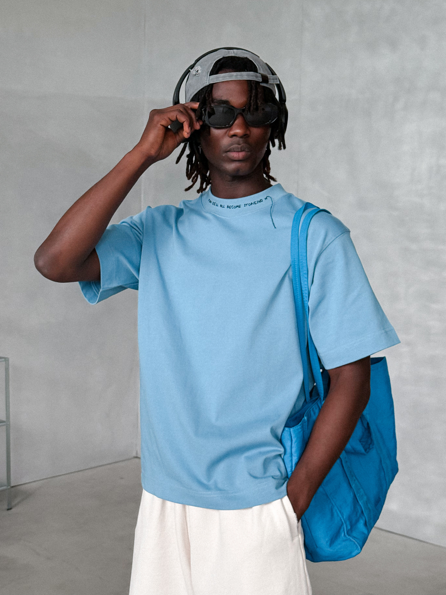 Мужская серо-голубая футболка оверсайз из плотного хлопка. Принт на спине в виде текста.