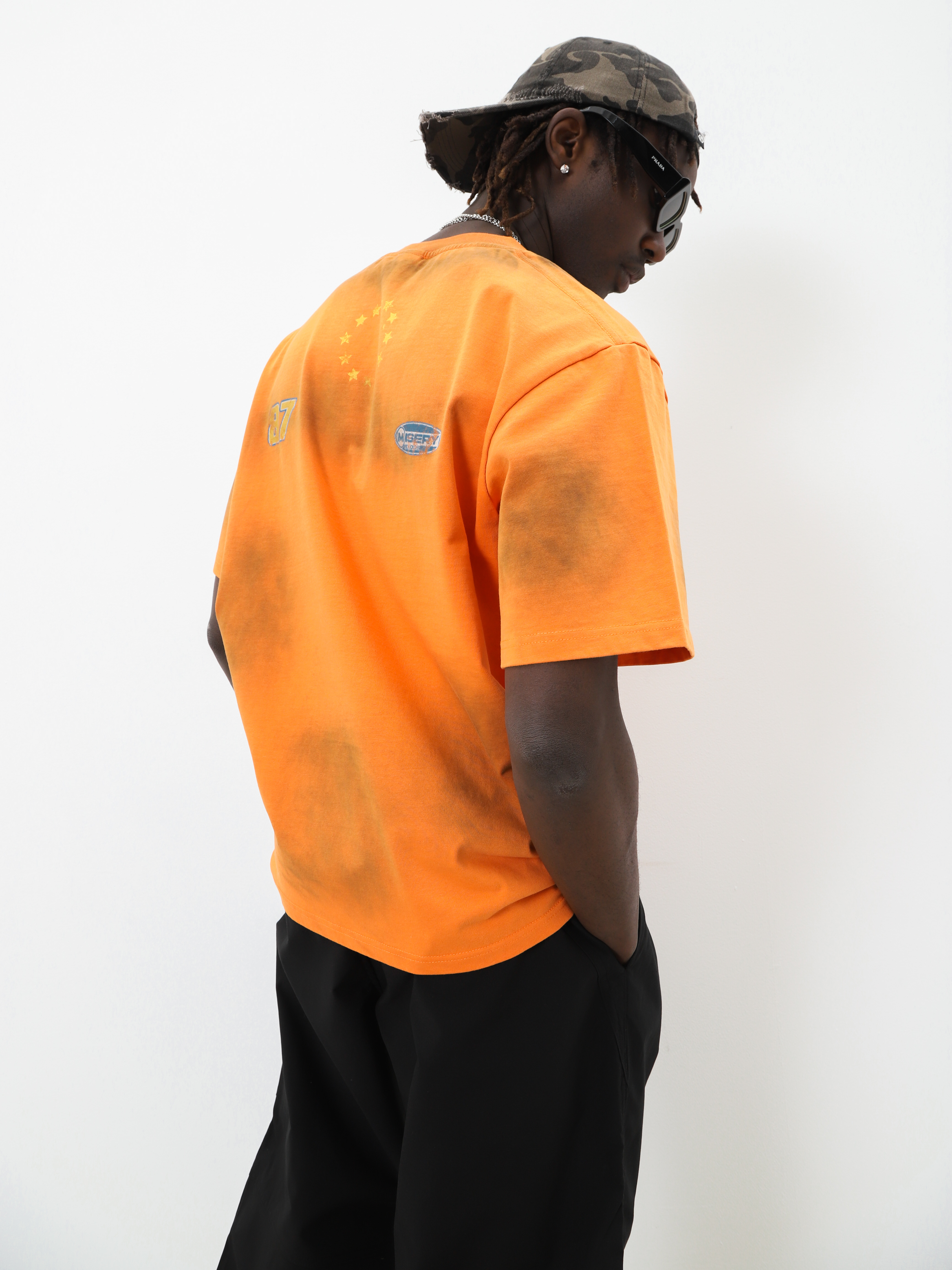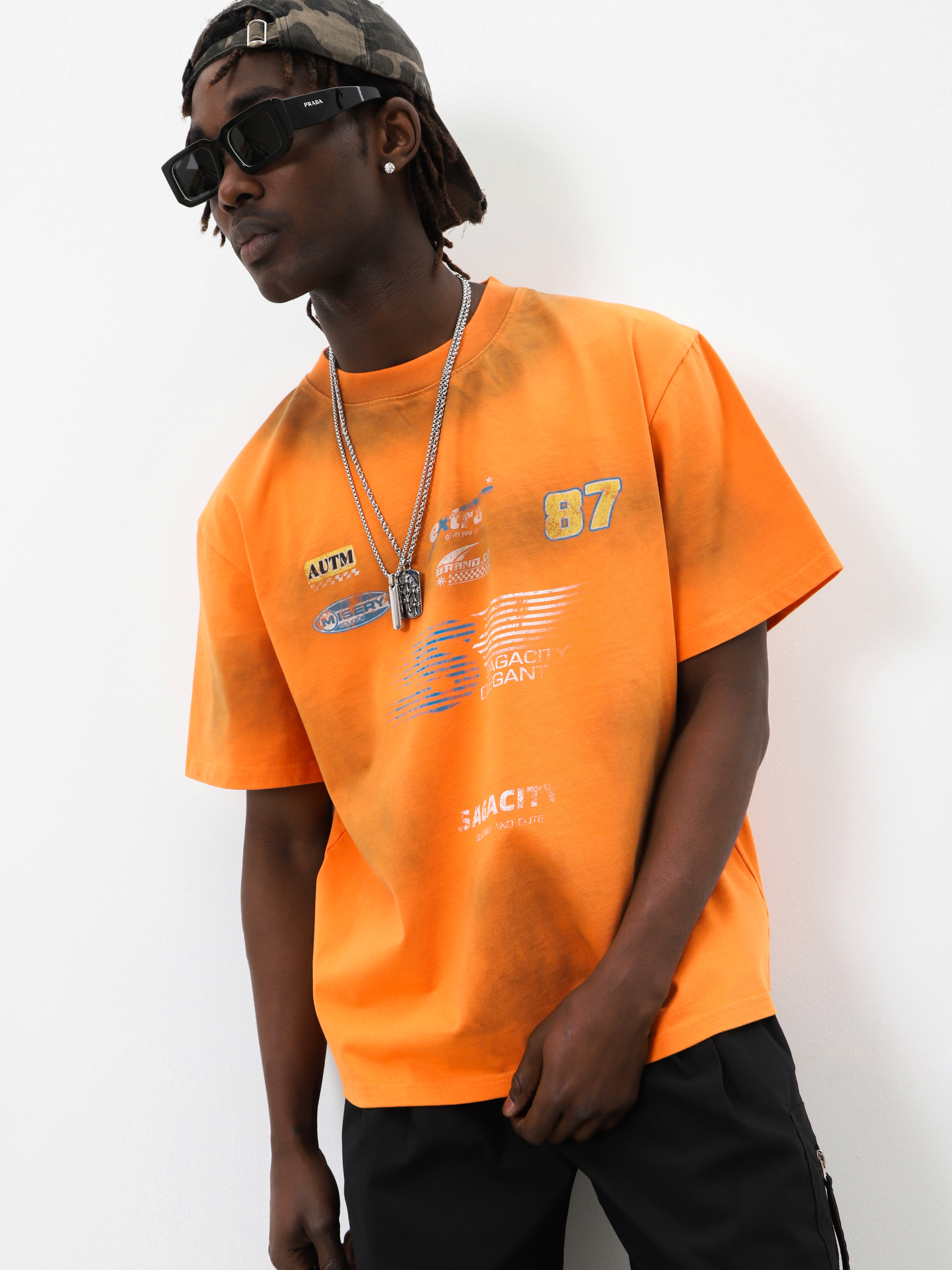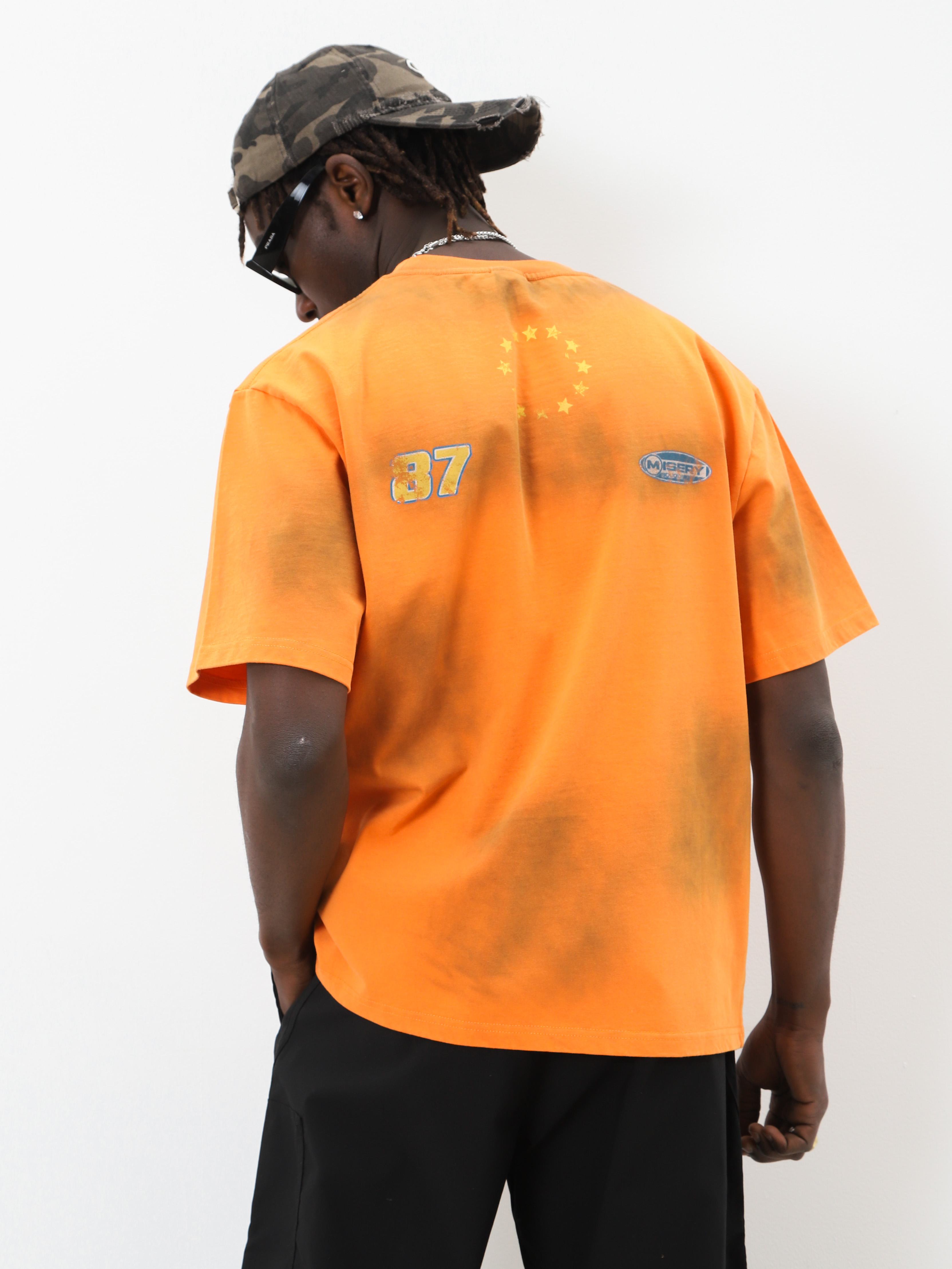 Мужская футболка оверсайз оранжевого цвета. Модель с принтами и эффектом пятен в стиле гранж для тех, кто любит выделяться из толпы.