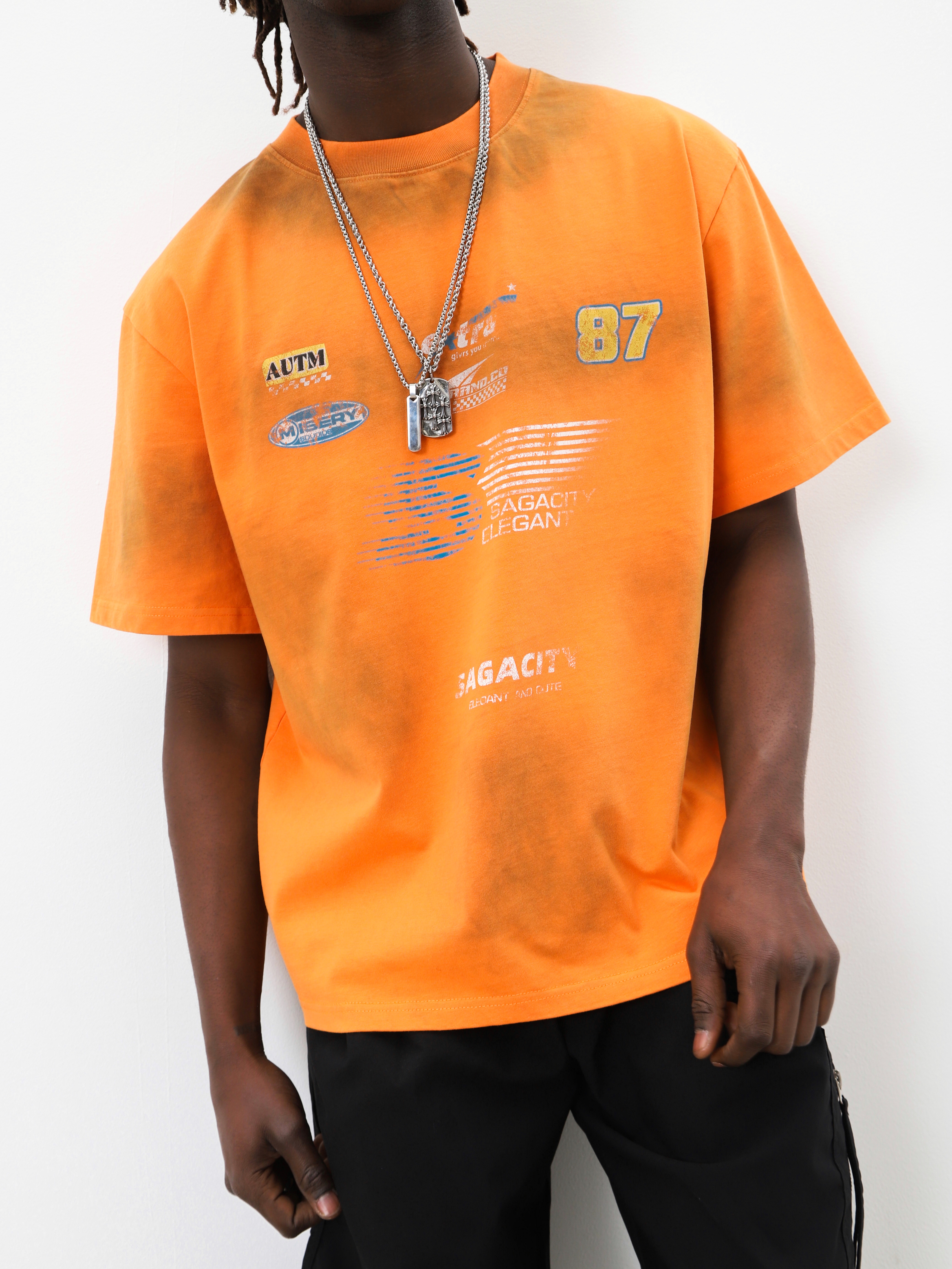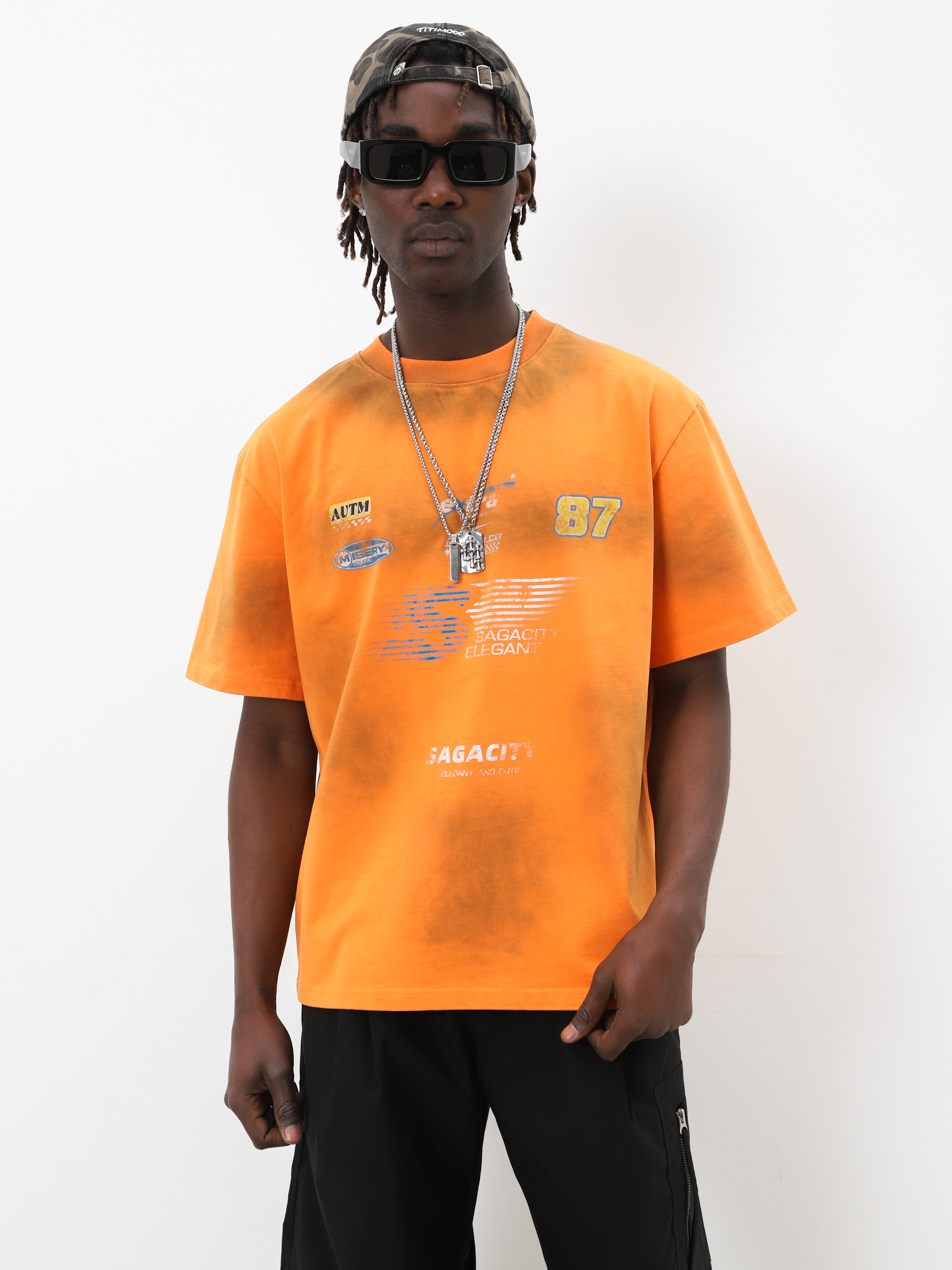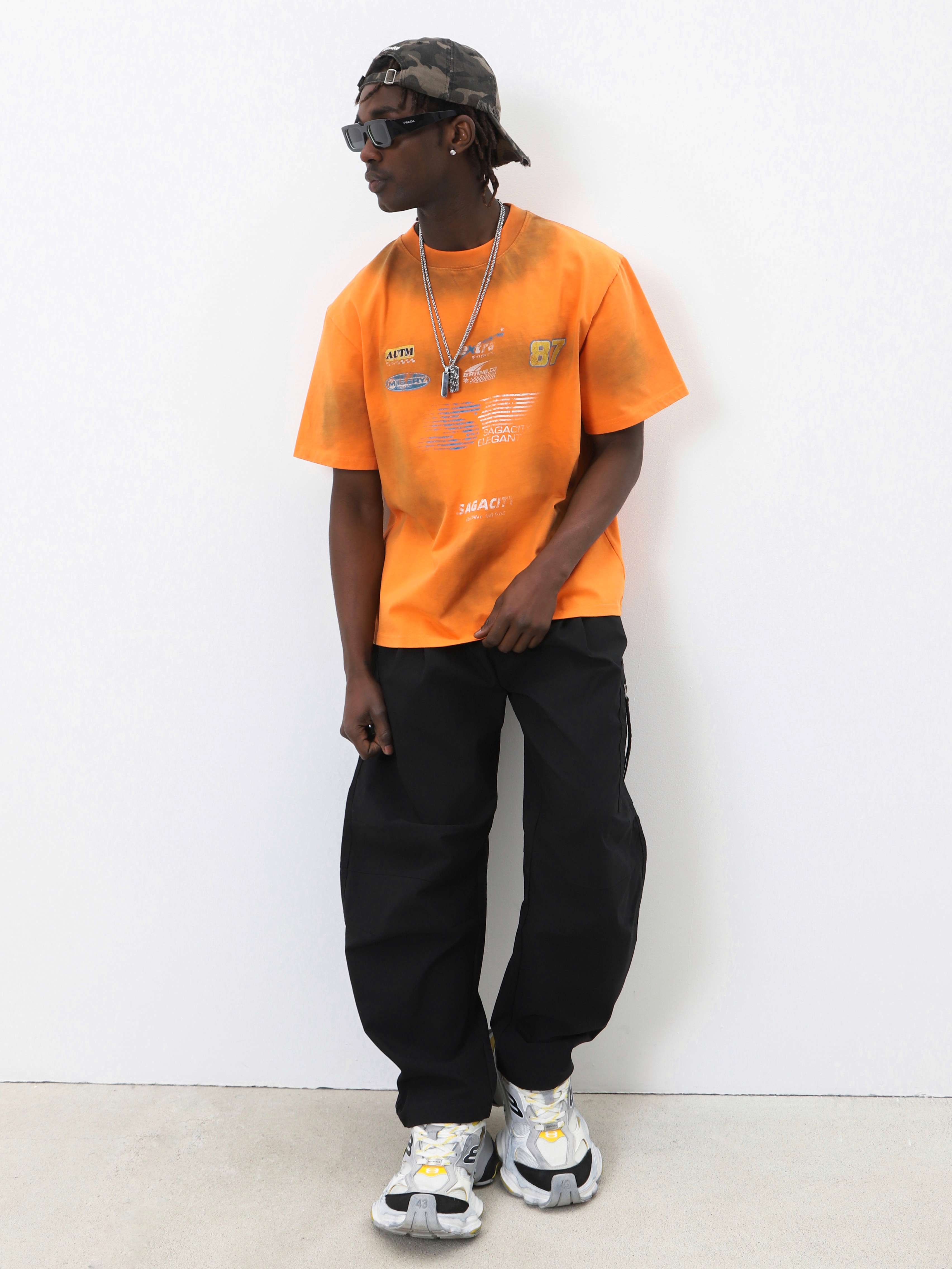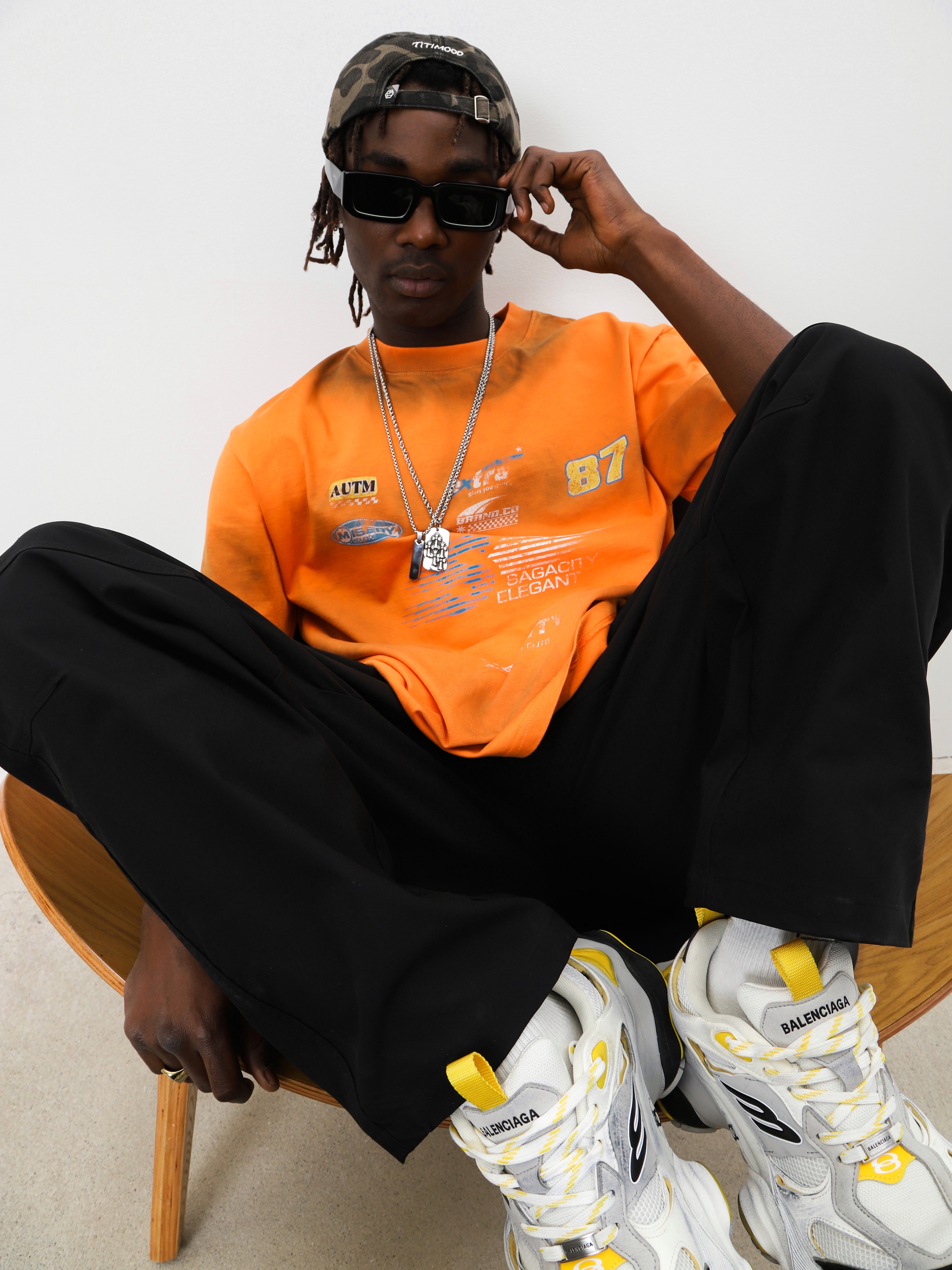 Мужская футболка оверсайз оранжевого цвета. Модель с принтами и эффектом пятен в стиле гранж для тех, кто любит выделяться из толпы.