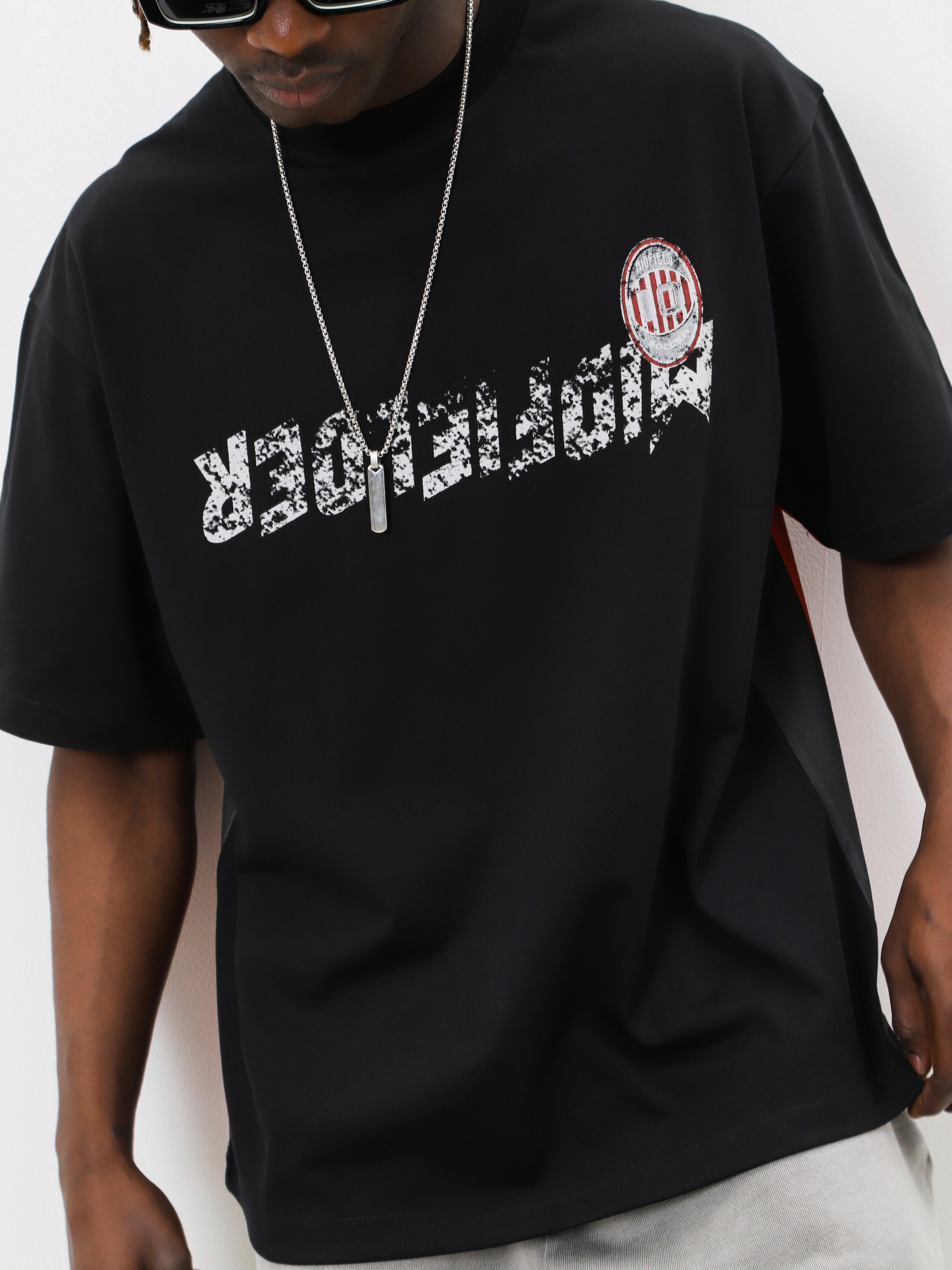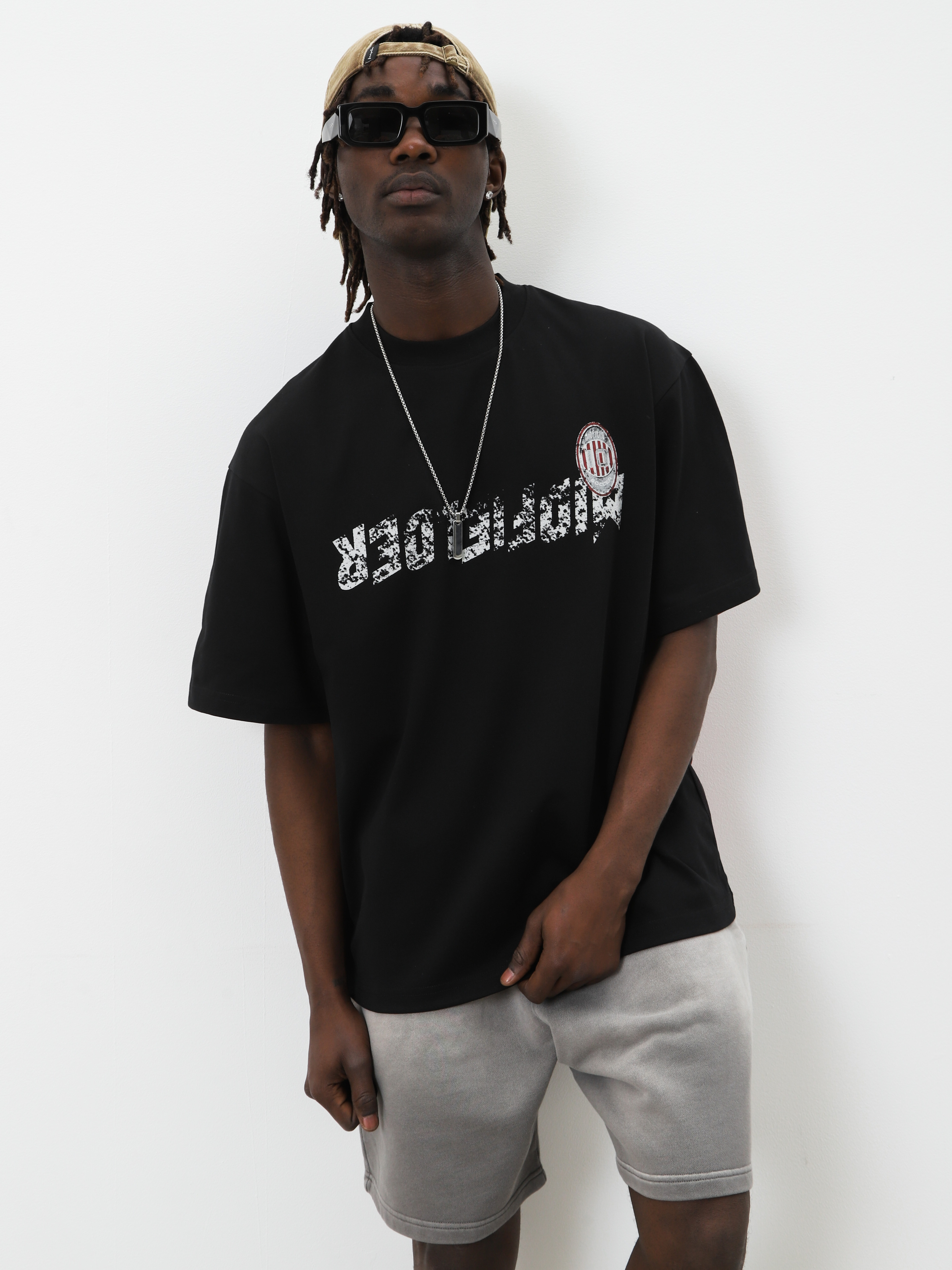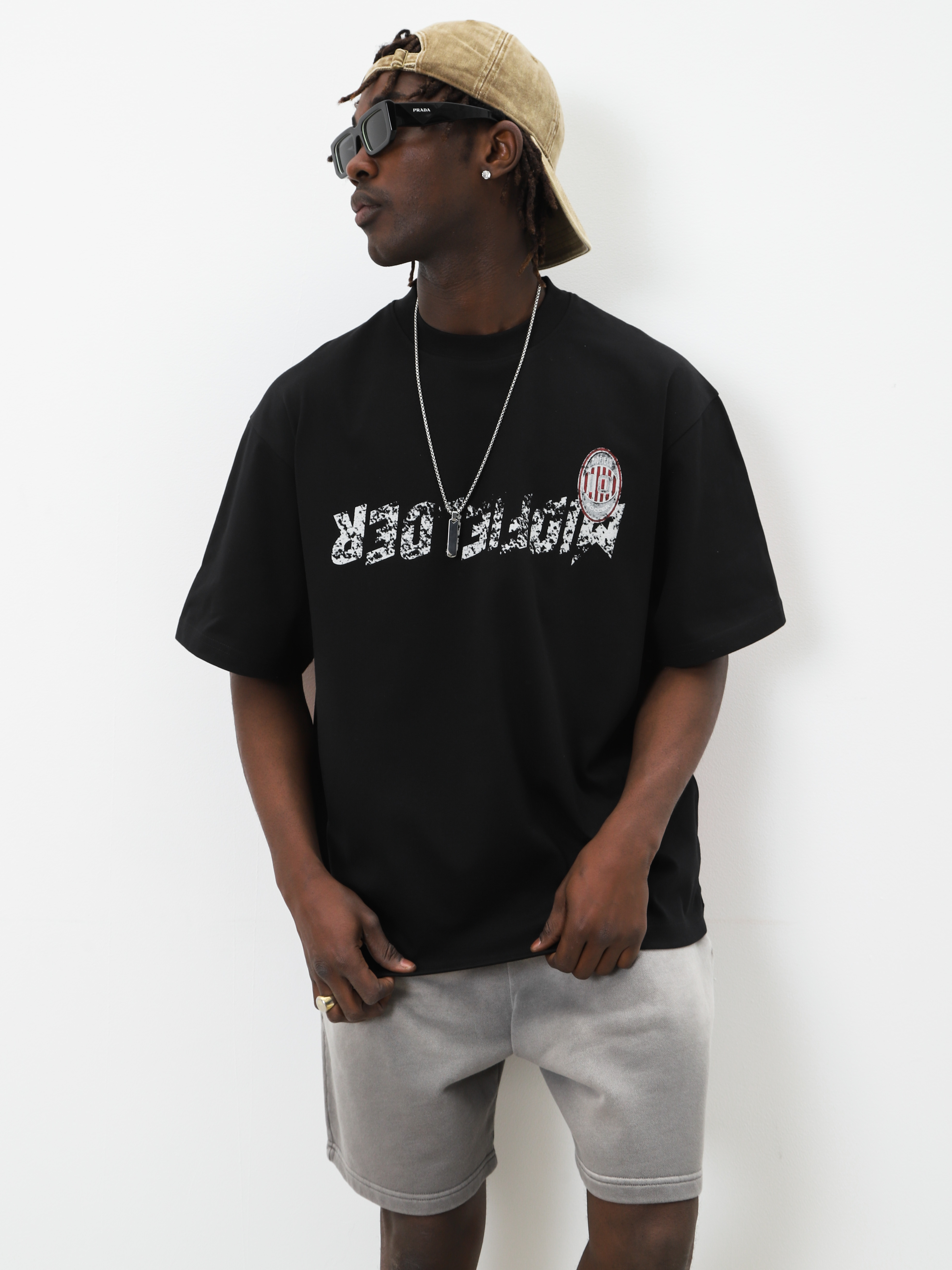 Черная мужская футболка с принтами для создания стильных look'ов. Модель оверсайз со спущенным плечом.