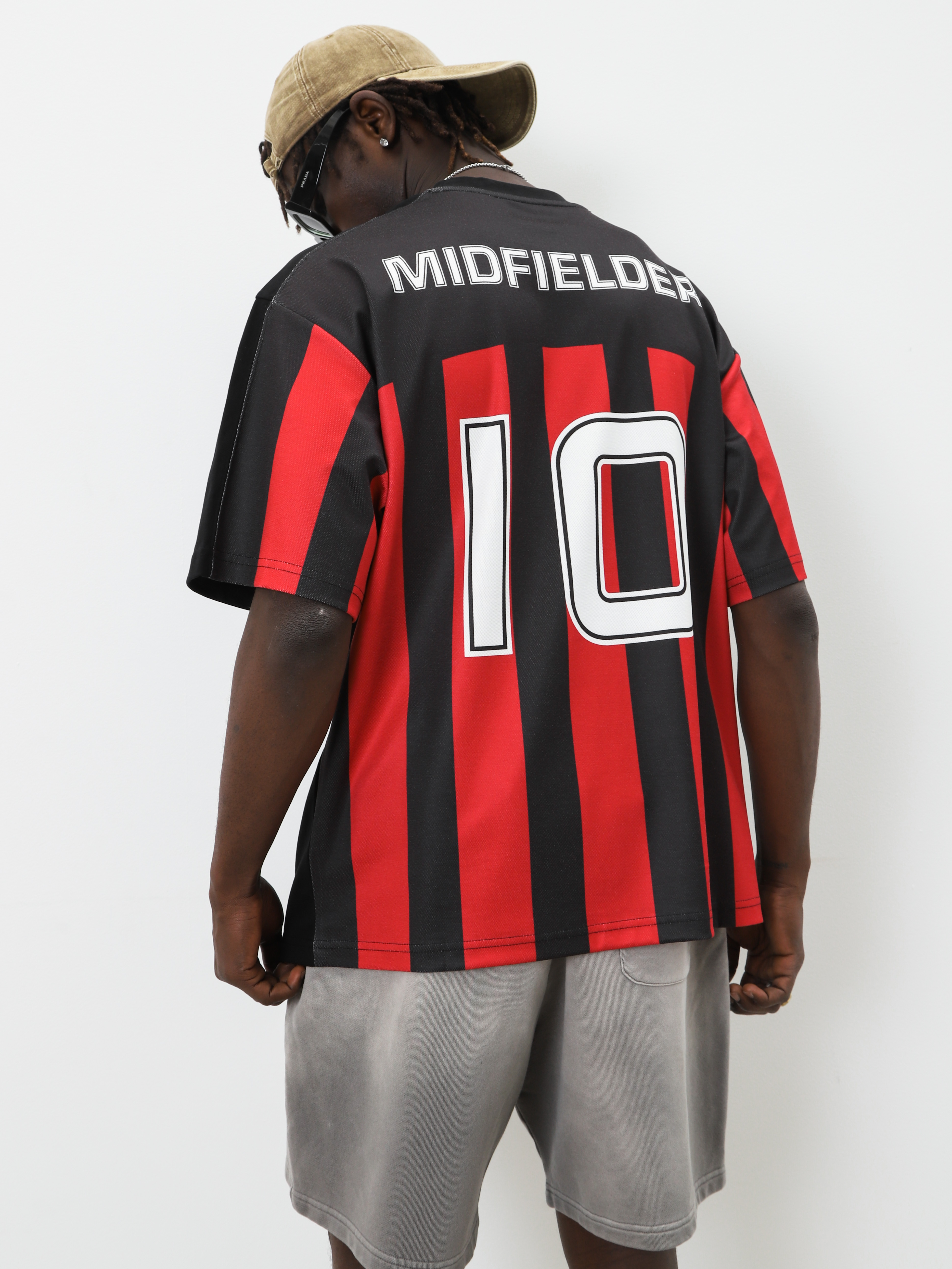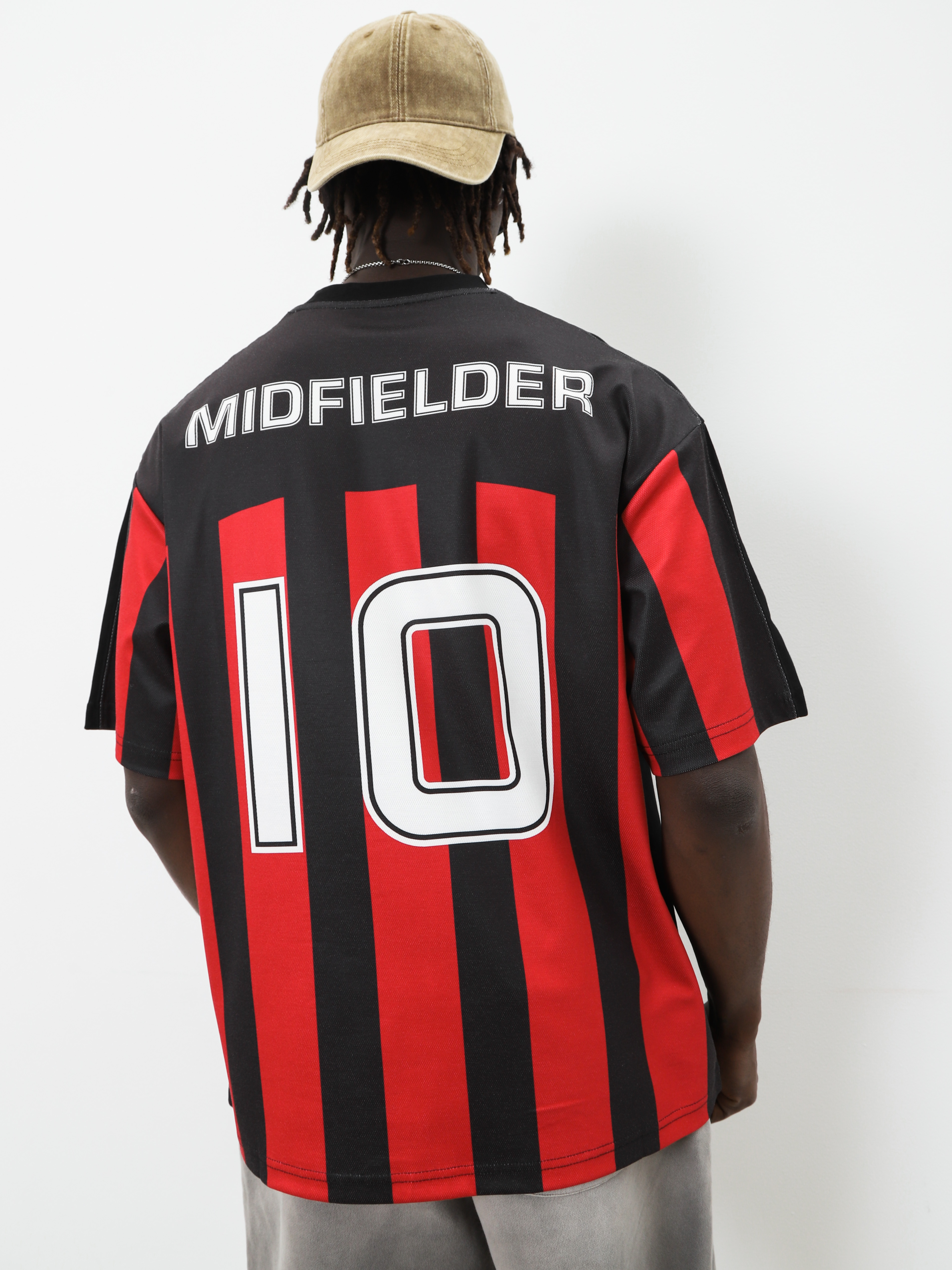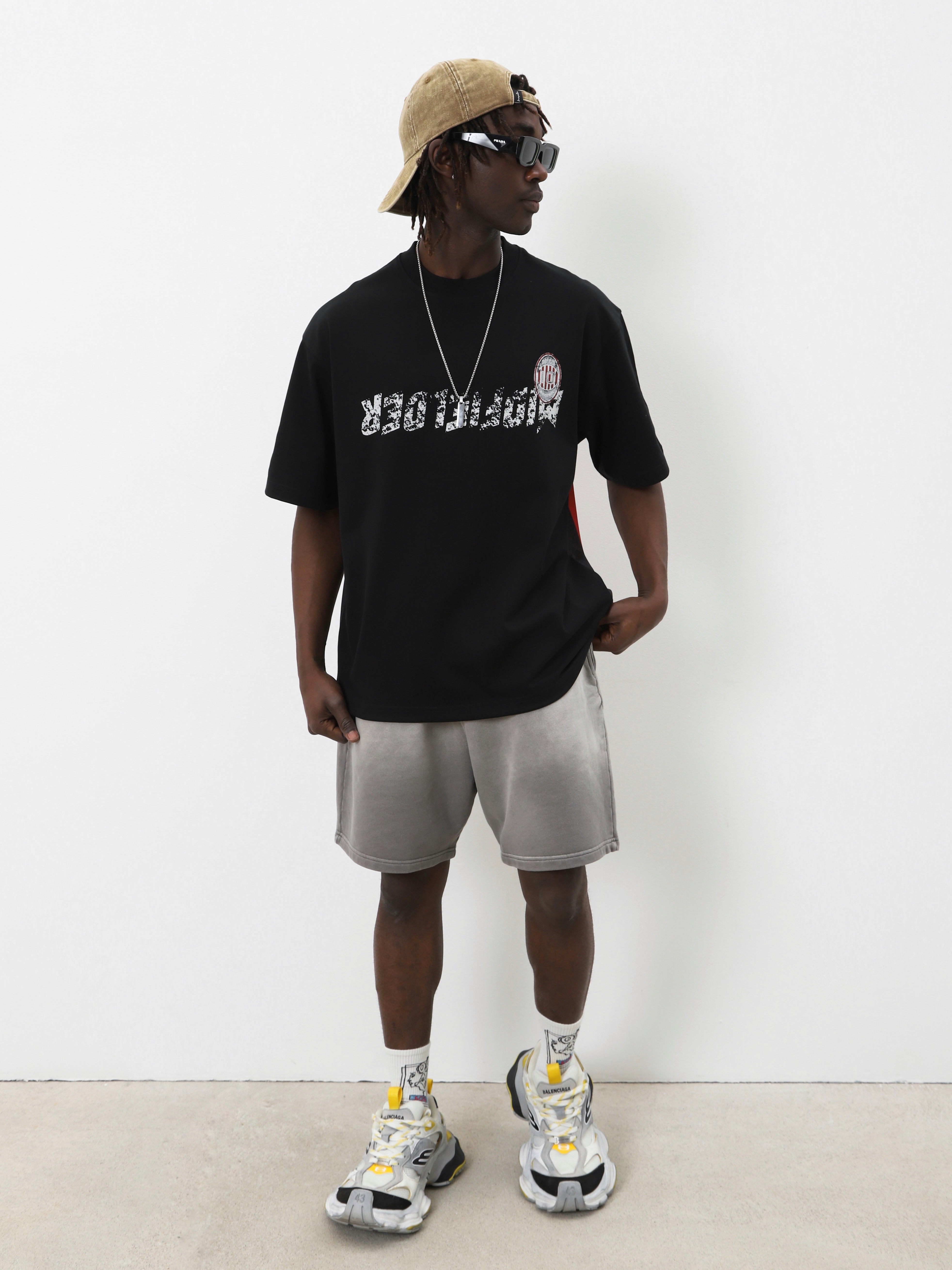 Черная мужская футболка с принтами для создания стильных look'ов. Модель оверсайз со спущенным плечом.