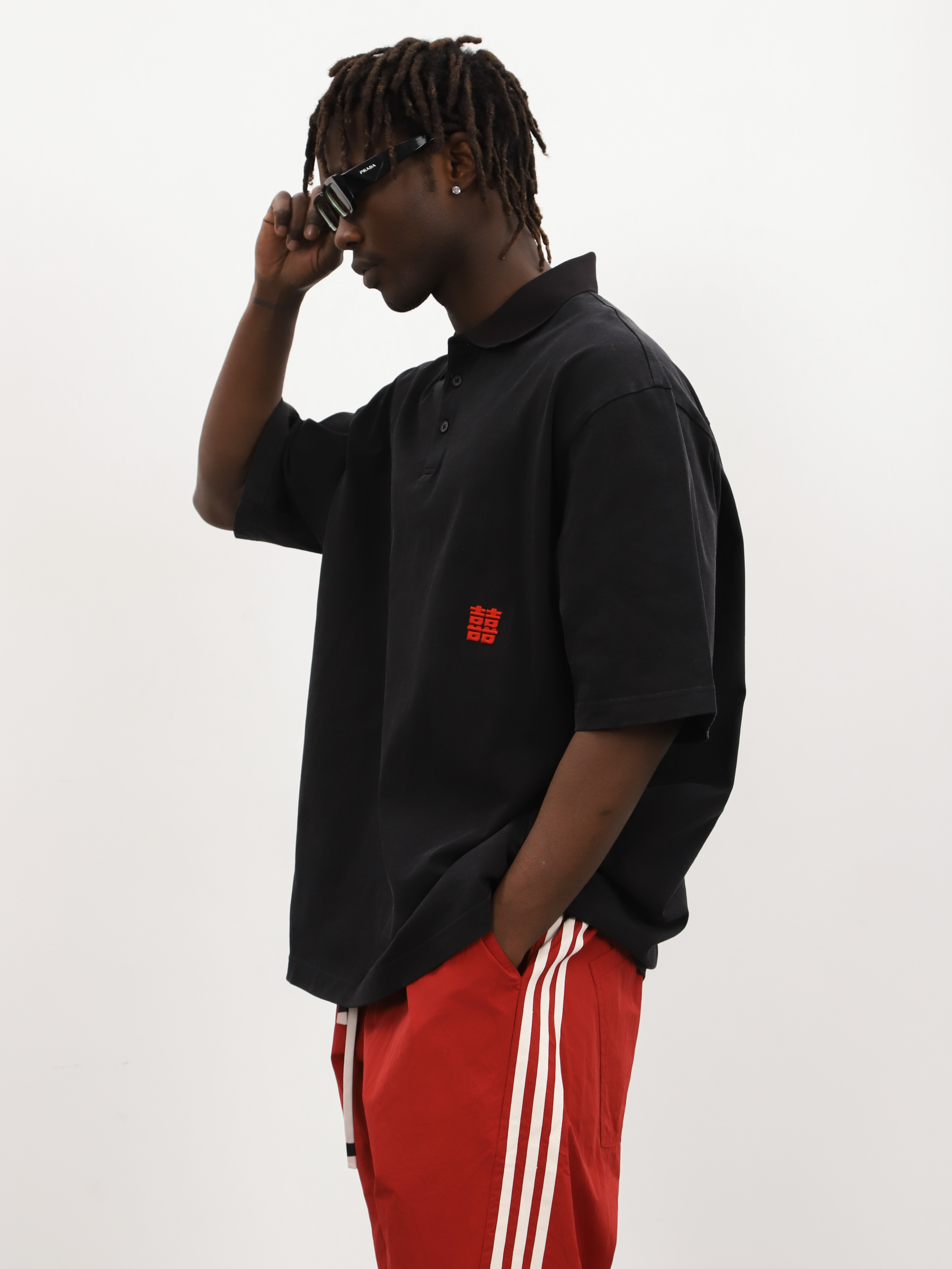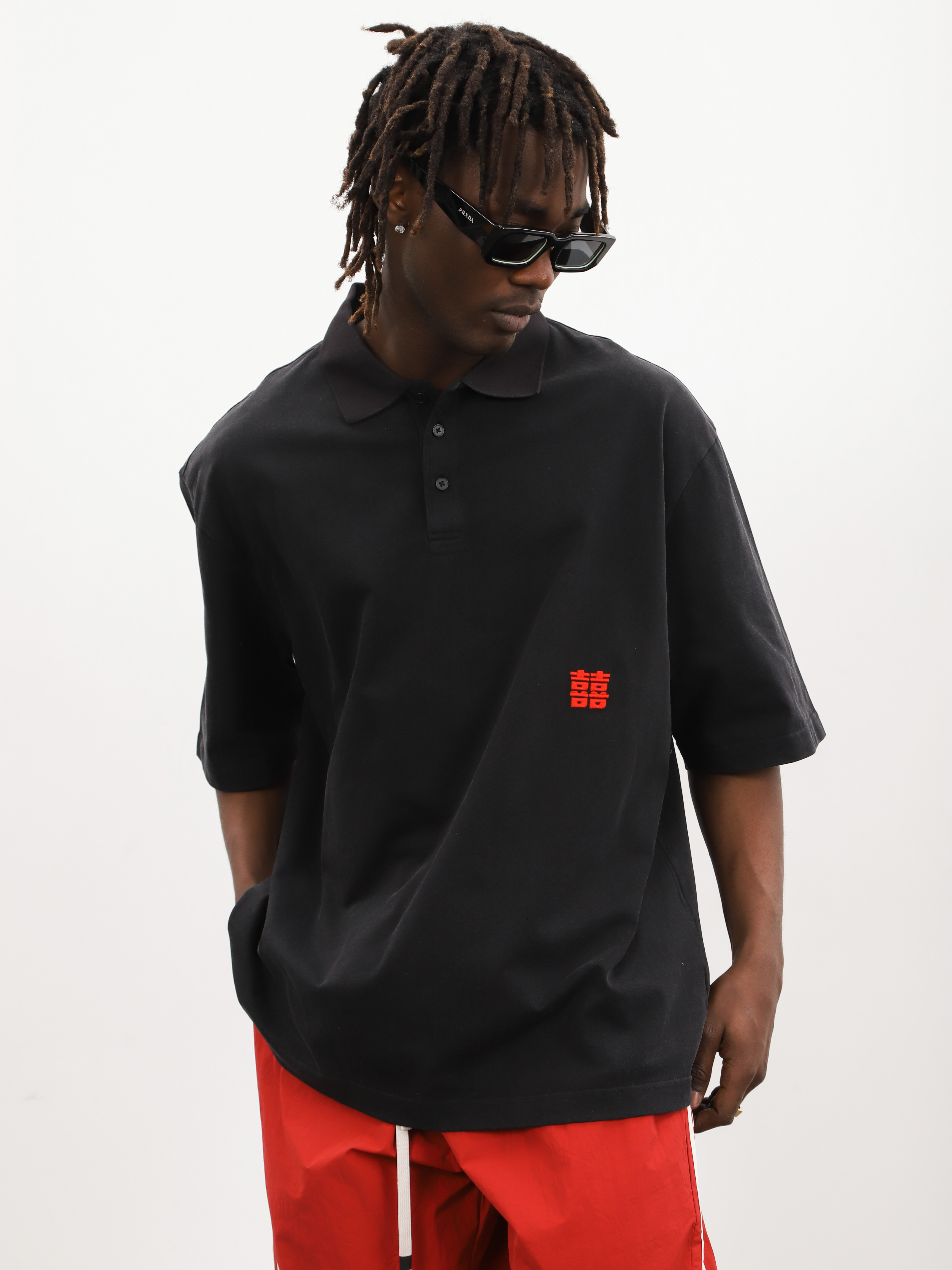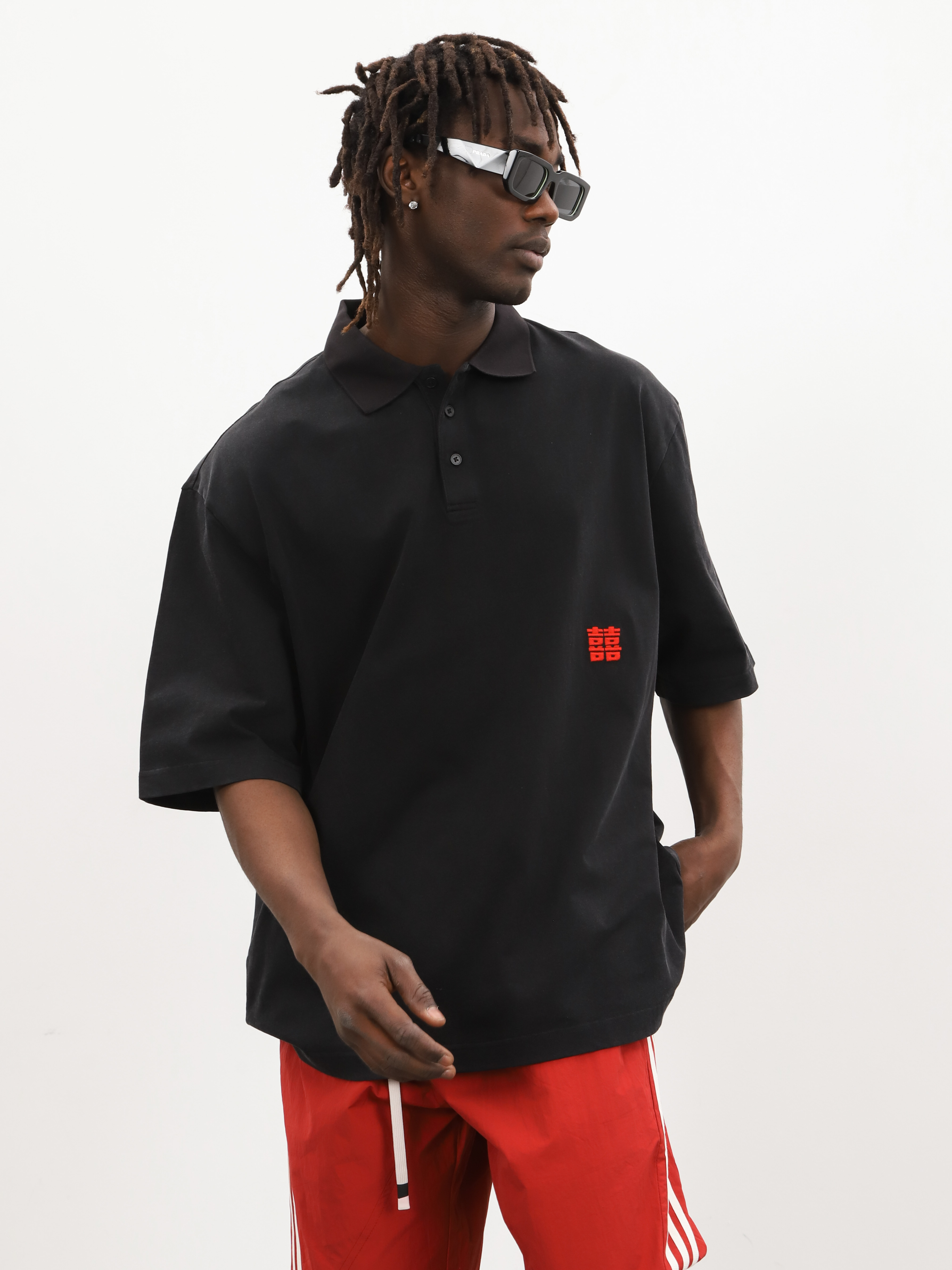 Черная мужская футболка поло с контрастной вышивкой для модных образов в стиле casual.
