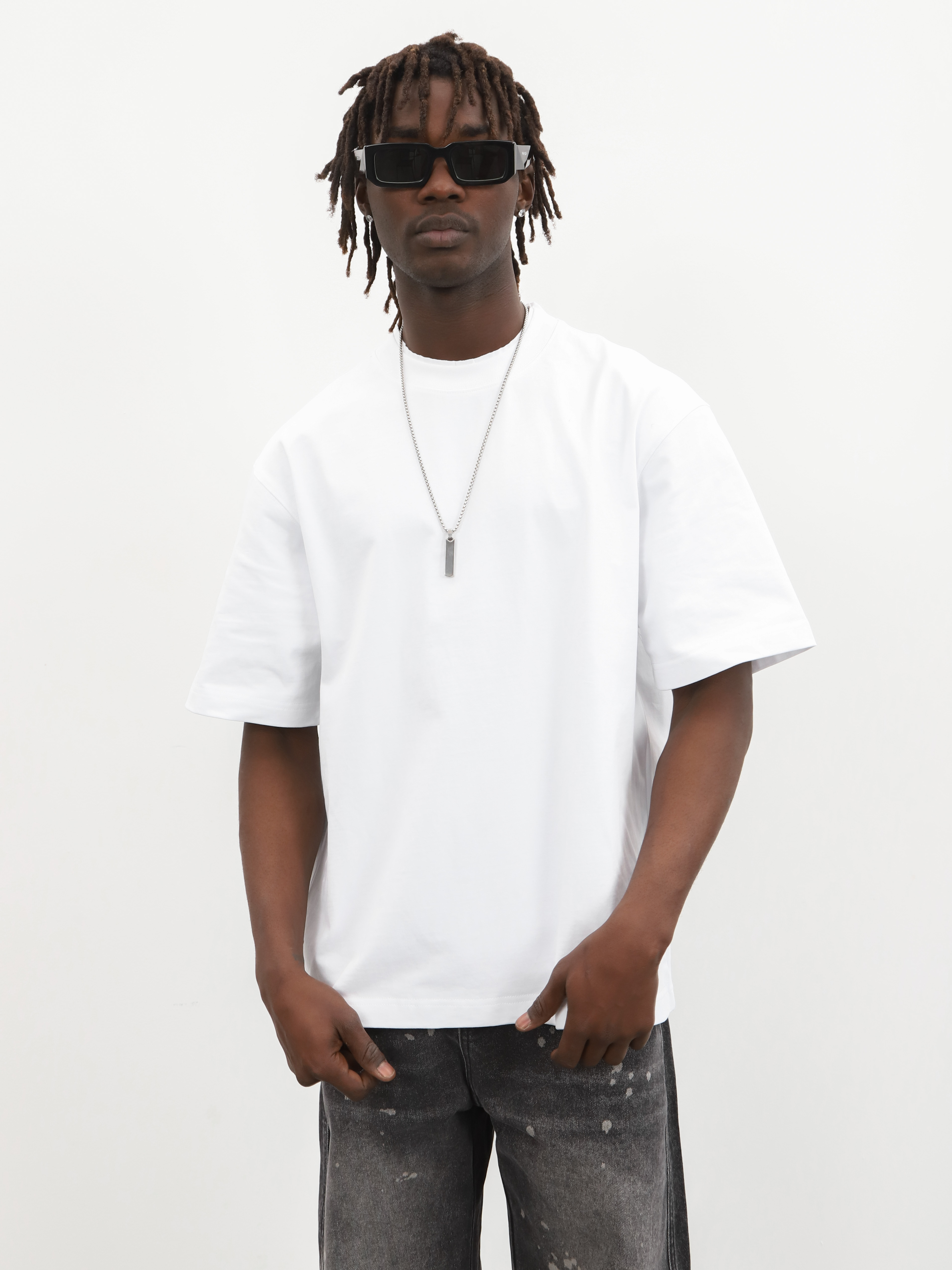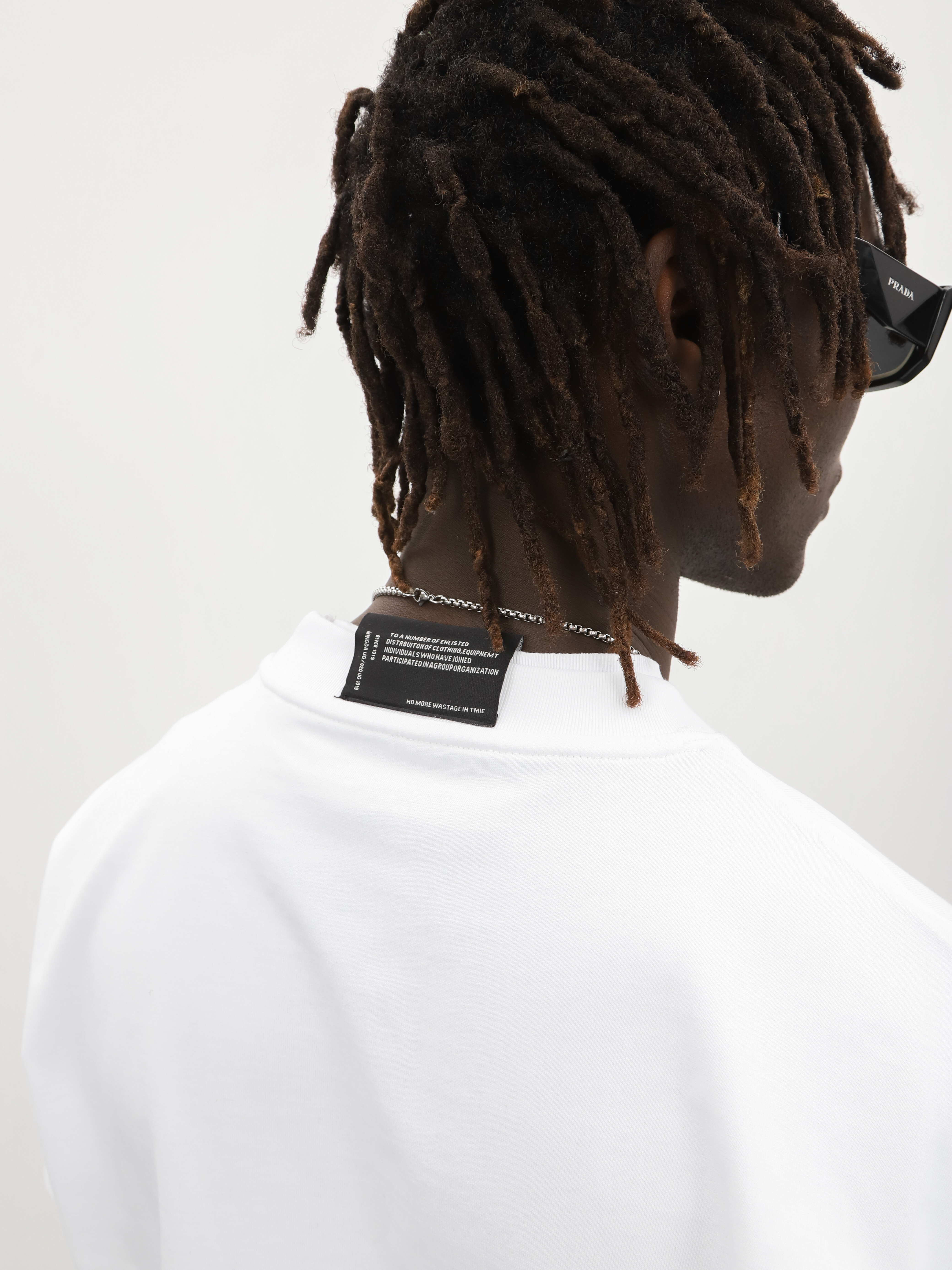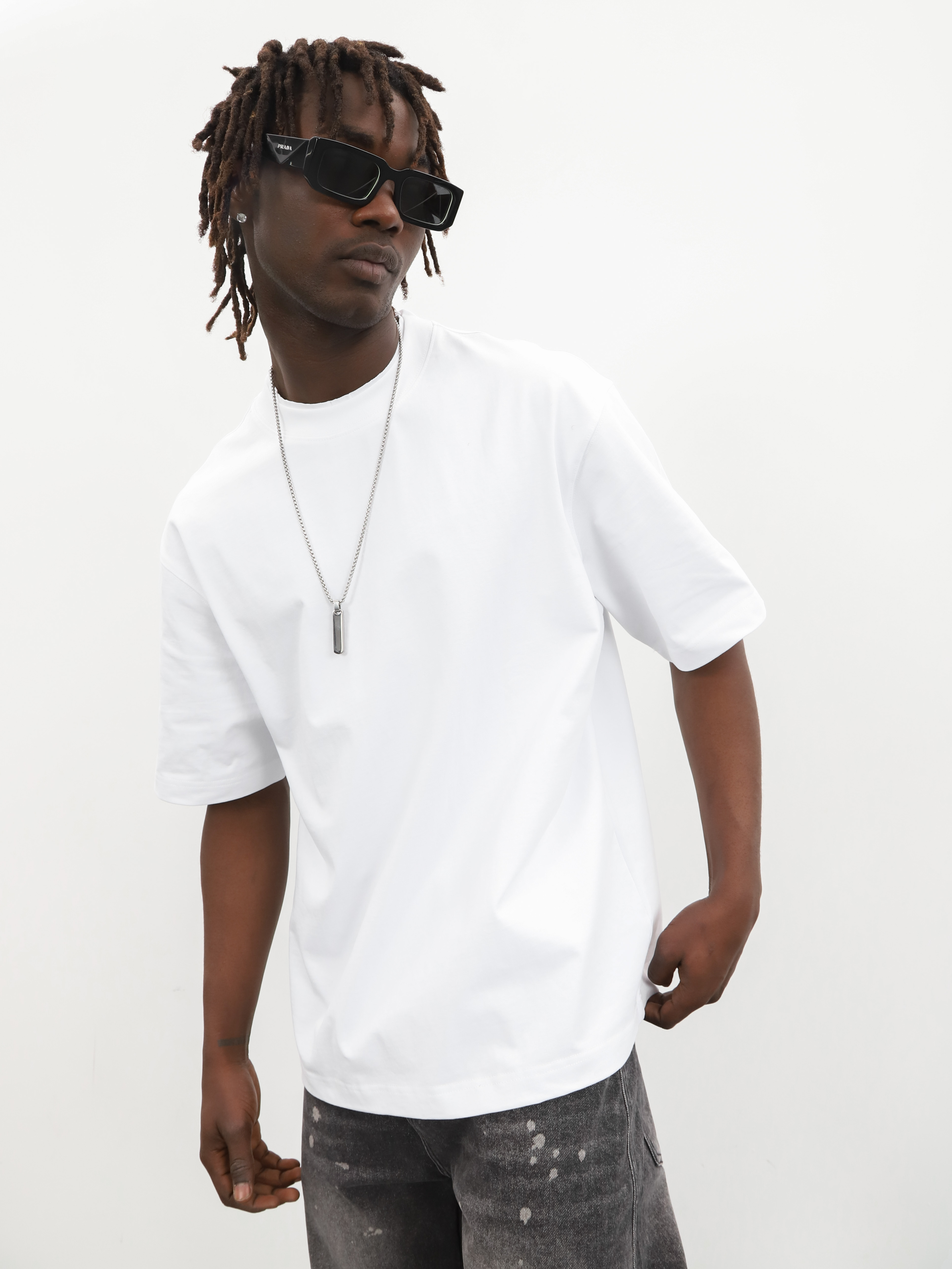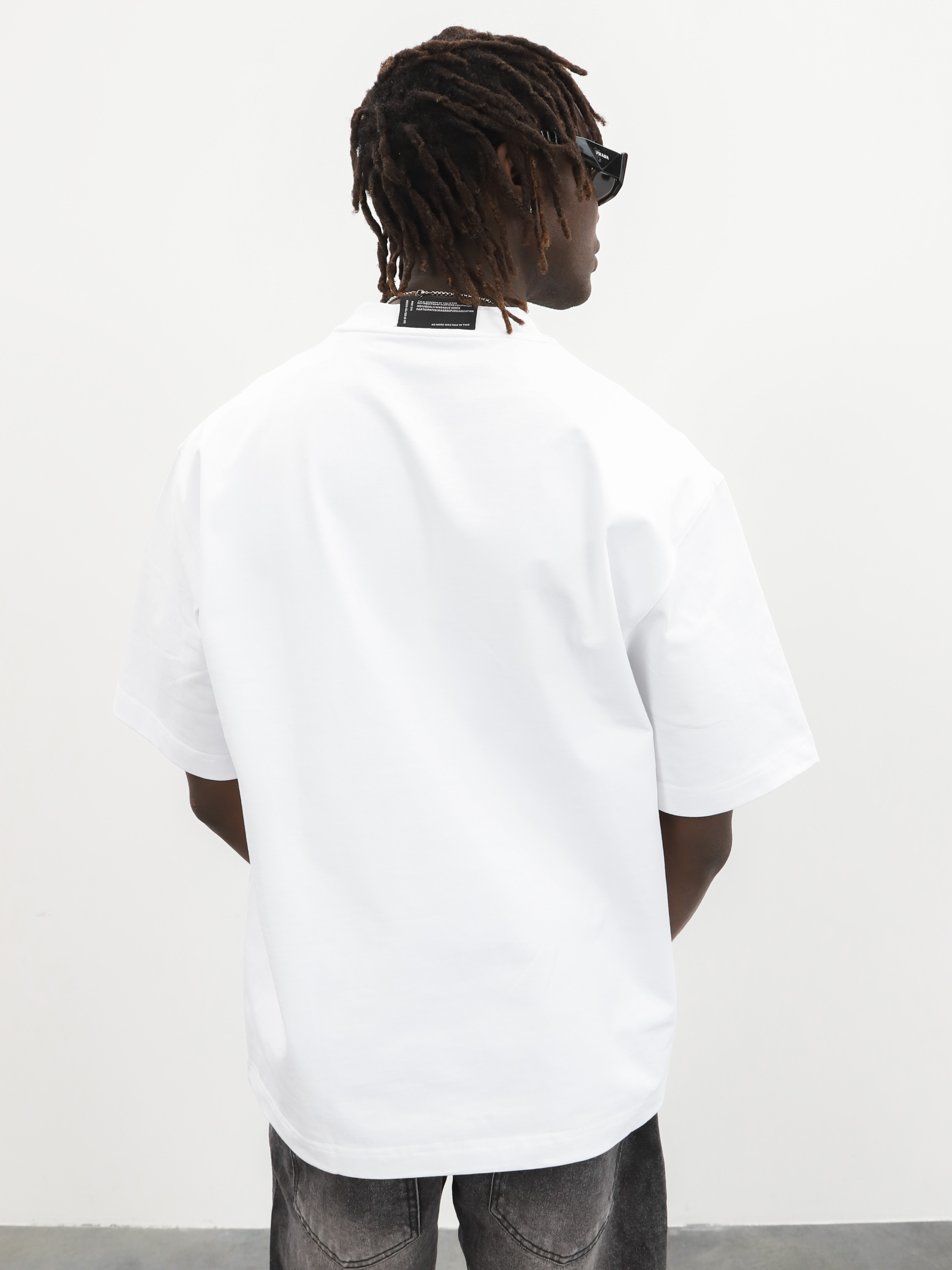 Белая мужская футболка оверсайз. Модель с двойным воротником и нашивкой для создания стильных look'ов.