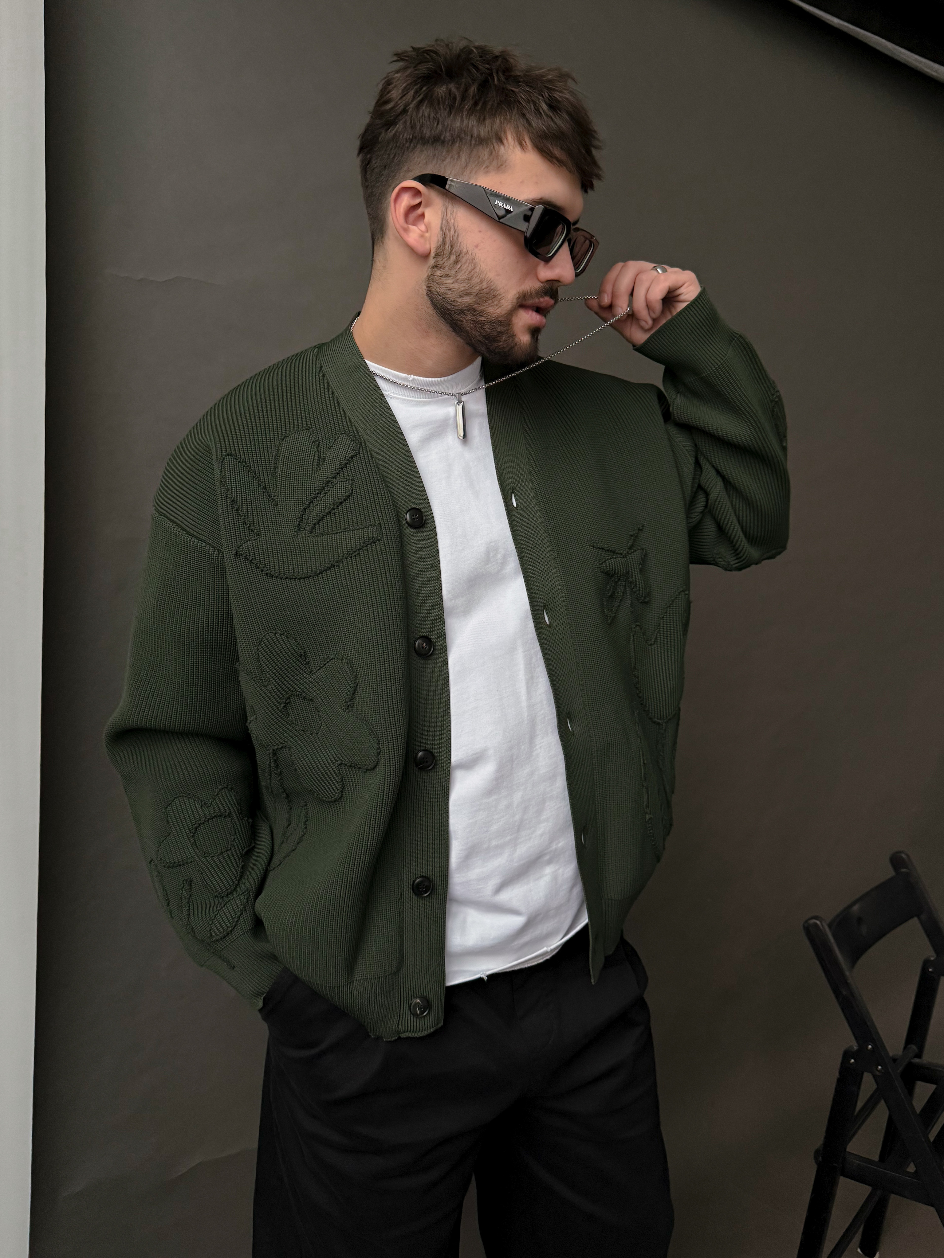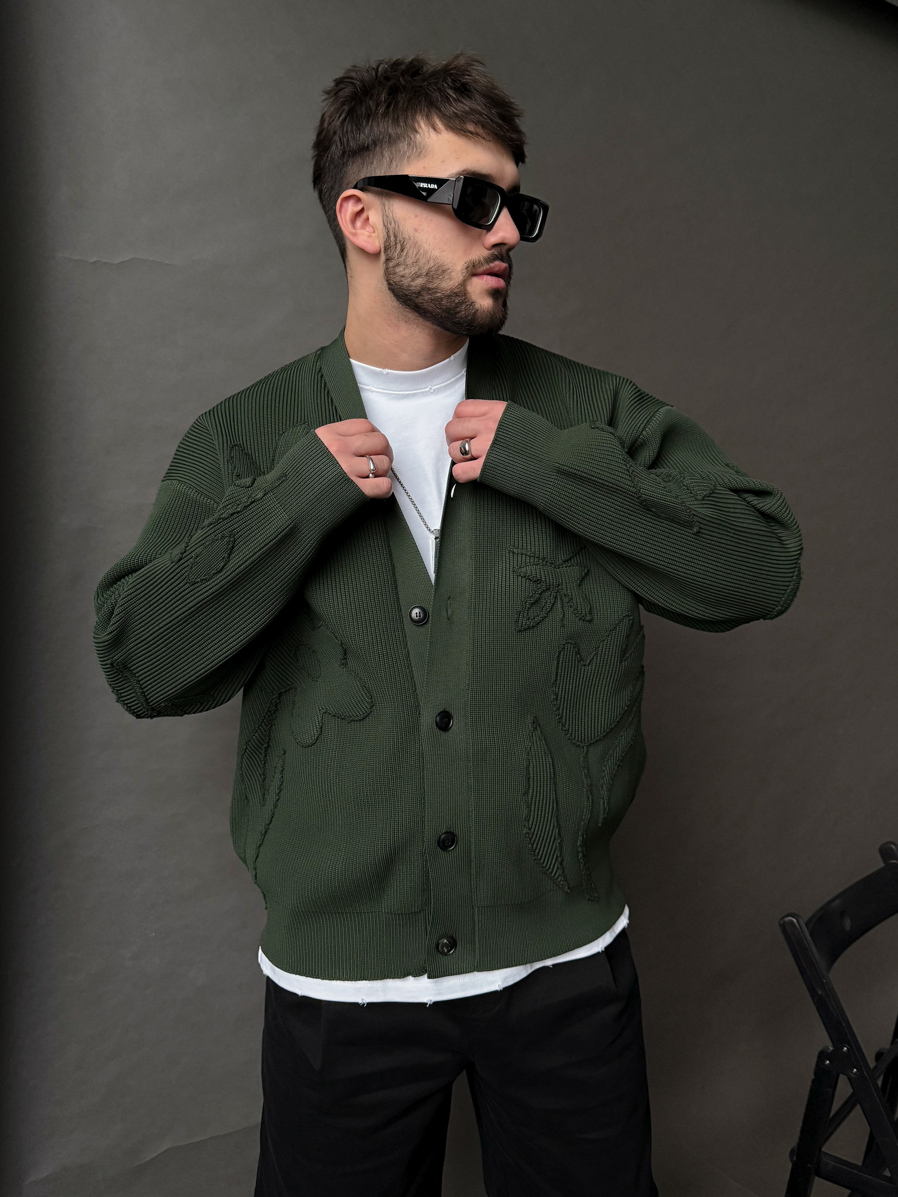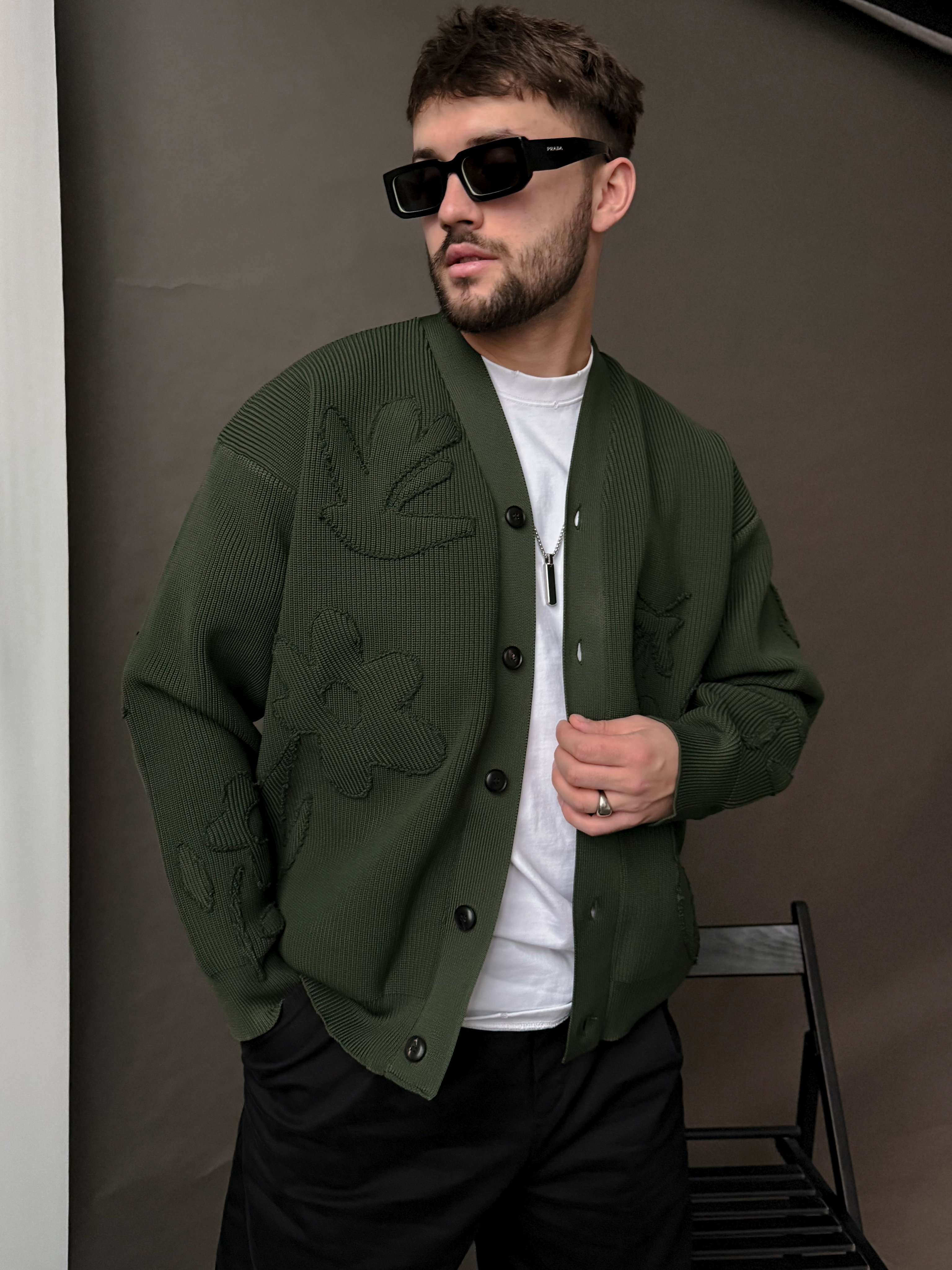 Темно-зеленый мужской кардиган с цветами. Стильная модель с дизайном для небанальных повседневных образов.
