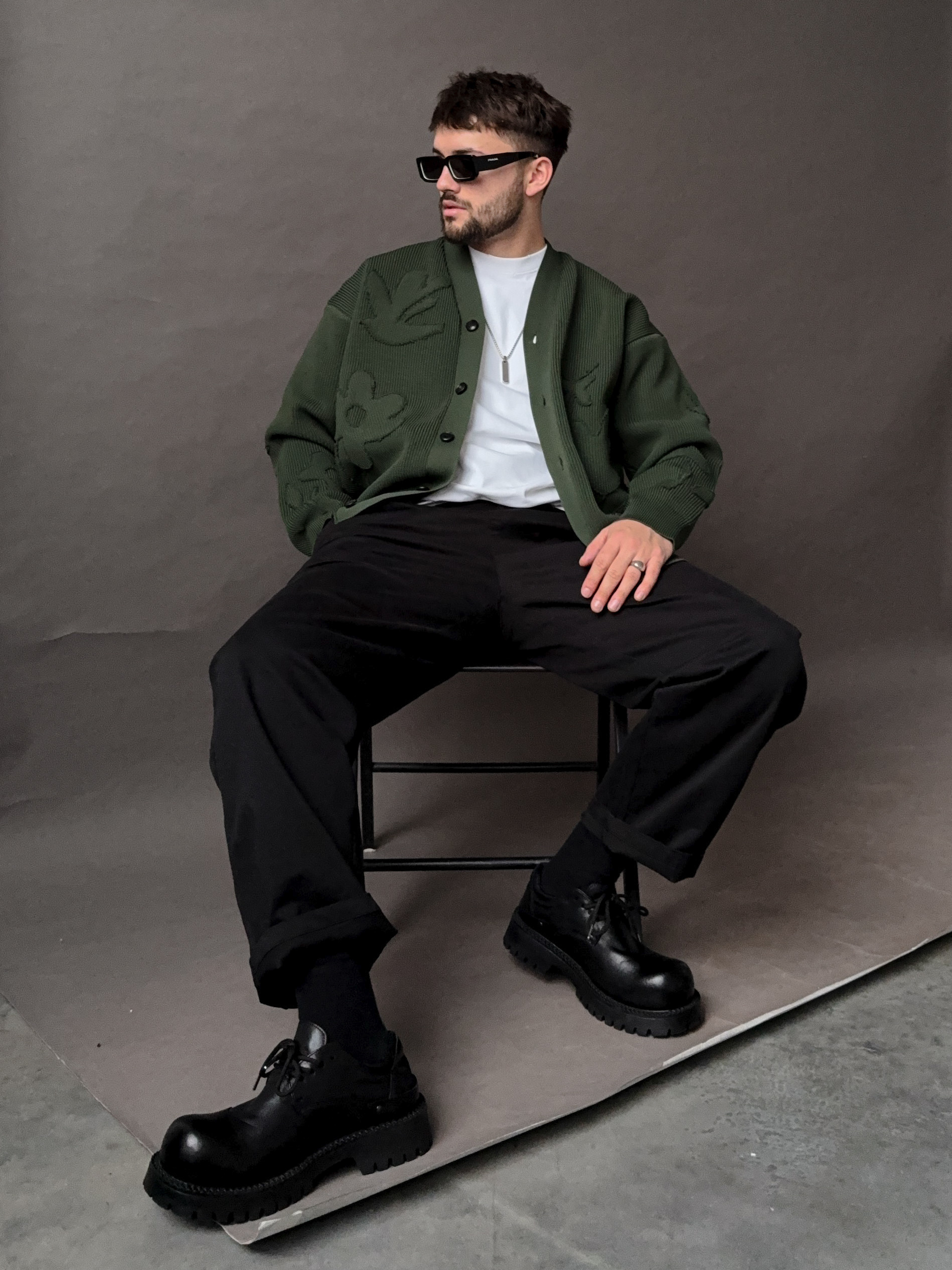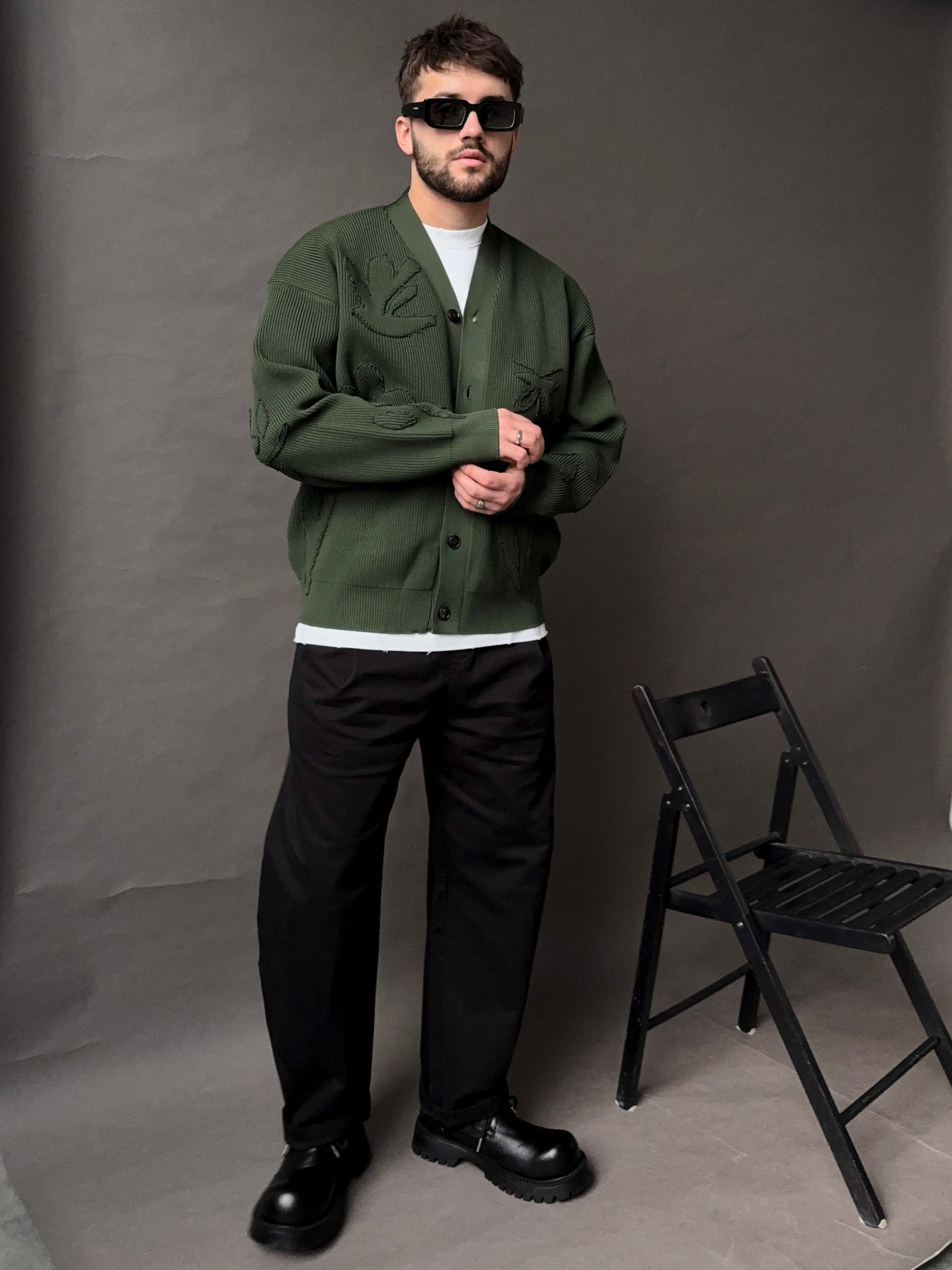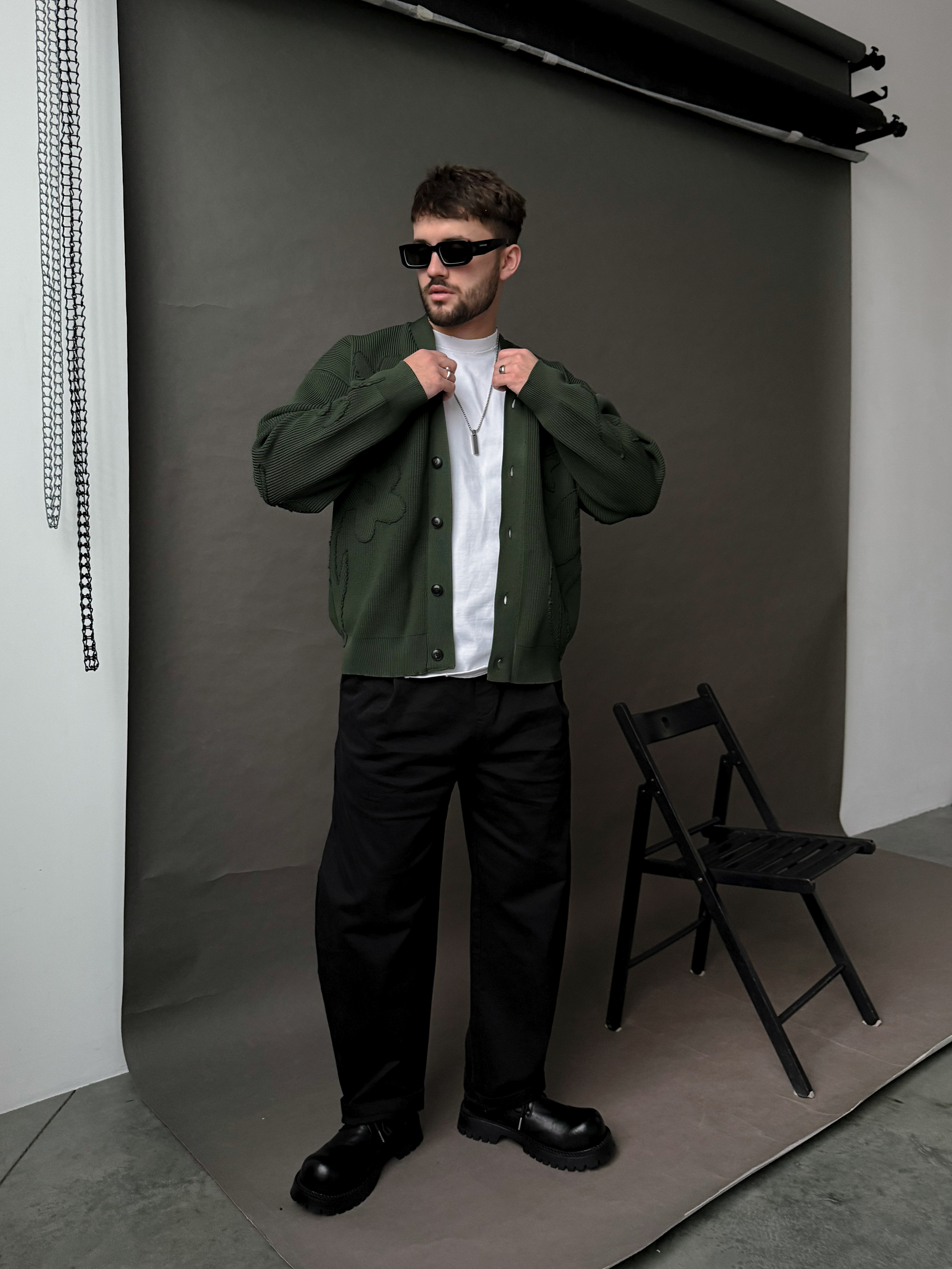 Темно-зеленый мужской кардиган с цветами. Стильная модель с дизайном для небанальных повседневных образов.