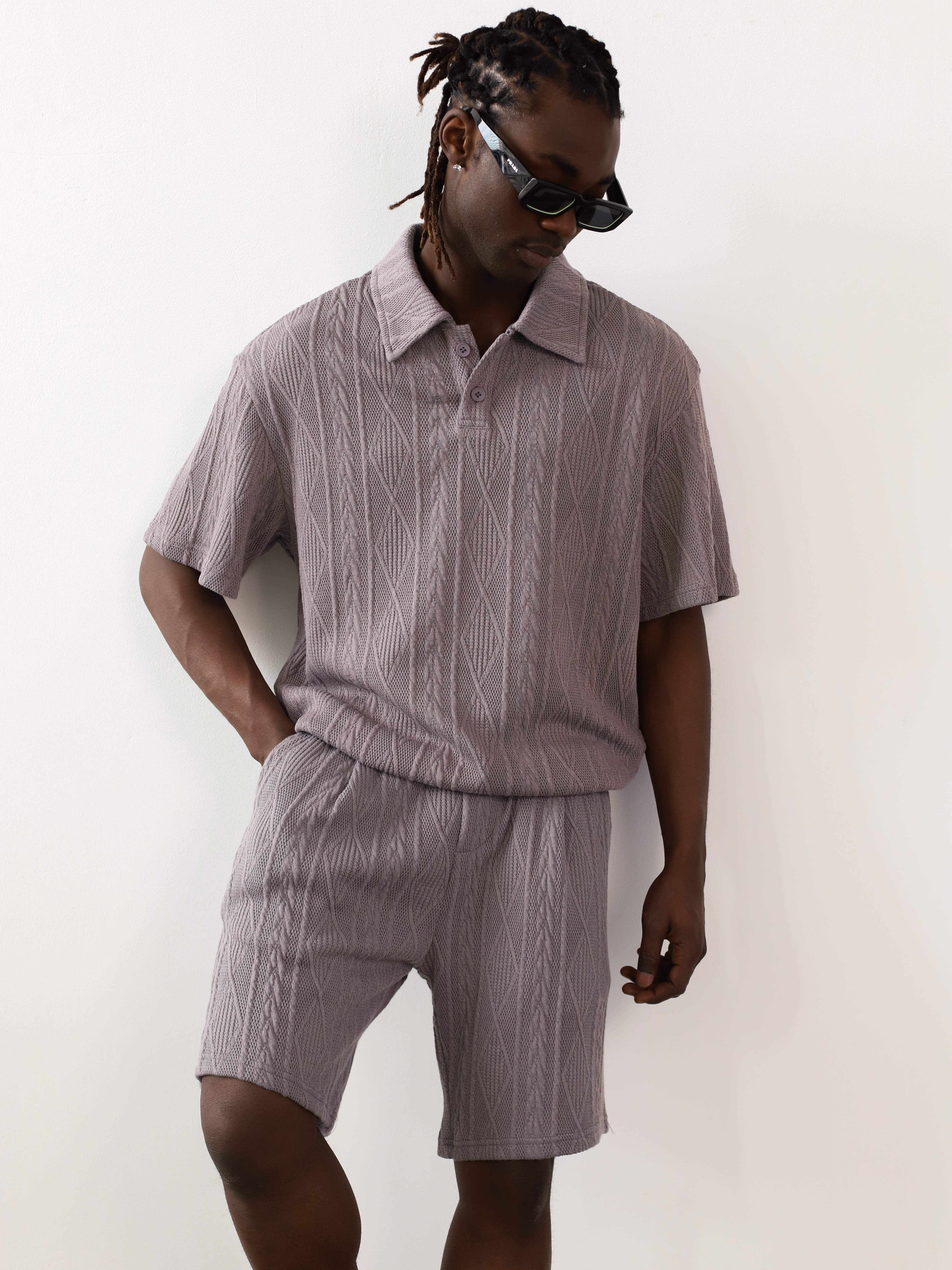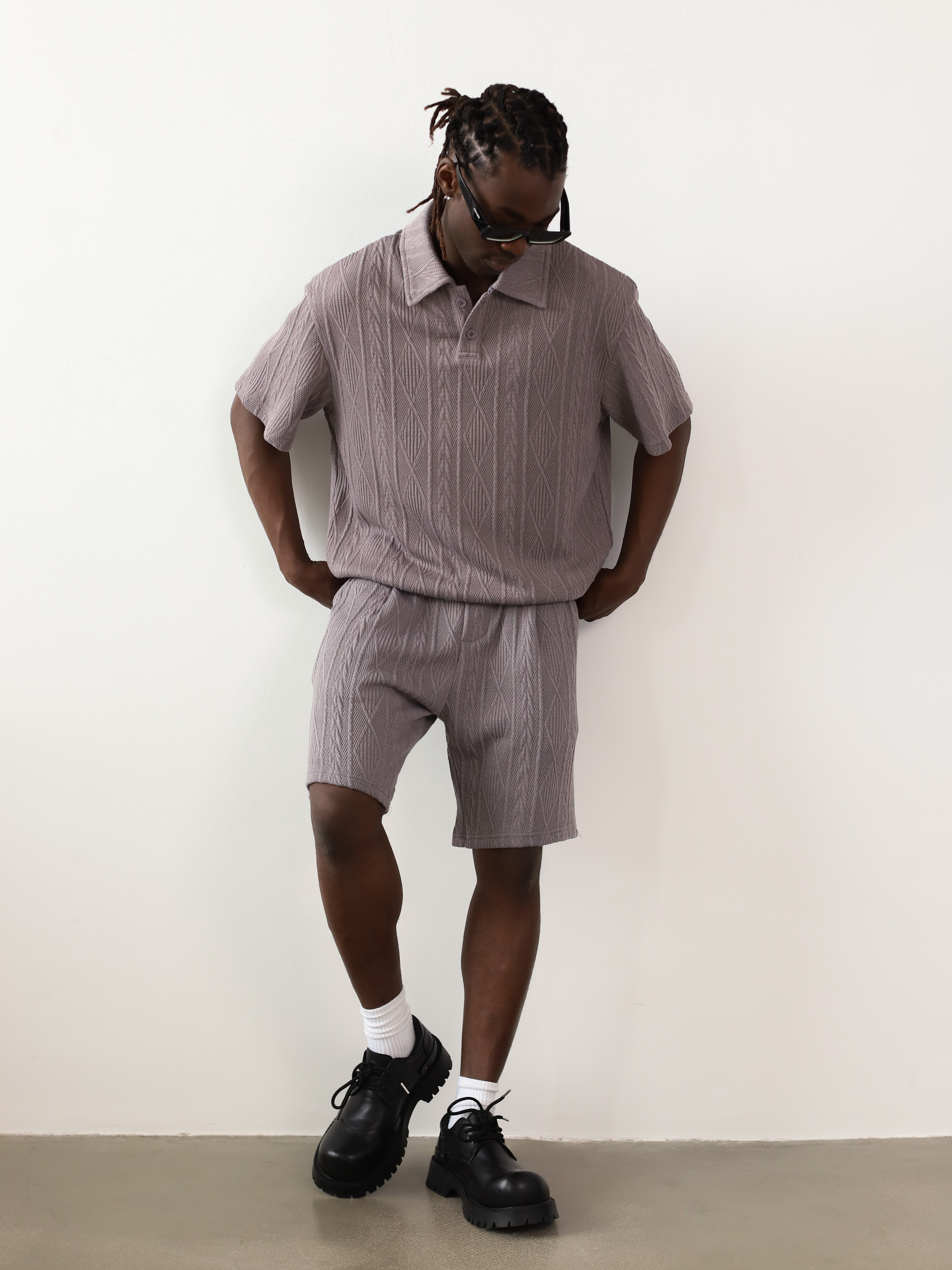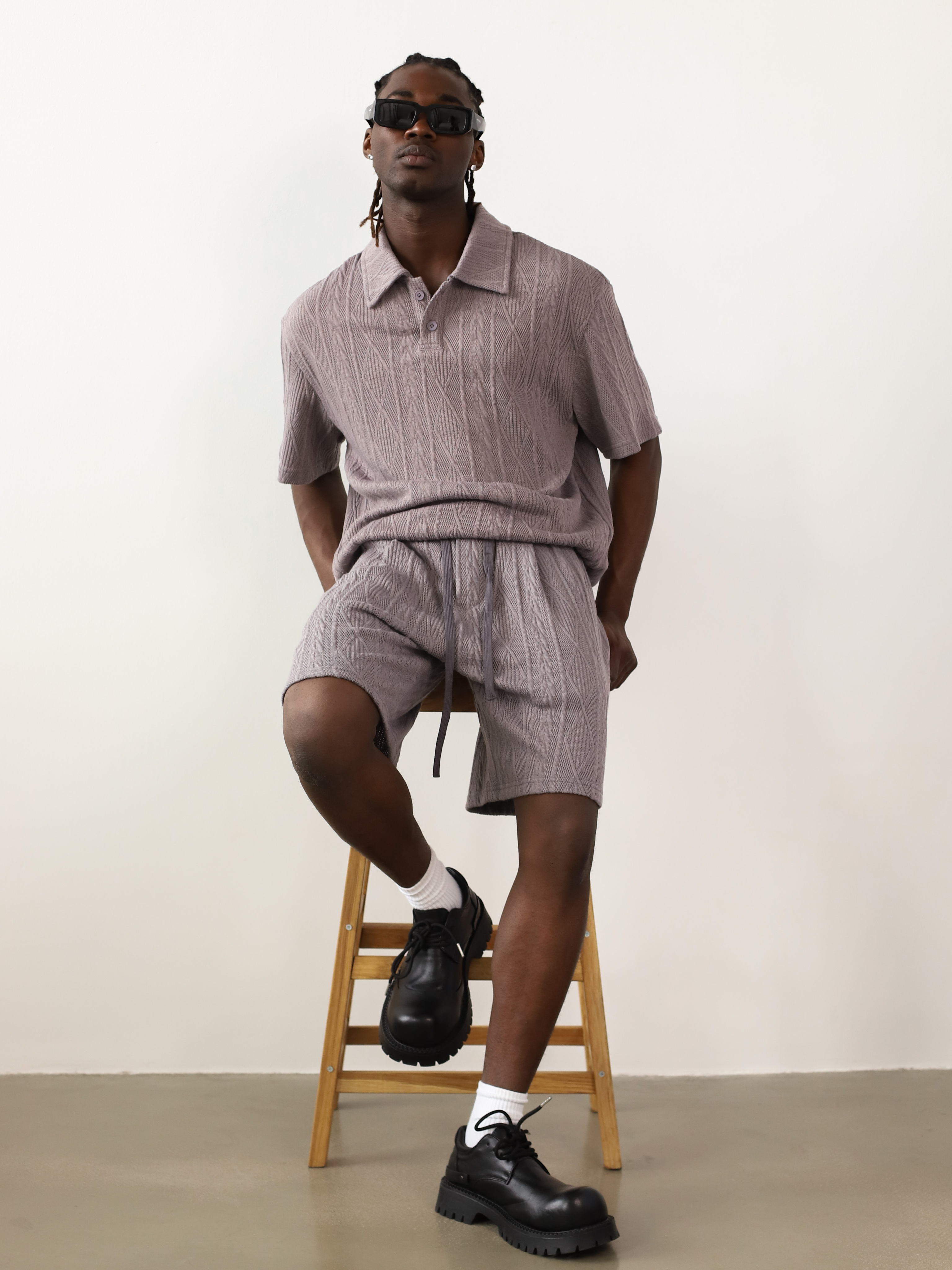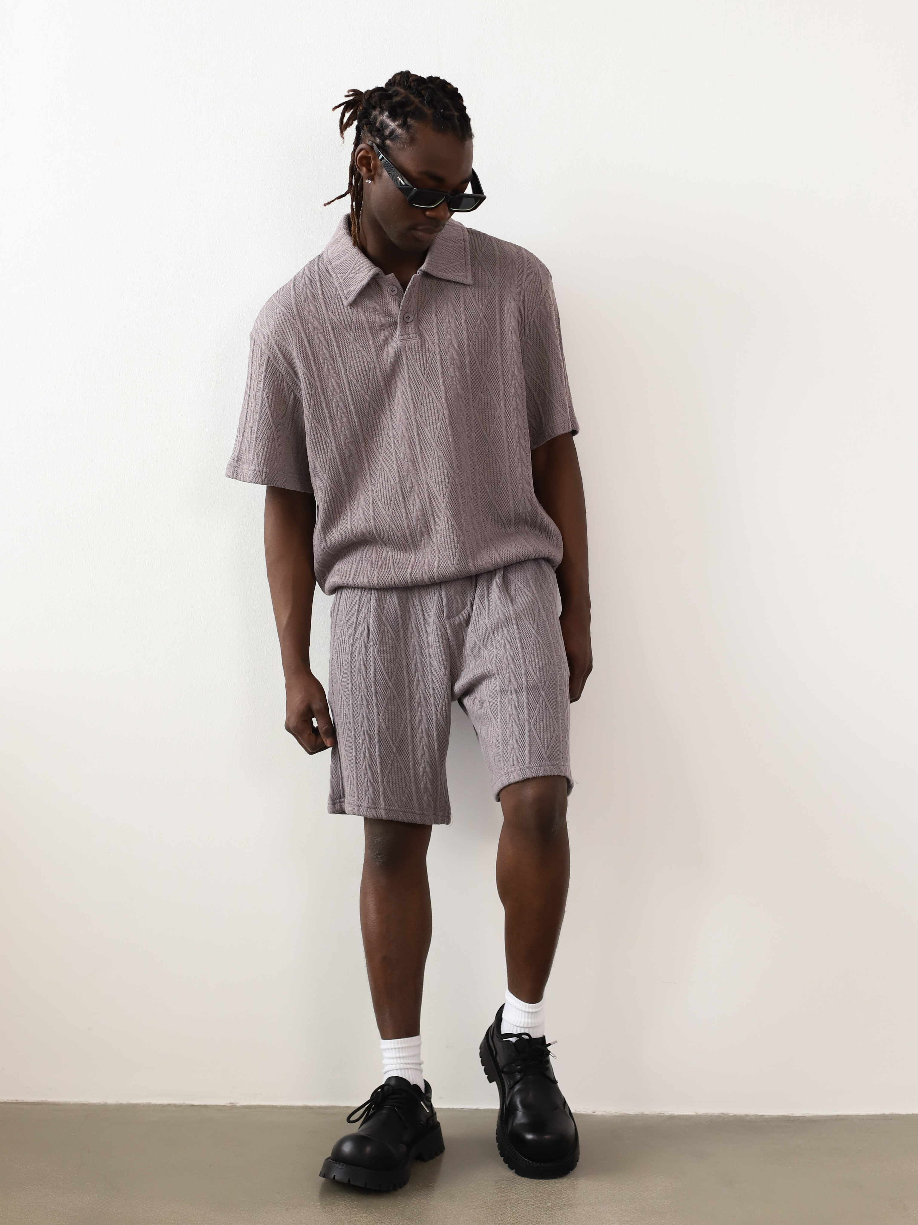 Вязаный мужской костюм-двойка серого цвета. Комплект с футболкой-поло и шортами для летних образов в стиле кэжуал.