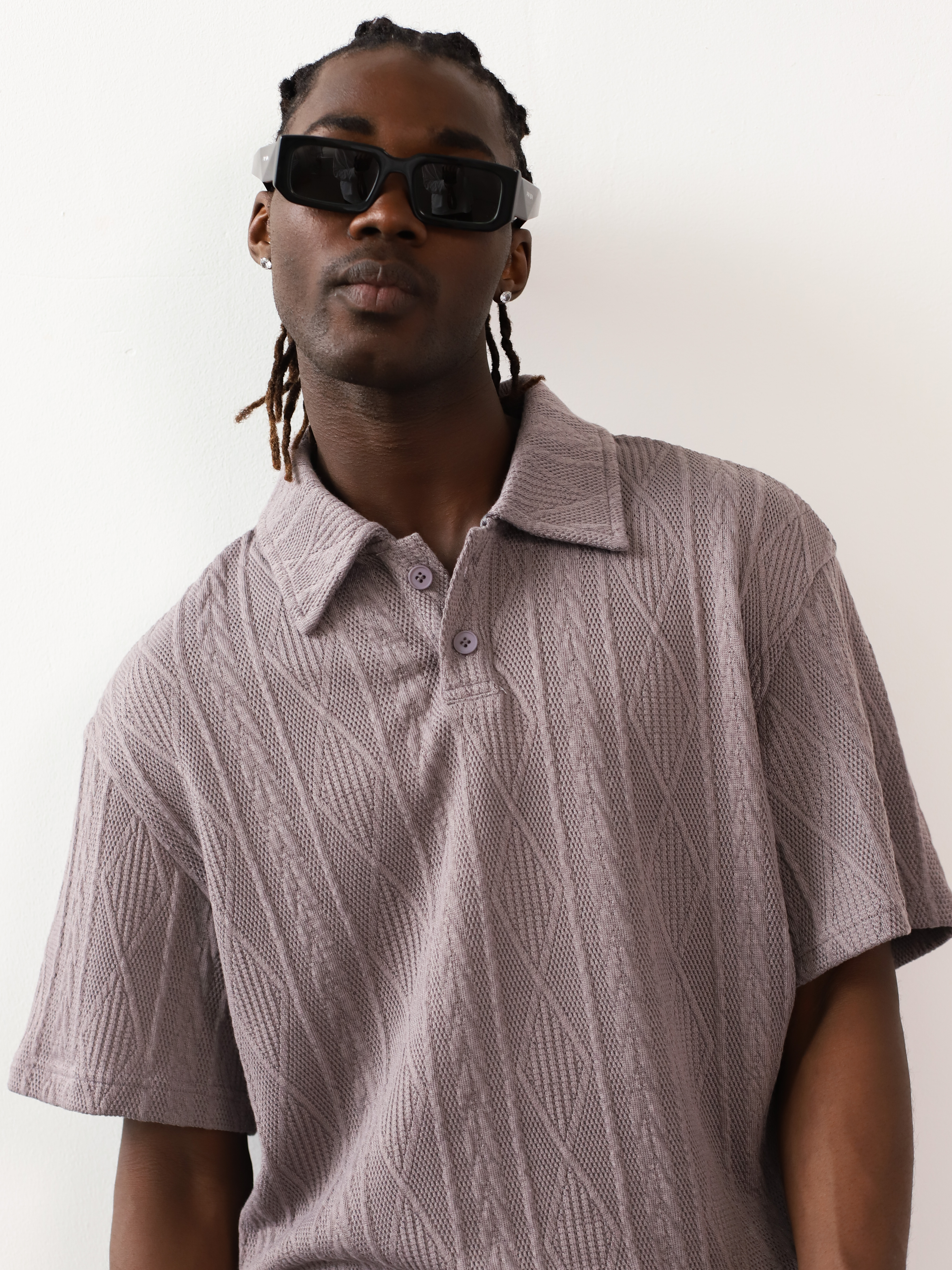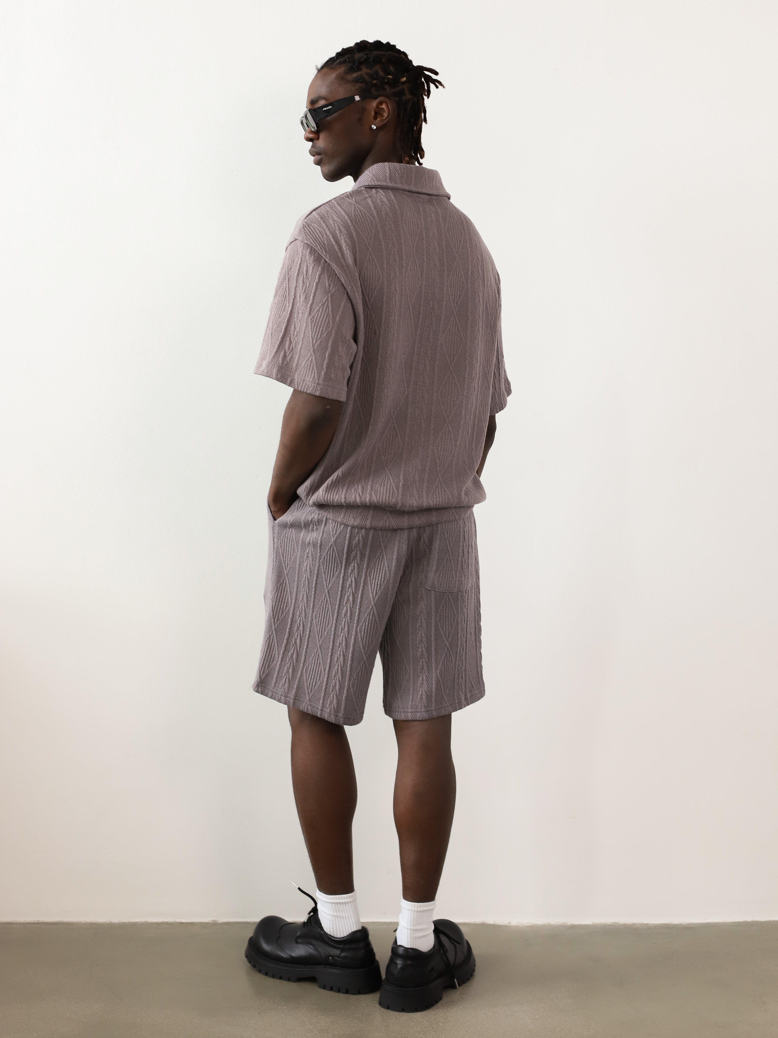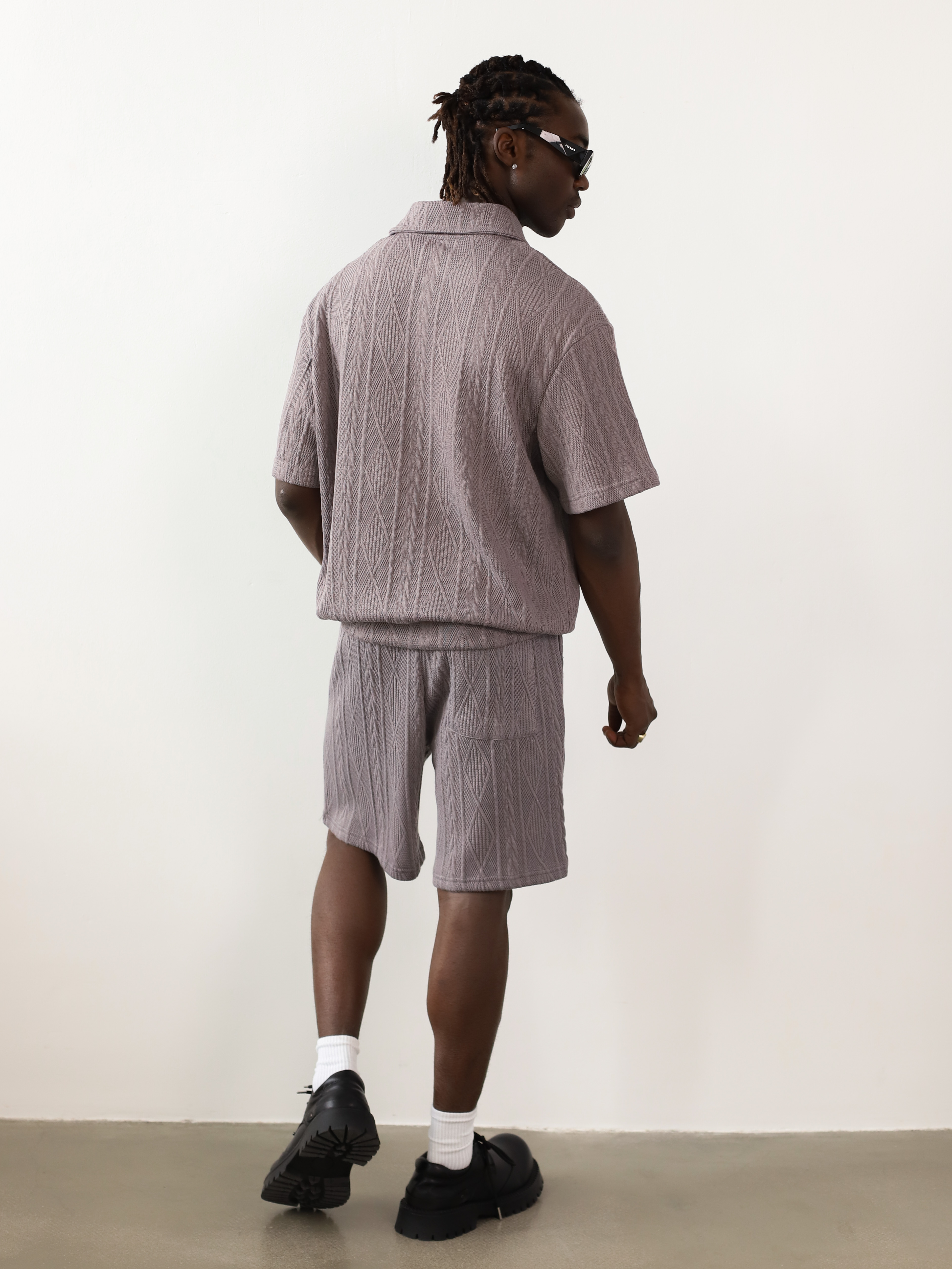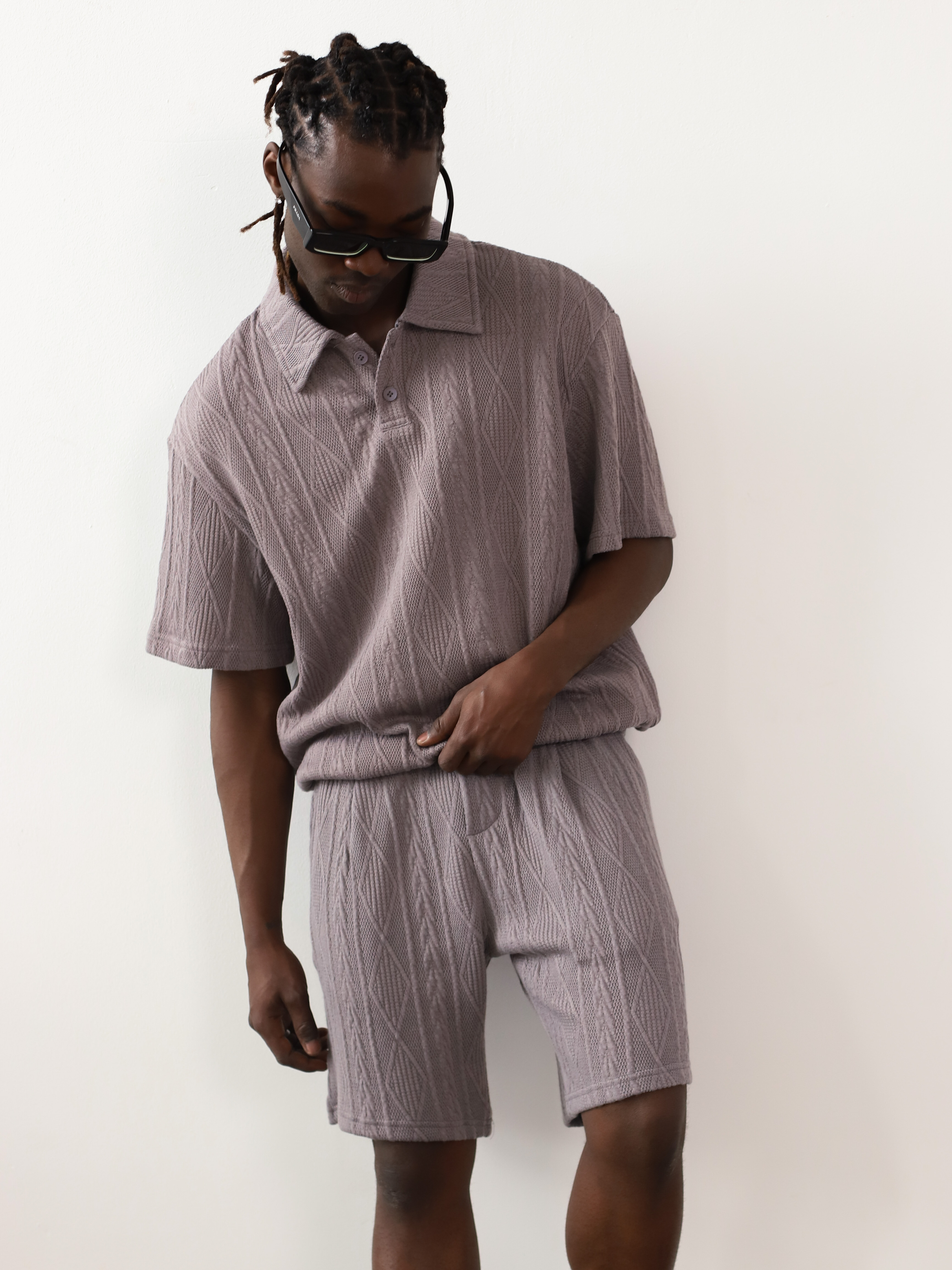 Вязаный мужской костюм-двойка серого цвета. Комплект с футболкой-поло и шортами для летних образов в стиле кэжуал.