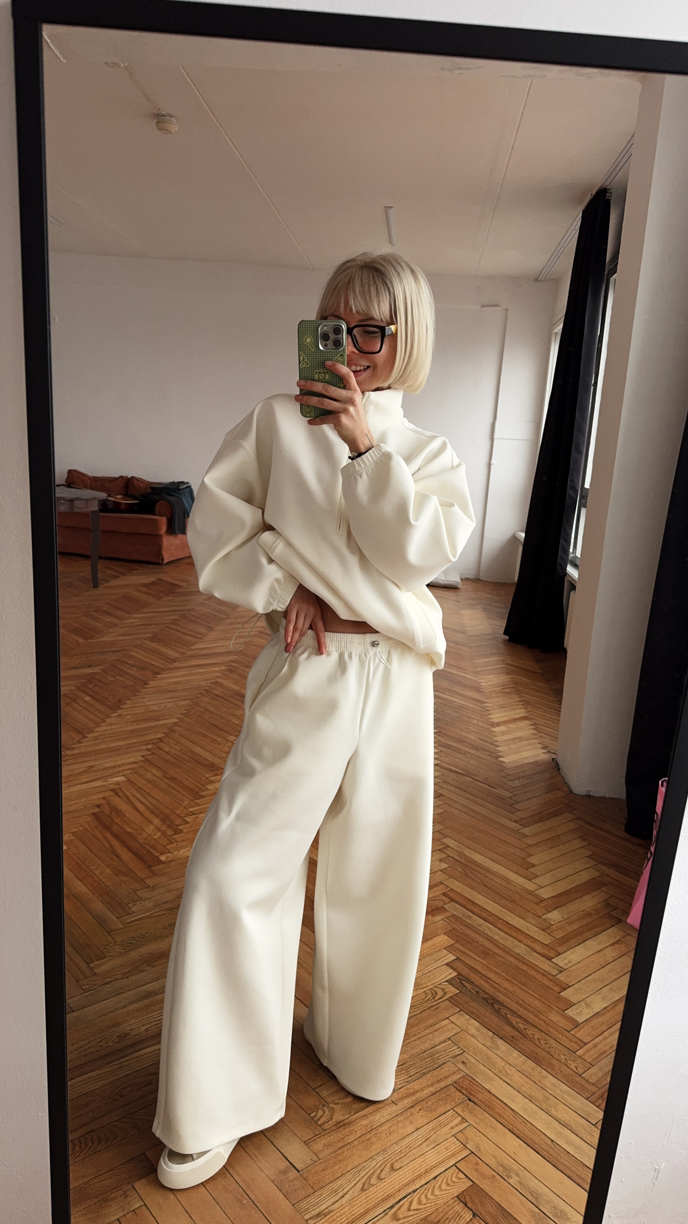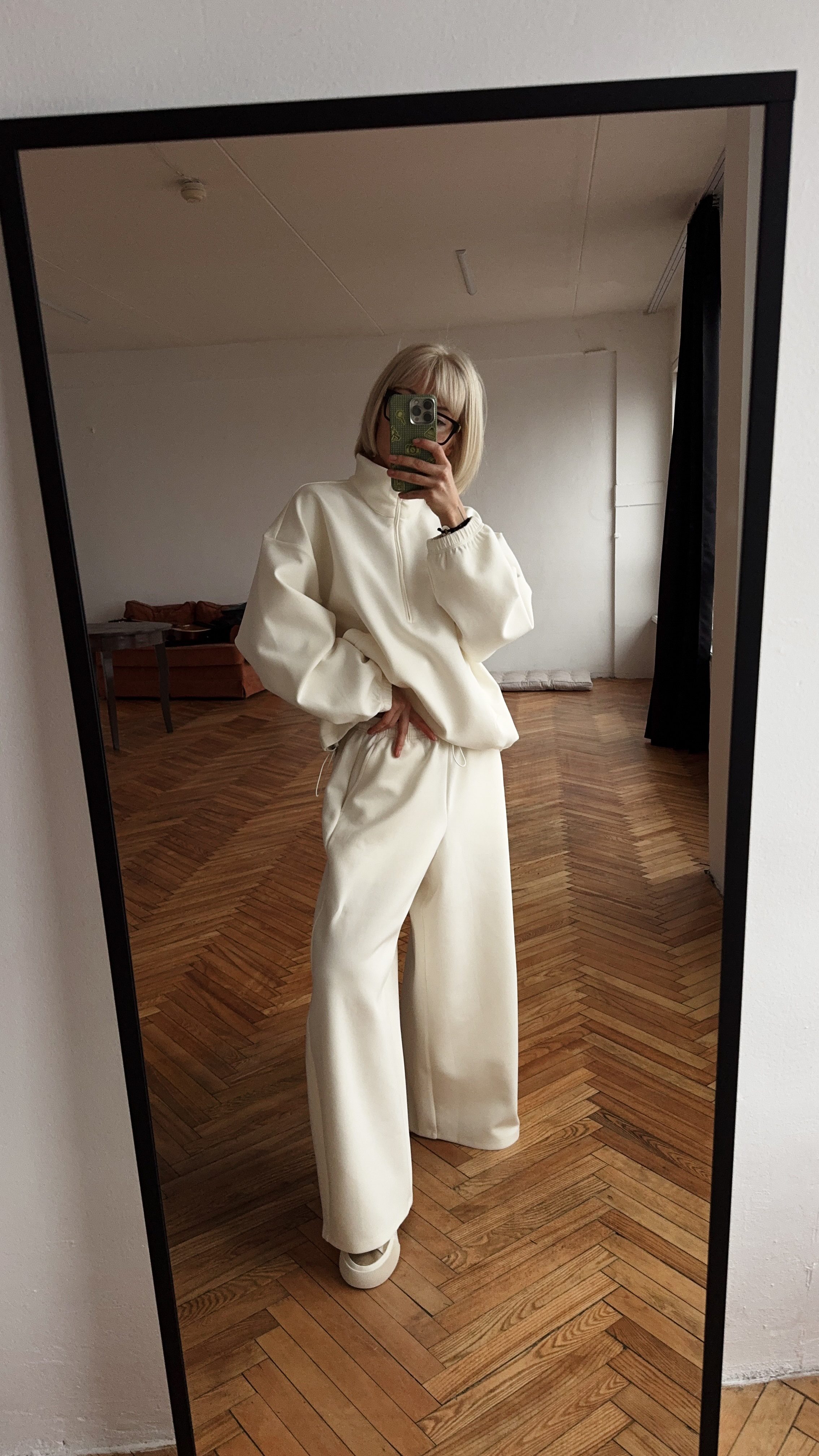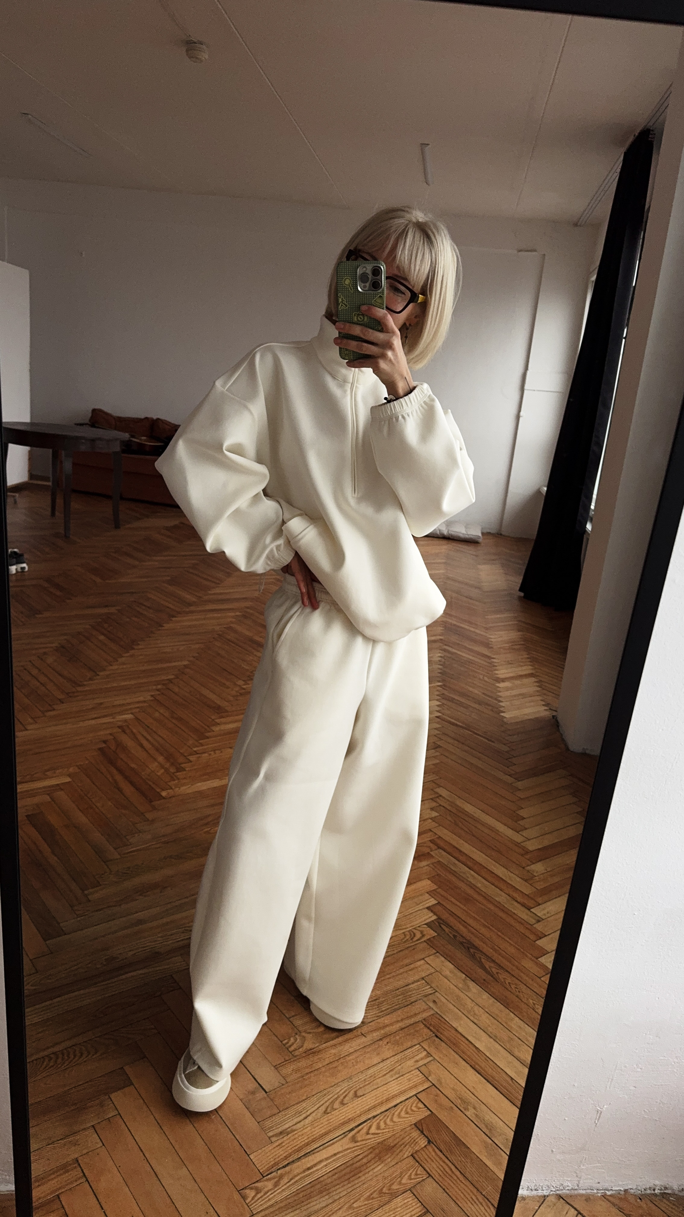 Белый костюм для создания модного образа в стиле спорт-кэжуал. В комплекте широкие женские брюки и свитшот универсального размера.
