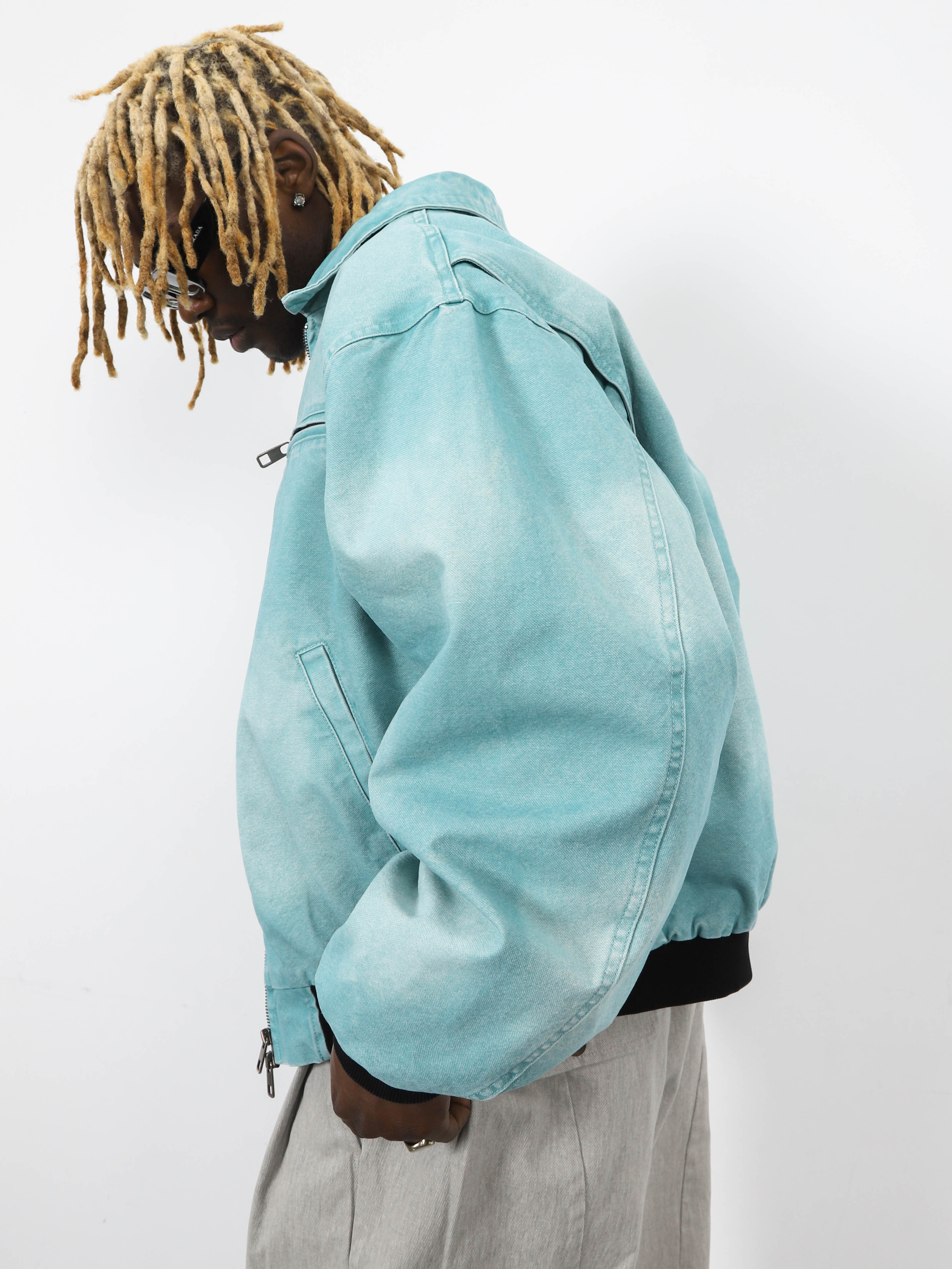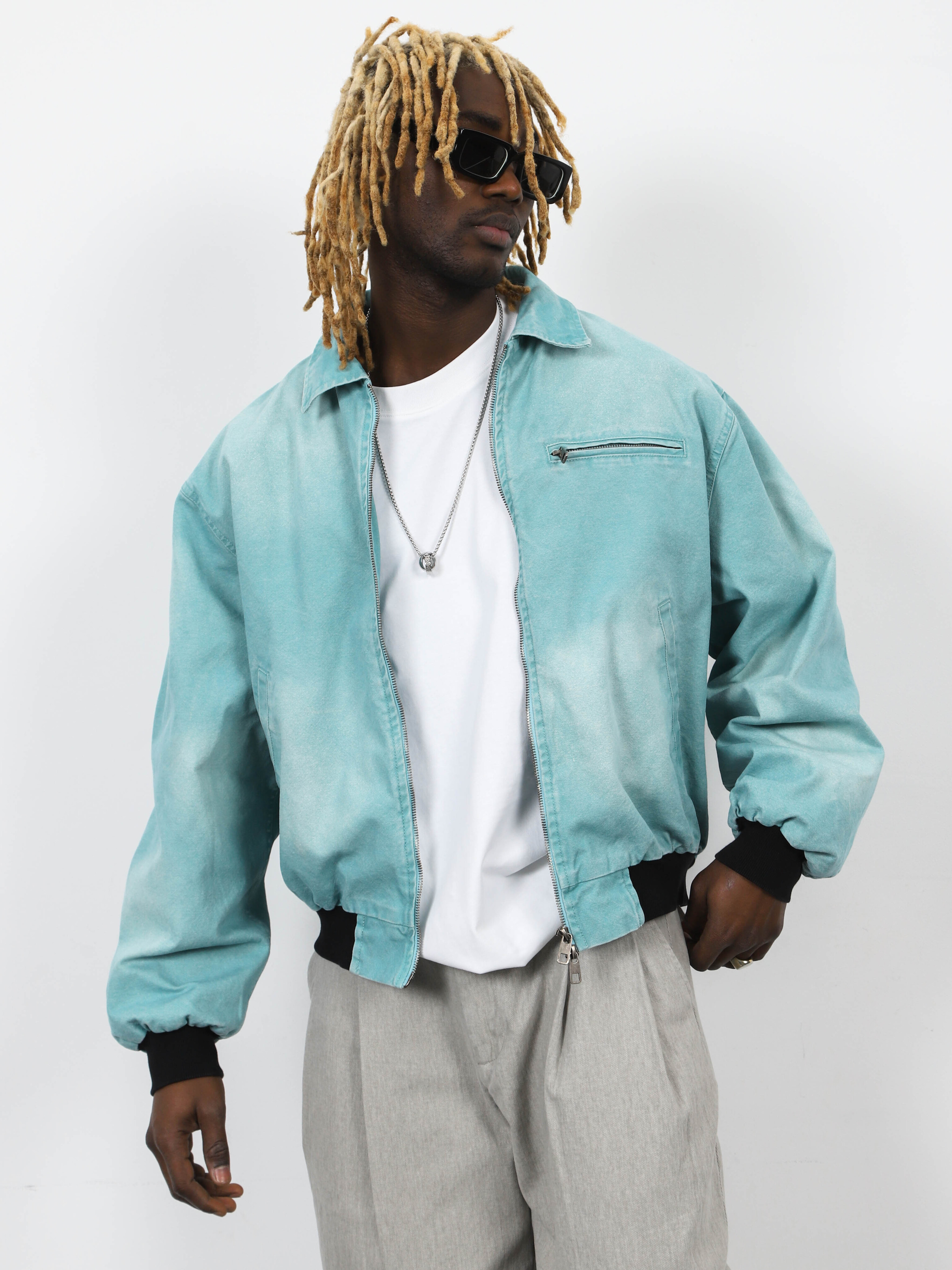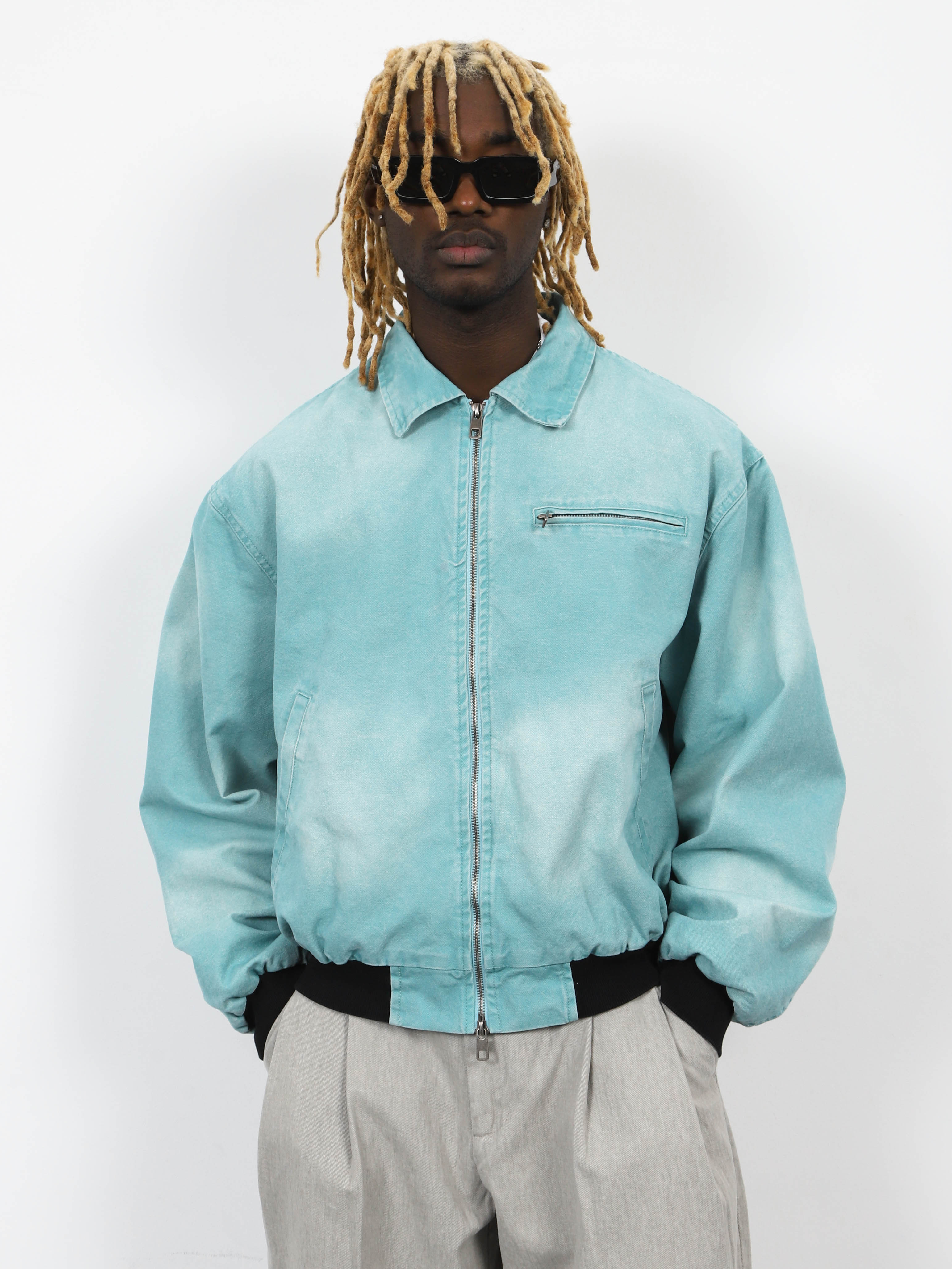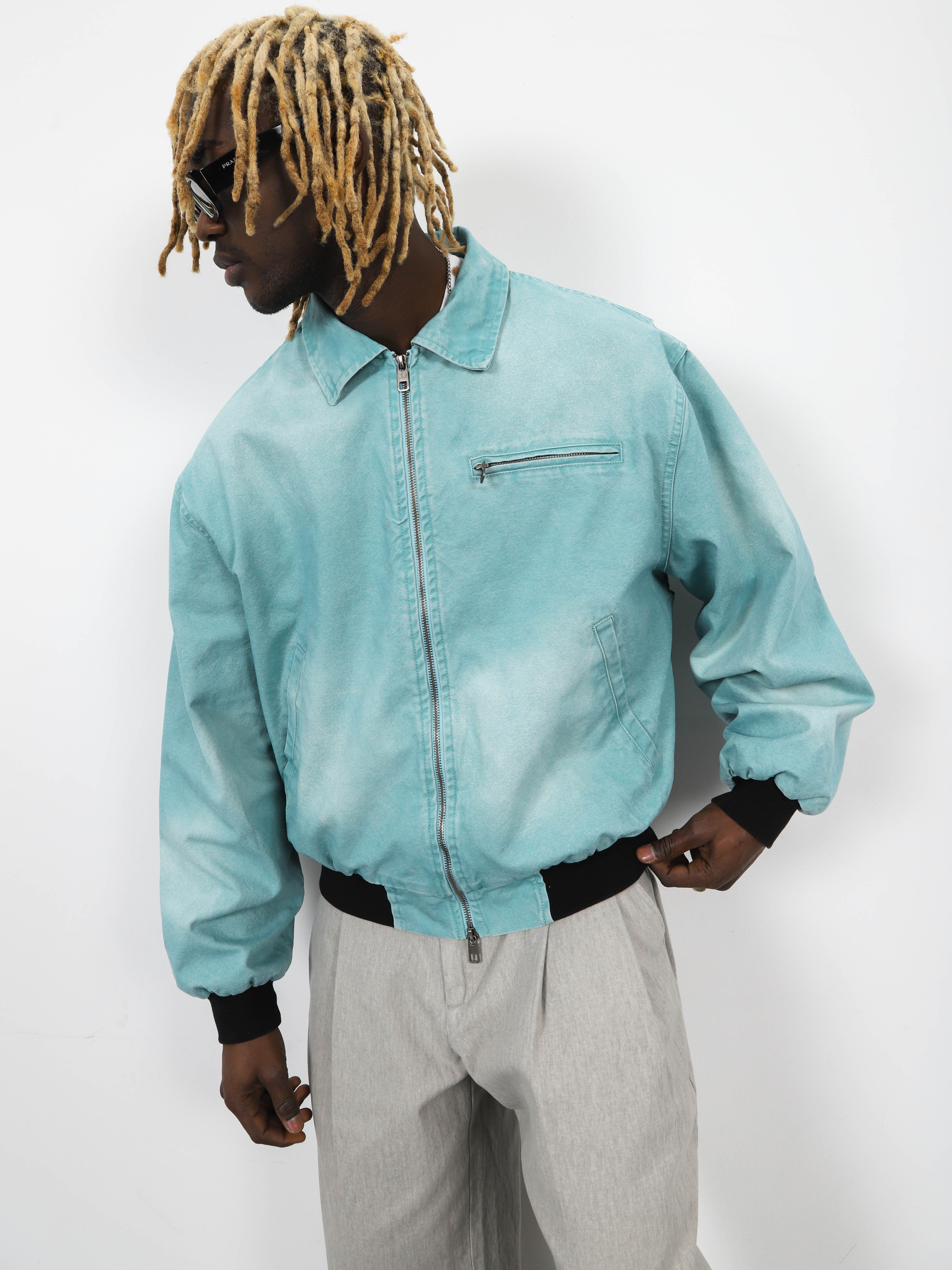 Джинсовая мужская куртка-бомбер с контрастными манжетами и рубашечным воротником. Стильная модель морского цвета для ярких городских образов.