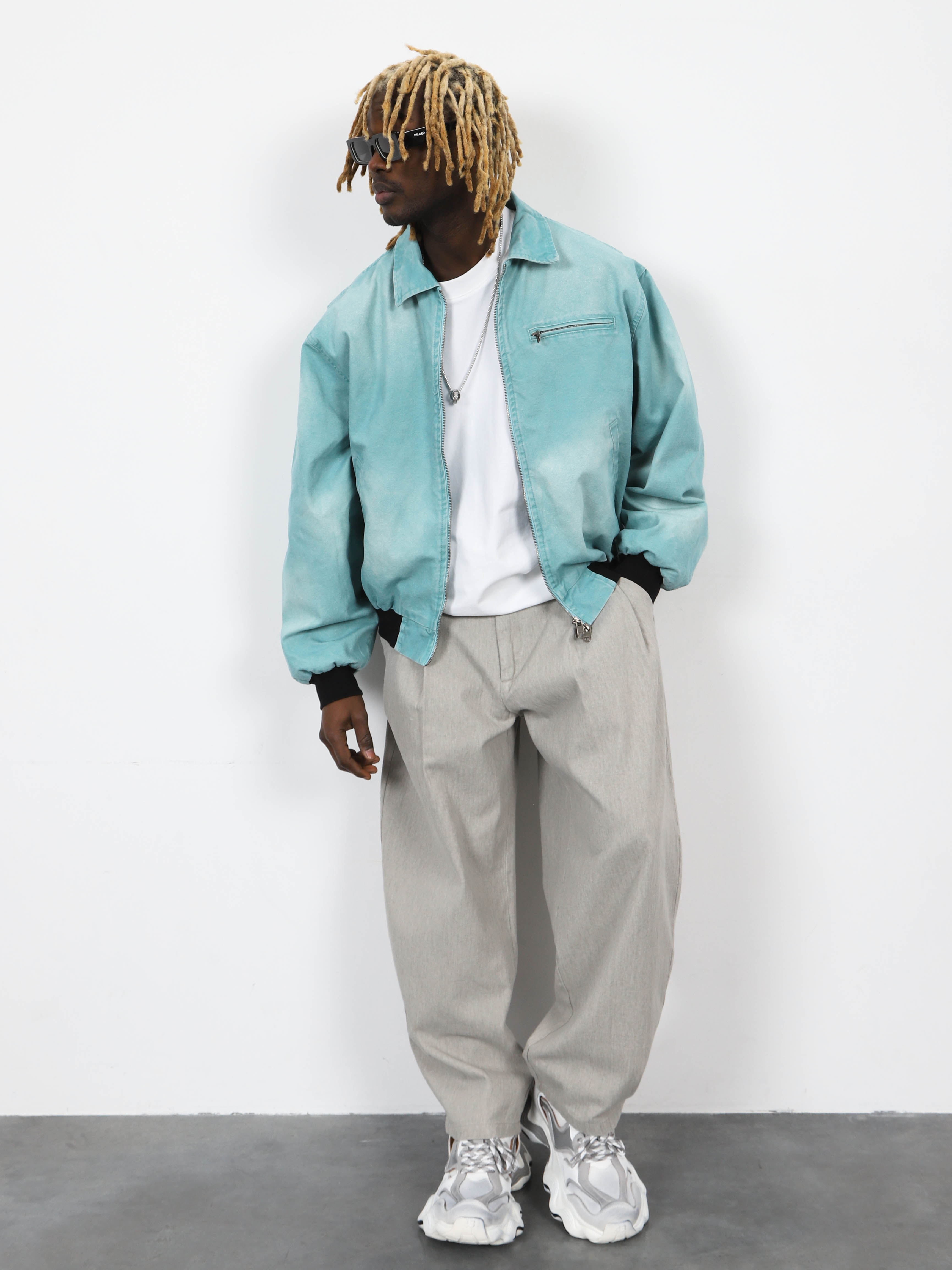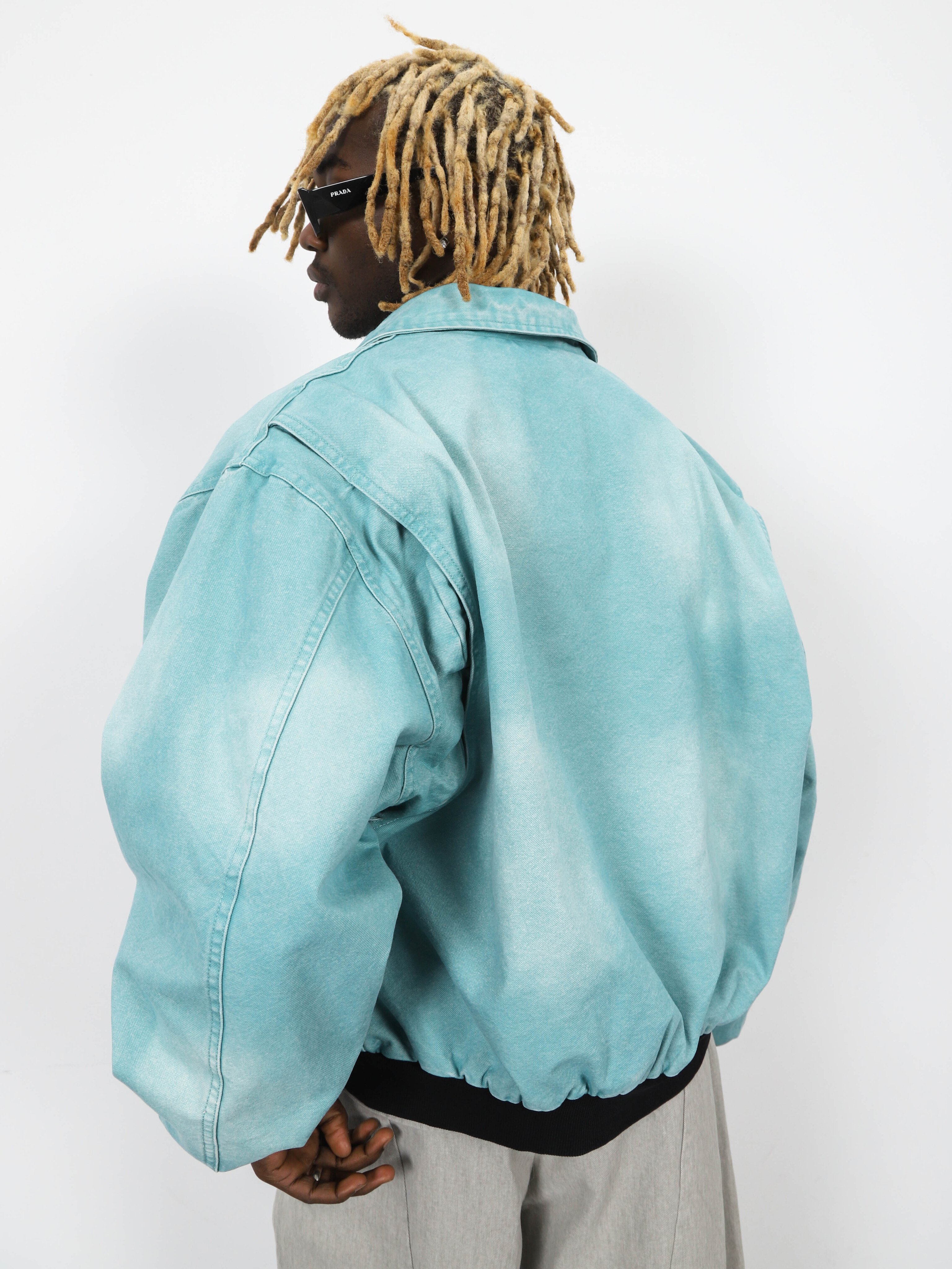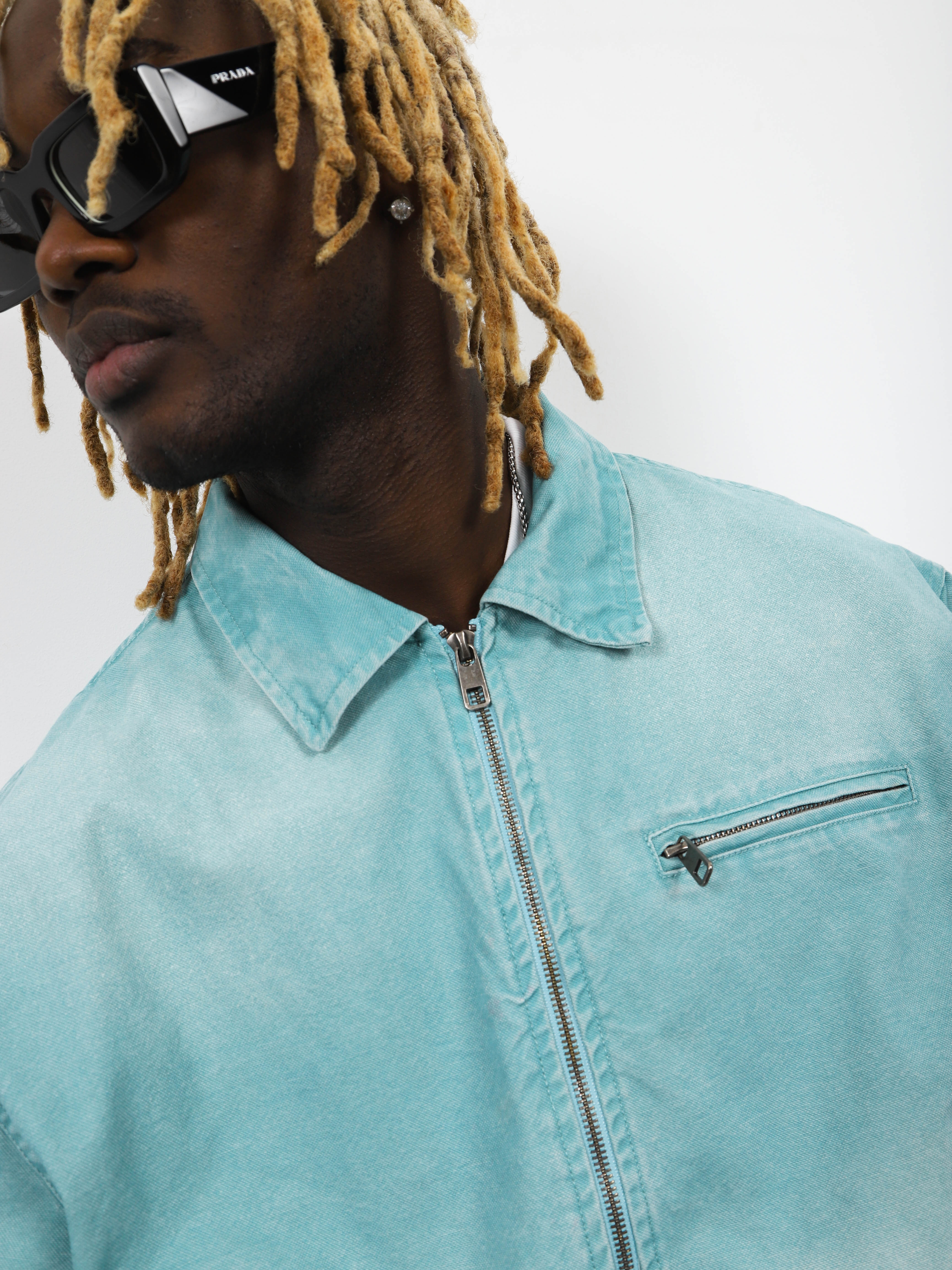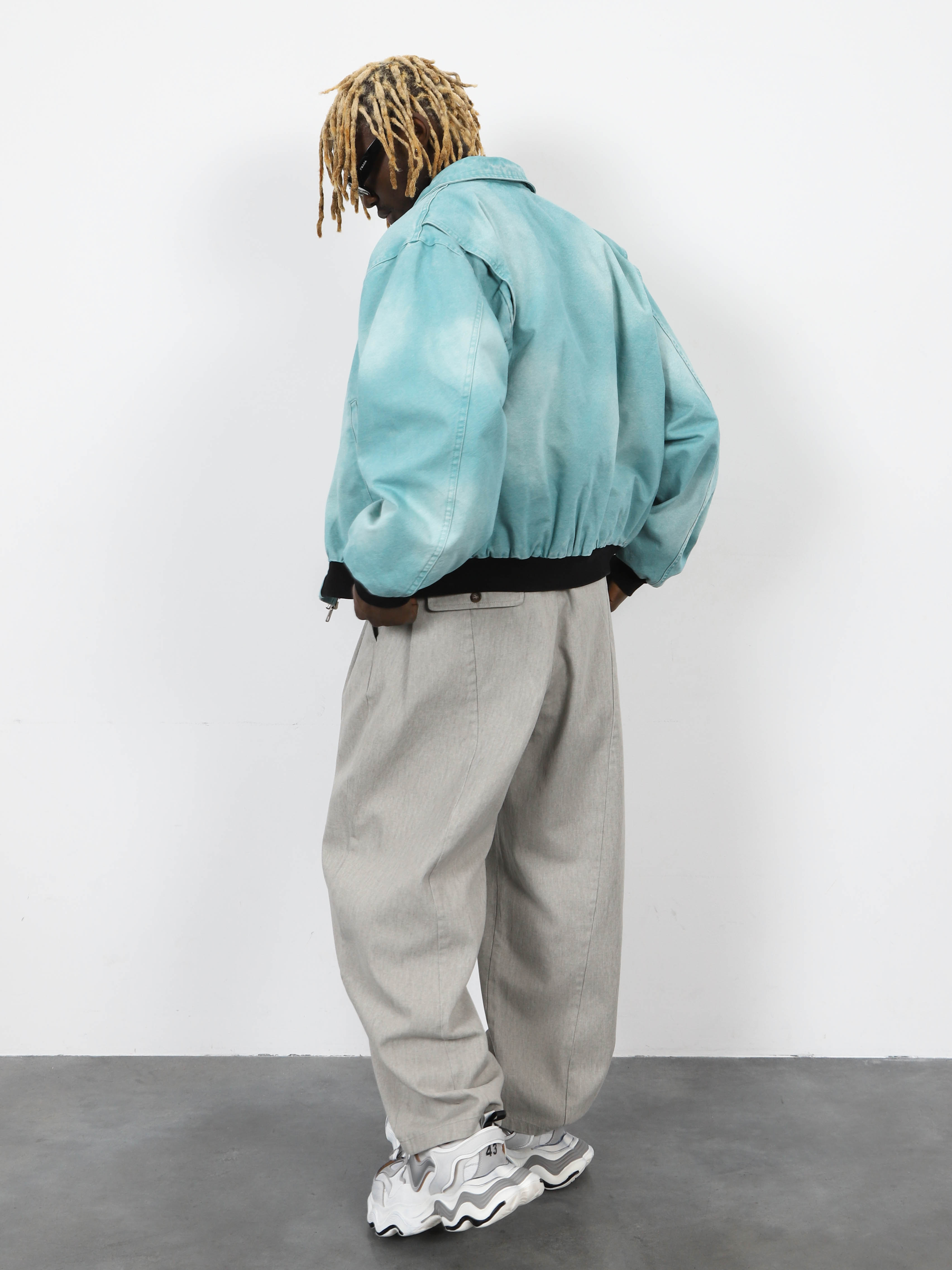 Джинсовая мужская куртка-бомбер с контрастными манжетами и рубашечным воротником. Стильная модель морского цвета для ярких городских образов.