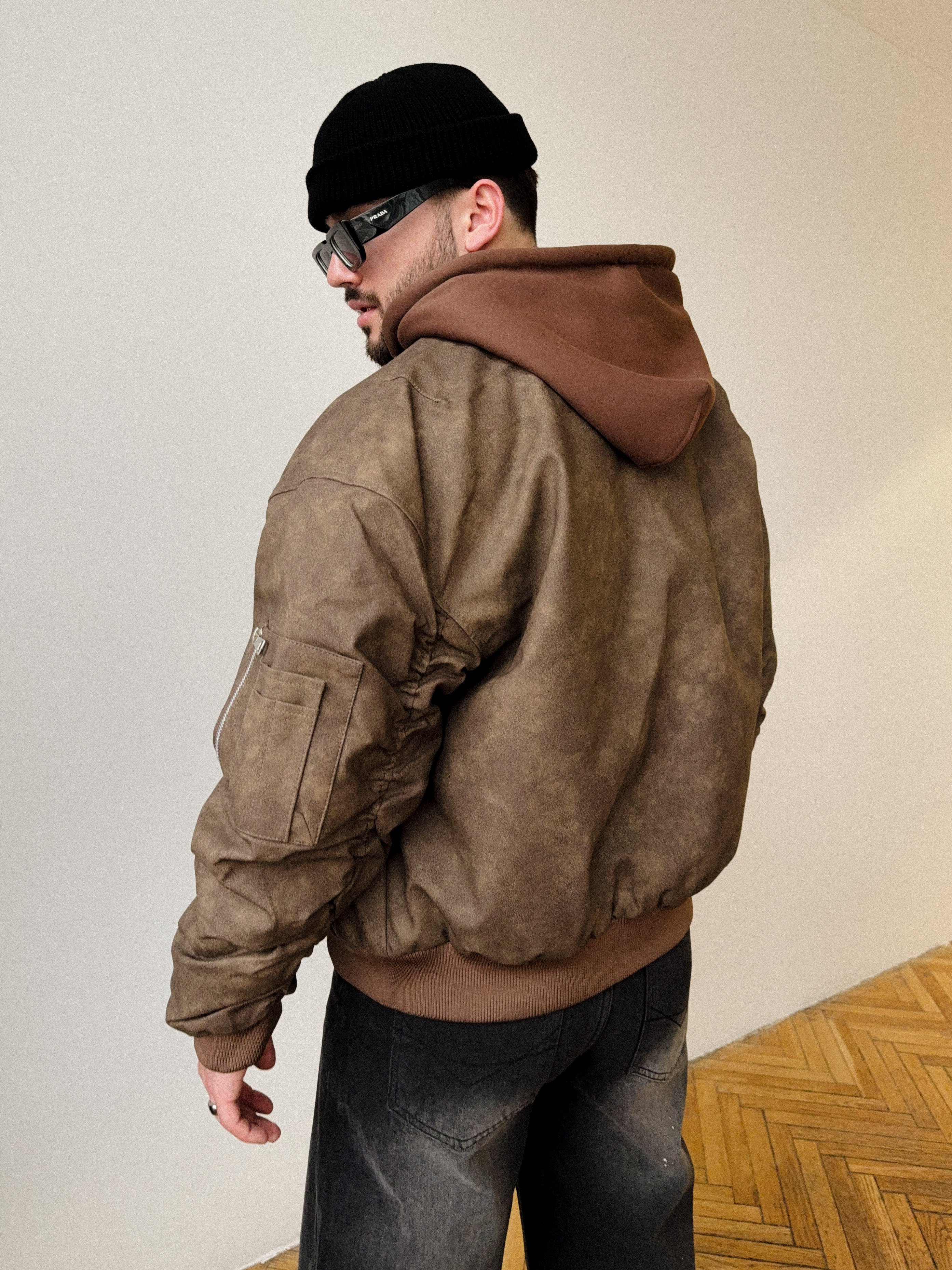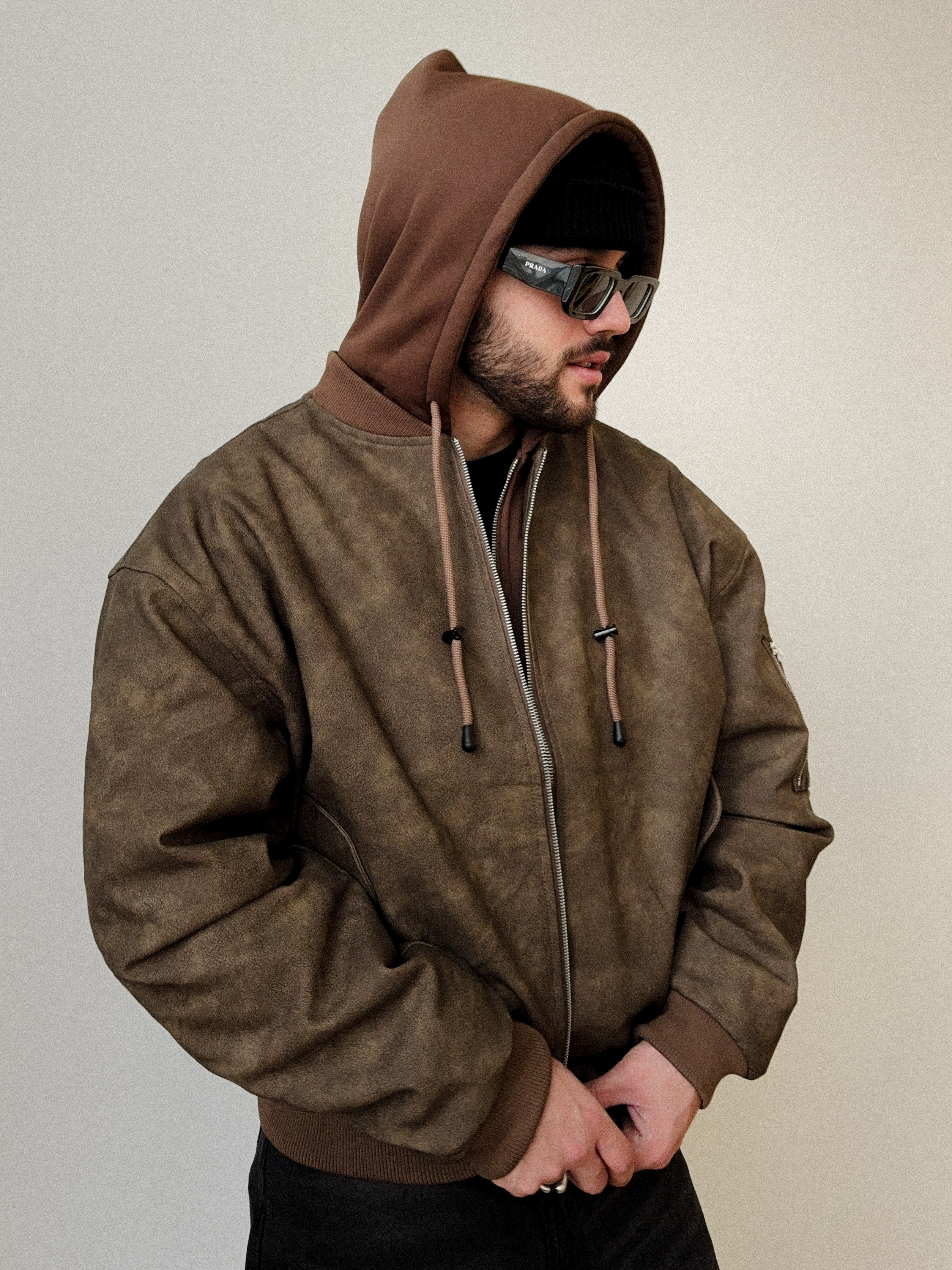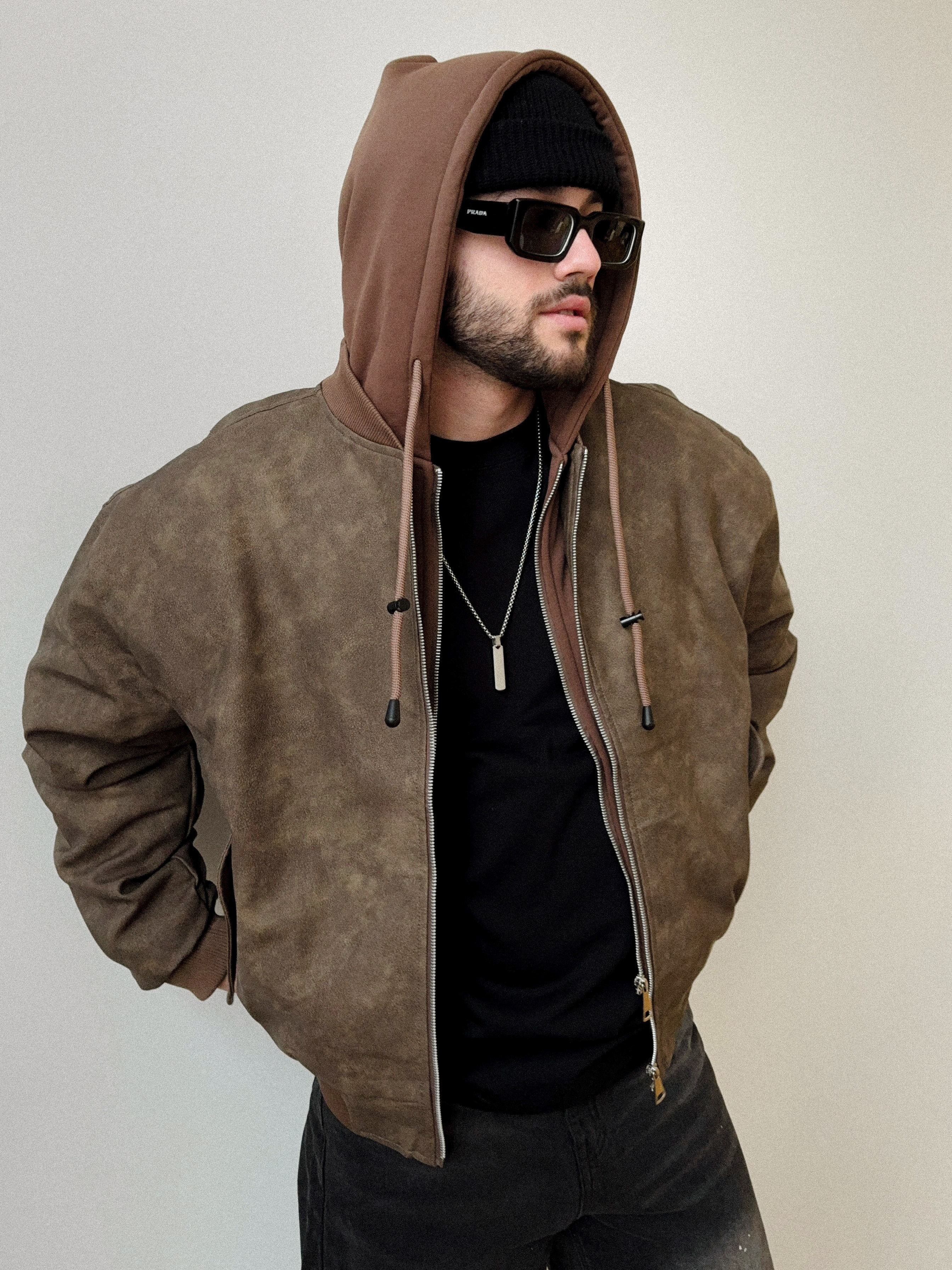 Мужская куртка-бомбер коричневого цвета, утепленная синтепоном. Укороченная модель с имитацией худи для создания стильного зимнего образа.