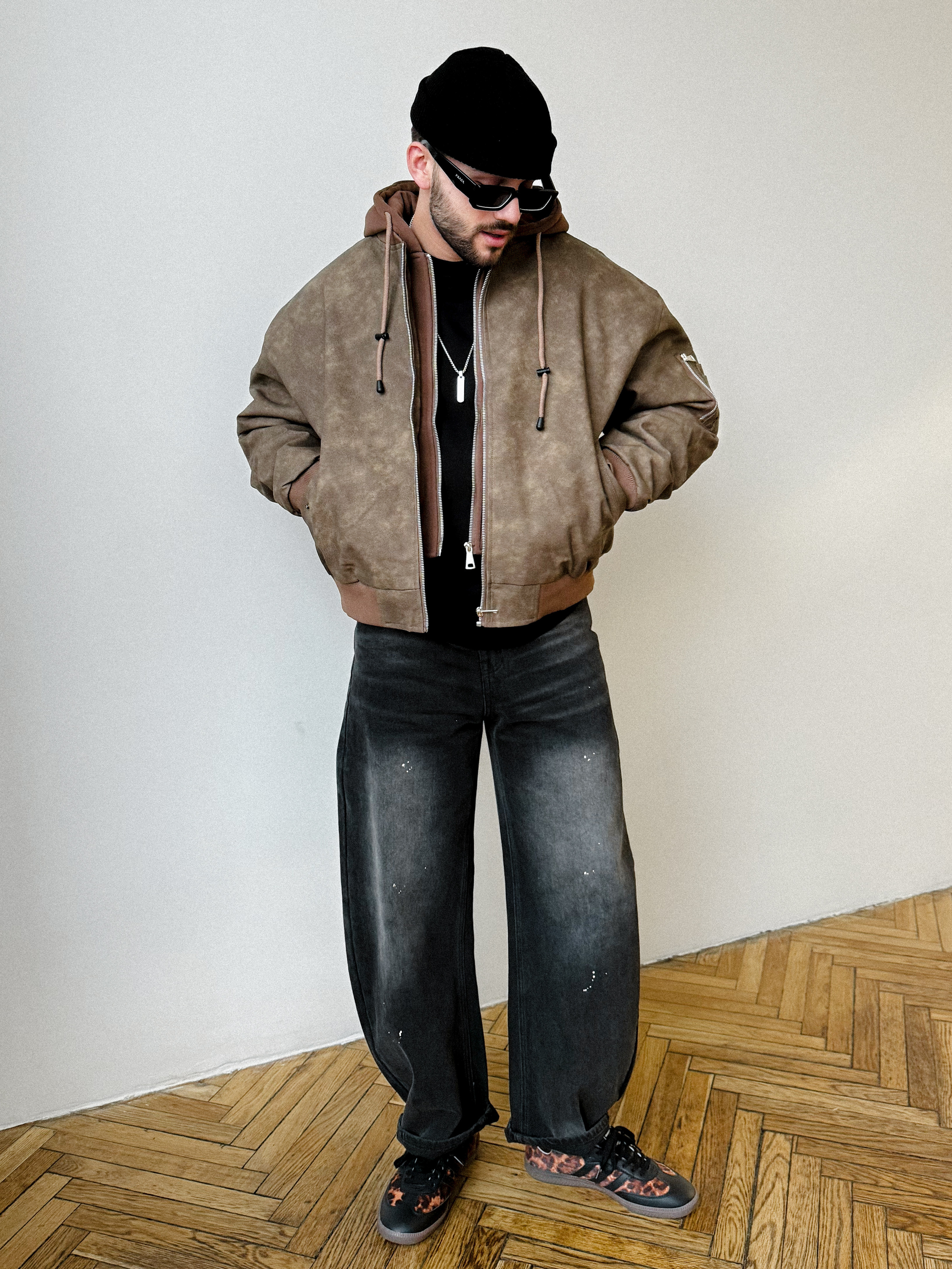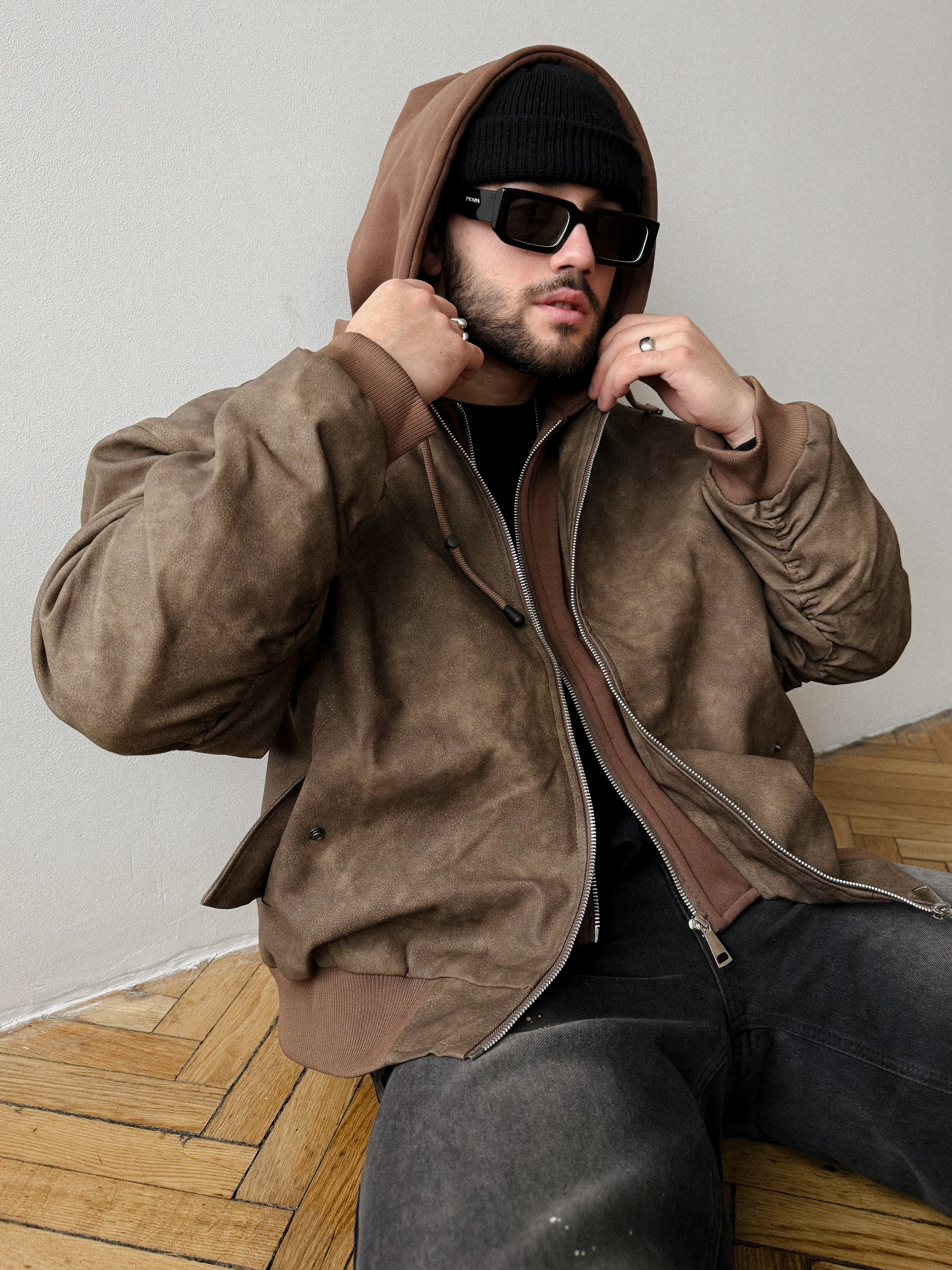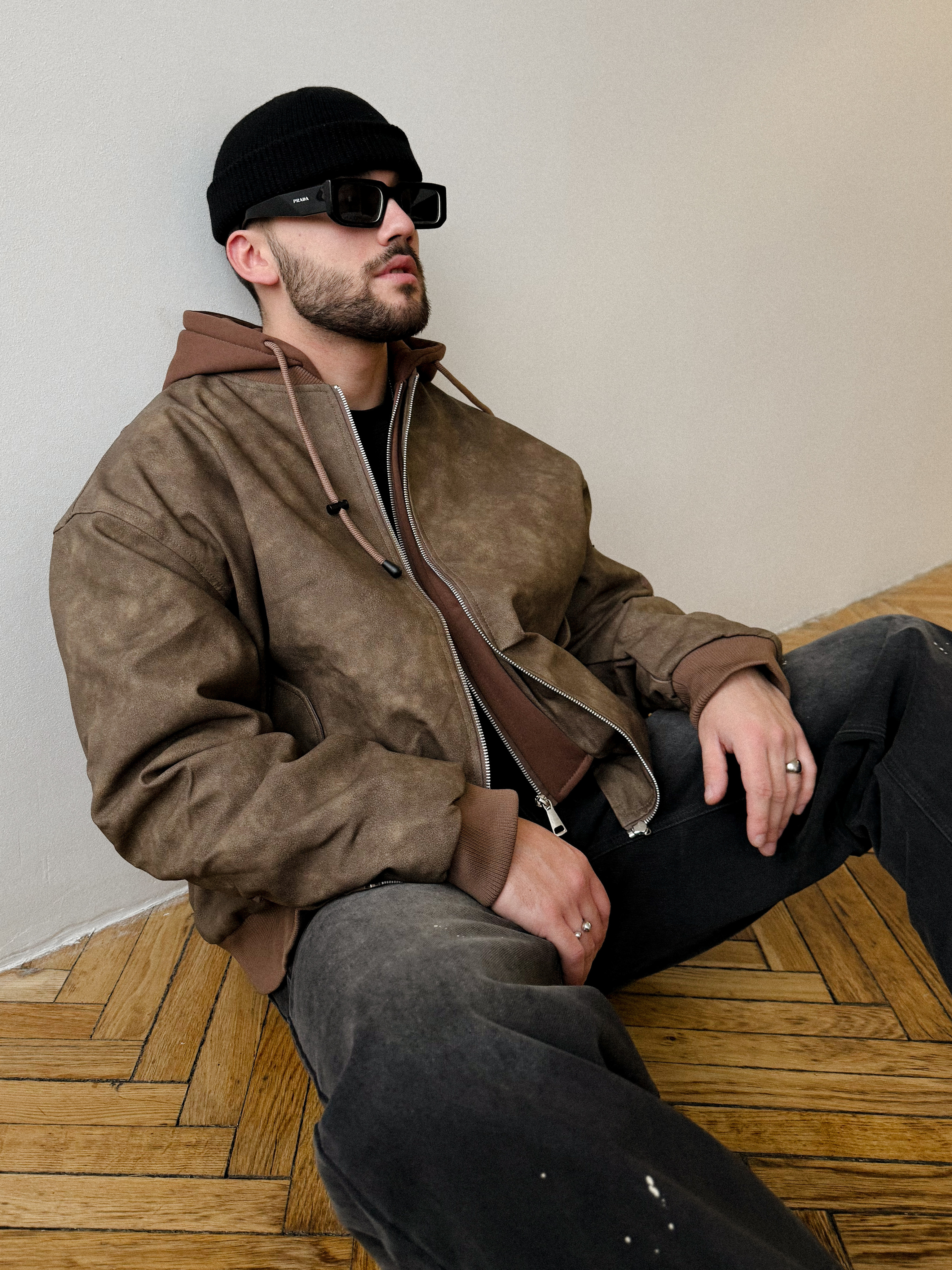 Мужская куртка-бомбер коричневого цвета, утепленная синтепоном. Укороченная модель с имитацией худи для создания стильного зимнего образа.