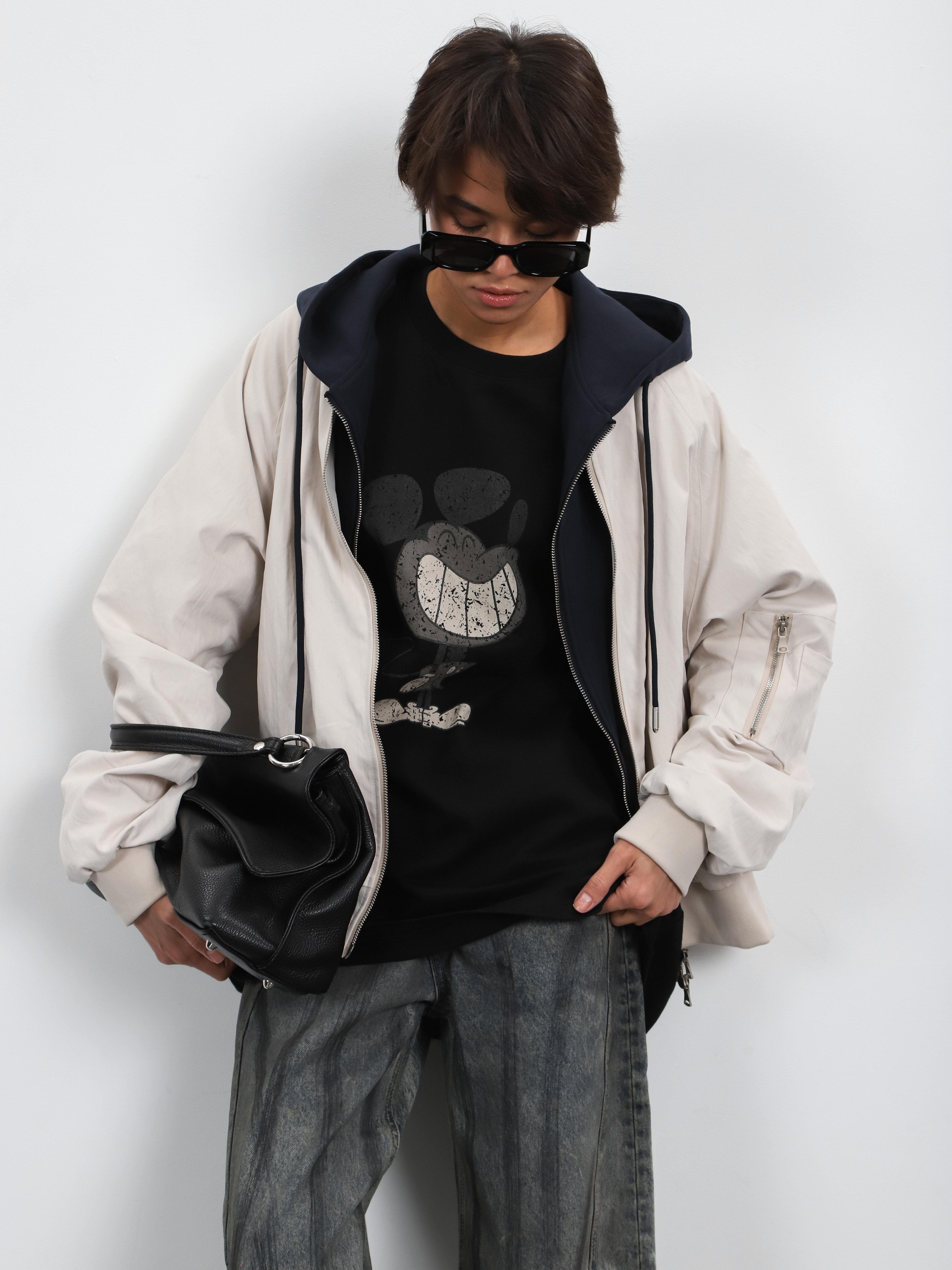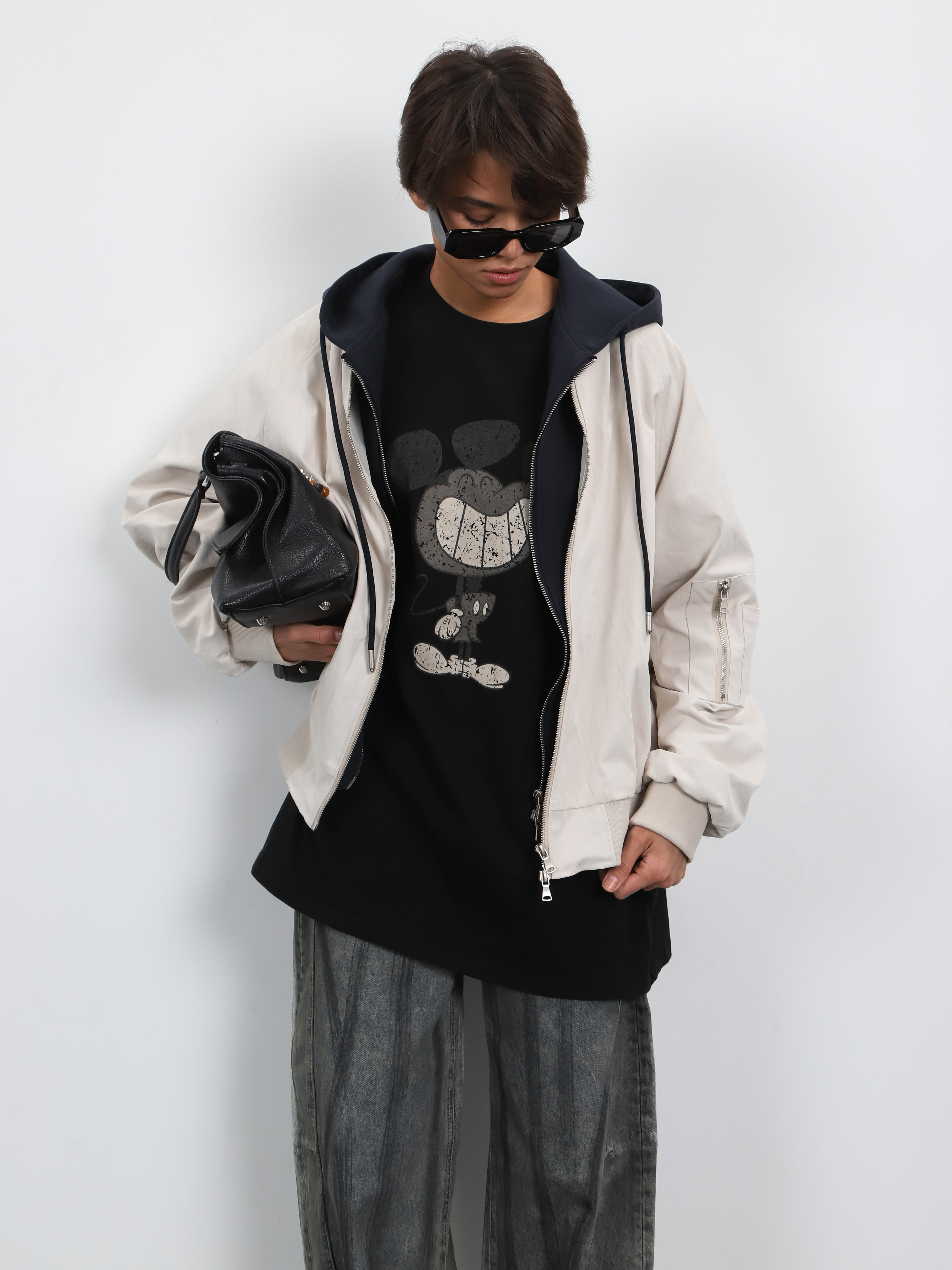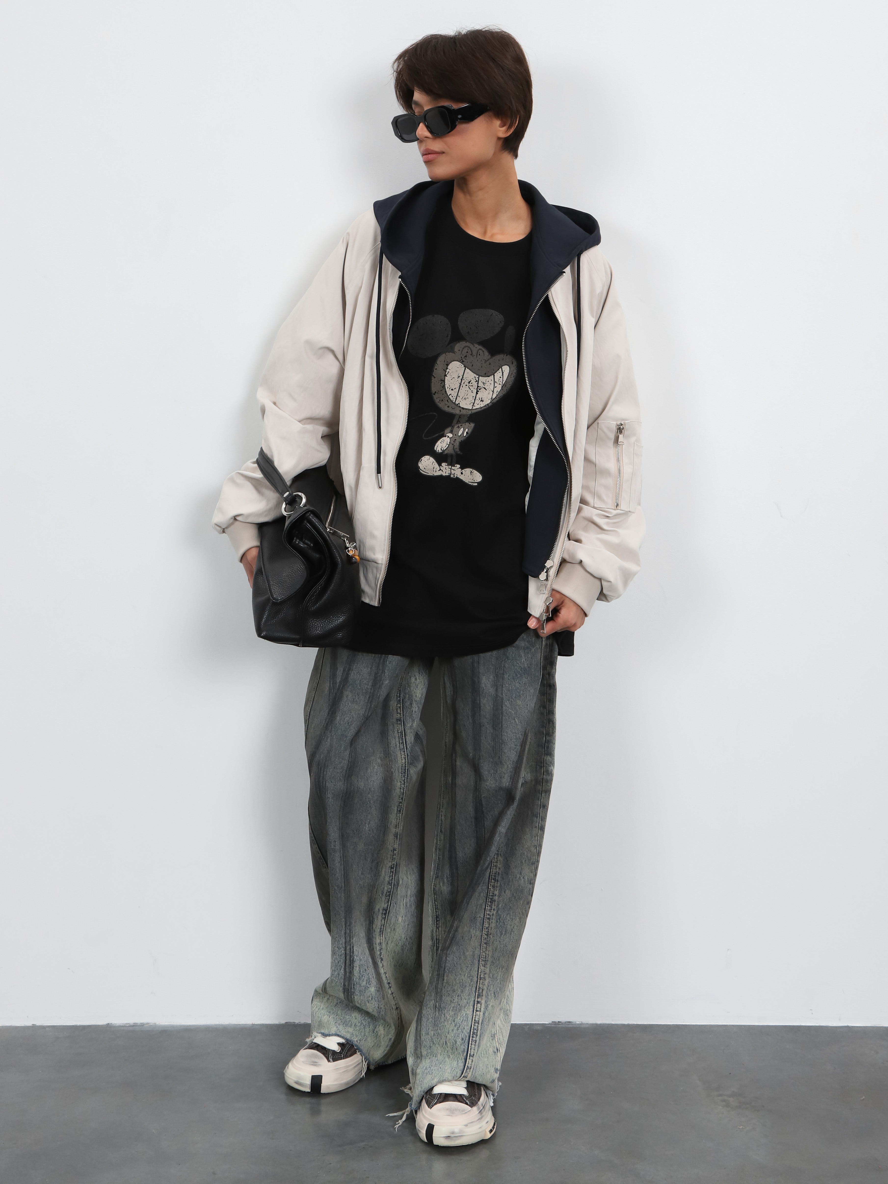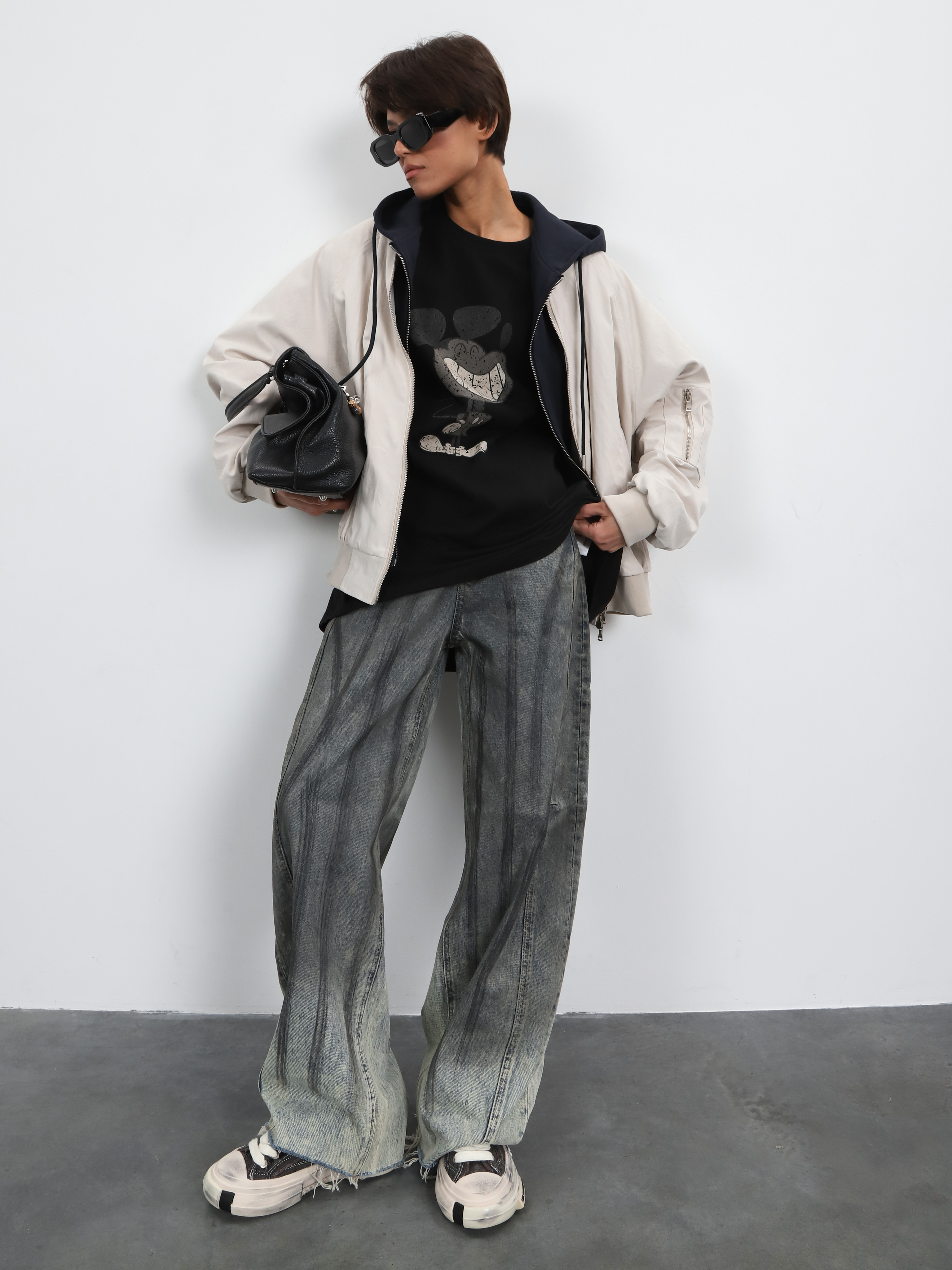 Стильный бежевый бомбер универсального размера. Внутри - имитация худи c капюшоном контрастного темного цвета.