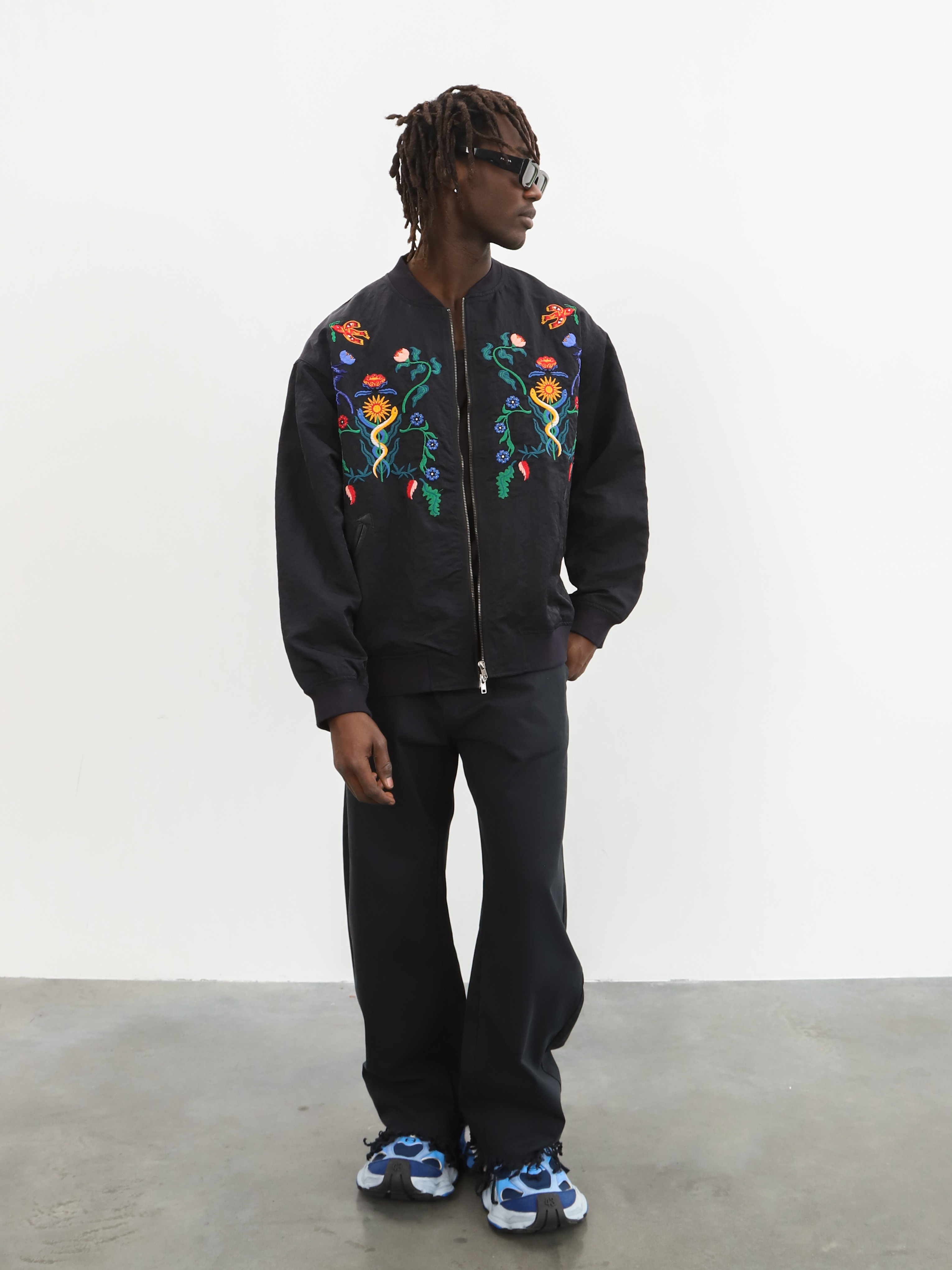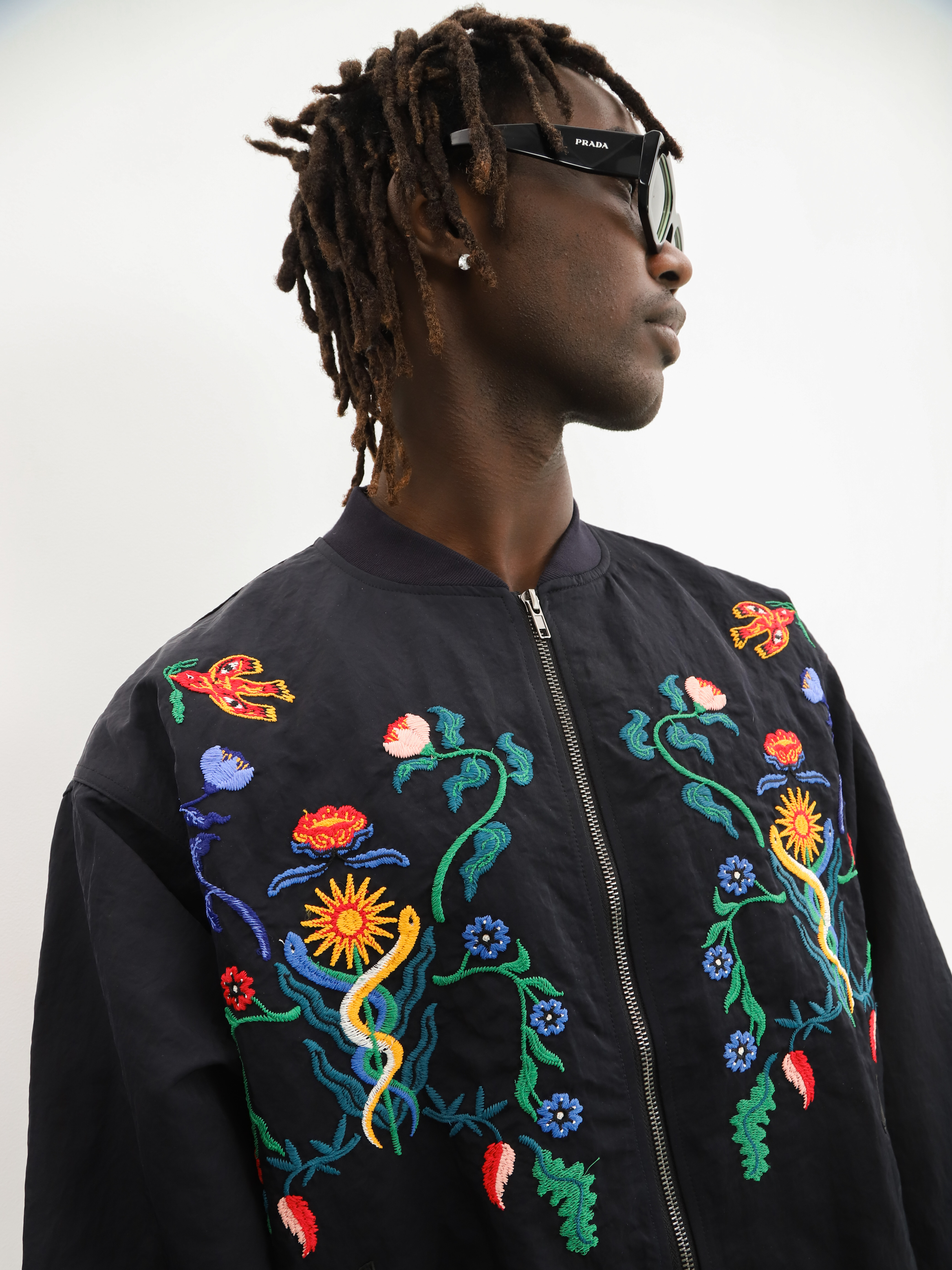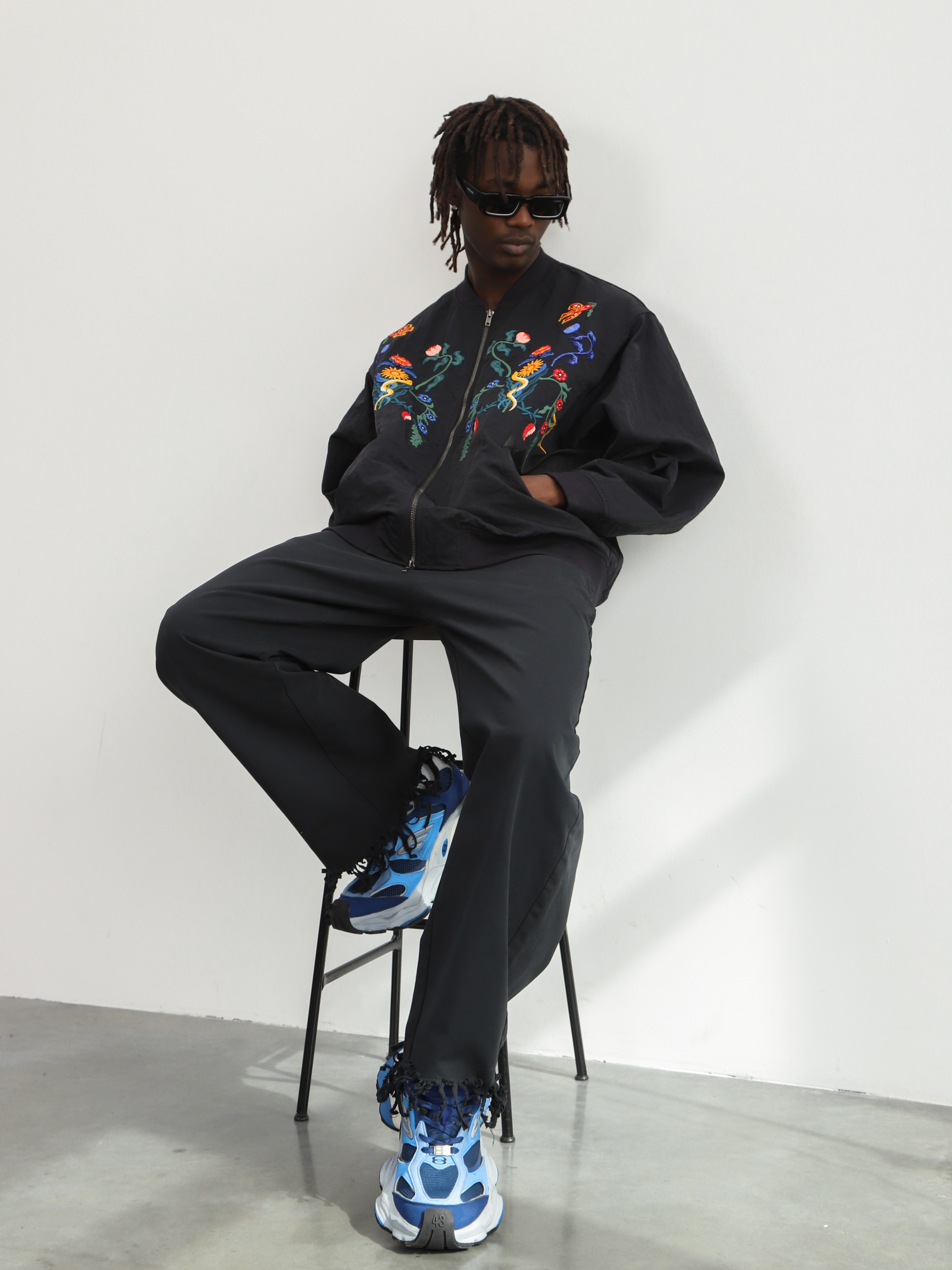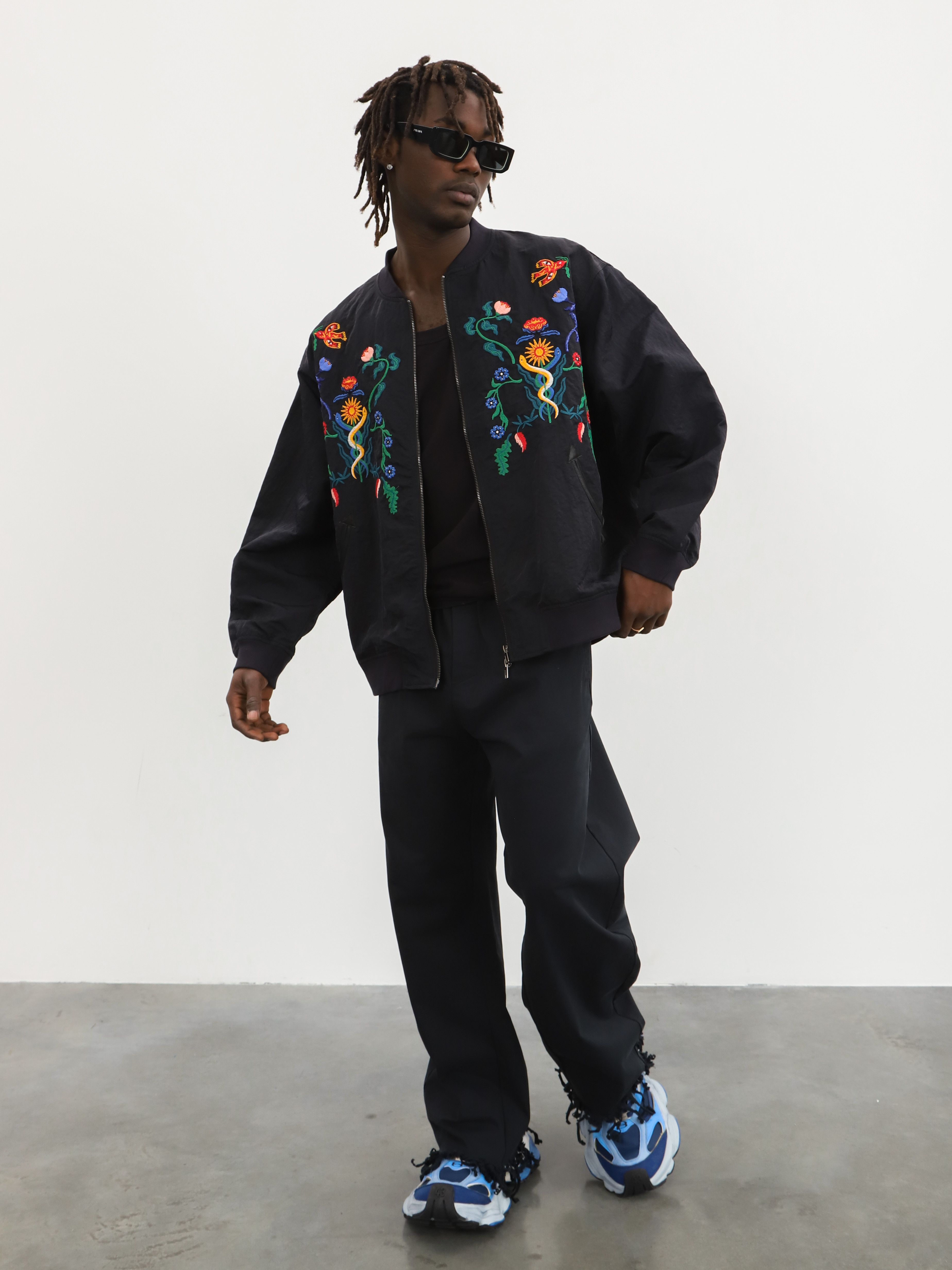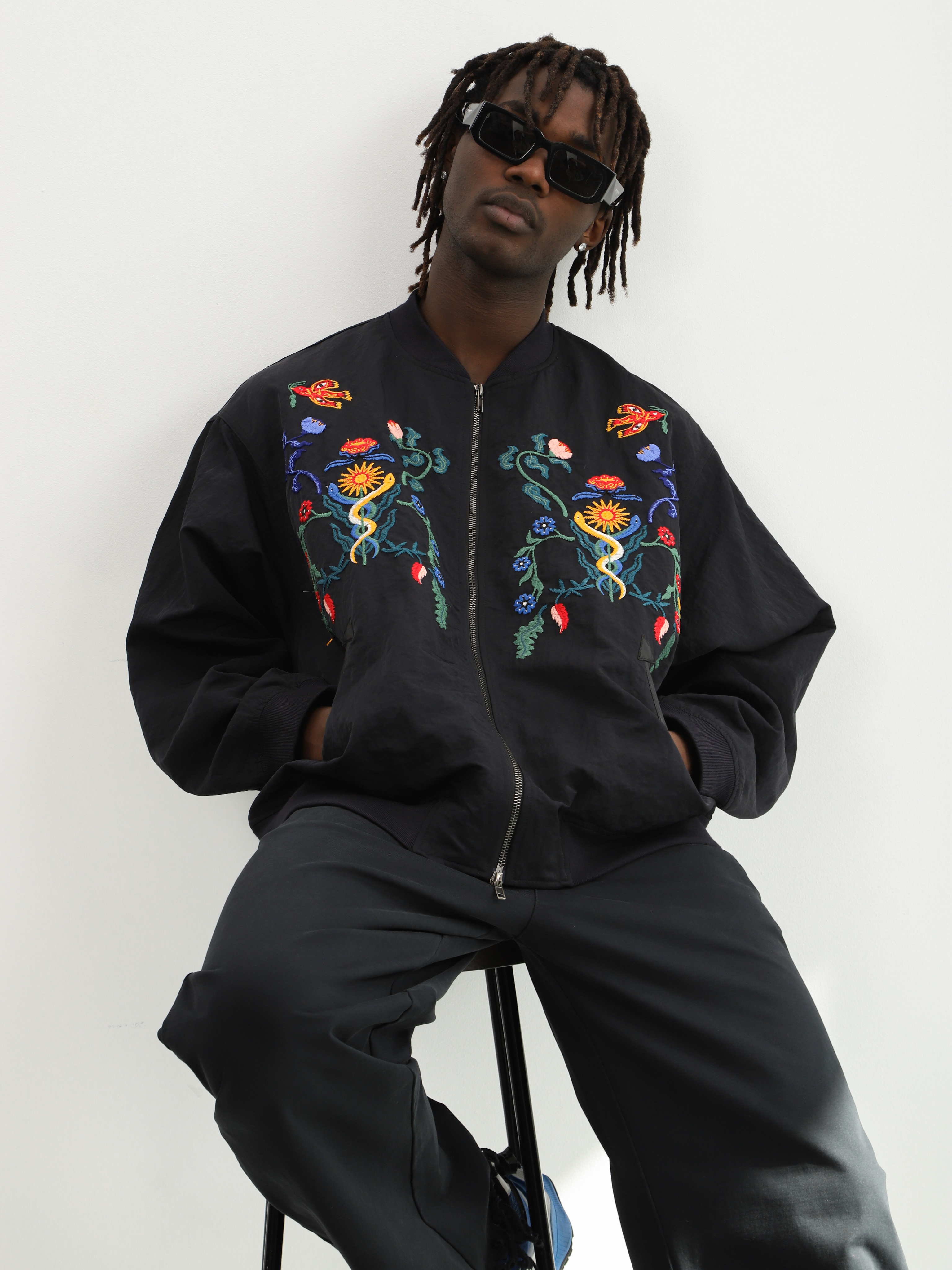 Мужской бомбер черного цвета на молнии. Стильная модель с вышивкой для ярких образов на весну и лето.