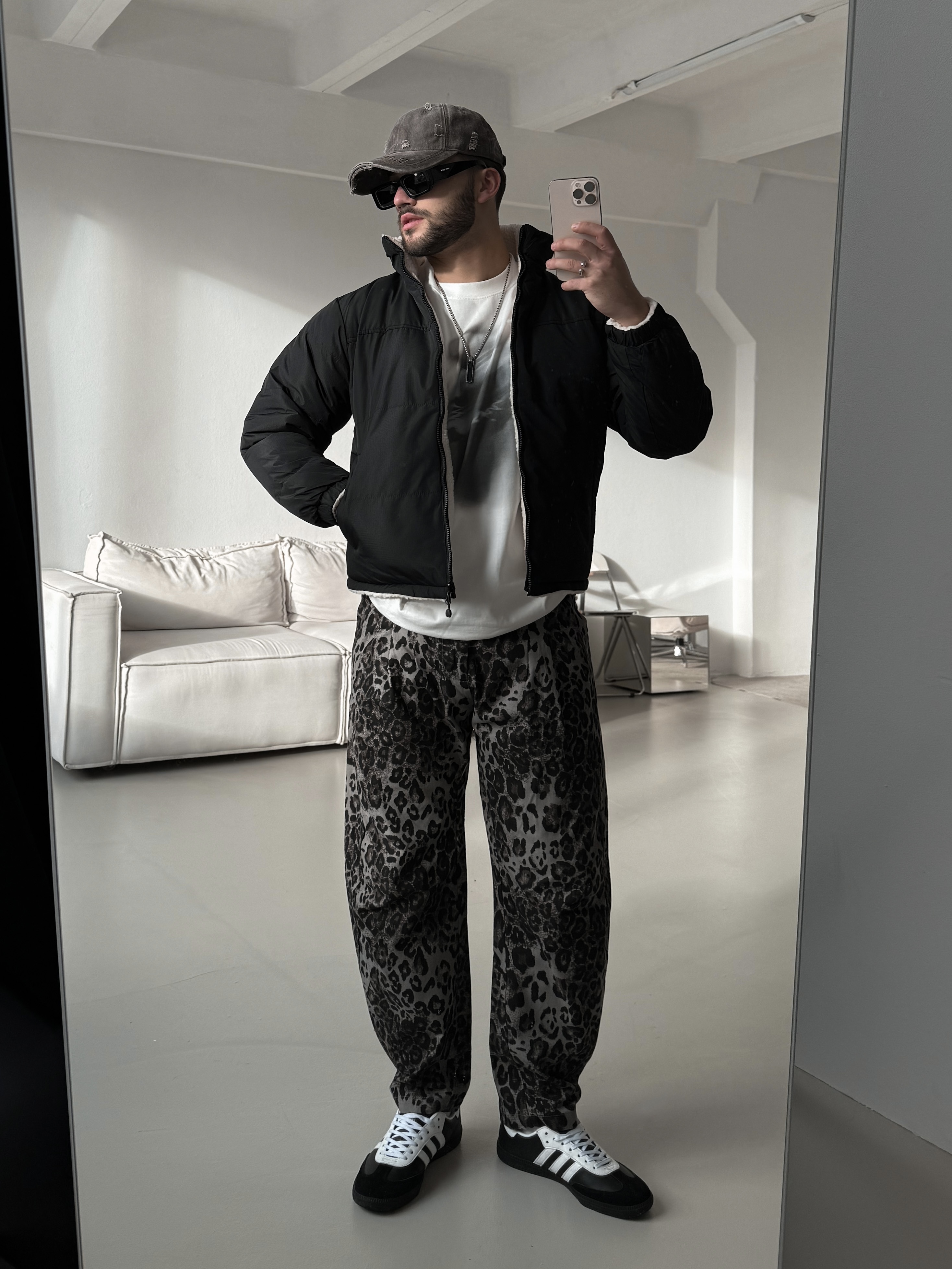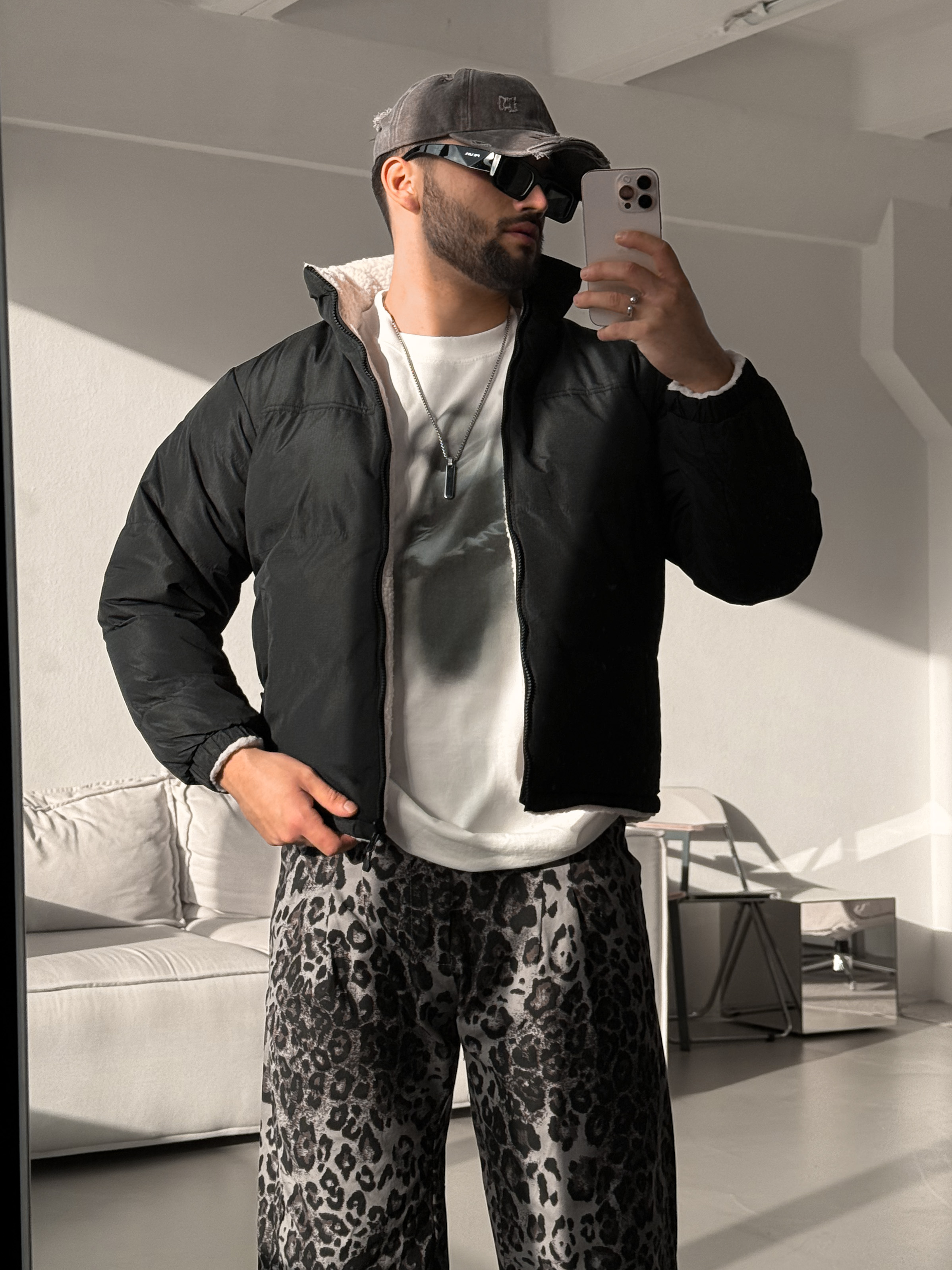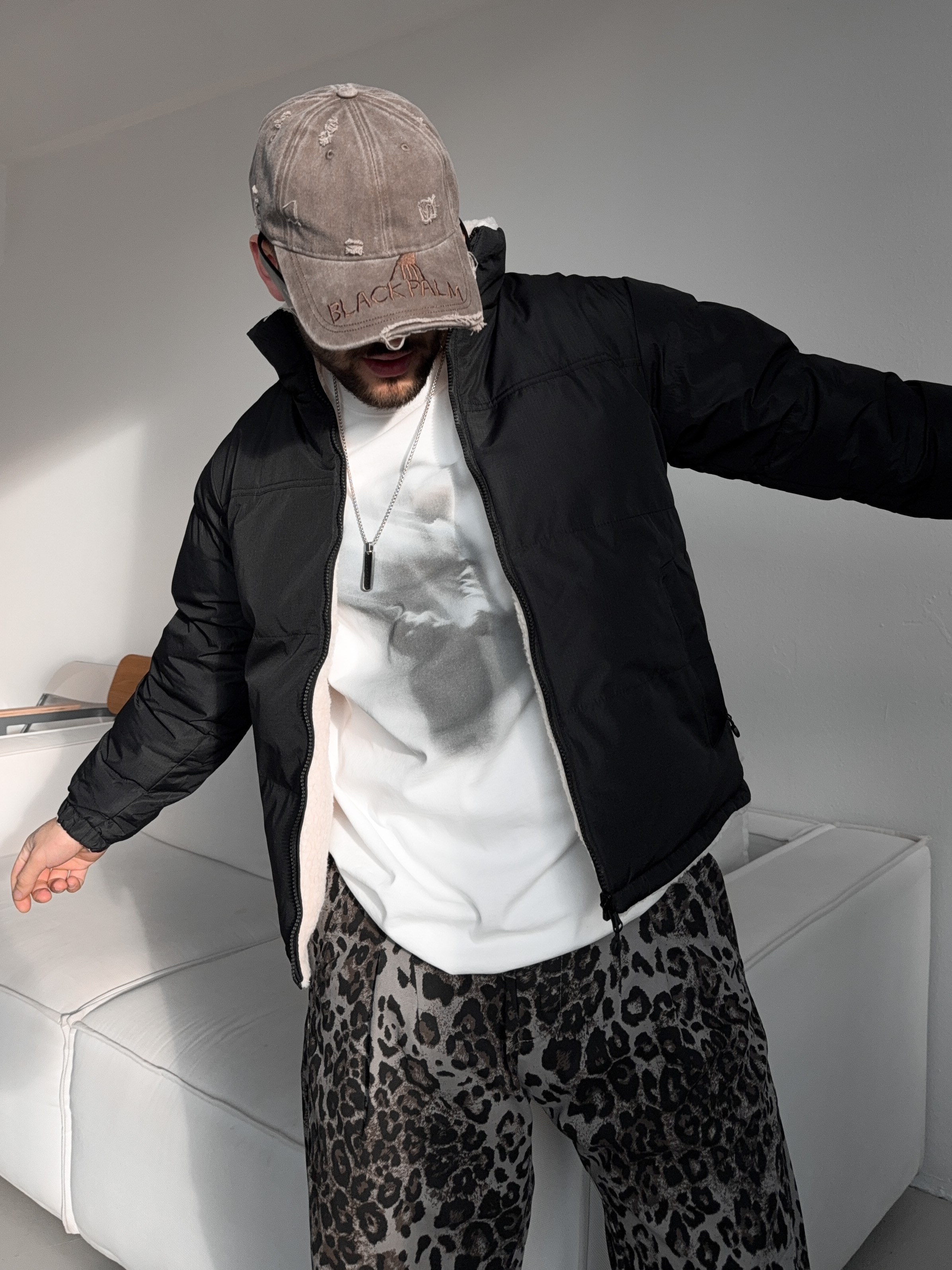 Мужская зимняя укороченная куртка с высоким воротником. Внутренняя часть выполнена из мягкого материала, который напоминает овчину. Внешняя часть выполнена из непромокаемого и ветрозащитного материала.