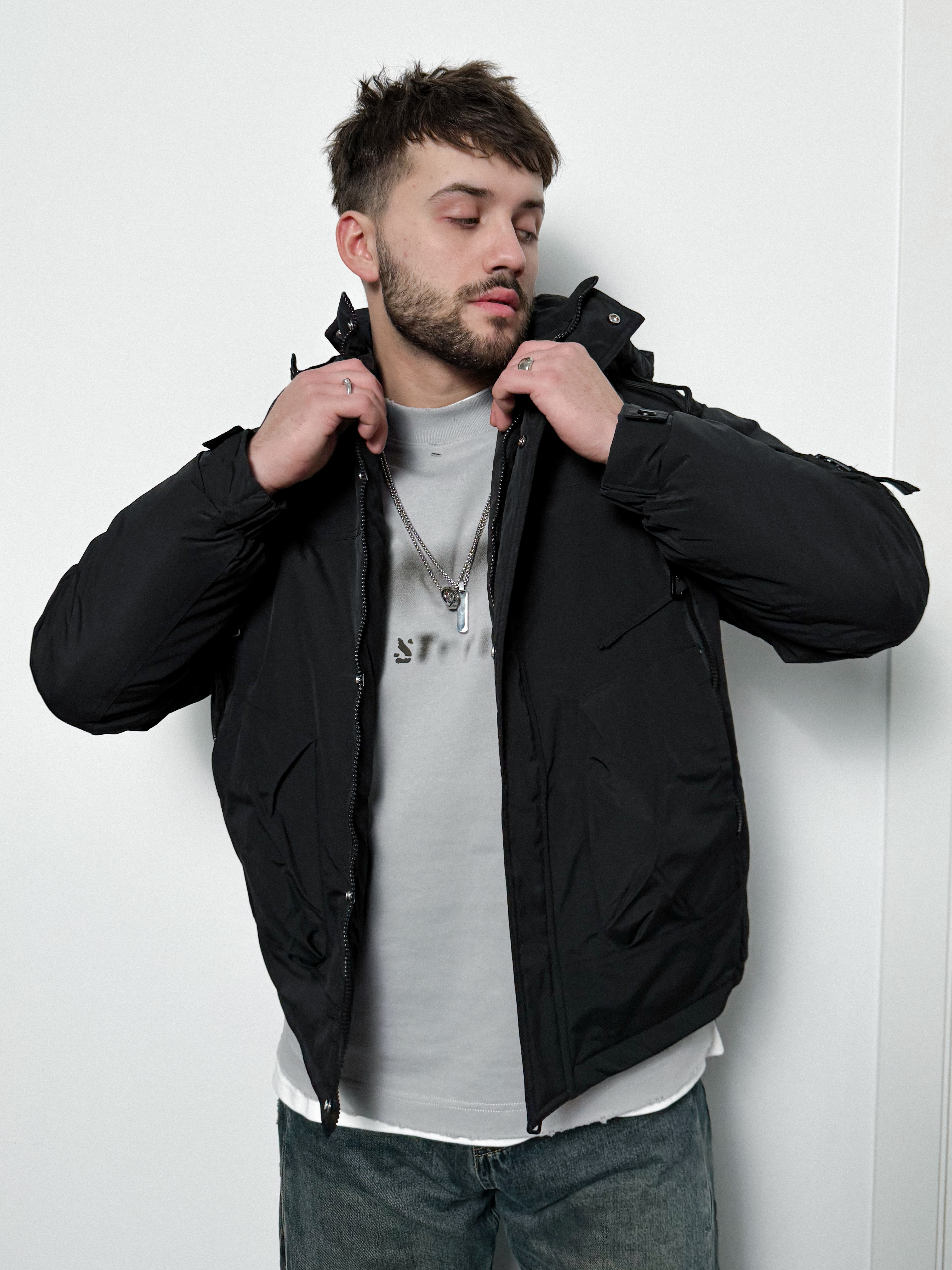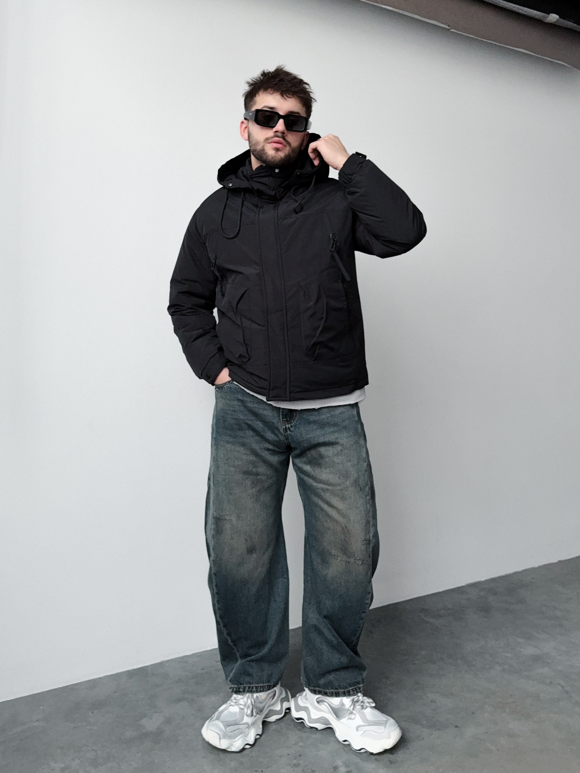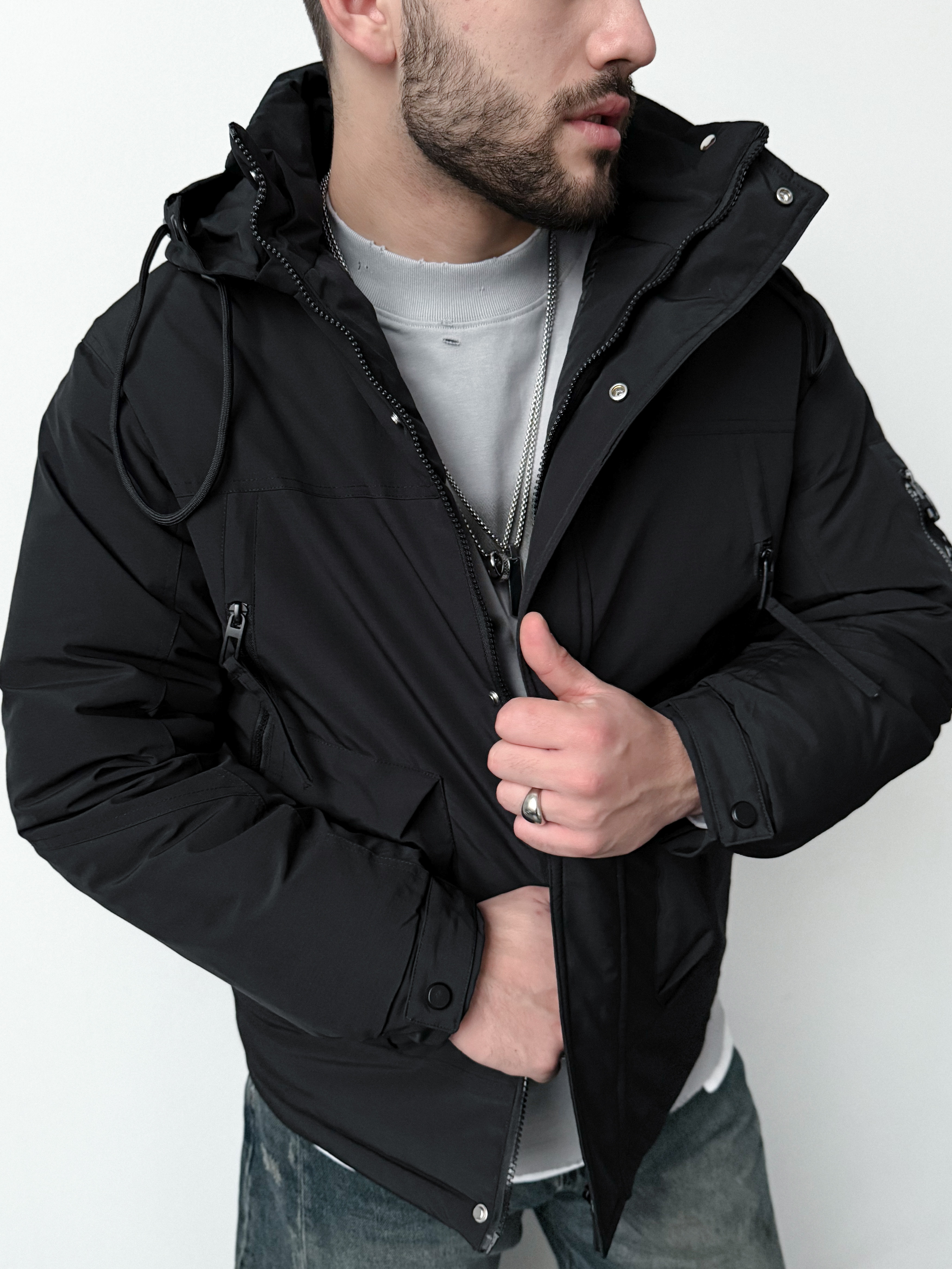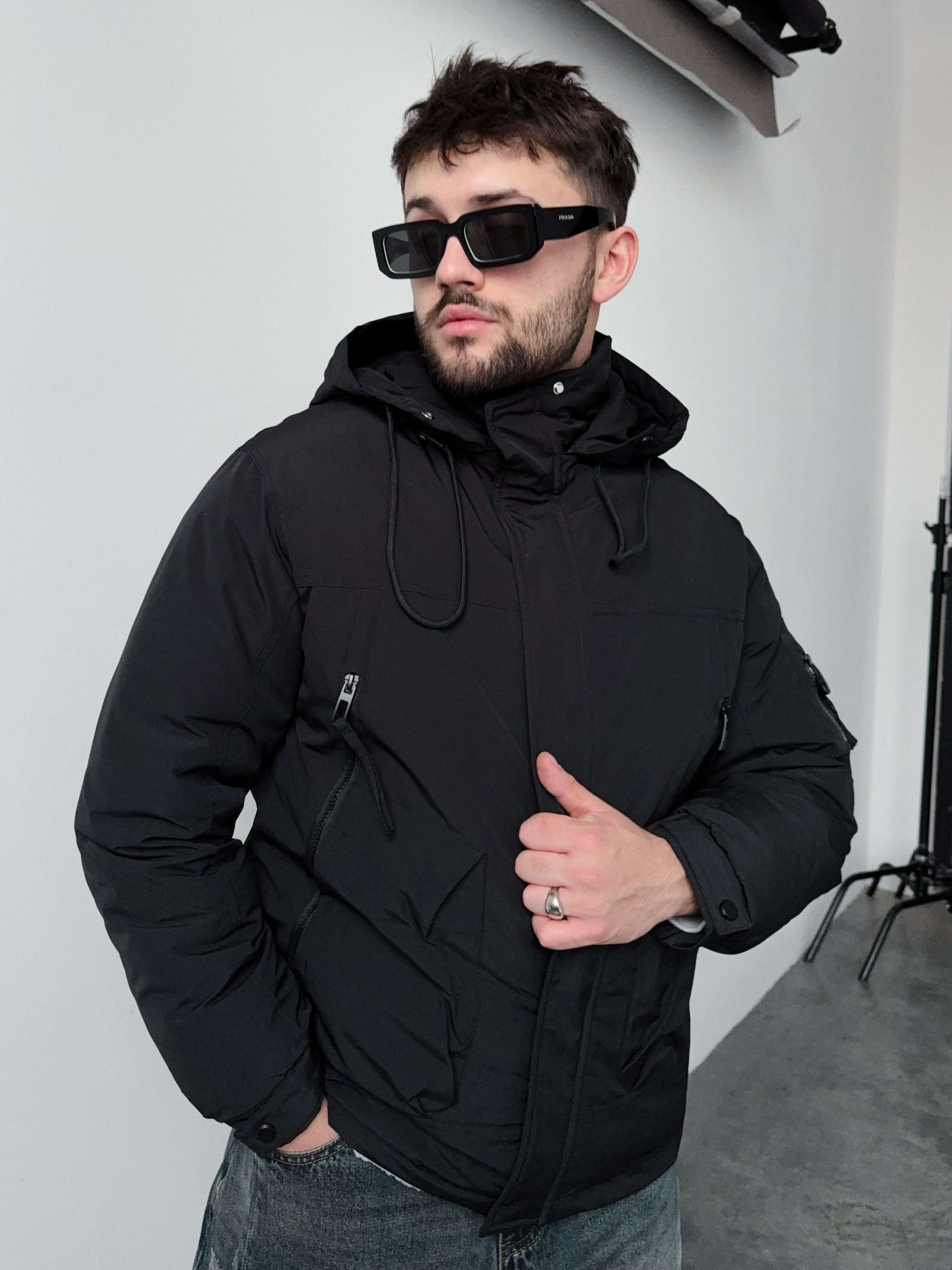 Укороченная мужская куртка с капюшоном. Утепленная черная куртка.