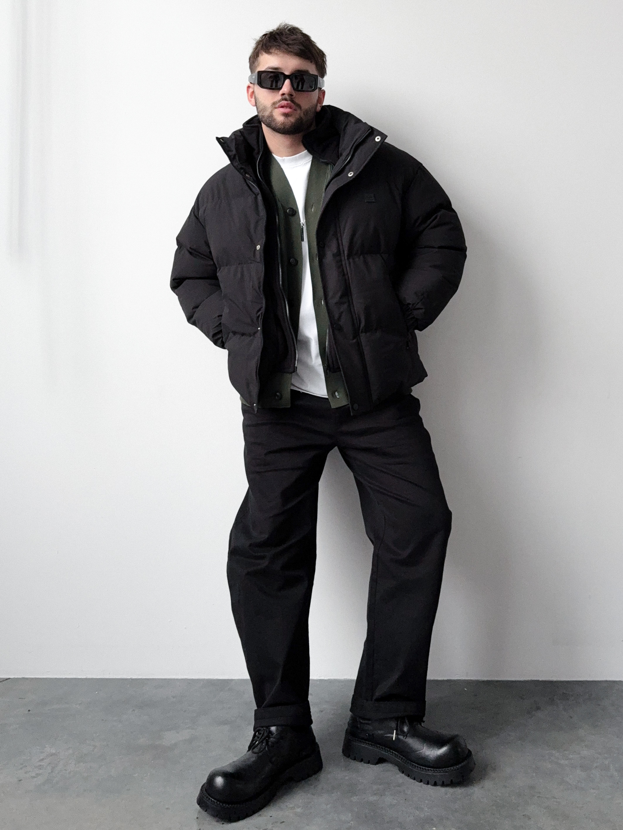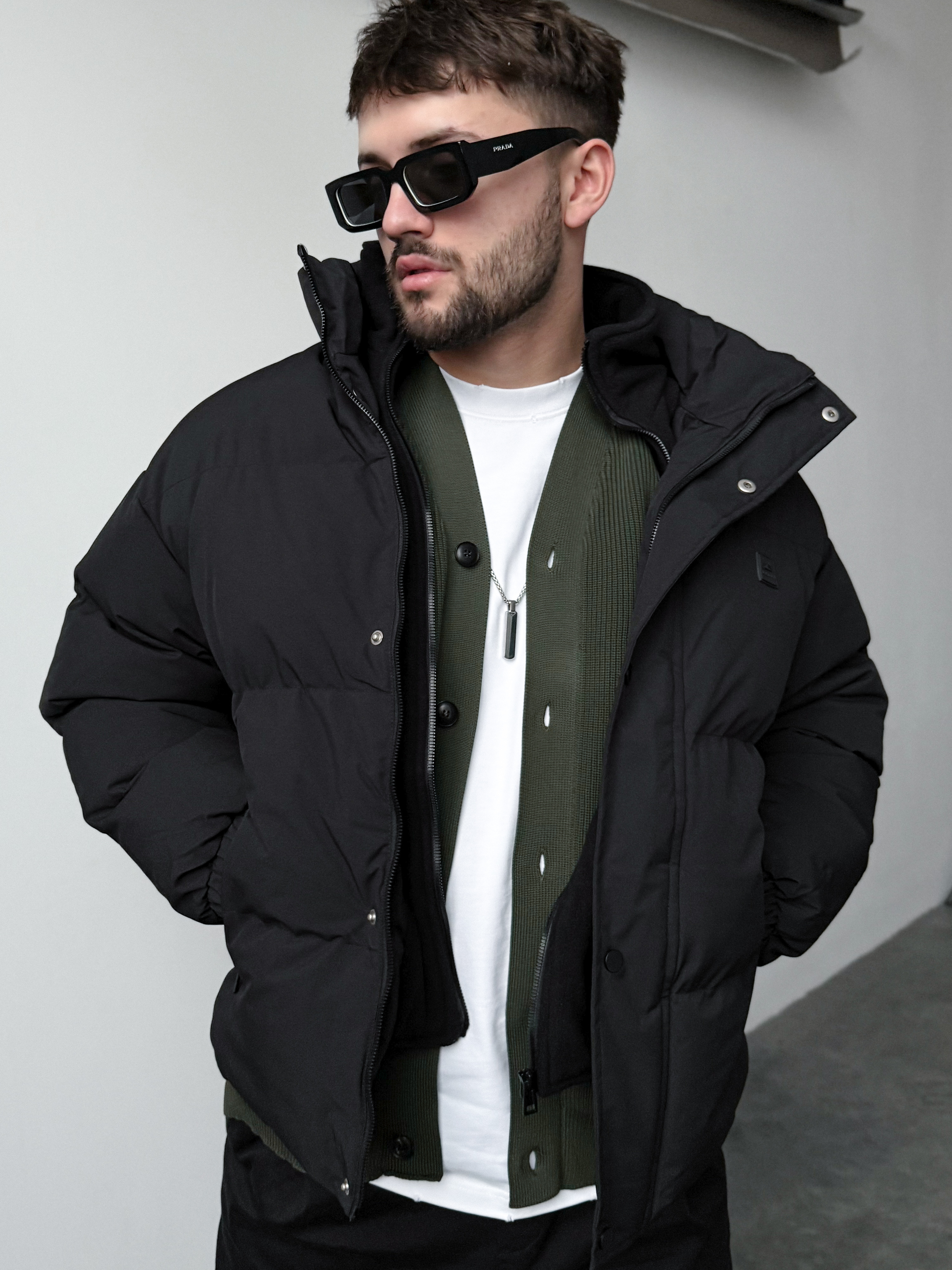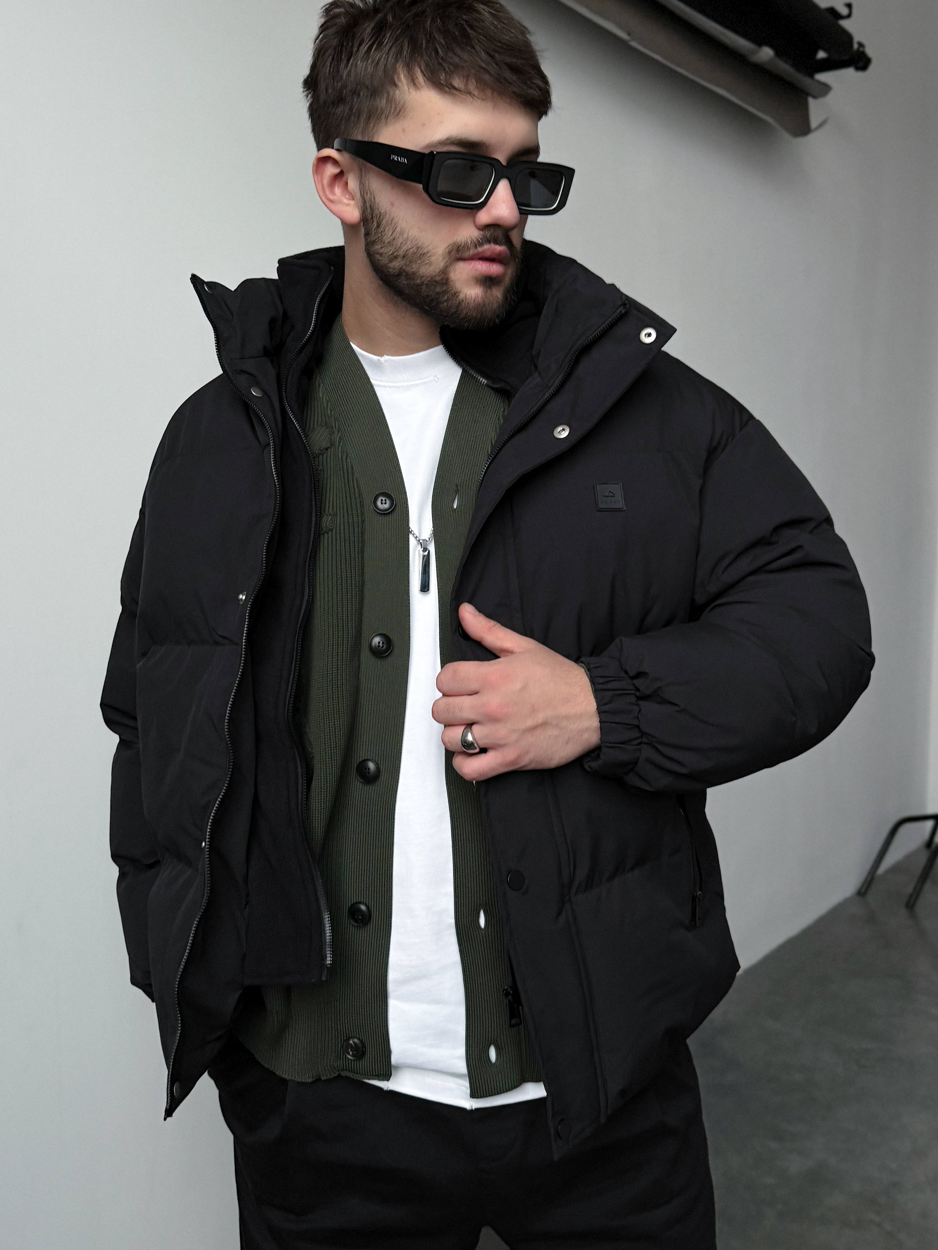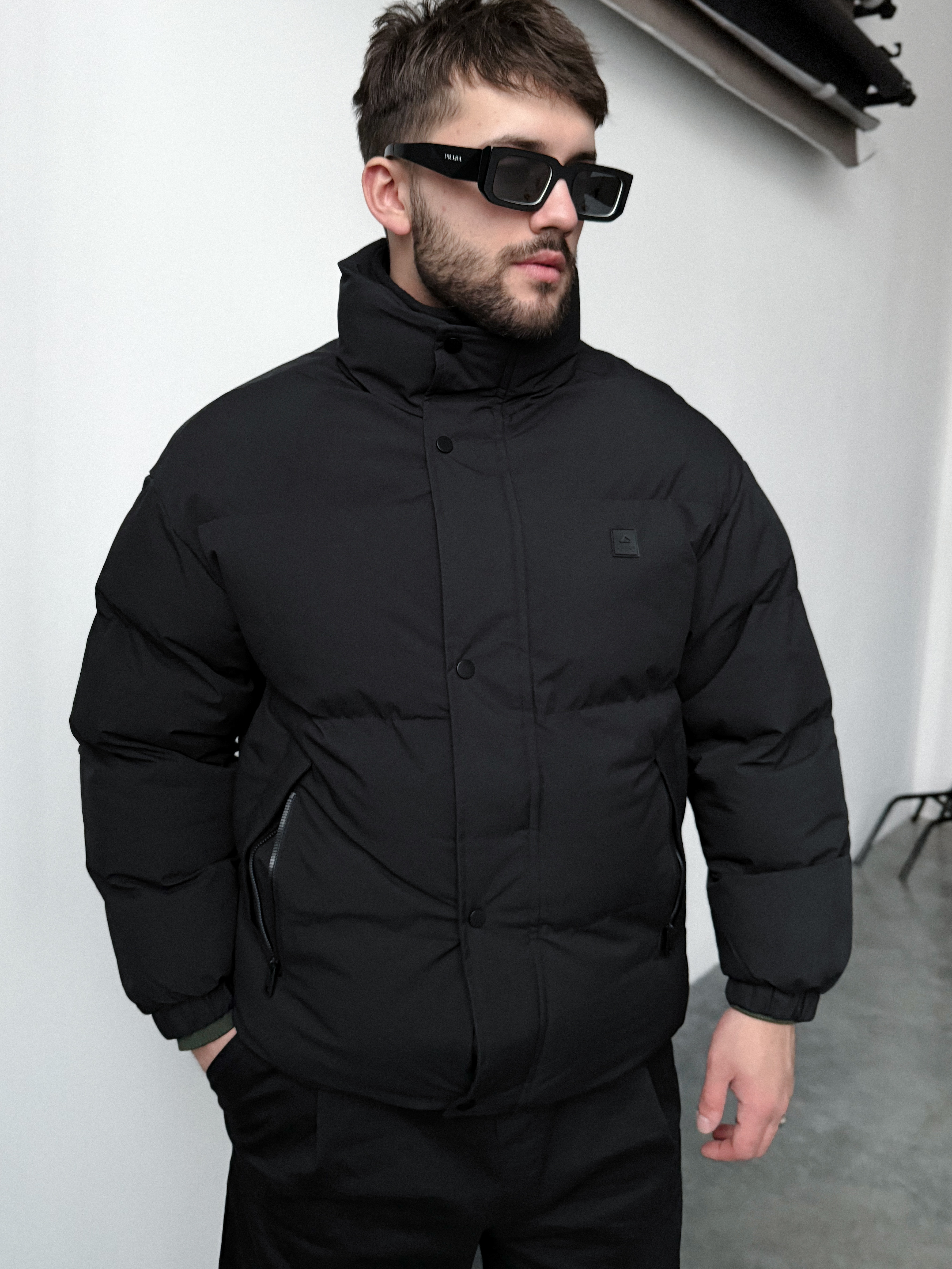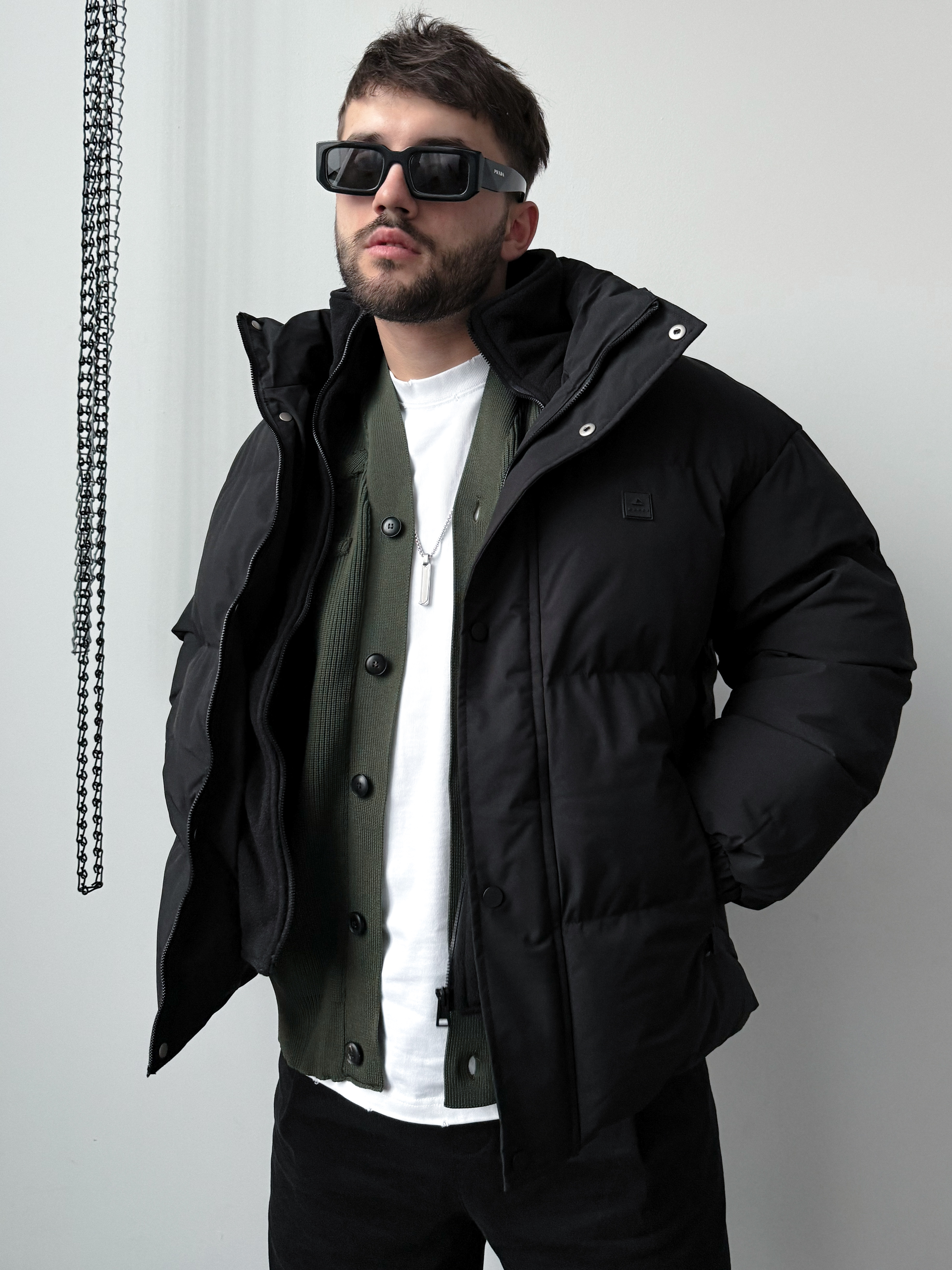 Черная мужская куртка с высоким воротником, утепленная шерстью и синтепоном. Укороченная модель с имитацией худи без капюшона для создания стильных зимних образов на каждый день.