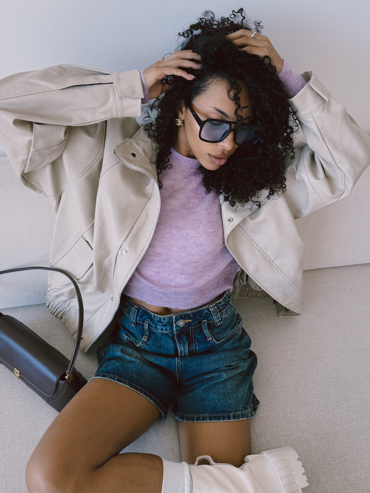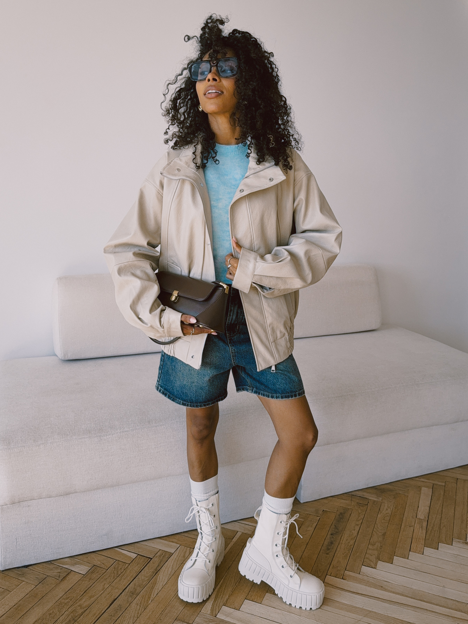 Женская бежевая куртка-бомбер из экокожи с высоким воротником-стойкой. Укороченная свободная модель станет комфортным вариантом для создания стильного образа.