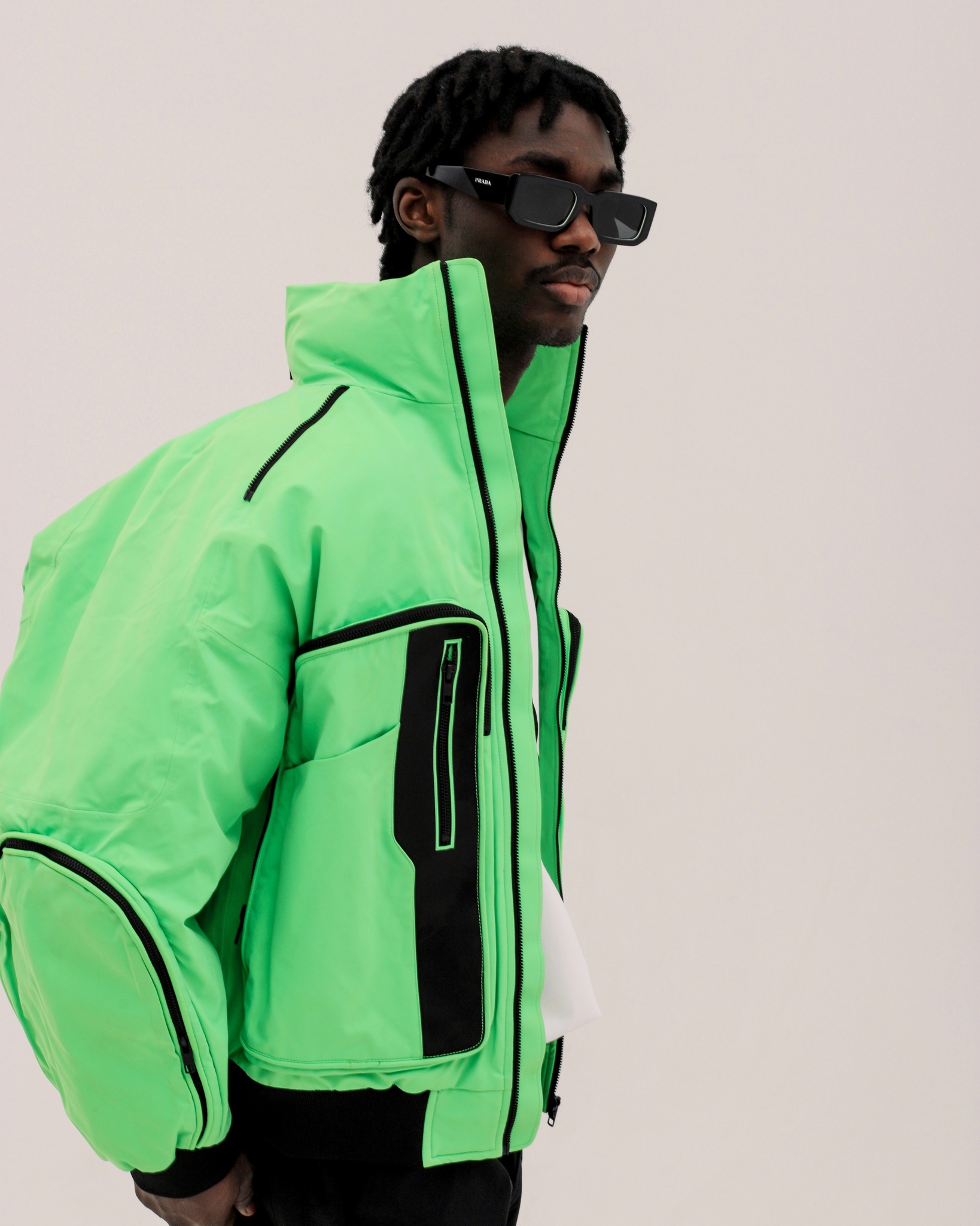 Яркий мужской пуховик с накладными карманами от NOHO. Отличный вариант для создания стильного зимнего образа.