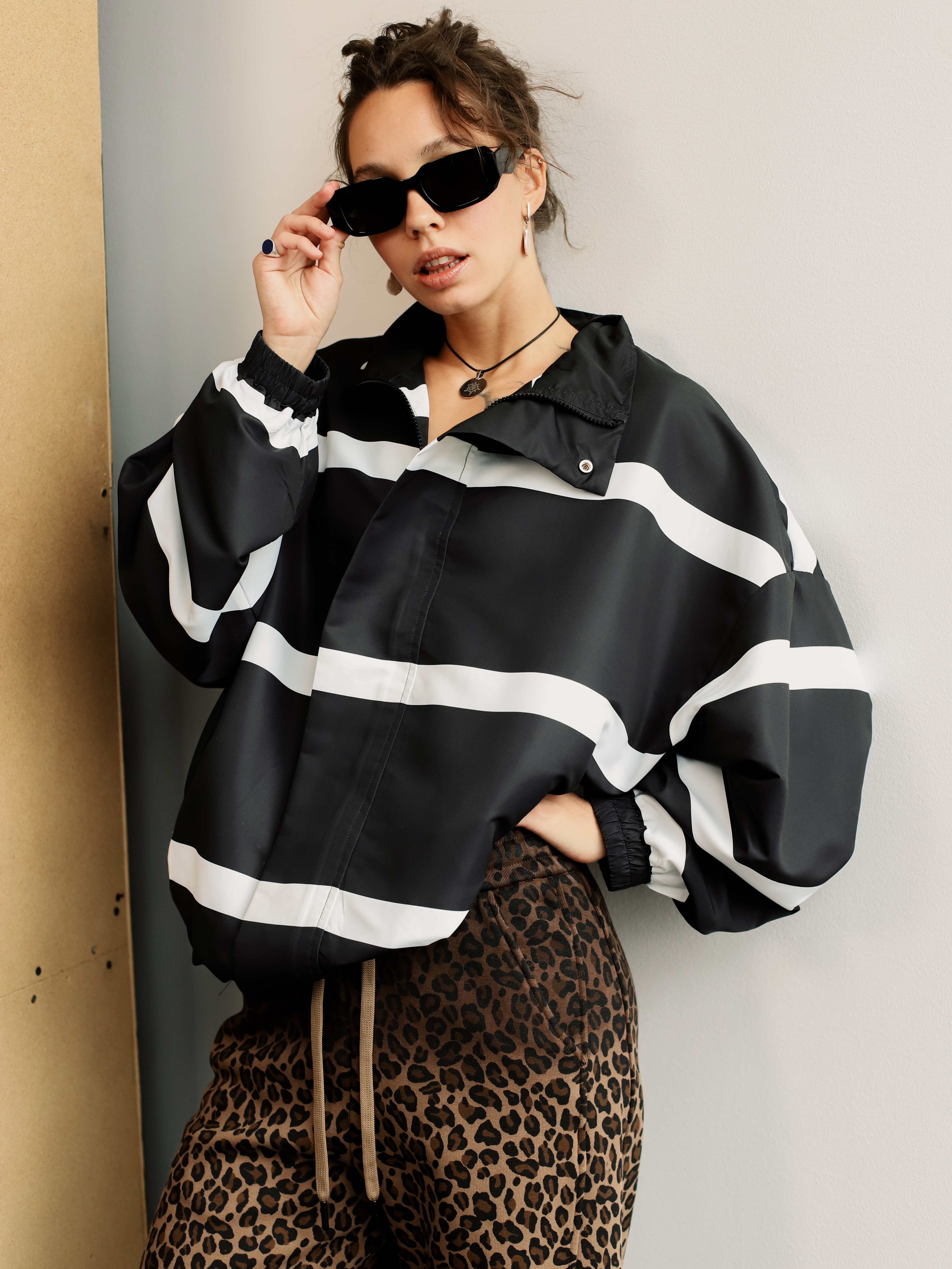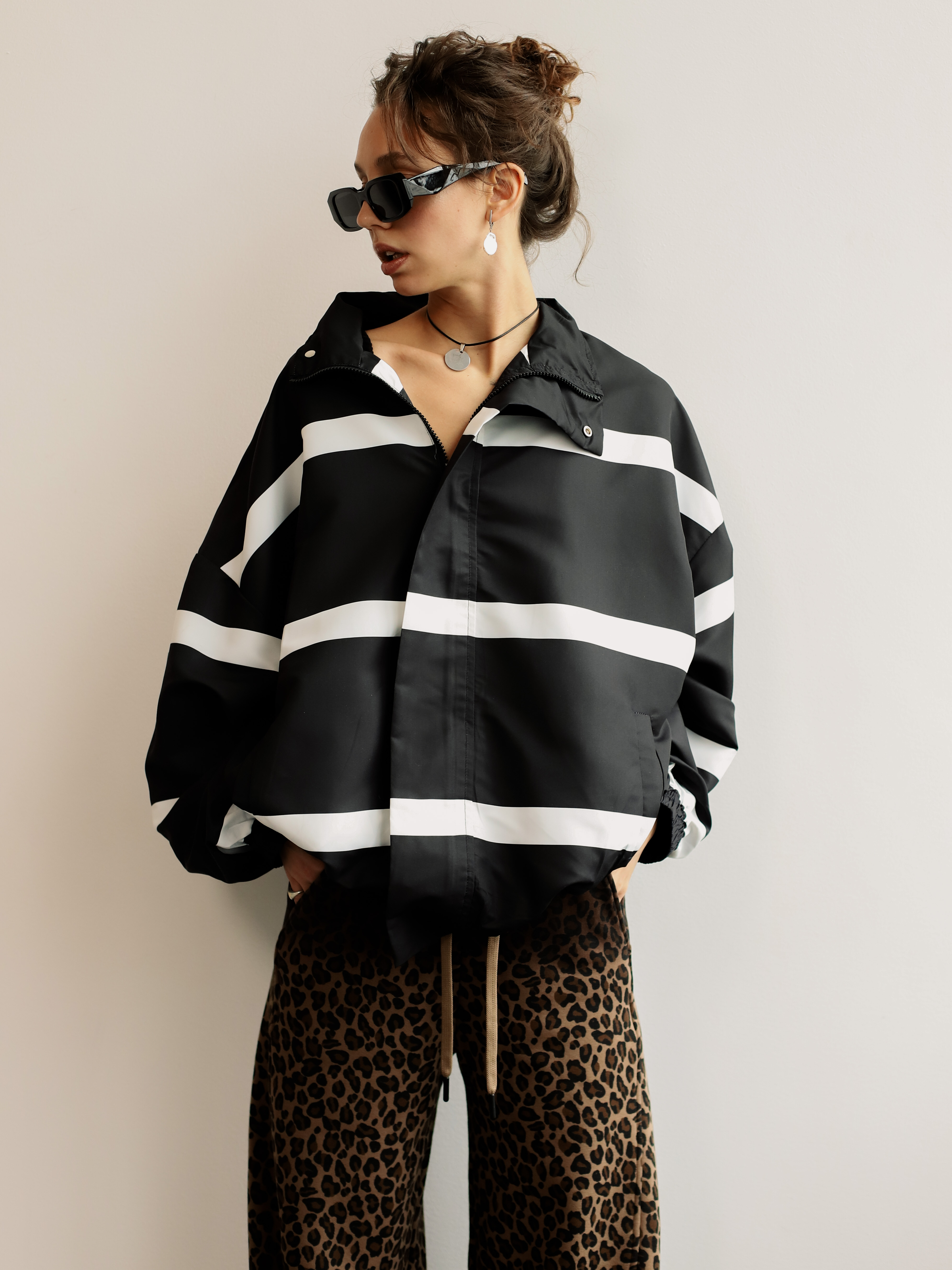 Черная ветровка в белую полоску. Свободная модель для стильных образов на каждый день.