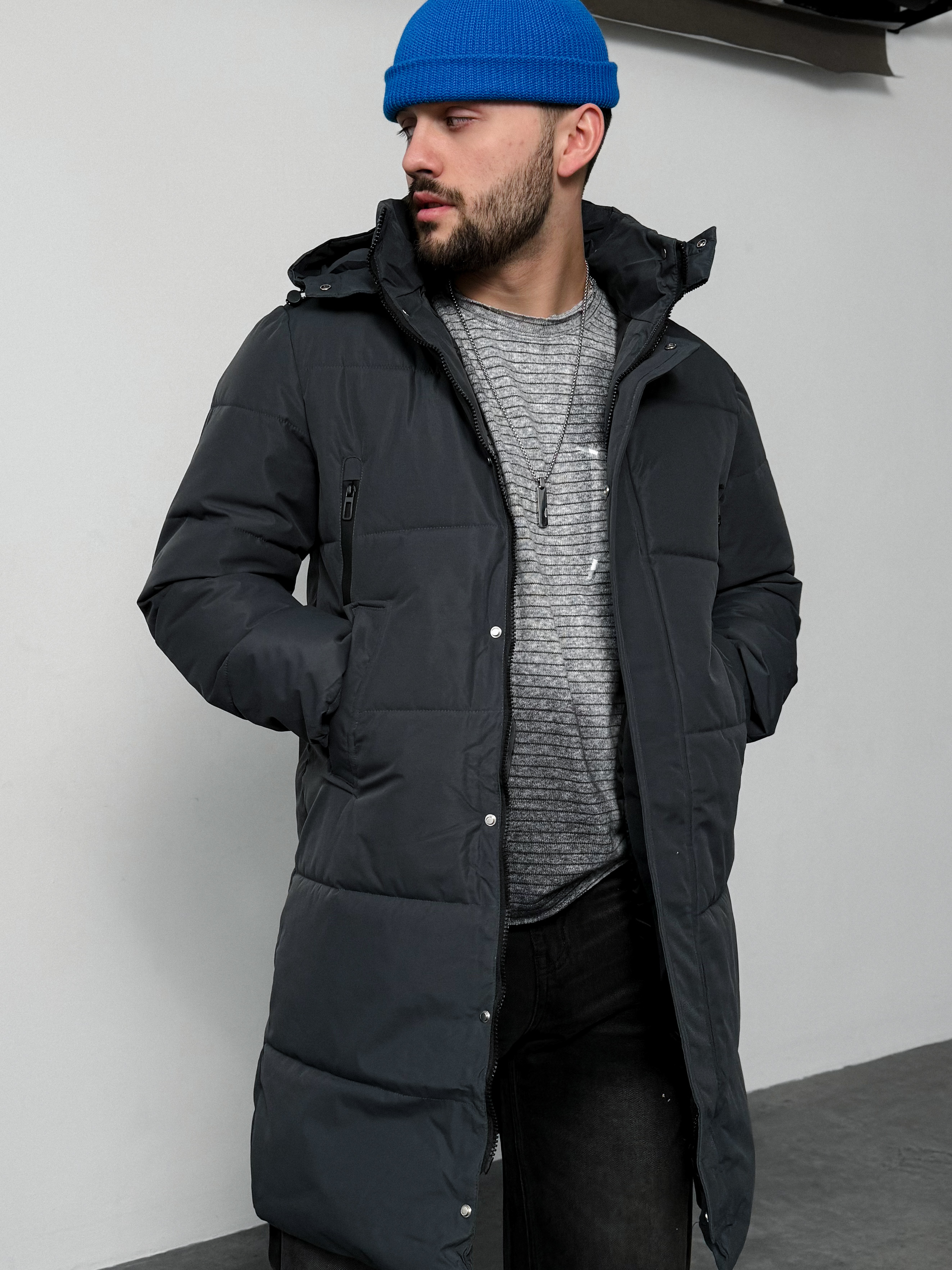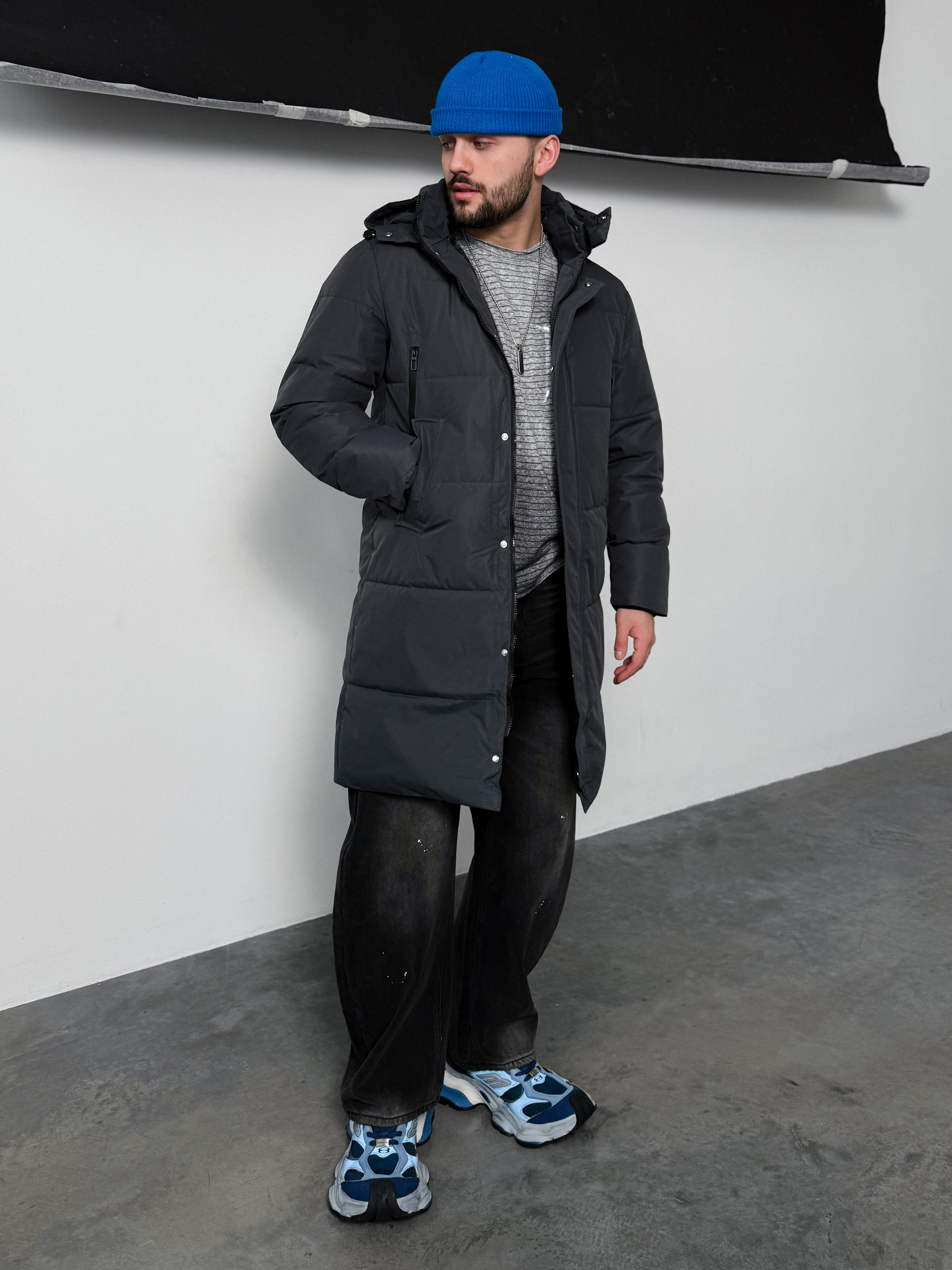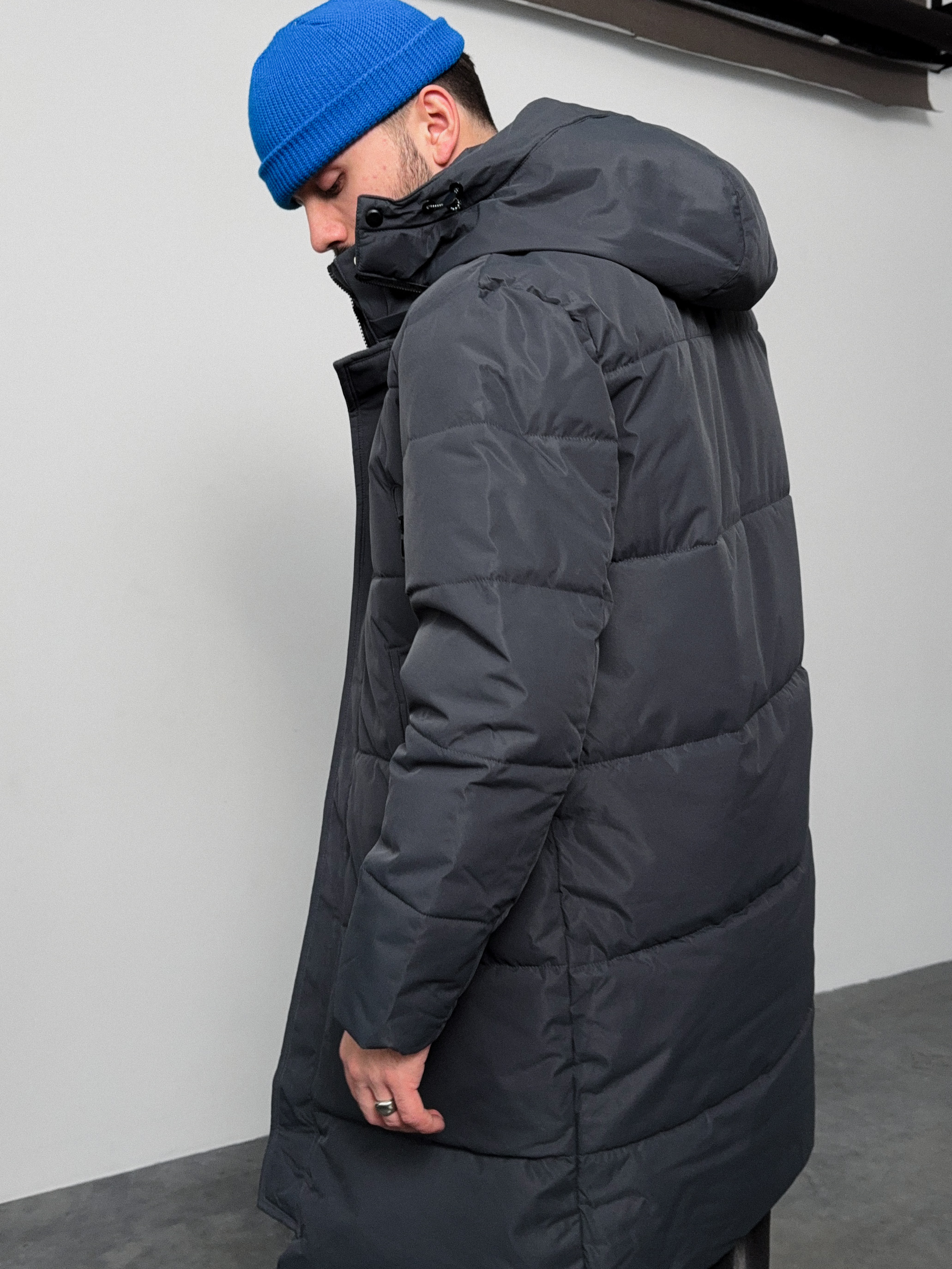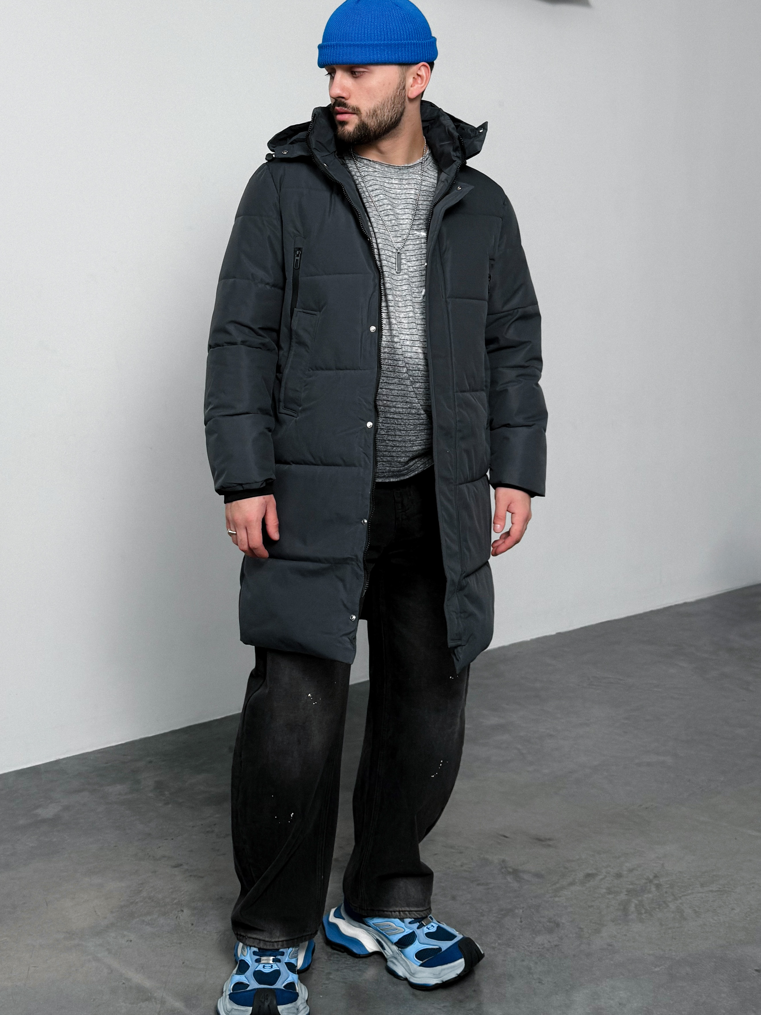 Удлиненная зимняя куртка универсального серого цвета. Теплая модель для создания стильных образов на каждый день.