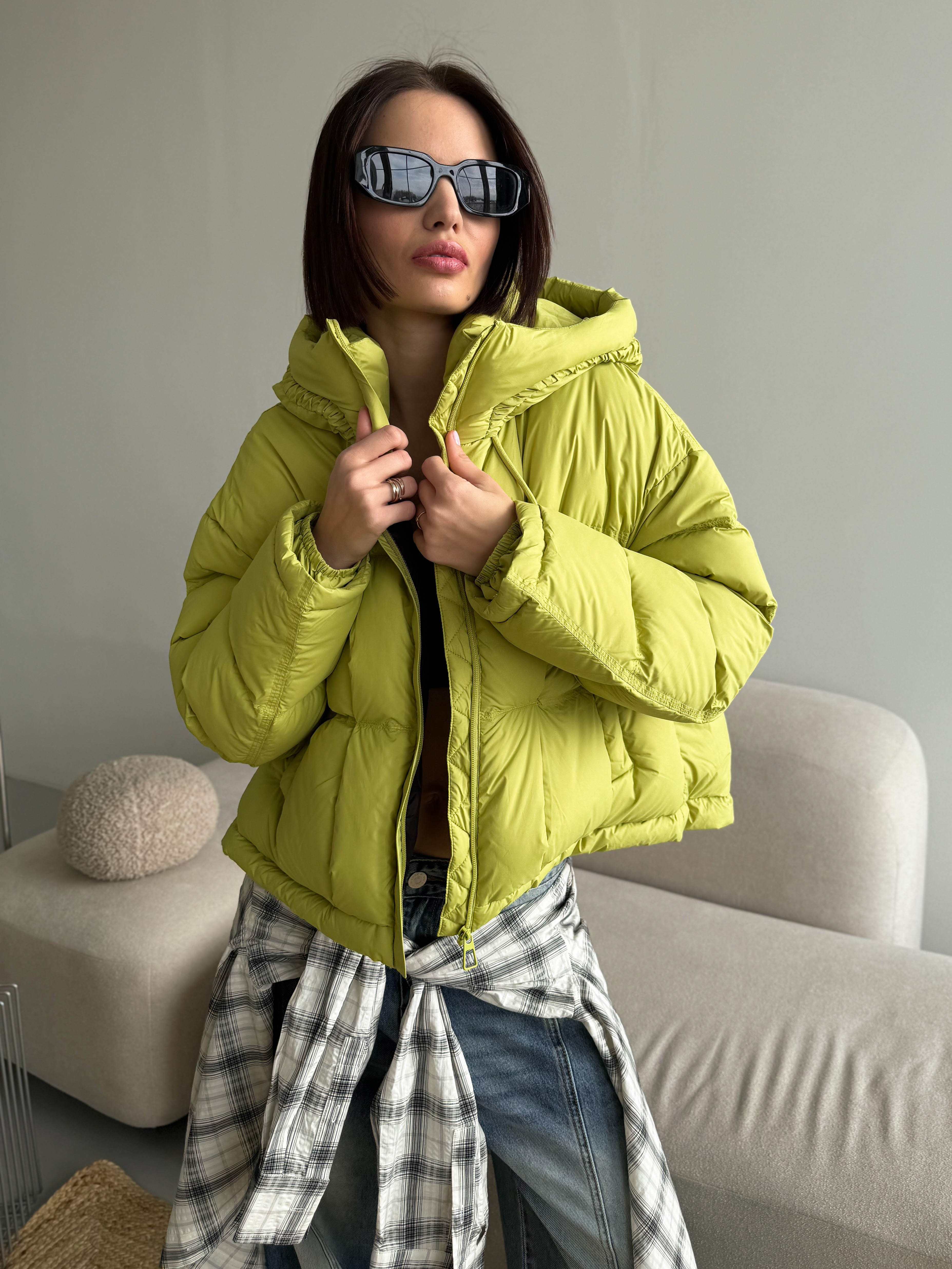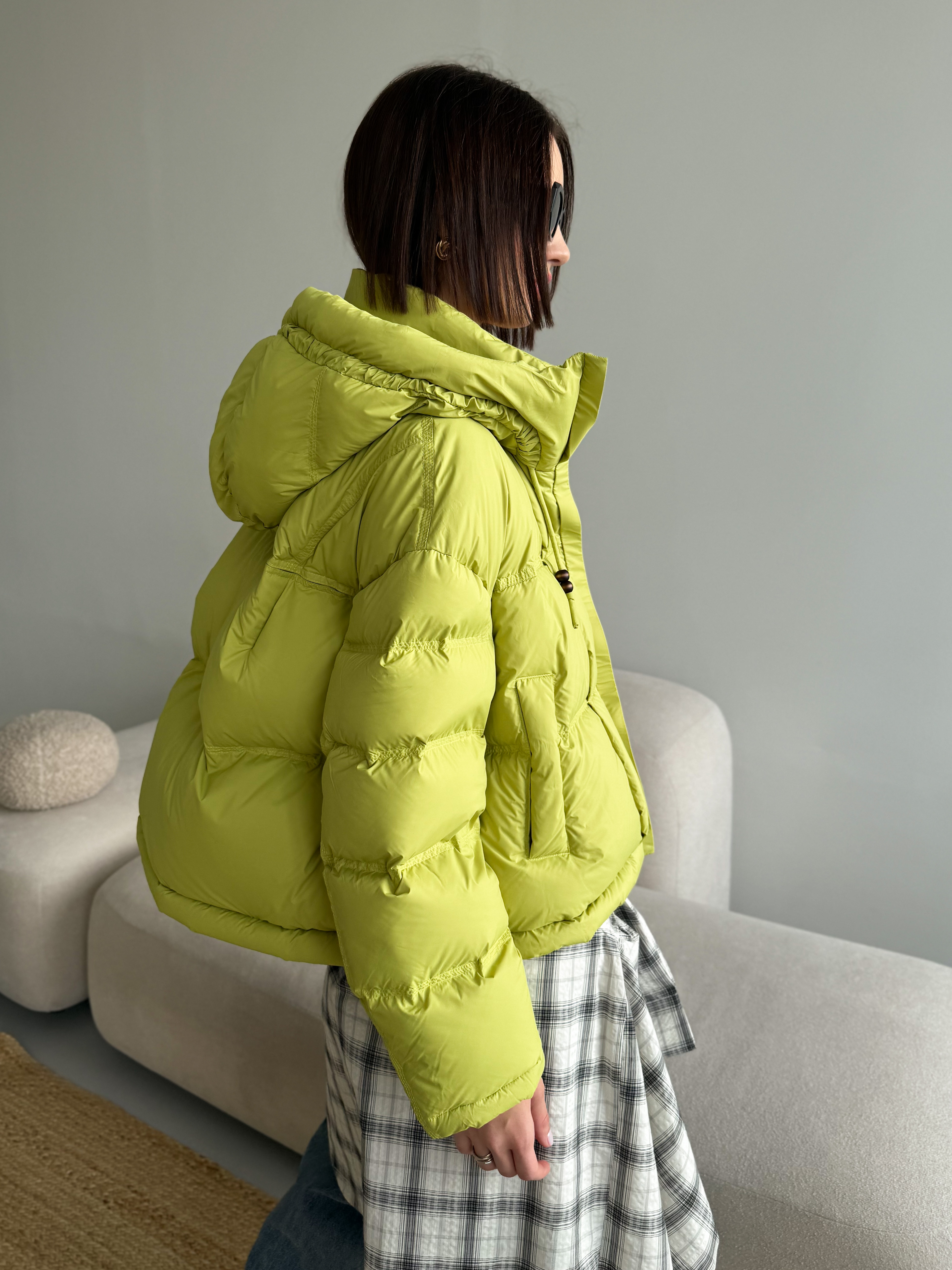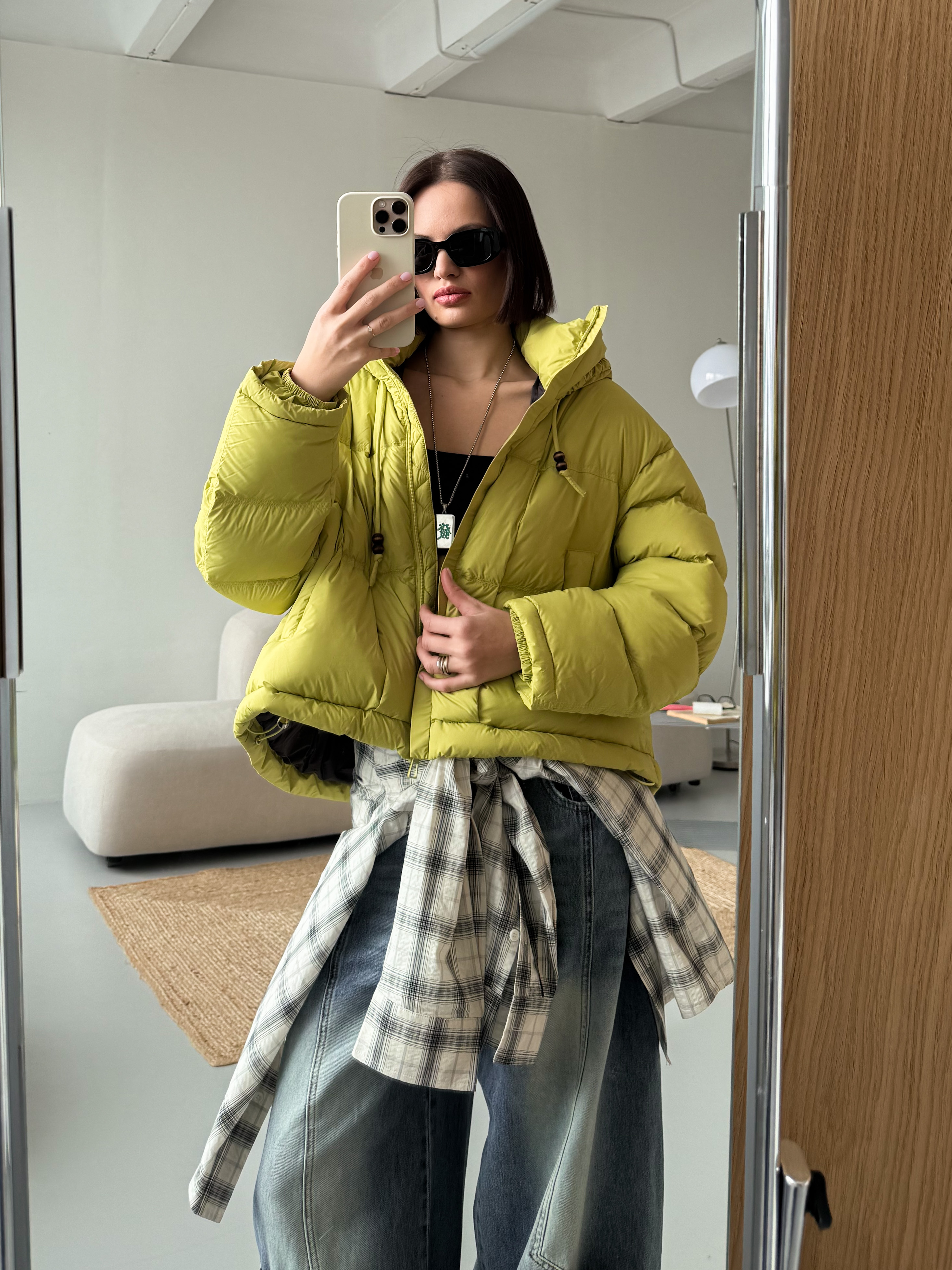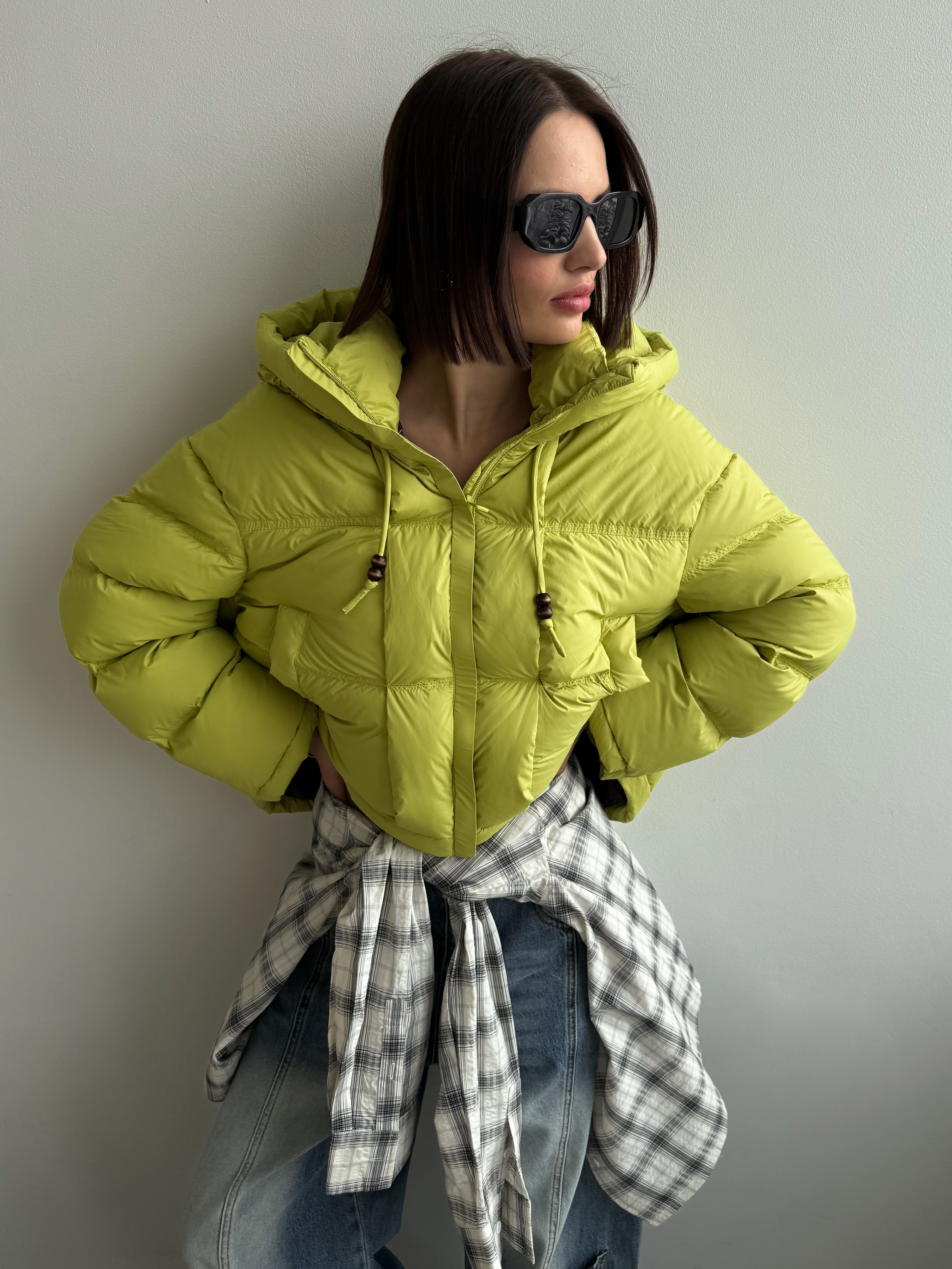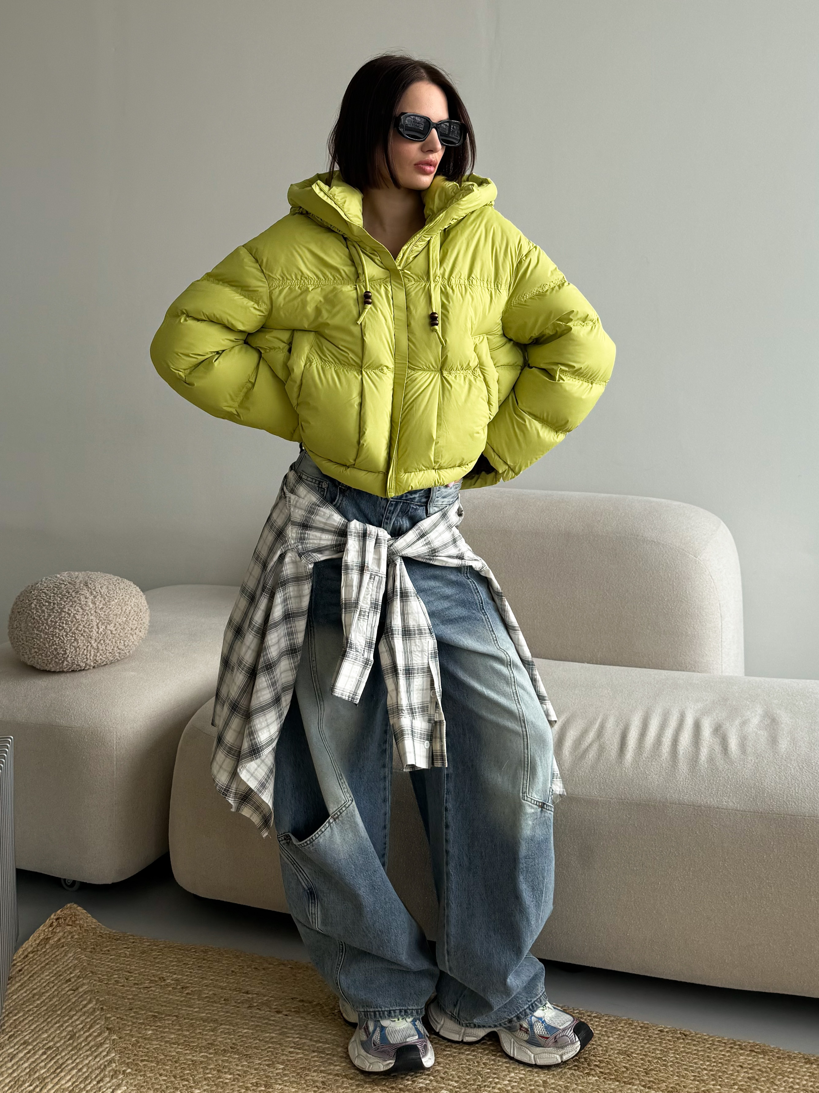 Теплый укороченный пуховик оверсайз. Яркая модель с капюшоном для стильного образа.