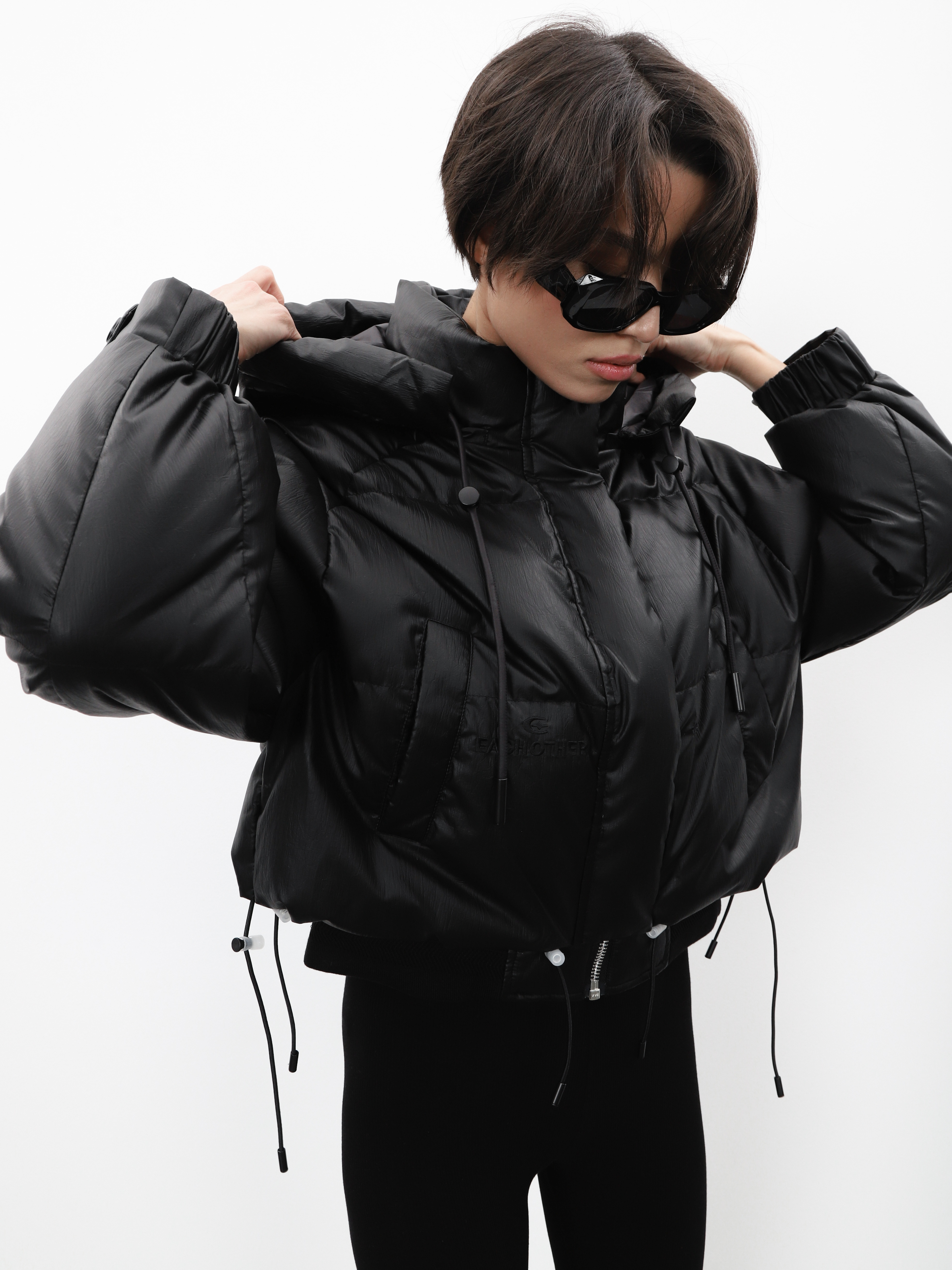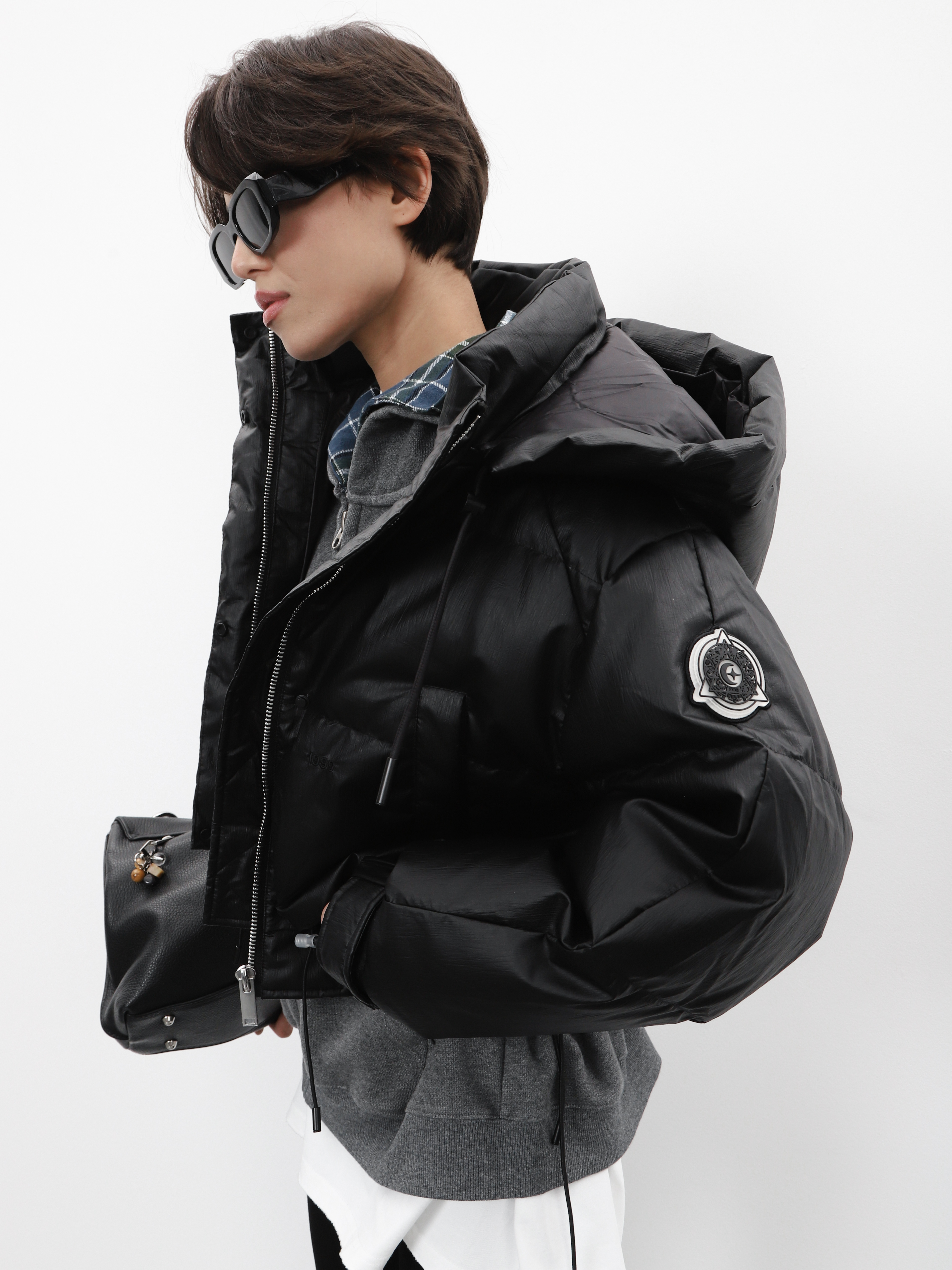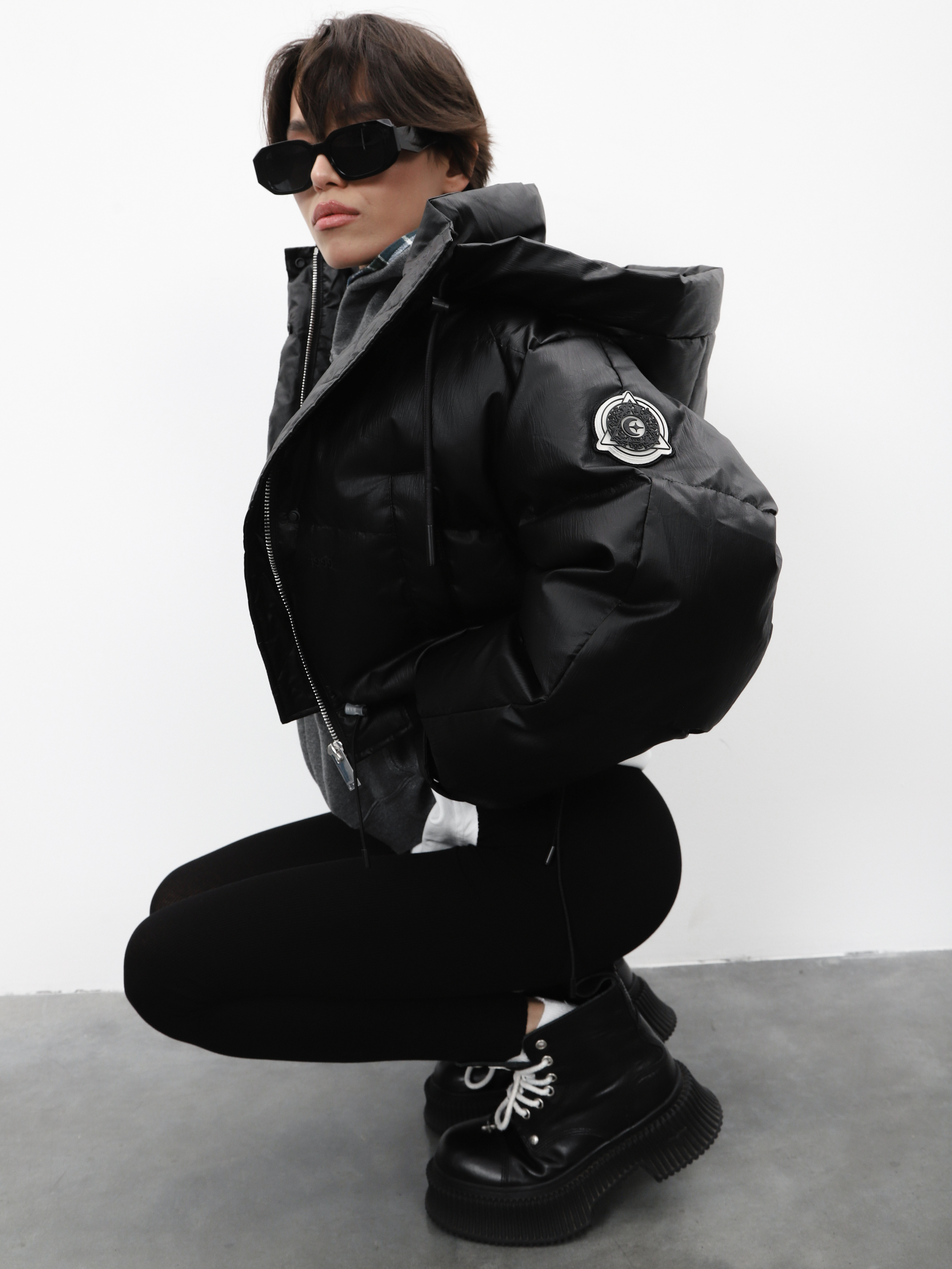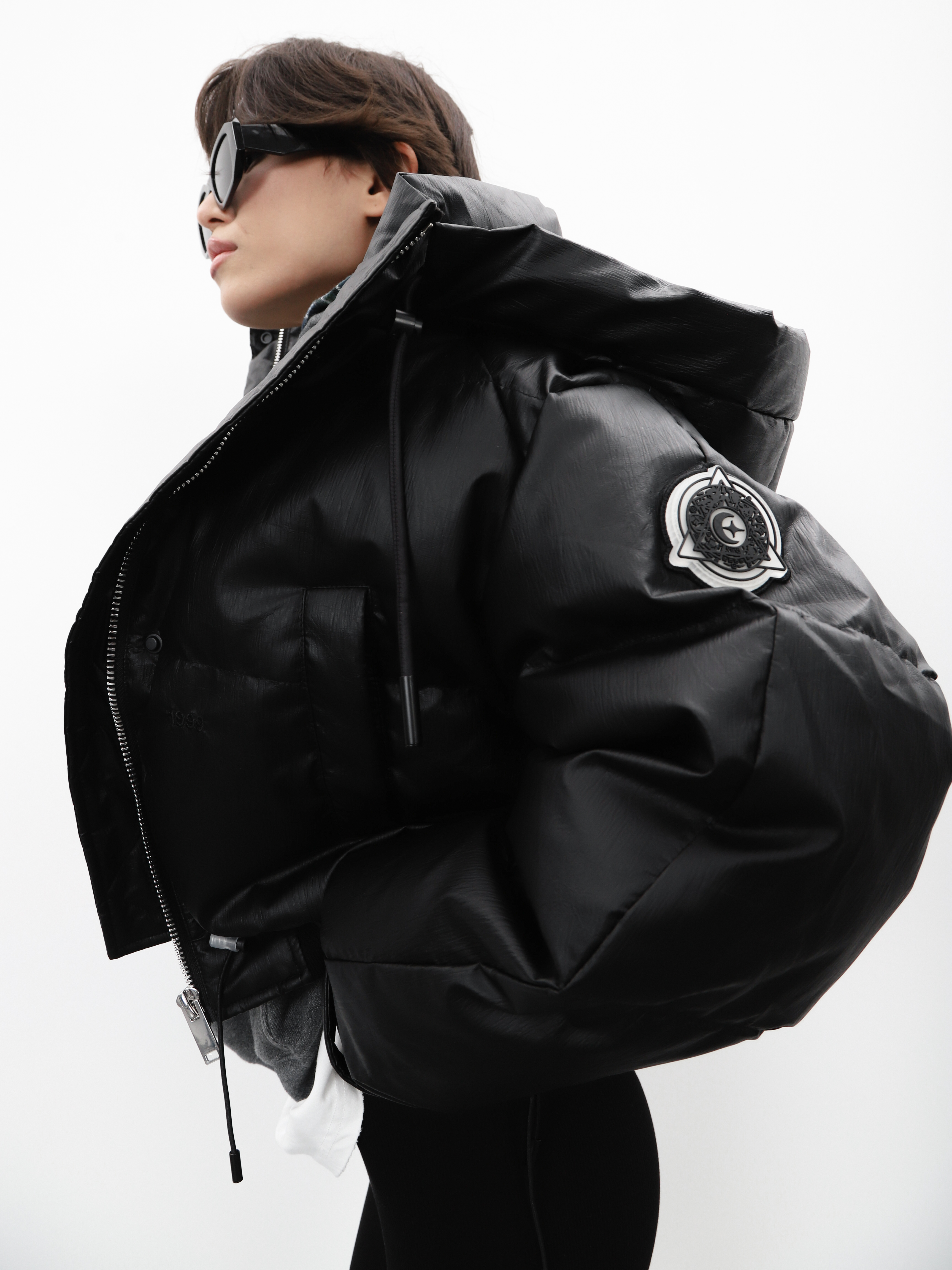 Укороченный черный пуховик с капюшоном и нашивкой на рукаве. Модель оверсайз для создания стильного зимнего образа.