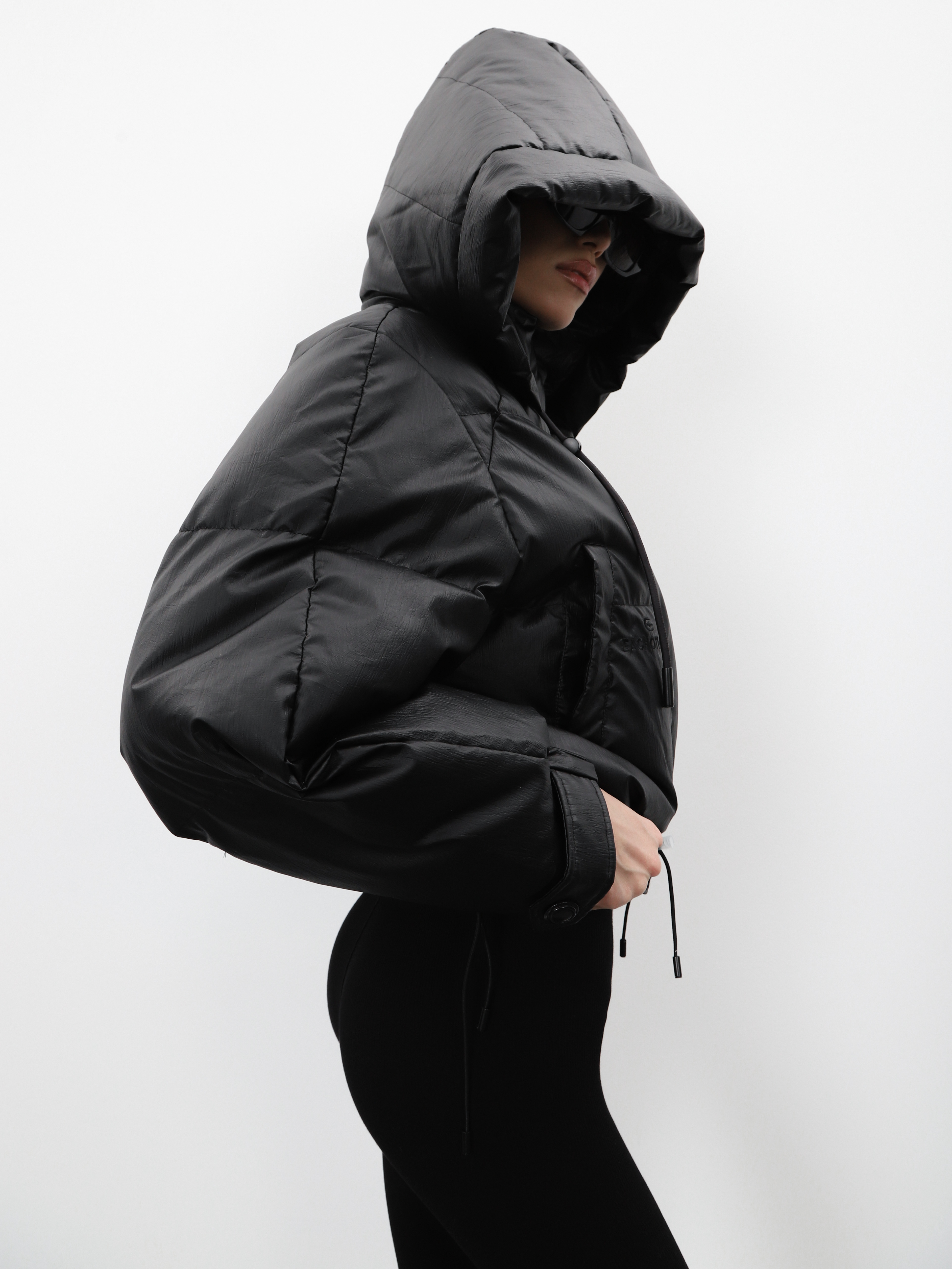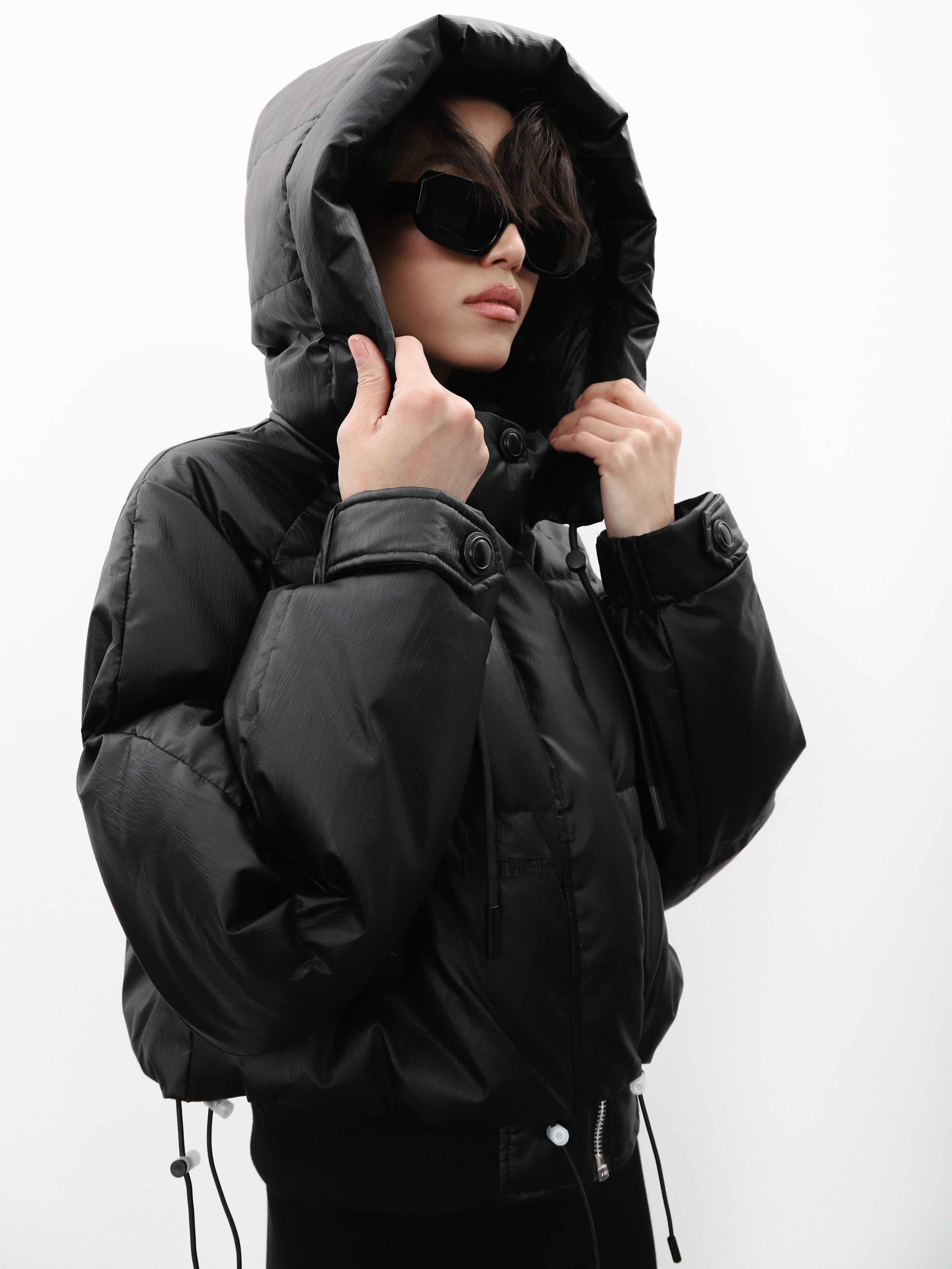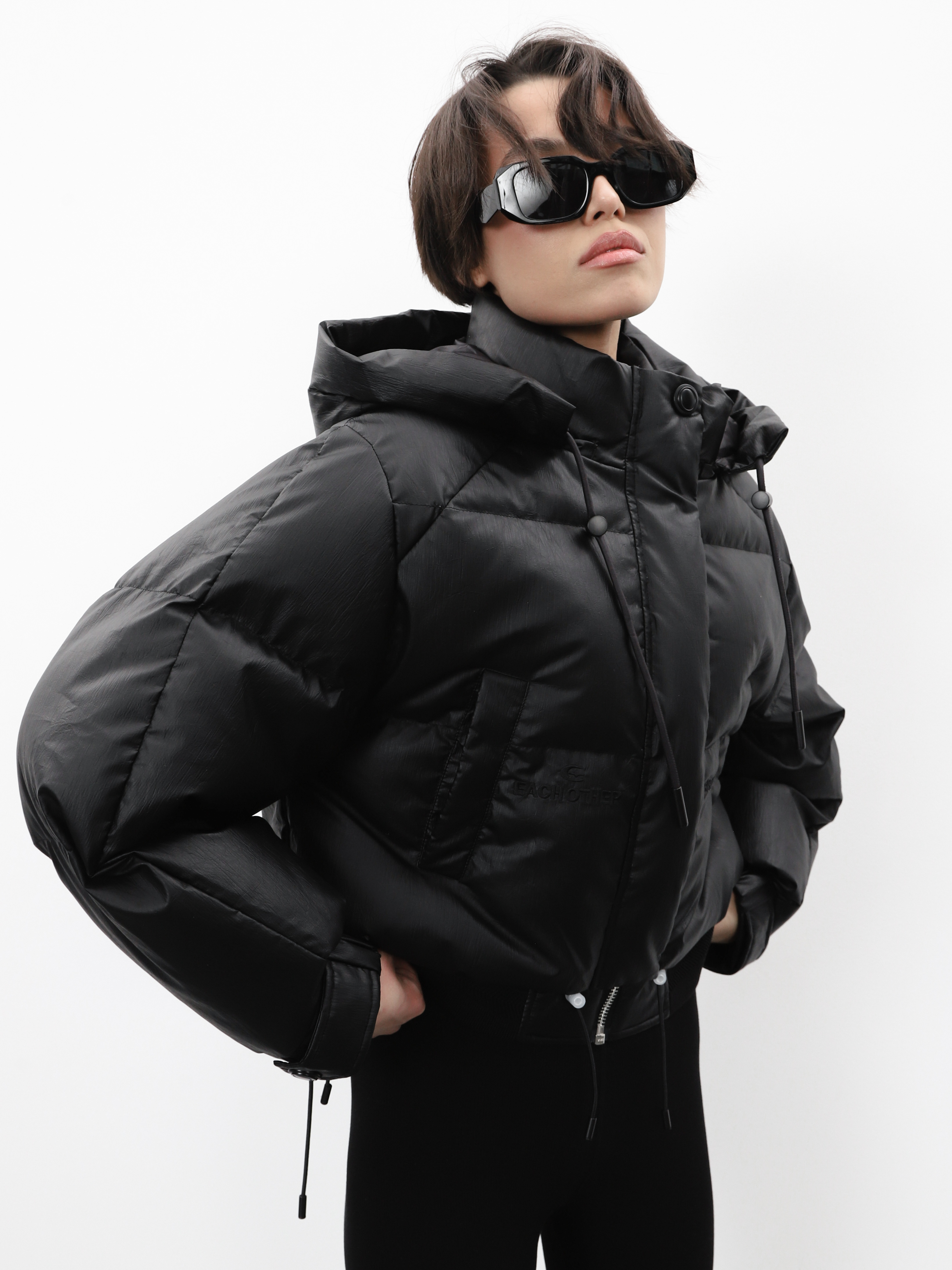 Укороченный черный пуховик с капюшоном и нашивкой на рукаве. Модель оверсайз для создания стильного зимнего образа.