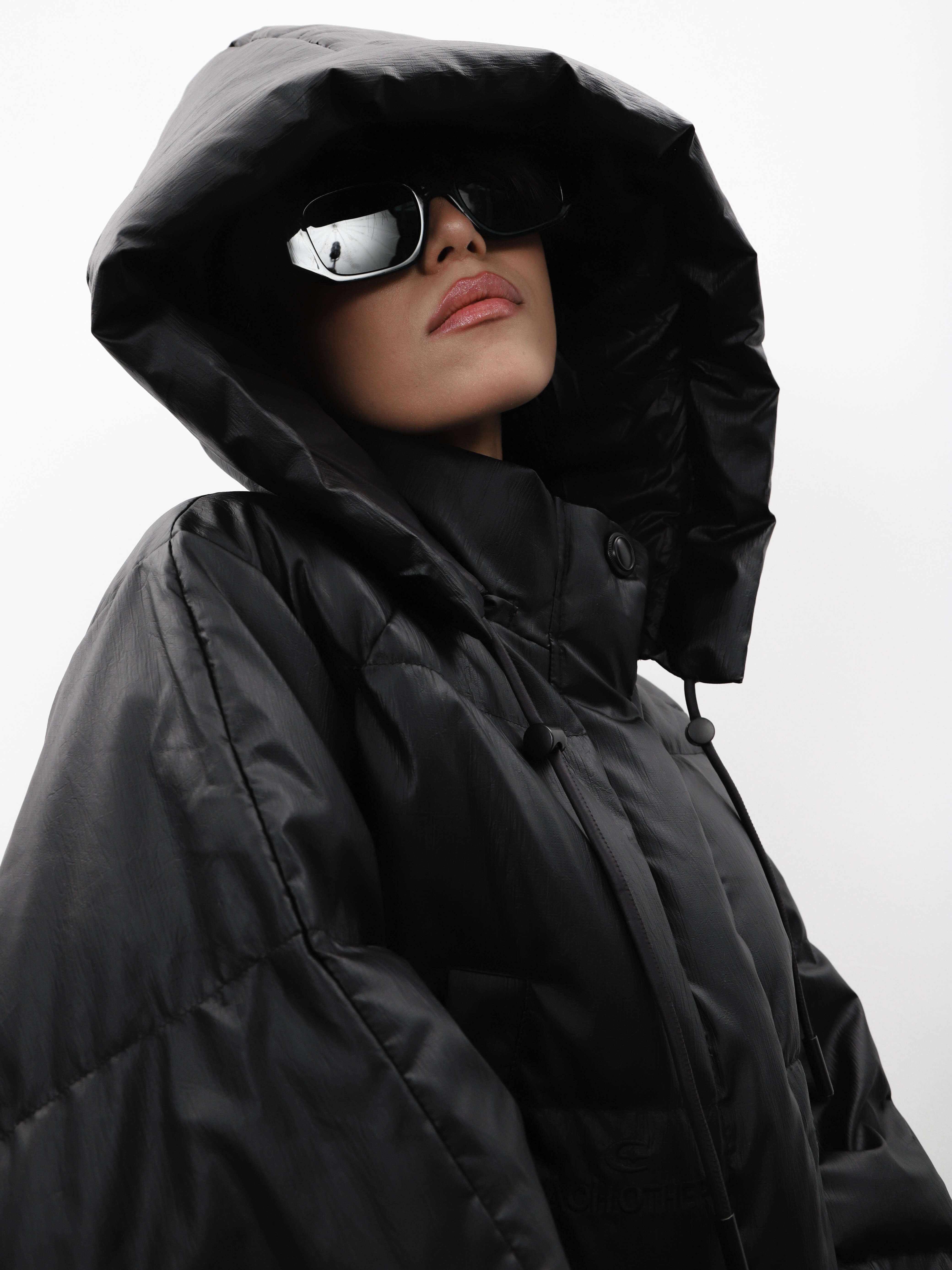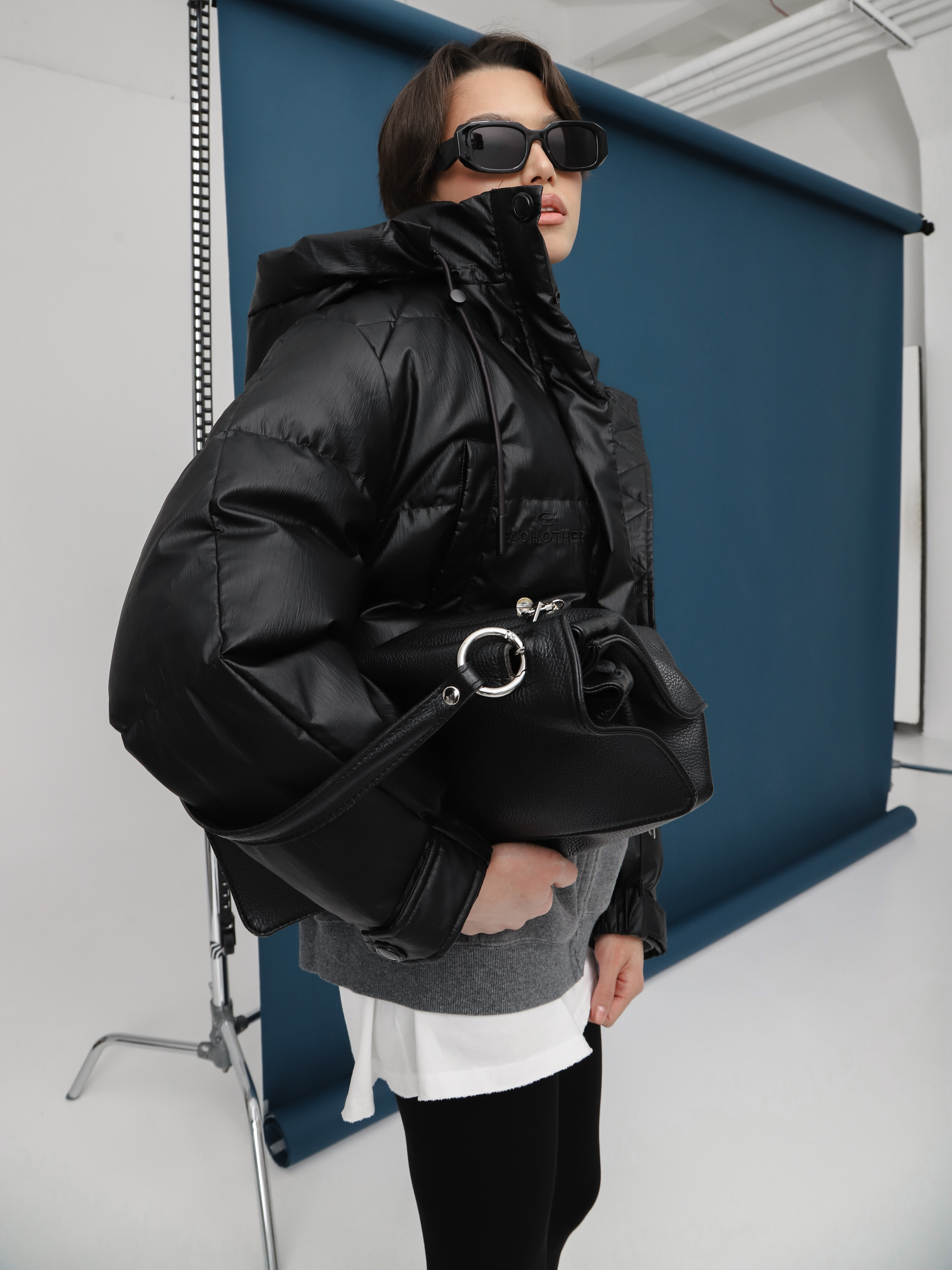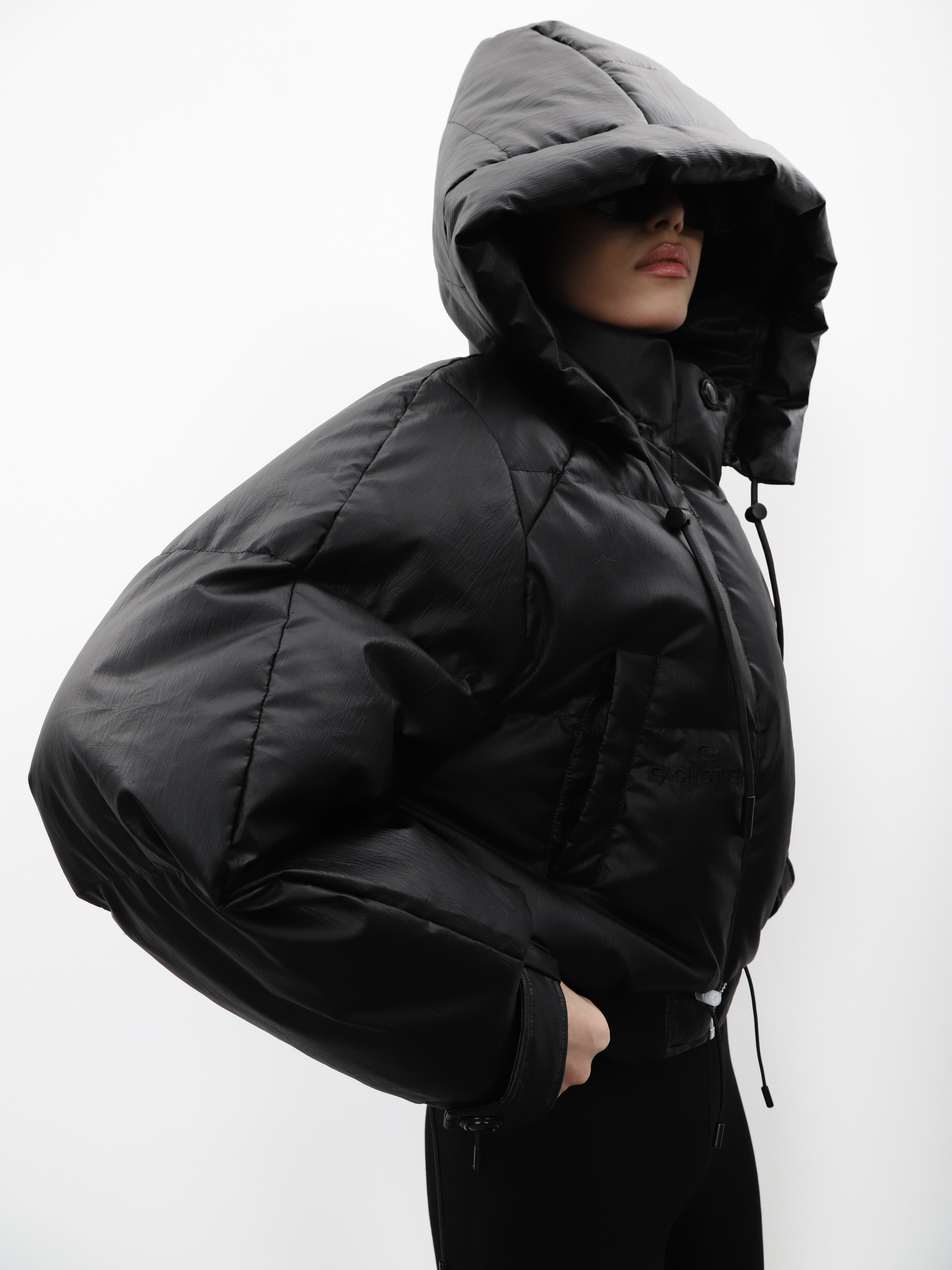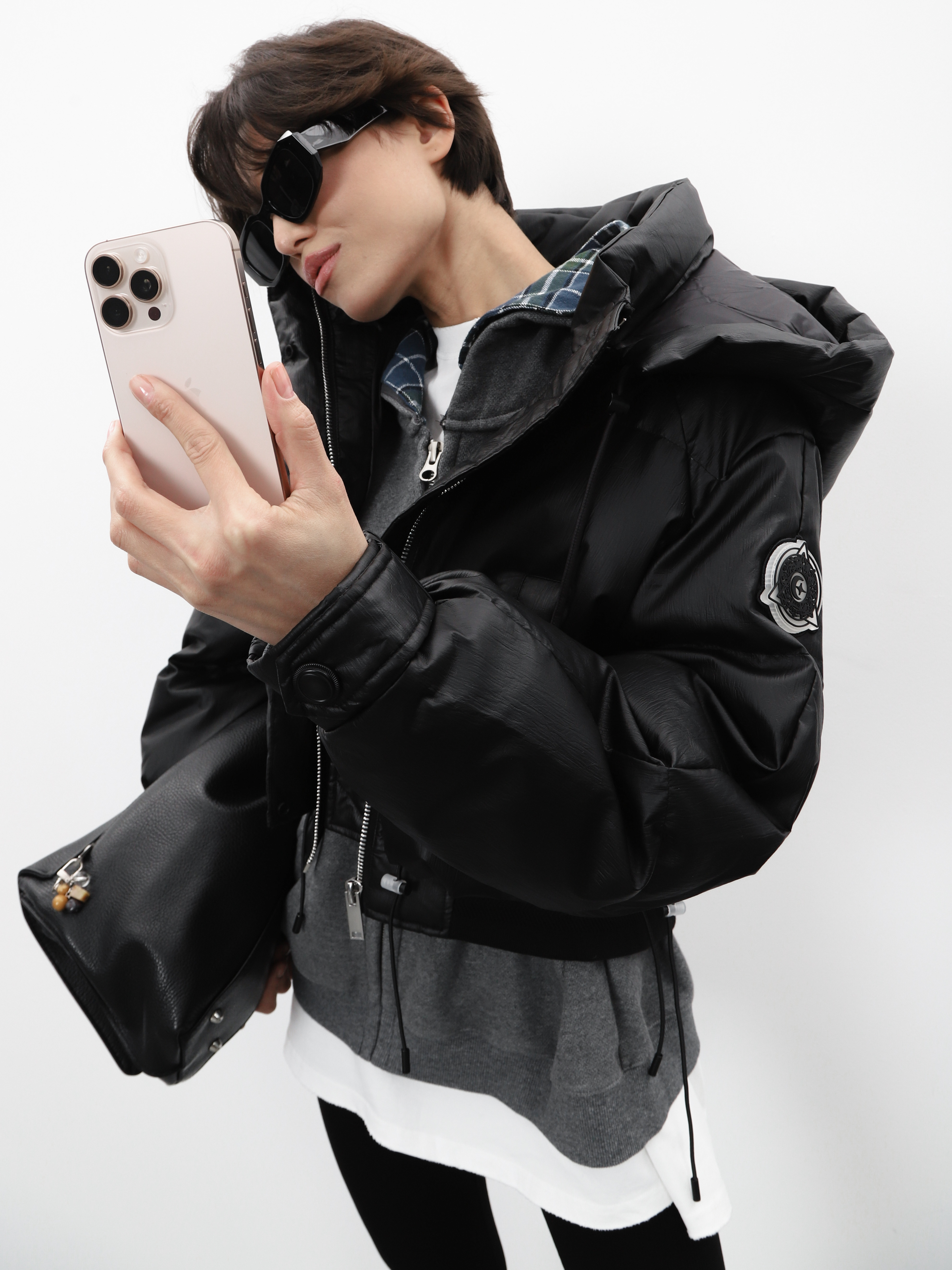 Укороченный черный пуховик с капюшоном и нашивкой на рукаве. Модель оверсайз для создания стильного зимнего образа.