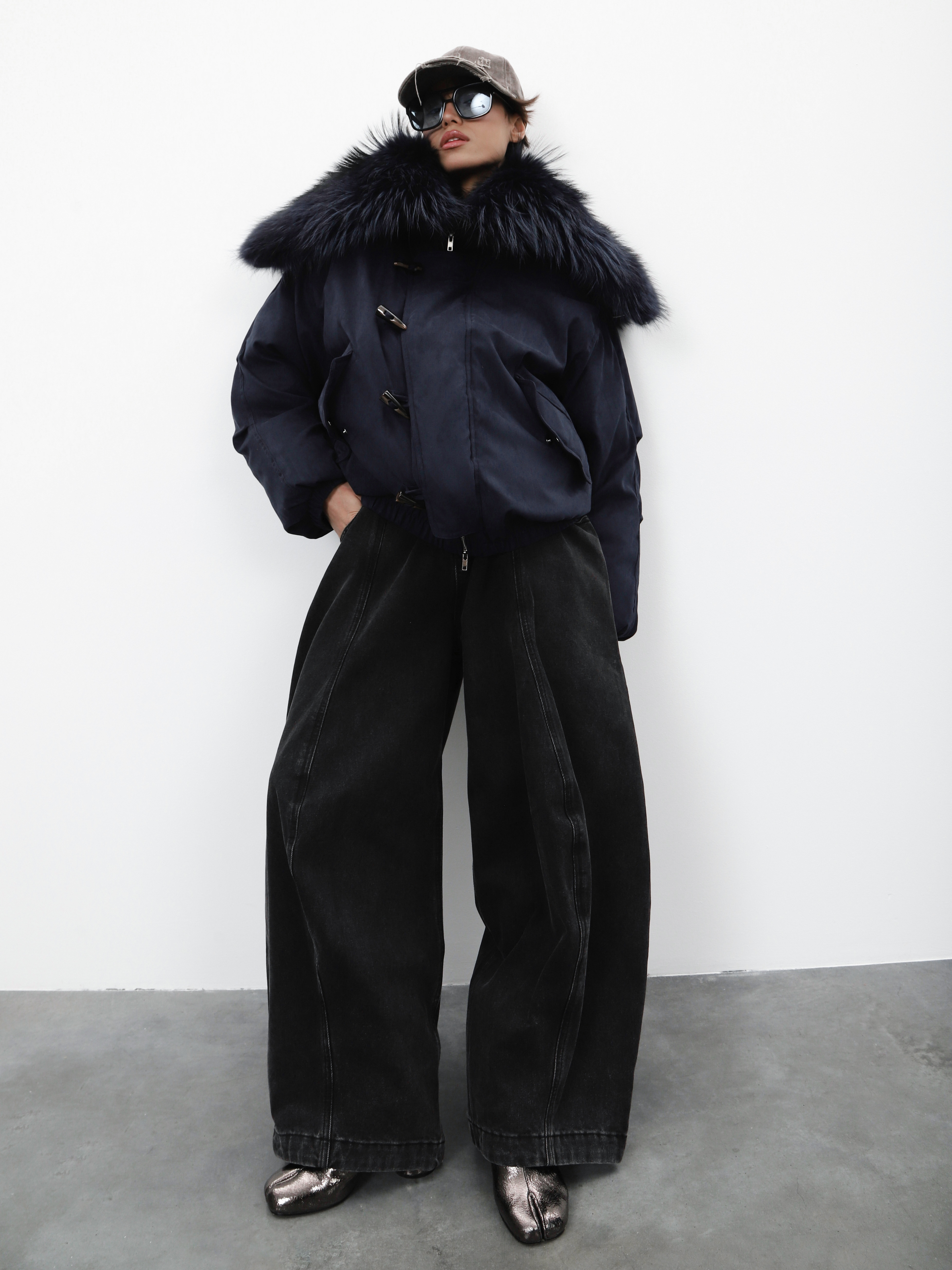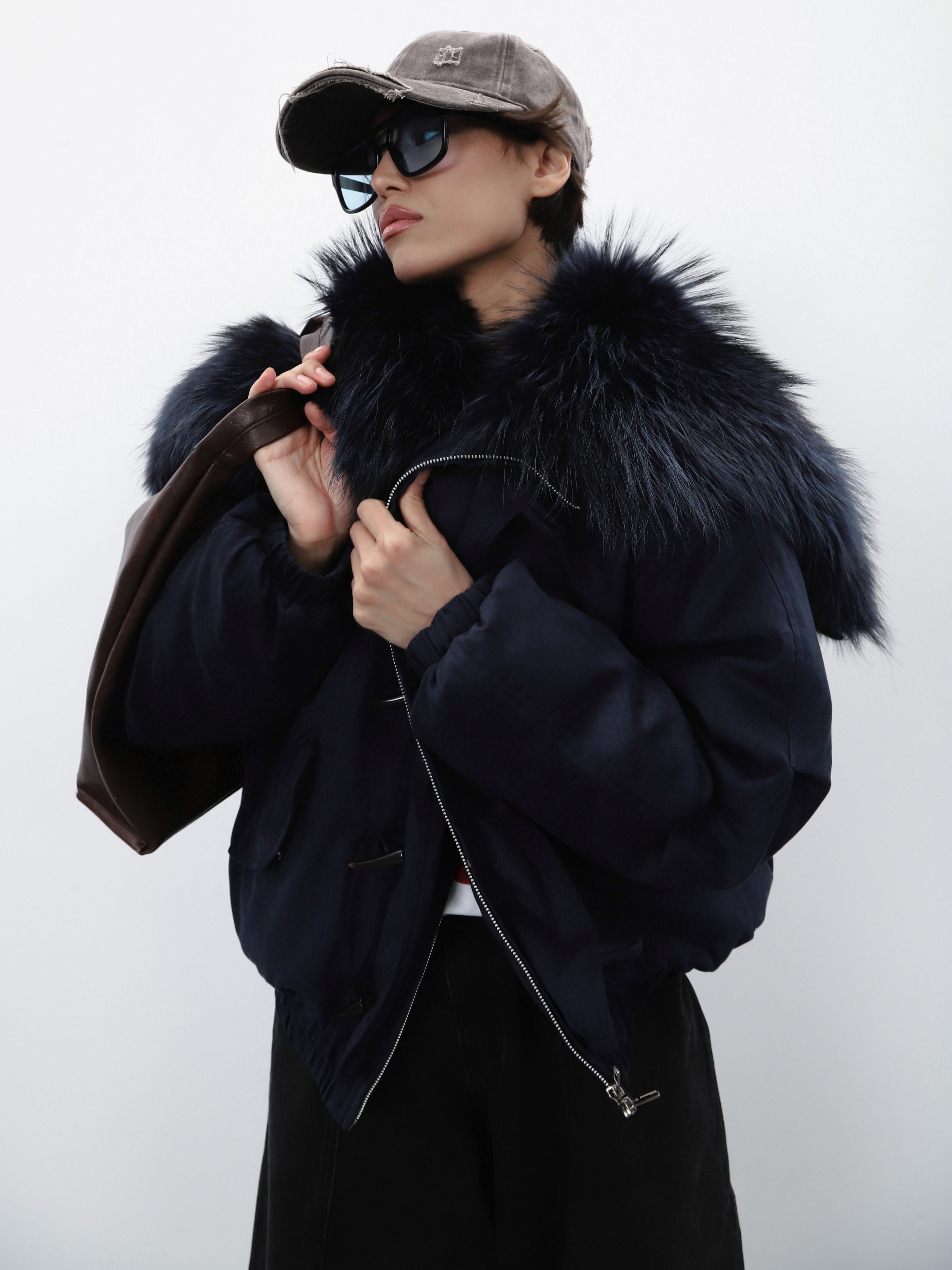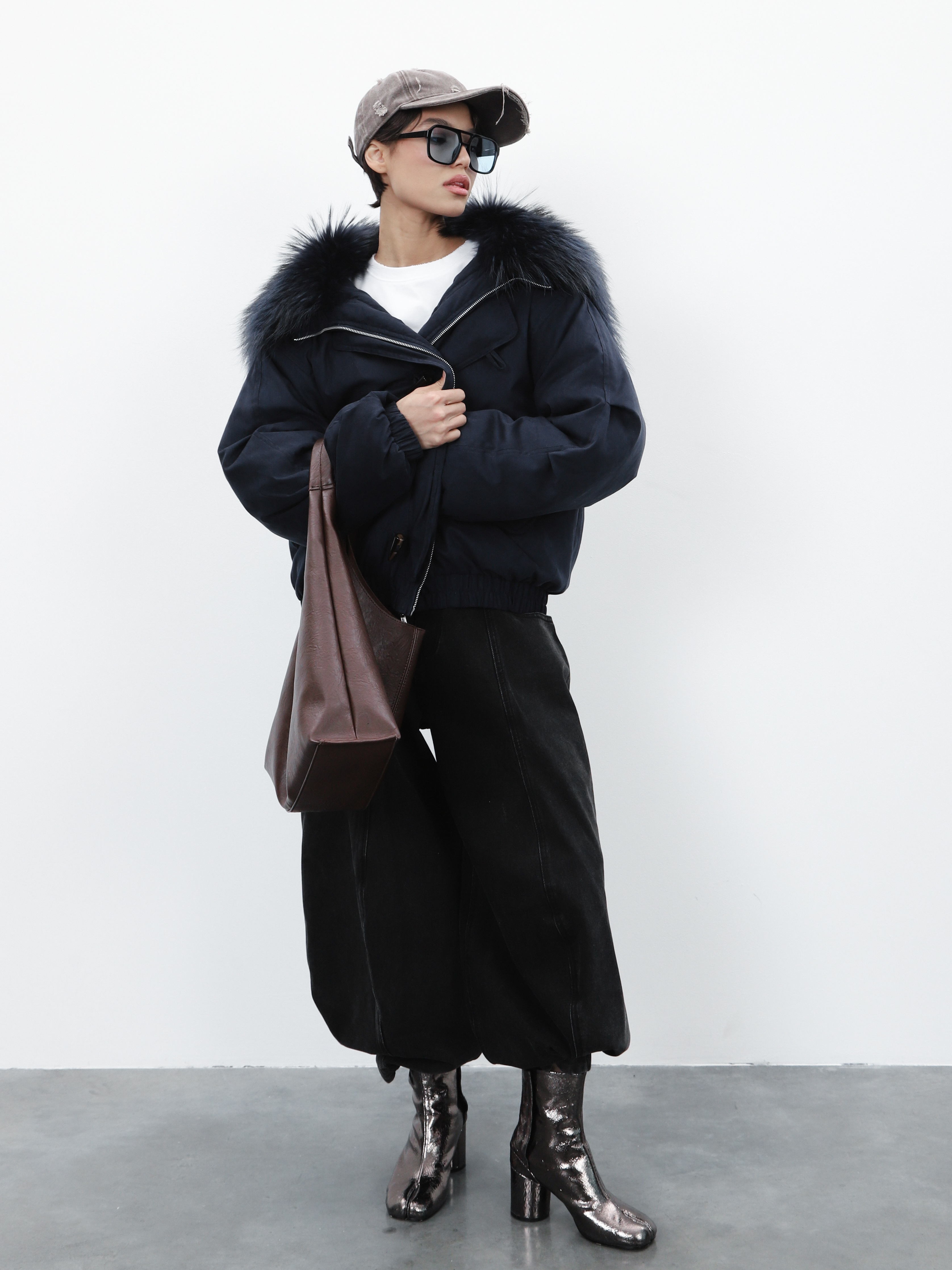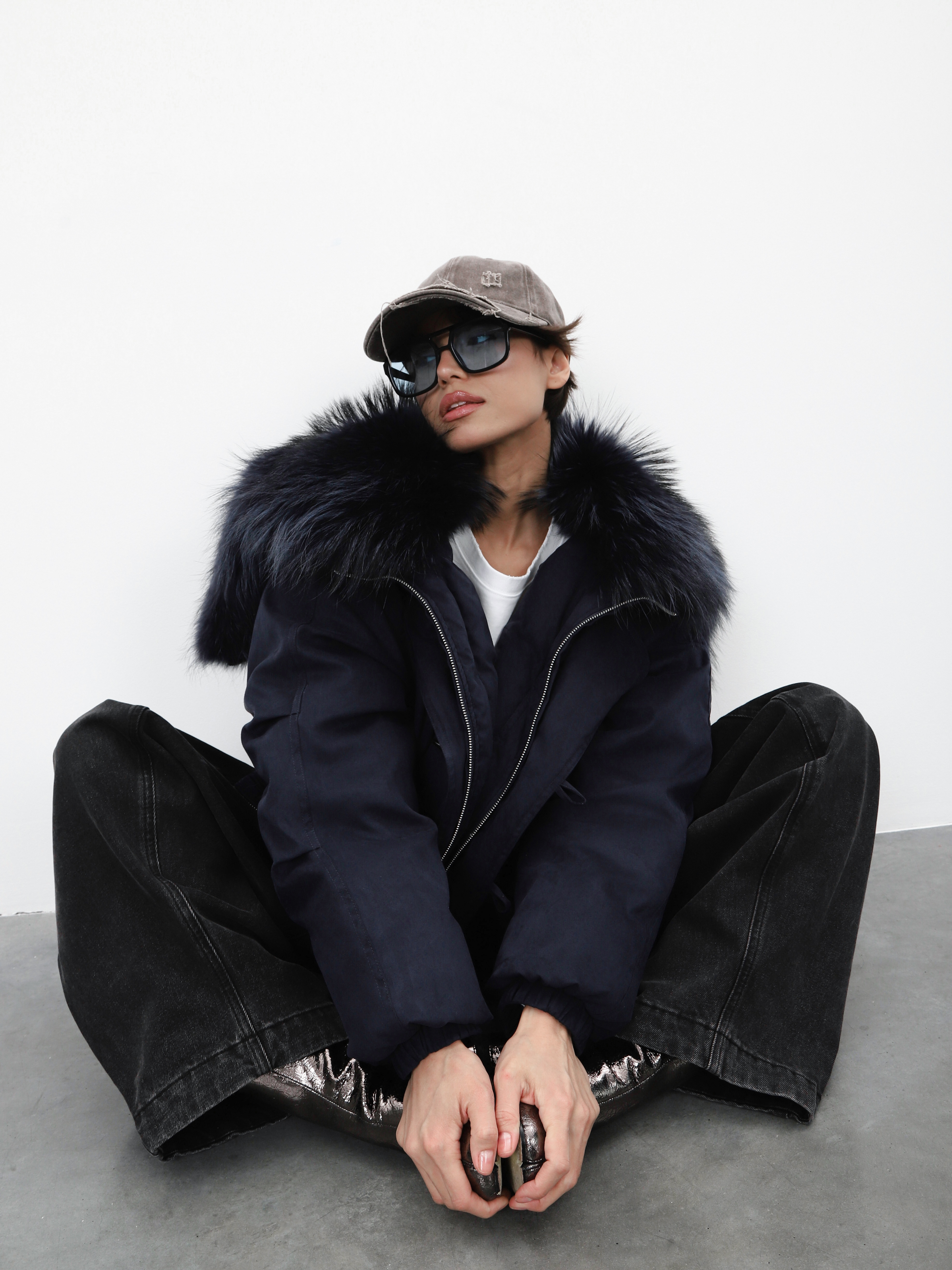 Тёмно-синий укороченный пуховик с мехом. Модель оверсайз для создания стильного зимнего образа.