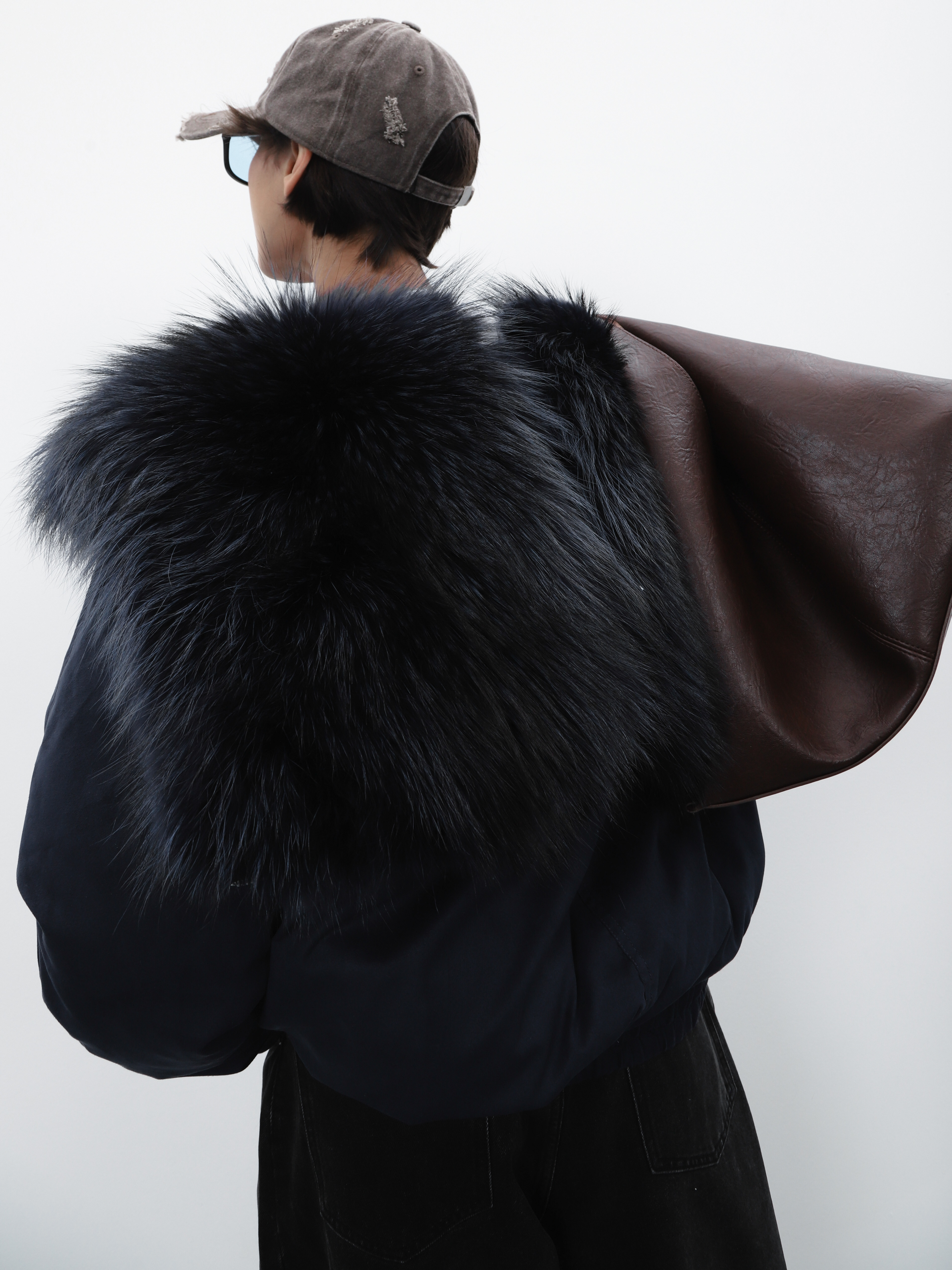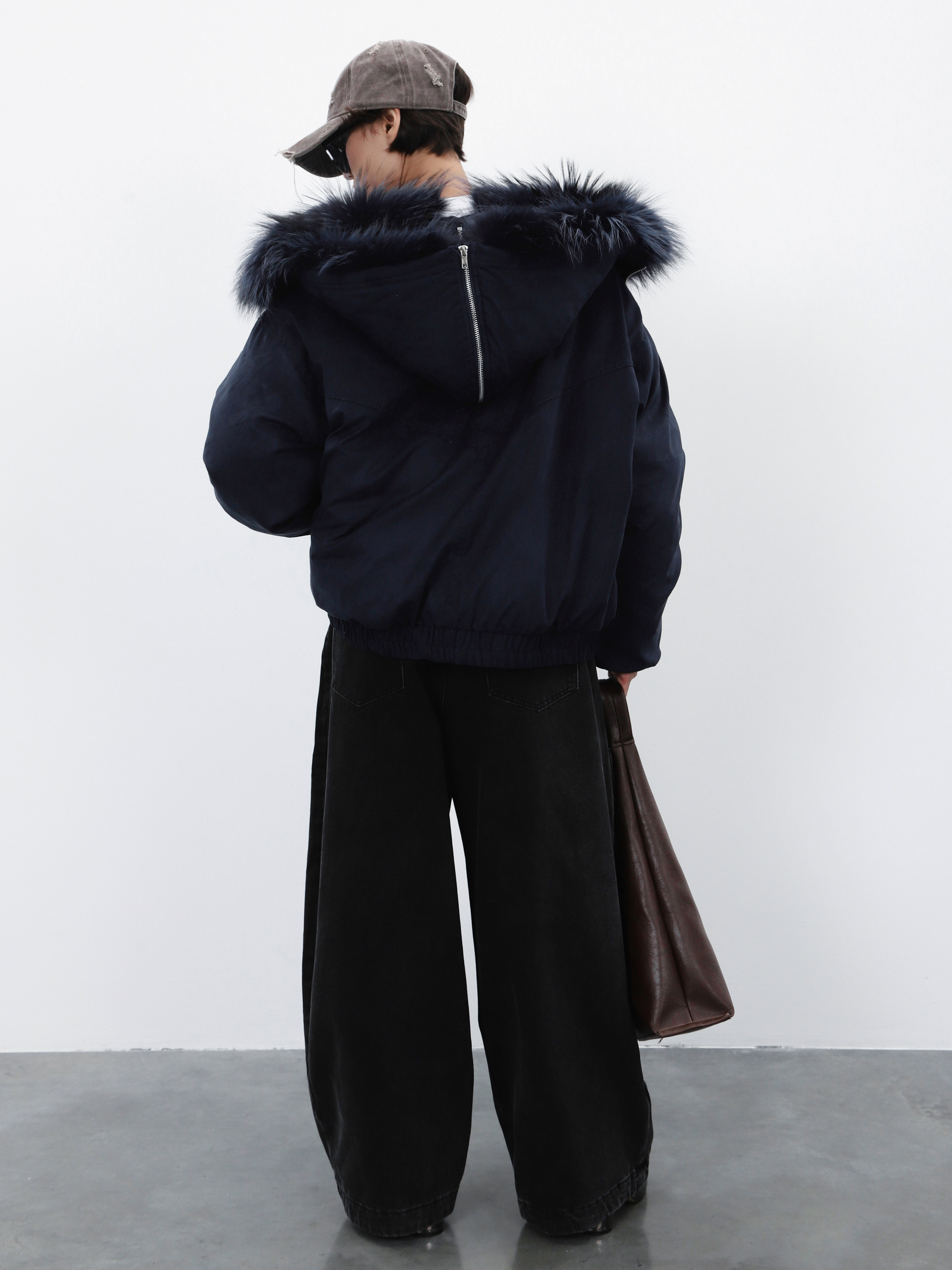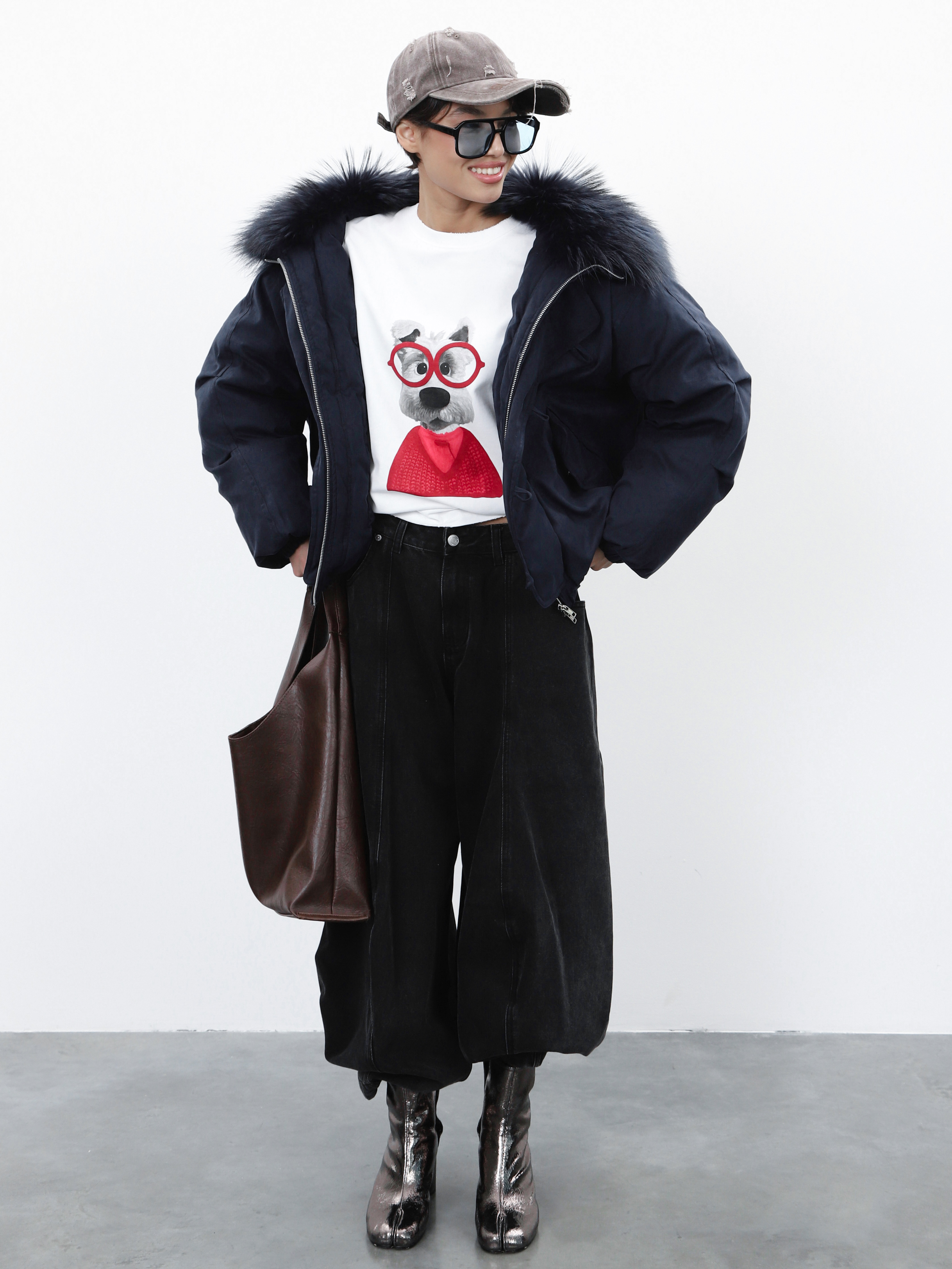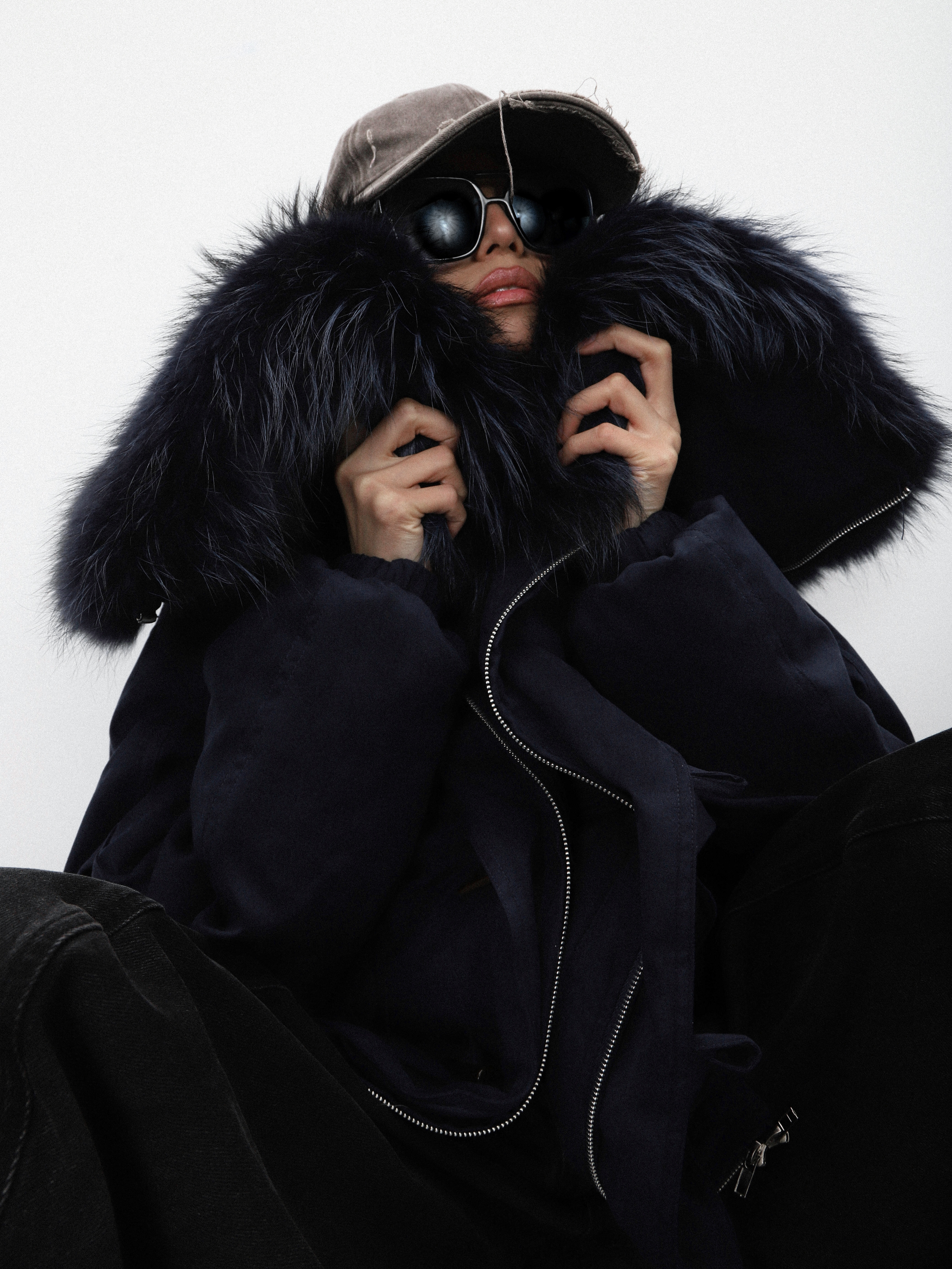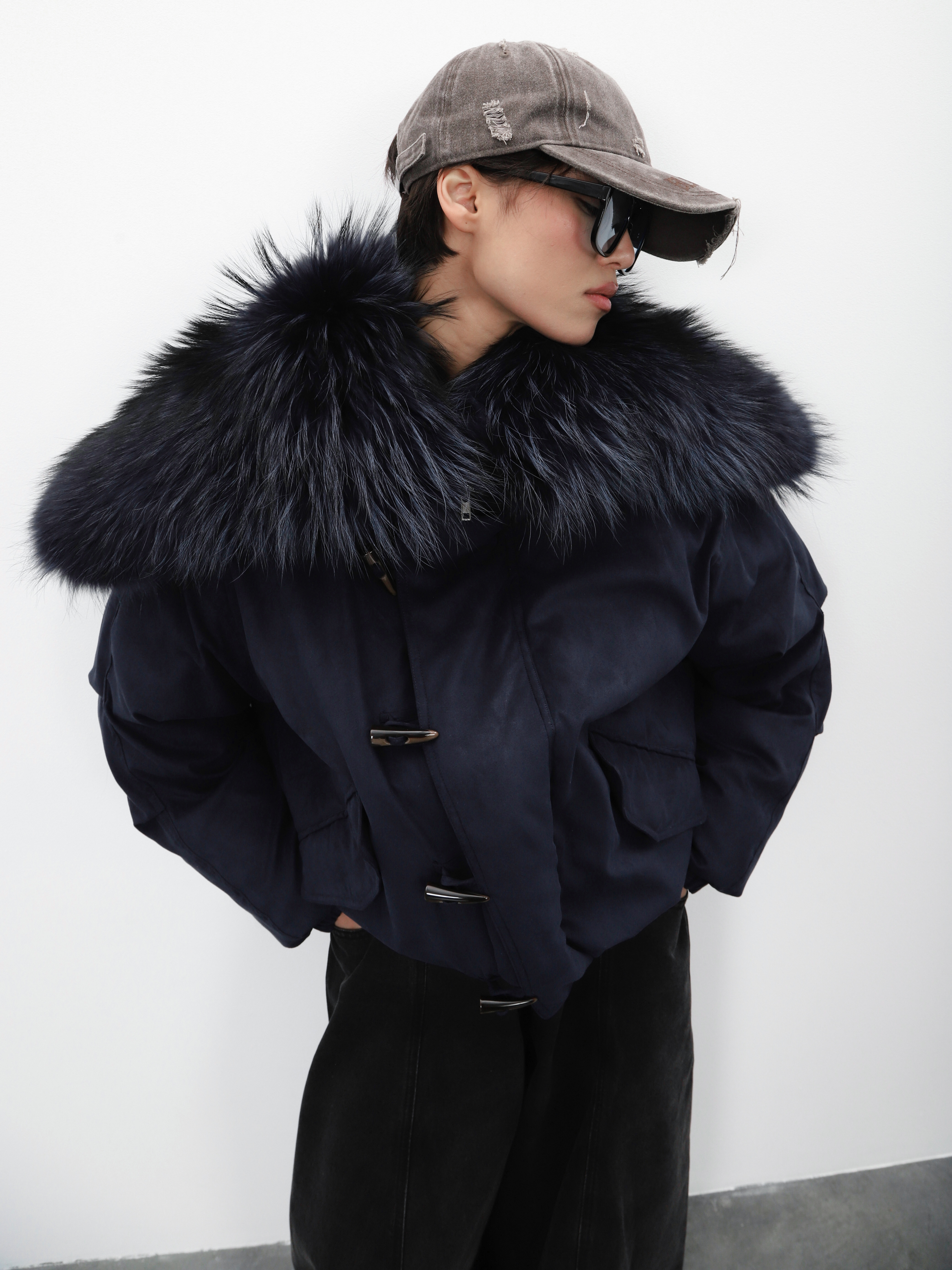 Тёмно-синий укороченный пуховик с мехом. Модель оверсайз для создания стильного зимнего образа.