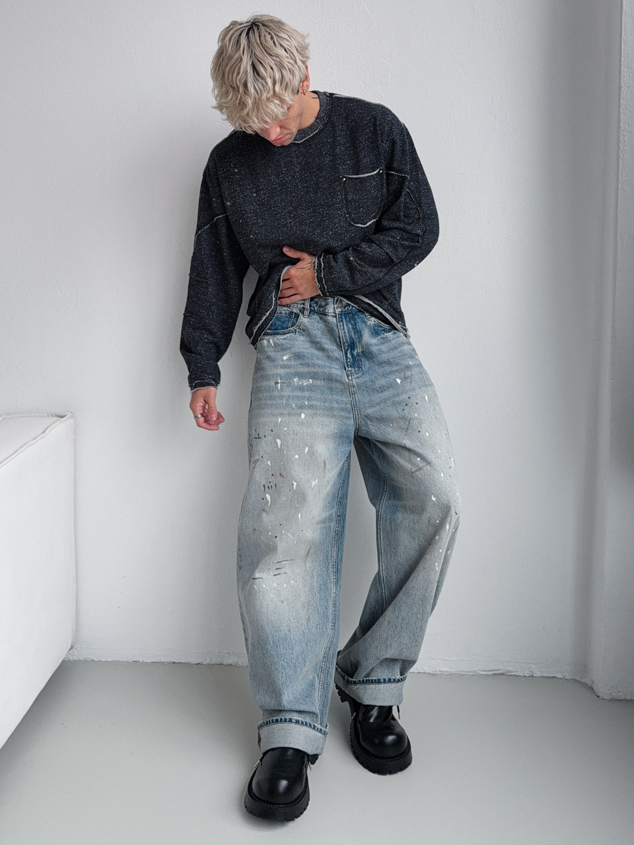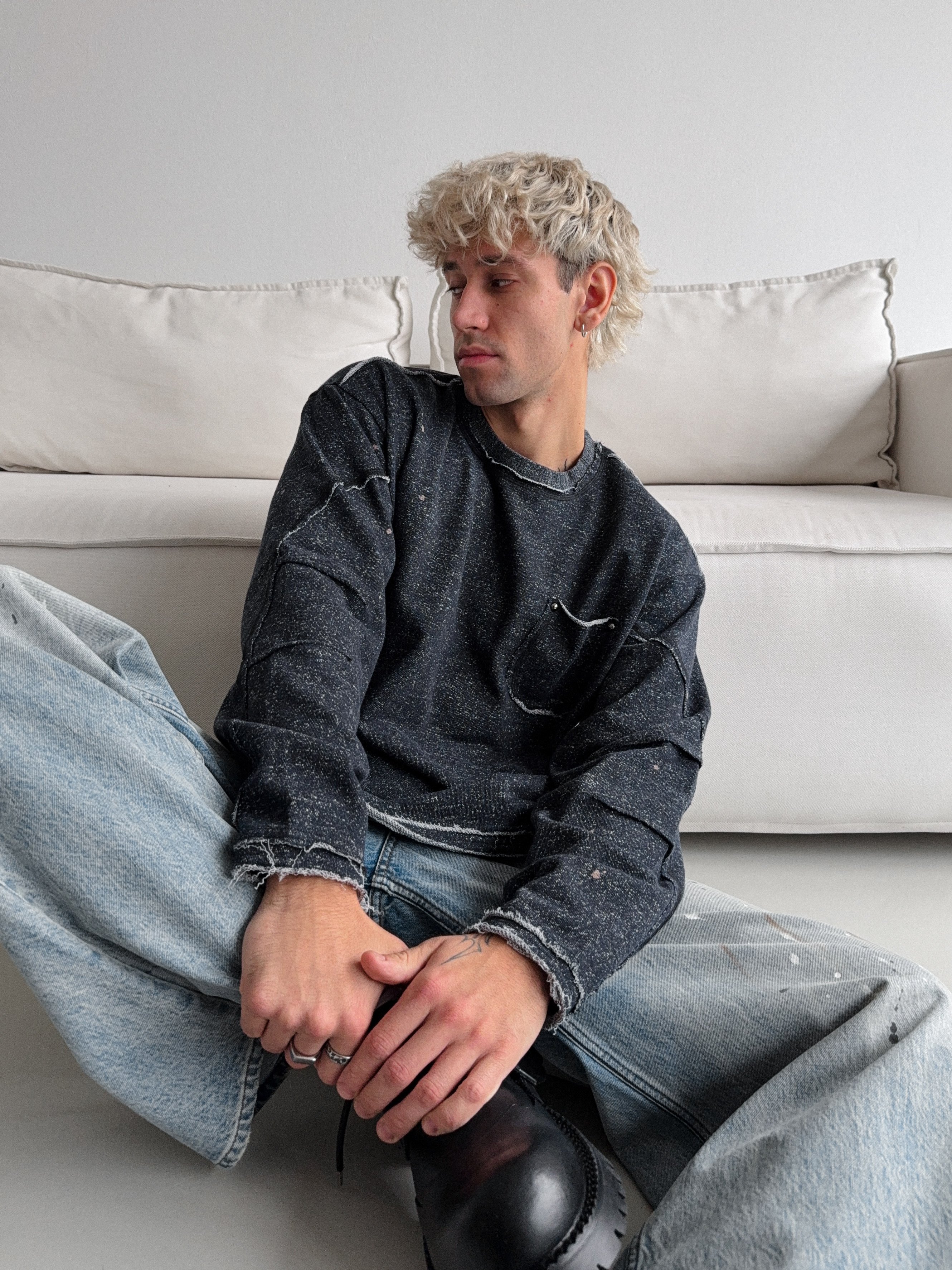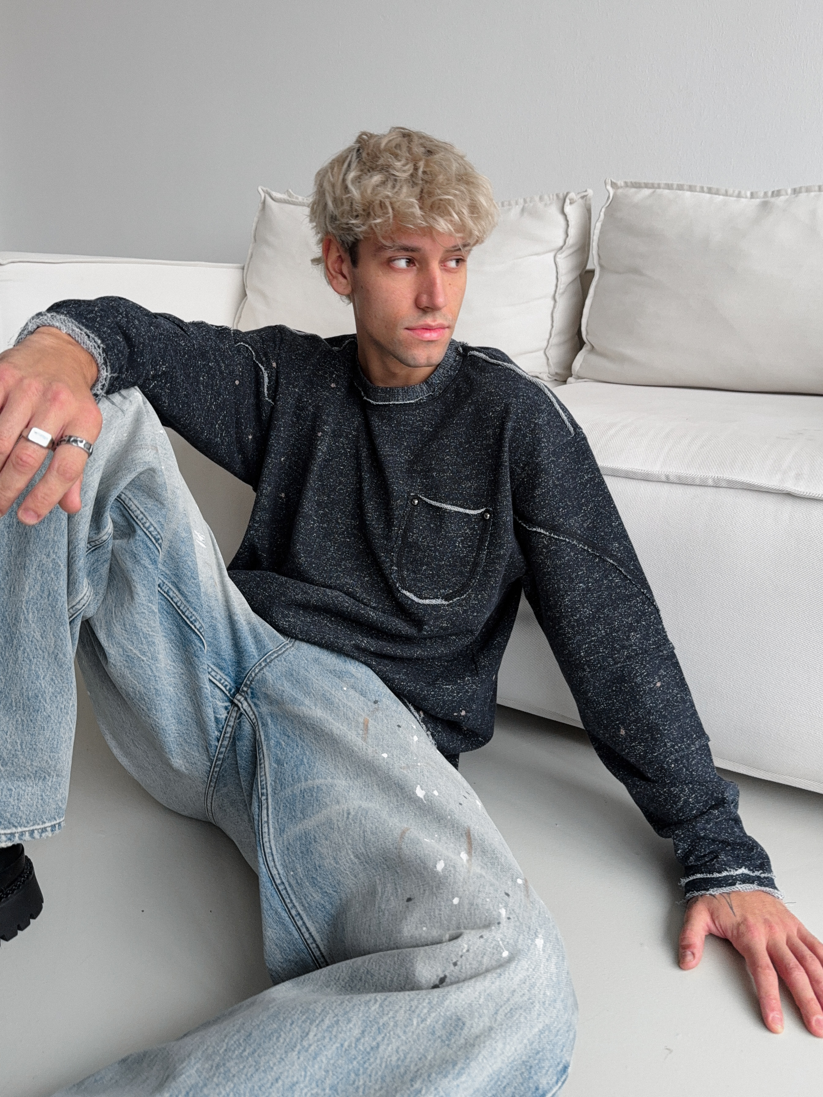Мужской лонгслив темно-синего цвета. Модель с необработанным краем для нескучных образов на каждый день.