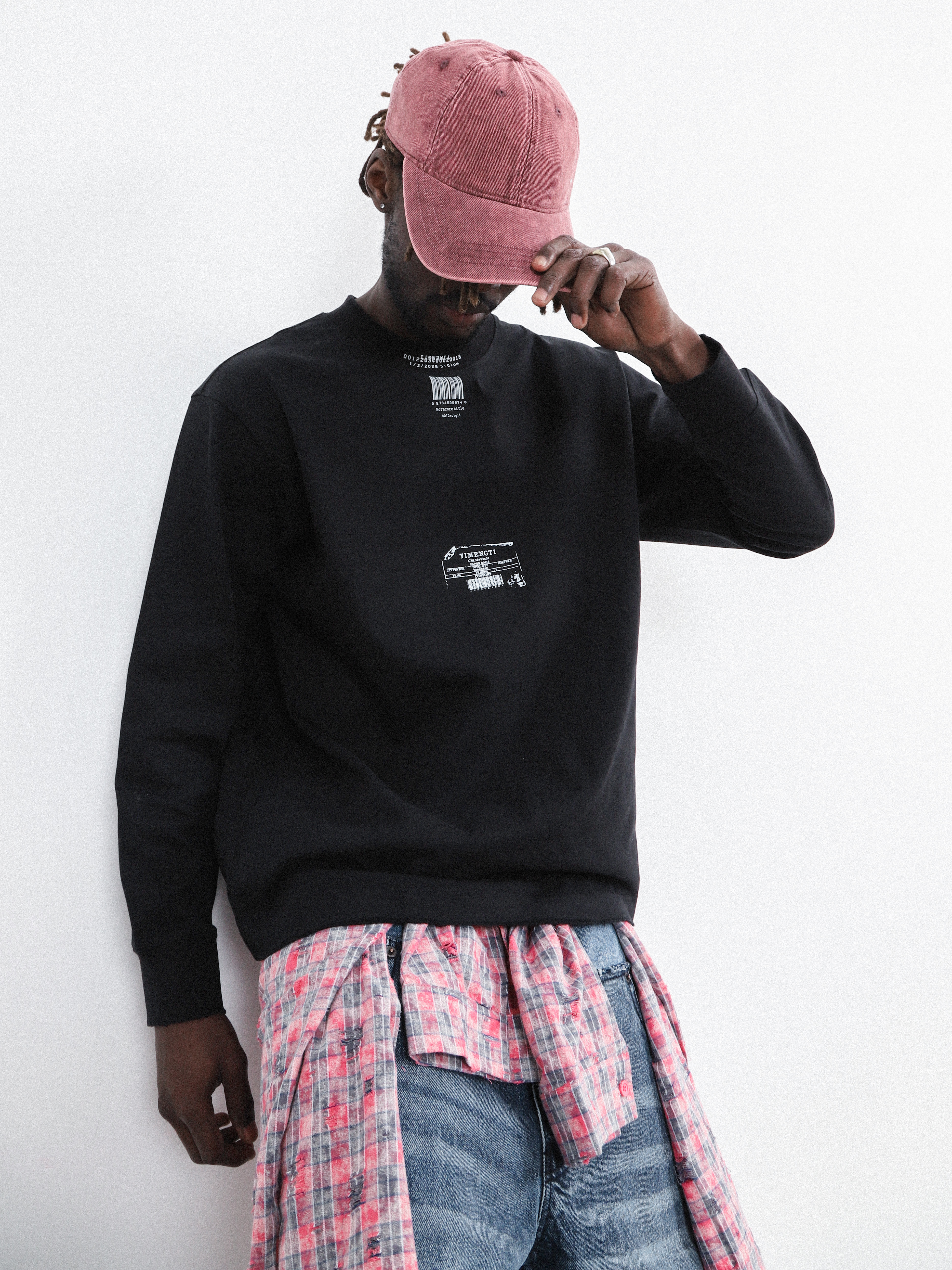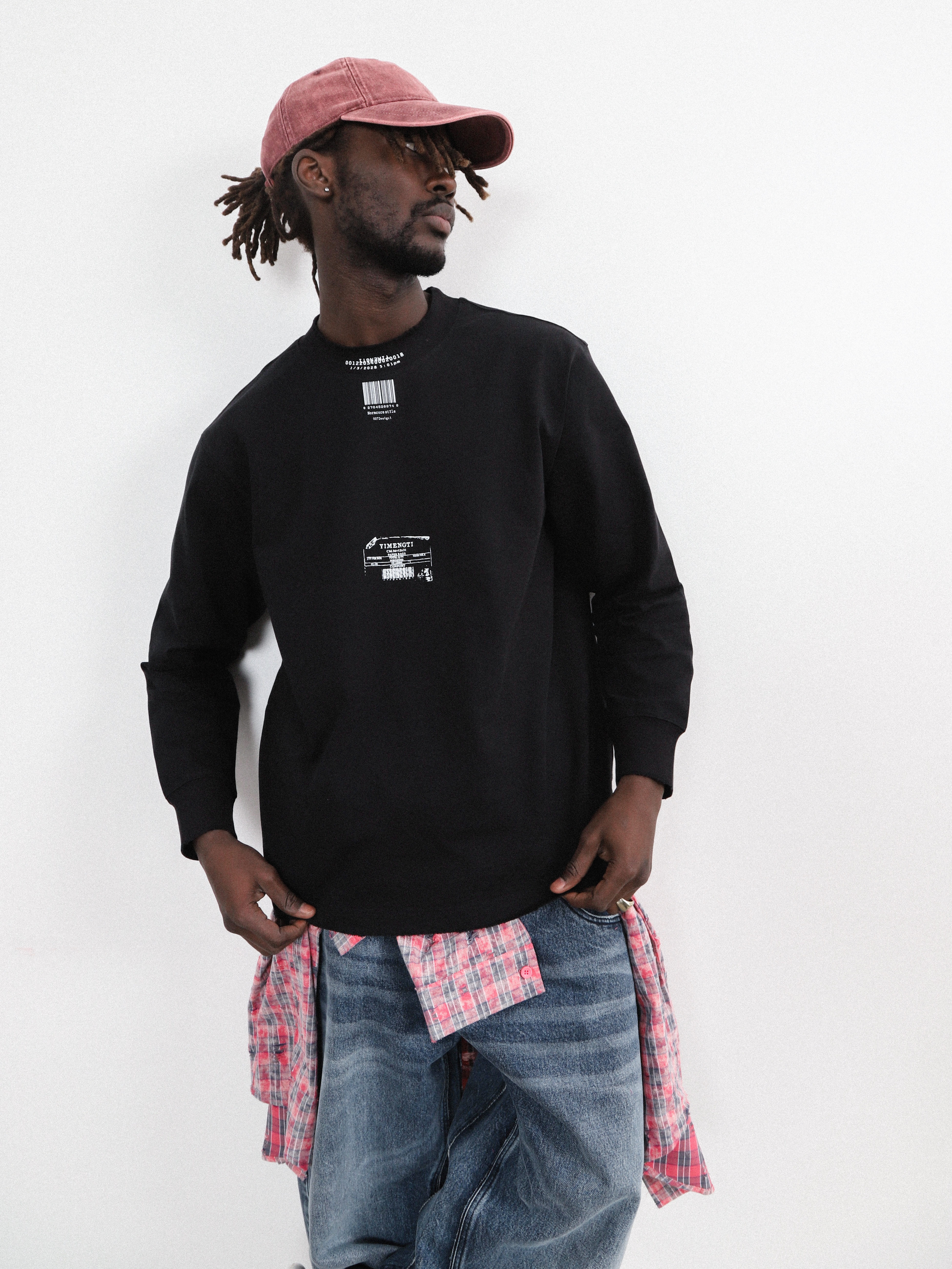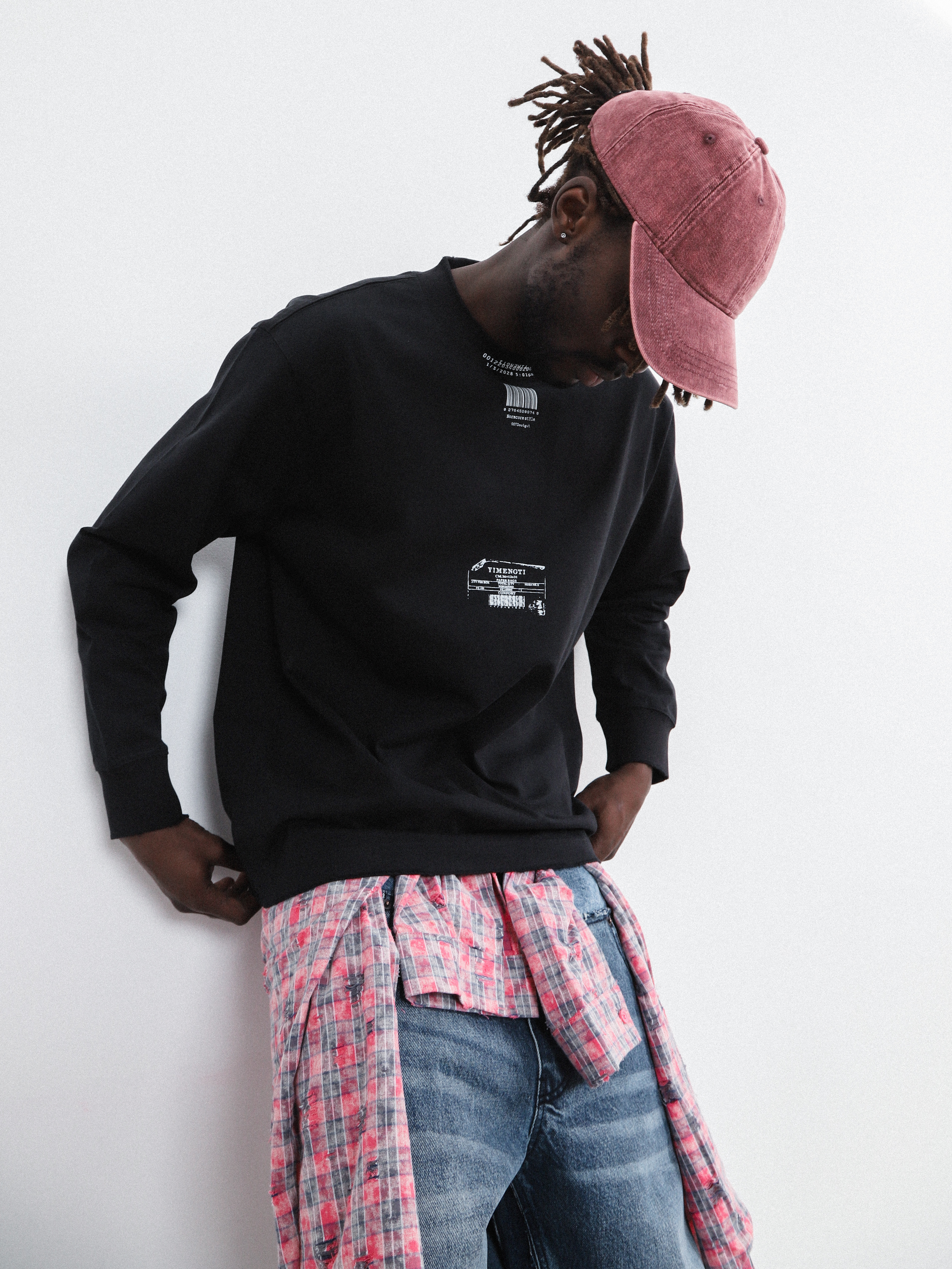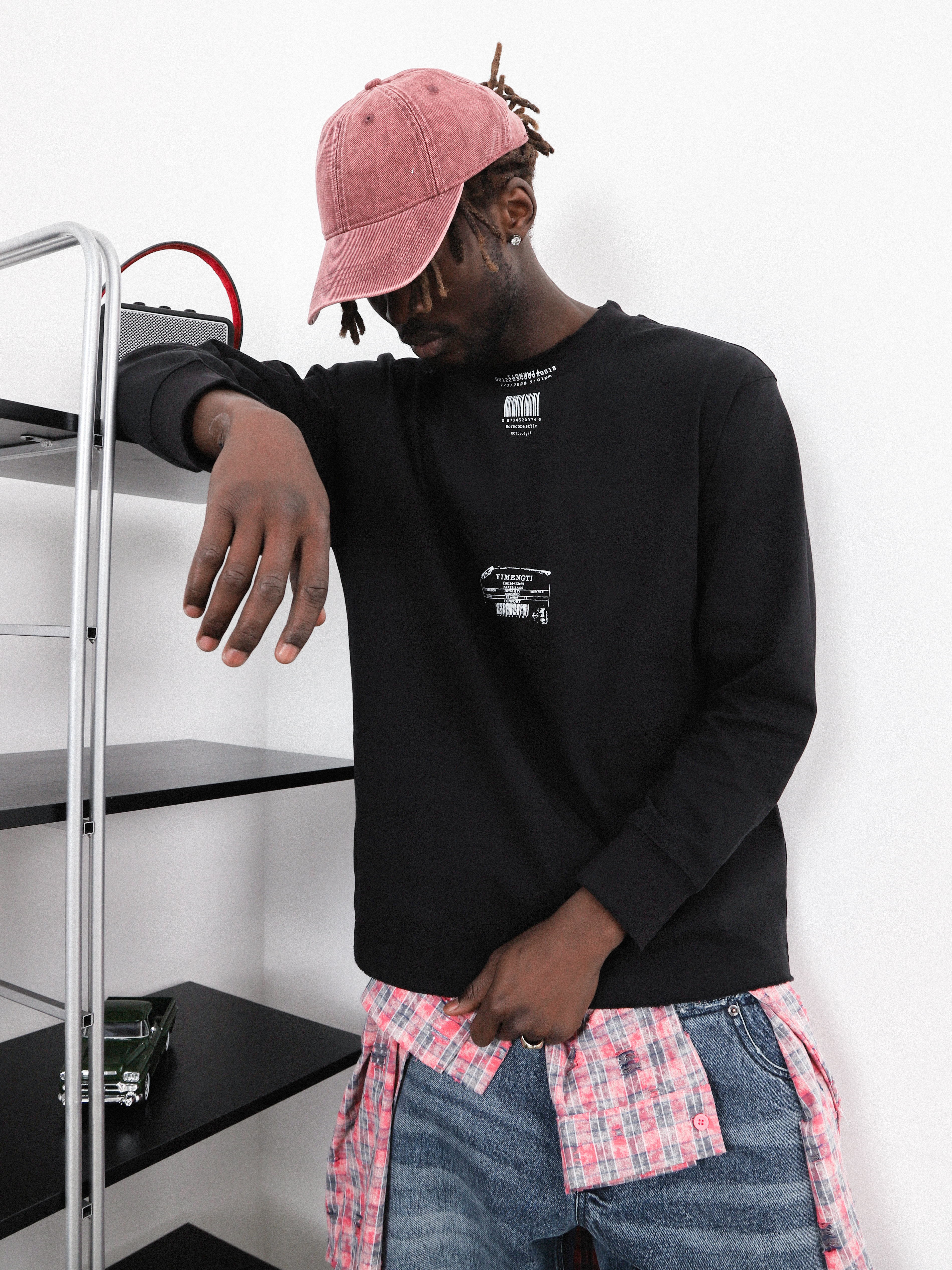 Черный мужской лонгслив из 100% хлопка. Стильная модель с принтами и эффектом потертого края для нескучных образов на каждый день.