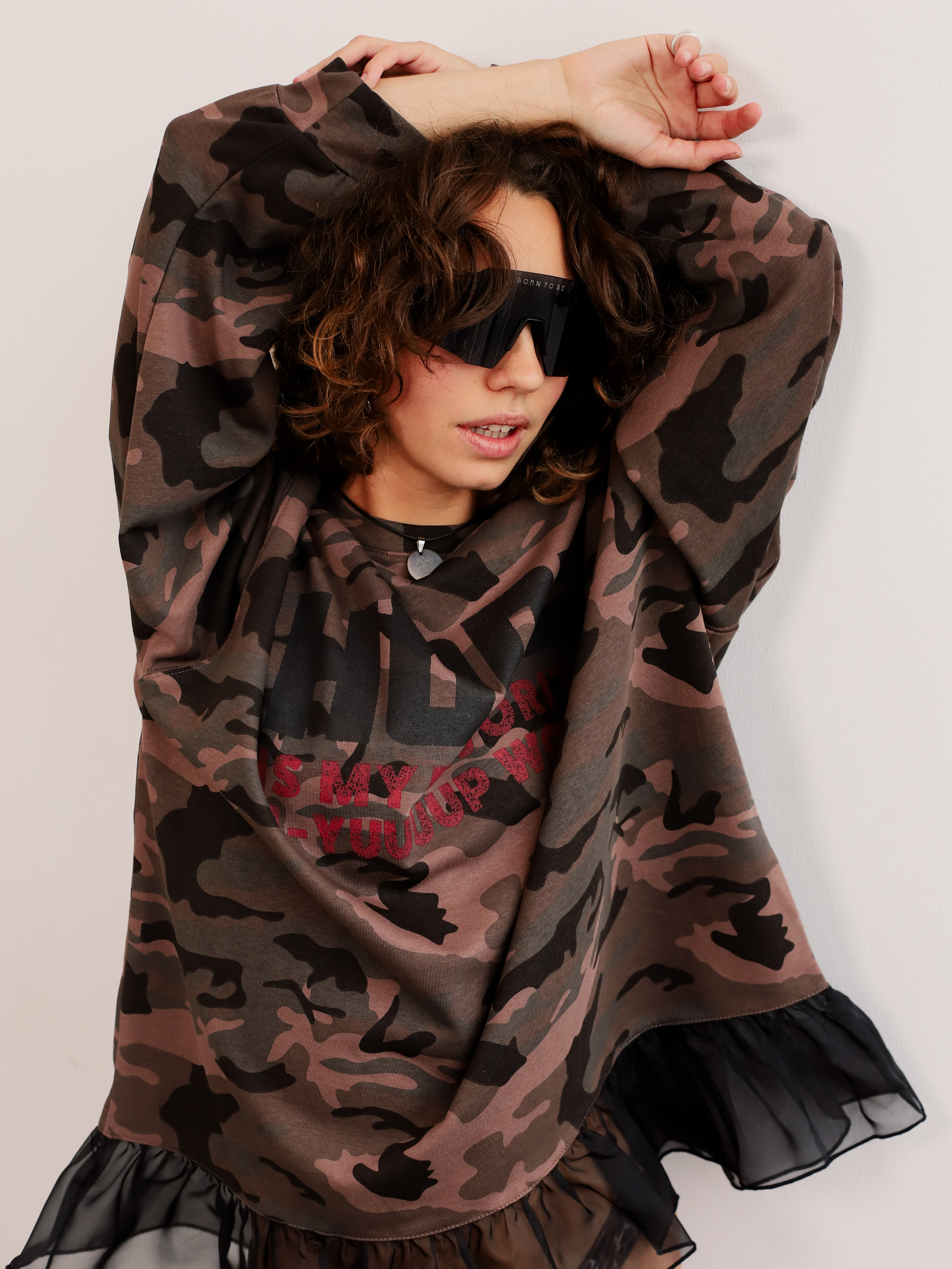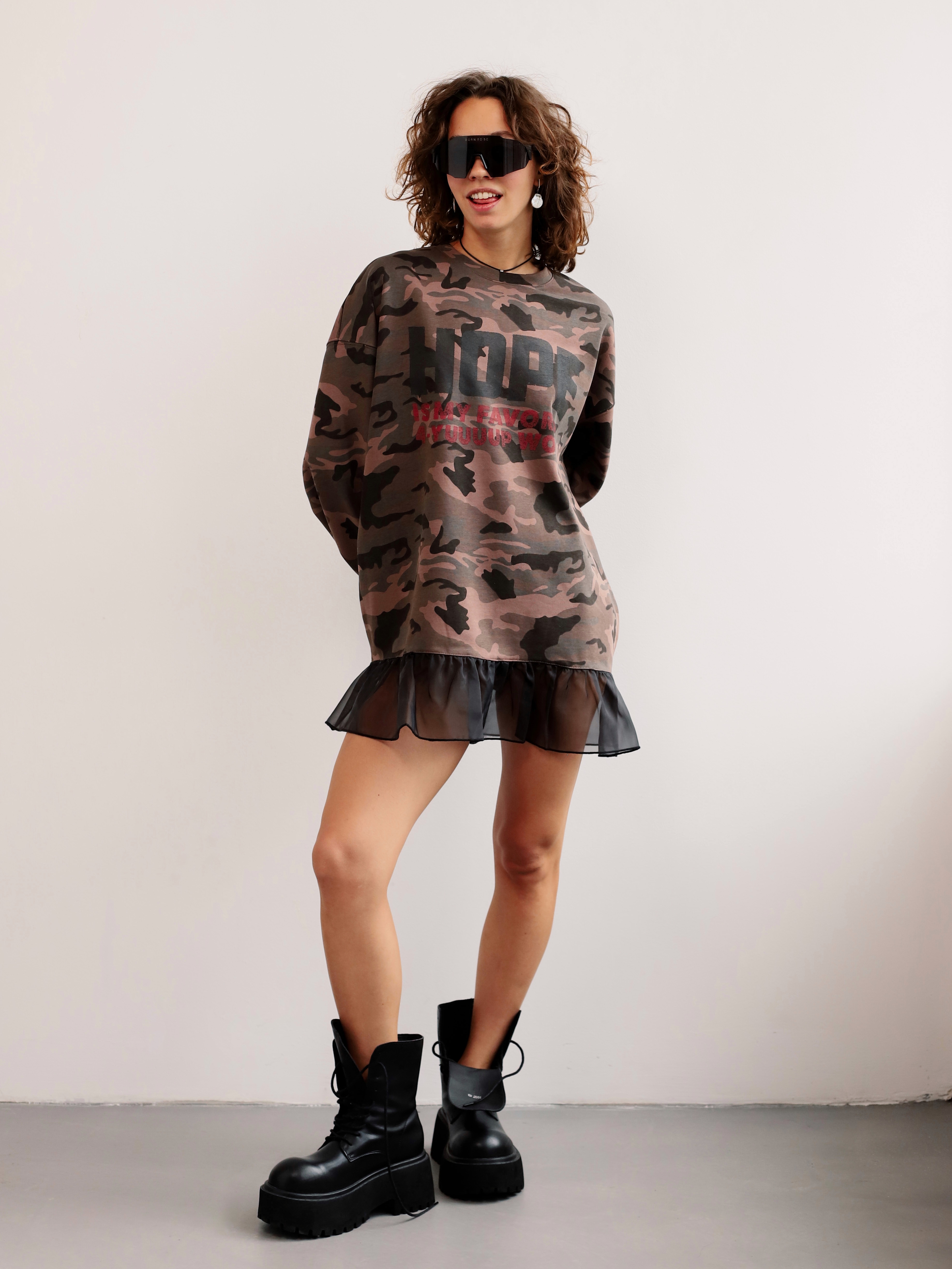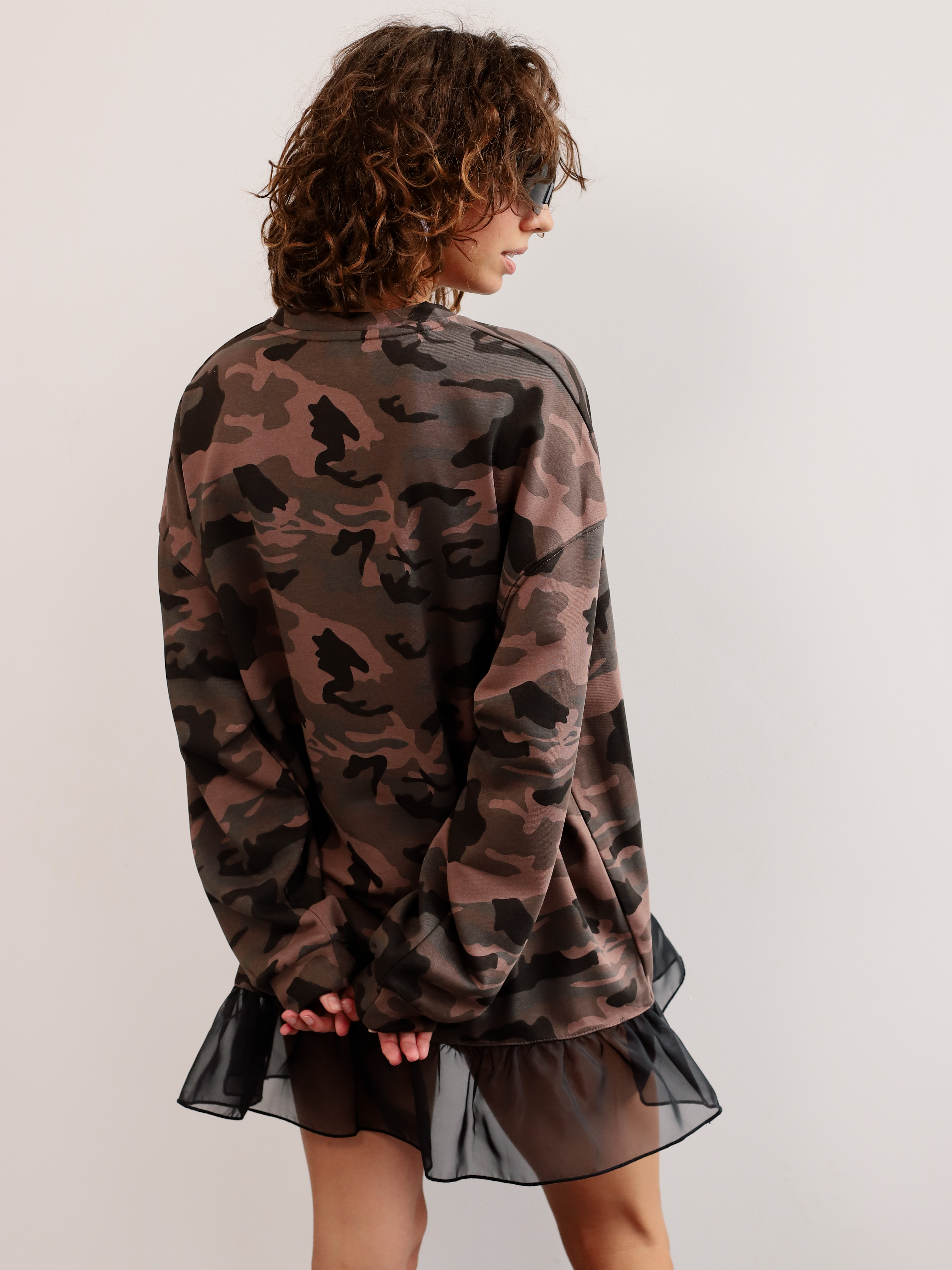 Женский лонгслив с принтом в стиле милитари и оборкой по низу для создания современного городского образа.